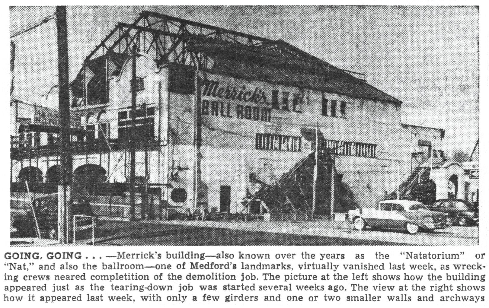 By June 23rd, 1910, a $200,000 edifice had been created--the largest and finest building of its kind in Southern Oregon--Merrick's ballroom. [The building was originally known as the Natatorium; Fred E. Merrick's name would not be attached until the early 1920s.] Early this week, two workmen started to tear down this building, a job that may take until May 15. In the forty-five years, the building had changed from the social center of the county to a little-used structure, a building that like an old man lived in its past glory; lived with its memories of the great events, of the famous people who had come and gone. As John G. Crawford, one of the building owners, put it: "Merrick's ballroom has reached the end of its economic life." One of the principal features of the new structure when it opened in 1910 was its huge swimming pool. It was 50 by 100 feet and held 50,000 gallons of water. In the winter the pool was boarded over and used for a roller rink. Emerson Merrick, son of one of the original owners of the building, once rented bathing suits, bloomers and stockings to the ladies who came there to swim. He recalls that stockings rented for ten cents a pair and that no woman would think of entering the pool without her stockings. The history of the evolution of the bathing suit in Merrick's is a part of the nation's history as far as women's fashions in bathing suits go. Merrick remembers when the first woman entered the pool without stockings--bare-legged. Other ladies whispered, and Medford gossiped about her. And then there were the girls who had trouble swimming in the skirted suits, with big bloomers and stockings. They were weighted down in an outfit that the modern girl wouldn't be caught drowned in. Some of those brave lassies, Merrick remembers, used to surreptitiously unbutton the skirts after they were in the pool. Of course, it left them heavily clad in big bloomers, but they giggled about their daring. Then one day came the advent of the one-piece bathing suit, and a brave young lady donned one and appeared in Merrick's pool. Tongues clacked far into the night, but a new era in women's wear had come, and Merrick's had made a little more local history. The late F. E. Merrick, H. C. Kentner, W. H. Brown and Jess Enyart pooled their funds to buy three acres of ground and start the building. Emerson Merrick said the investment was $225,000 which, for that day and age, was a major investment. In 1911, a depression hit the area and the building owners one by one dropped their active interest. Some left the valley, and it became pretty much a Merrick enterprise. There were all types of social events held in the big ballroom--92 by 108 feet-- and the little ballroom--35 by 65 feet. There were dances to such famous orchestras as Paul Whiteman, Jan Garber, Jack Teagarden and Phil Harris. Famous singers warbled there--Madame Ernestine Schumann-Heink, Luisa Tetrazzini, Nellie Melba--all were the toast of Medford and of Jackson County society generally. Peopled traveled for miles to the ballroom to hear the silver-tongued orator, William Jennings Bryan, who spoke there. The New York Symphony played there, and on the other extreme, Battling Nelson trained on the grounds and swam in the pool. In addition to the social, cultural and athletic events that drew people from all parts of Southern Oregon and California, the building once housed an ice cream parlor, bowling alleys, shooting galleries, movies and an athletic club. Lyceum shows were also held there. Although the heyday of the activity was gone, the building was still a popular place in 1928, and the late F. E. Merrick and his son, Emerson, sold one hundred acres of orchards in the Roxy Ann area to pay off the indebtedness of the structure. In 1930, former owners of the building settled out of court with the Merricks, and it became their sole operation. During the World War II years, the structure was leased to the army for its pool and other recreational activities. When the army gave it up, it was closed permanently and in recent years has been gathering dust. In 1952, Crawford, Col. Thomas A. Culbertson, Jr., and Otto Frohnmayer purchased the property under the name of the Riverside Investment Company. Crawford, president of the firm, in announcing of the dismantling of the building by Clifford E. Schleigh and G. R. Ford, said that definite plans for the future of the site have not been made. There are several things in the fire, and among these, according to reports, are (1) a motel and (2) a shopping center. Rogue River Times, December 16, 1955, page 10 The site is now occupied by the Red Lion. - - - - - - - - - - - - - - - -