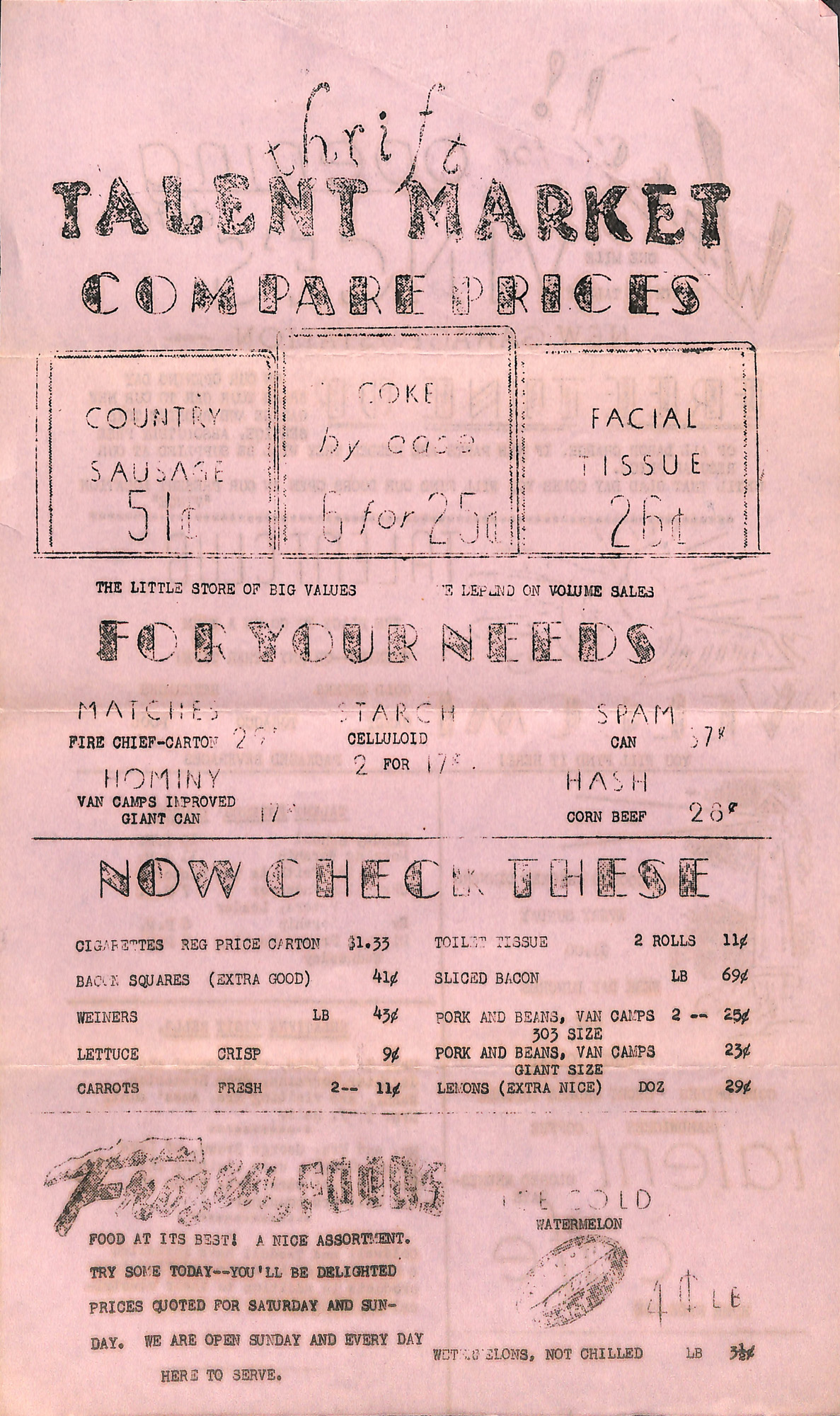 SATURDAY SPECIALS. GROCERY DEPARTMENT JELLO--5¢ pkg. SUGAR 10-lb. bag--50¢ FLOUR, KLAMATH HARD WHEAT 49-lb. bag--$1.69 FLOUR, KLAMATH, GOOD 49-lb. bag--$1.39 VEGETABLE DEPARTMENT SPUDS--50 lbs. #2--39¢ BRINER'S BERRIES 2 boxes--15¢ LEMONS, SUNKIST .doz--28¢ LETTUCE, large heads, 5¢ MEAT MARKET FINE STEAK--15¢ ROASTS--9¢ STEWS--6¢ LAMB CHOPS--15¢ BAKERY DEPARTMENT THAT GOOD HOMEMADE BREAD STILL 3 LOAVES--20¢ Many other treats at popular prices WE CARRY ICE, MEDFORD QUALITY AND PRICES FOR COMPLETE FOOD SERVICE, TRY RAY'S MARKET ----------------------------------------------------------------------------- TRAFFIC & WATER At the recent meeting of the city council, called for the purpose of considering the feasibility of securing more water, a proposition was made by the Talent Transient Camp that the members of the Camp would donate the necessary labor for the construction of a larger and deeper well at the lower city well property. It is planned to dig the well as deep as is necessary to secure an adequate flow of water, after which extensive drifts will be made to secure sufficient reservoir space. At the same meeting of the council it was voted to send for a supply of earwig parasites which are said to be efficacious in destroying the earwigs. It is requested that all owners of bantam chickens keep them penned up as a protection to the parasites…. KID PARTY Mrs. H. Good was hostess at a surprise kitchen shower Tuesday evening, honoring her sister, Miss Ione Bates, who is to be married to Mr. W. Dooms, Friday. The affair was given as a "Kid Party," and all the guests came dressed in an appropriate manner. The kids enjoyed punch and suckers and played kid games until a late hour. Many beautiful gifts were received by the guest of honor. About thirty friends of the guest of honor were present. Talent News Flashes June 23, 1934, now lost. Reprinted in the June 26, 1959 News Flashes -----------------------------------------------------------------------------