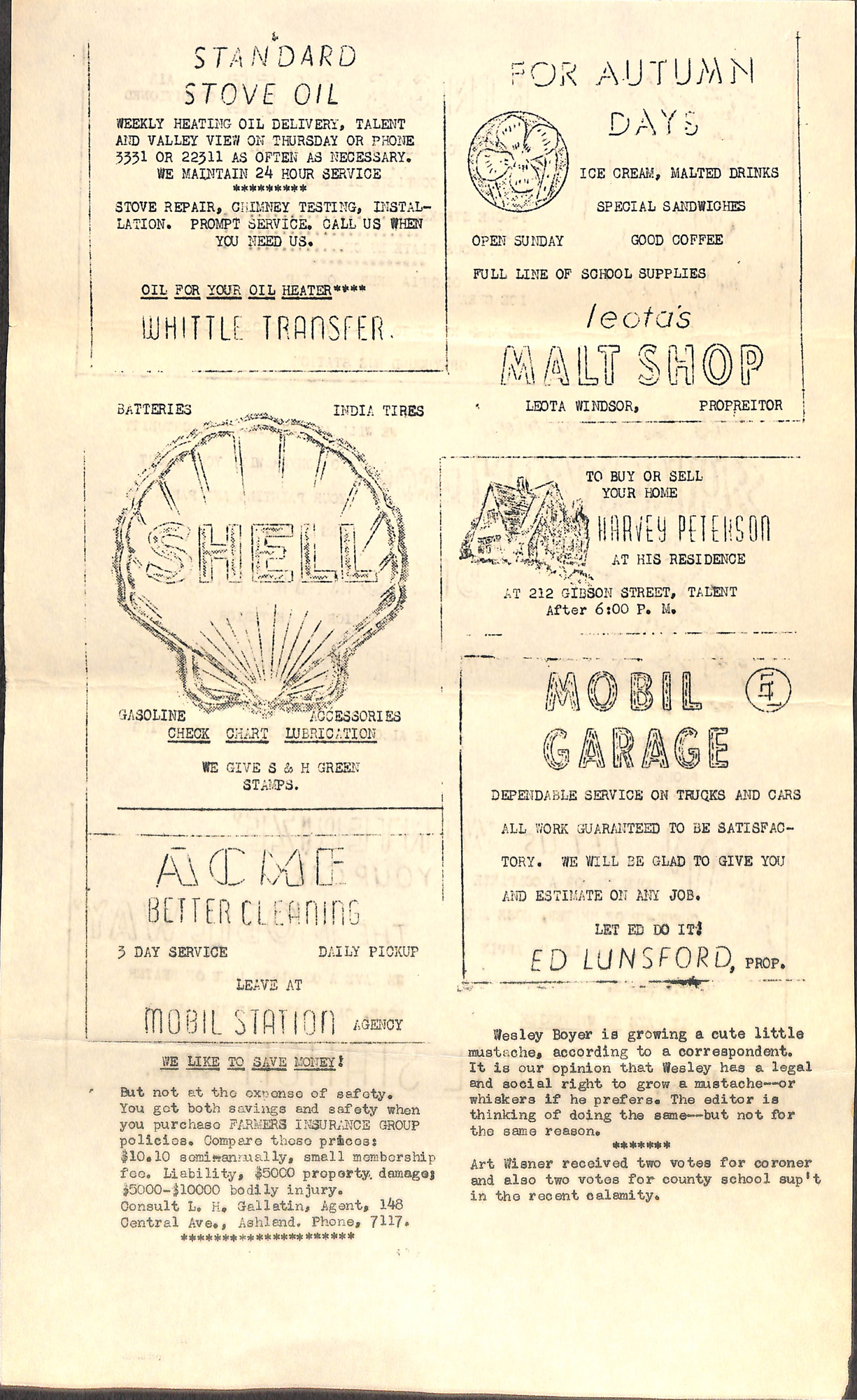 Page 5, full-page ad for: TALENT LOCKER GROCERY Page 6, ads for: COLDWELL & SON HARRY'S PLACE LEN SPARKS ELECTRICAL TECHNICIAN TALENT SANITARY SERVICE TALENT FRIENDS CHURCH Pastor, Irwin P. Alger SUNDAY, Nov. 7 10:00 a.m.--Bible School 11:00 a.m.--Worship Hour 7:00 a.m.--Christian Endeavor 8:00 a.m.--Song and Praise Service MONDAY, Nov. 8 6:30 p.m.--Church Night Dinner and Social Occasion at City Hall. WEDNESDAY, Nov. 10 7:00 p.m.--Choir Practice 7:30 p.m.--Prayer Meeting Page 7, ads for: WHITTLE TRANSFER LEOTA'S MALT SHOP SHELL STATION HARVEY PETERSON, REALTOR ACME CLEANING LUNSFORD MOBIL GARAGE FARMERS INSURANCE GROUP Wesley Boyer is growing a cute little mustache, according to a correspondent. It is our opinion that Wesley has a legal and social right to grow a mustache--or whiskers if he prefers. The editor is thinking of doing the same--but not for the same reason. Art Wisner received two votes for coroner and also two votes for county school sup't. in the recent calamity. Page 8, ads for: KING'S CAFÉ SULLIVAN BROTHERS GILBRAITH'S MOBIL STATION FROM "JUST A NEIGHBOR."