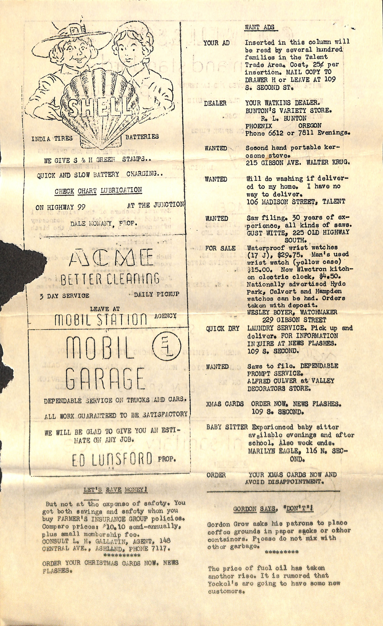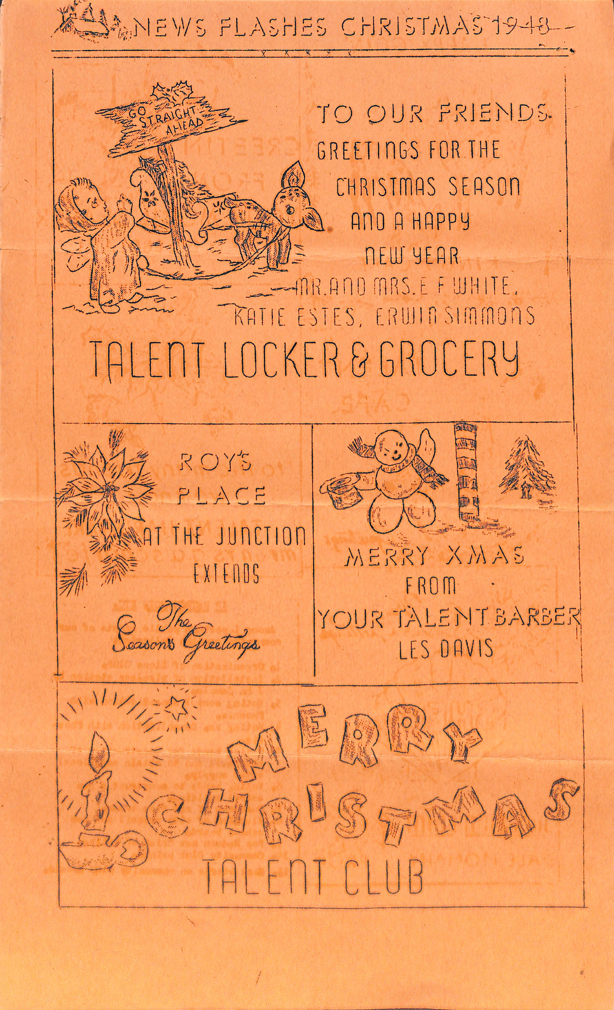 One of our reporters said she had a dream last night. She was Santa Claus. She called on prominent, public-spirited citizens to learn what they wanted for Xmas. Then she prepared the tree. On the tree were seventeen little white fire trucks, one bottle of Scotch and three cans of Johnson's Glo-Go. As most of our business houses will be closed on Saturday and Sunday it is advisable to do your shopping today. Mr. and Mrs. Beryl Settlemier and family left today for Longview, Washington, where they will spend Xmas with Mrs. Settlemier's mother. Mr. and Mrs. Lloyd Wells will spend Xmas in Klamath Falls. Lucile Young and Barbara Terrill home for Xmas. Page 12, Christmas greetings ads for: TALENT LOCKER & GROCERY ROY'S PLACE TALENT BARBER TALENT CLUB Page 13, Christmas greetings ads for: KING'S CAFÉ GILBREATH MOBIL TALENT CAFÉ TALENT HARDWARE JUNCTION POINT SHELL IN RETROS, ETC., ETC.