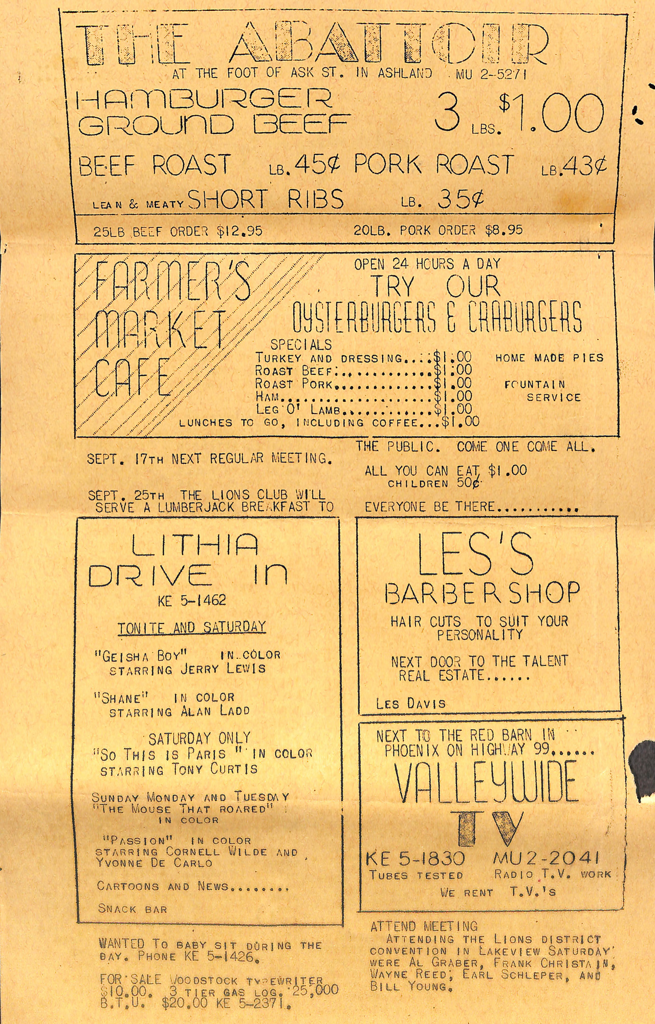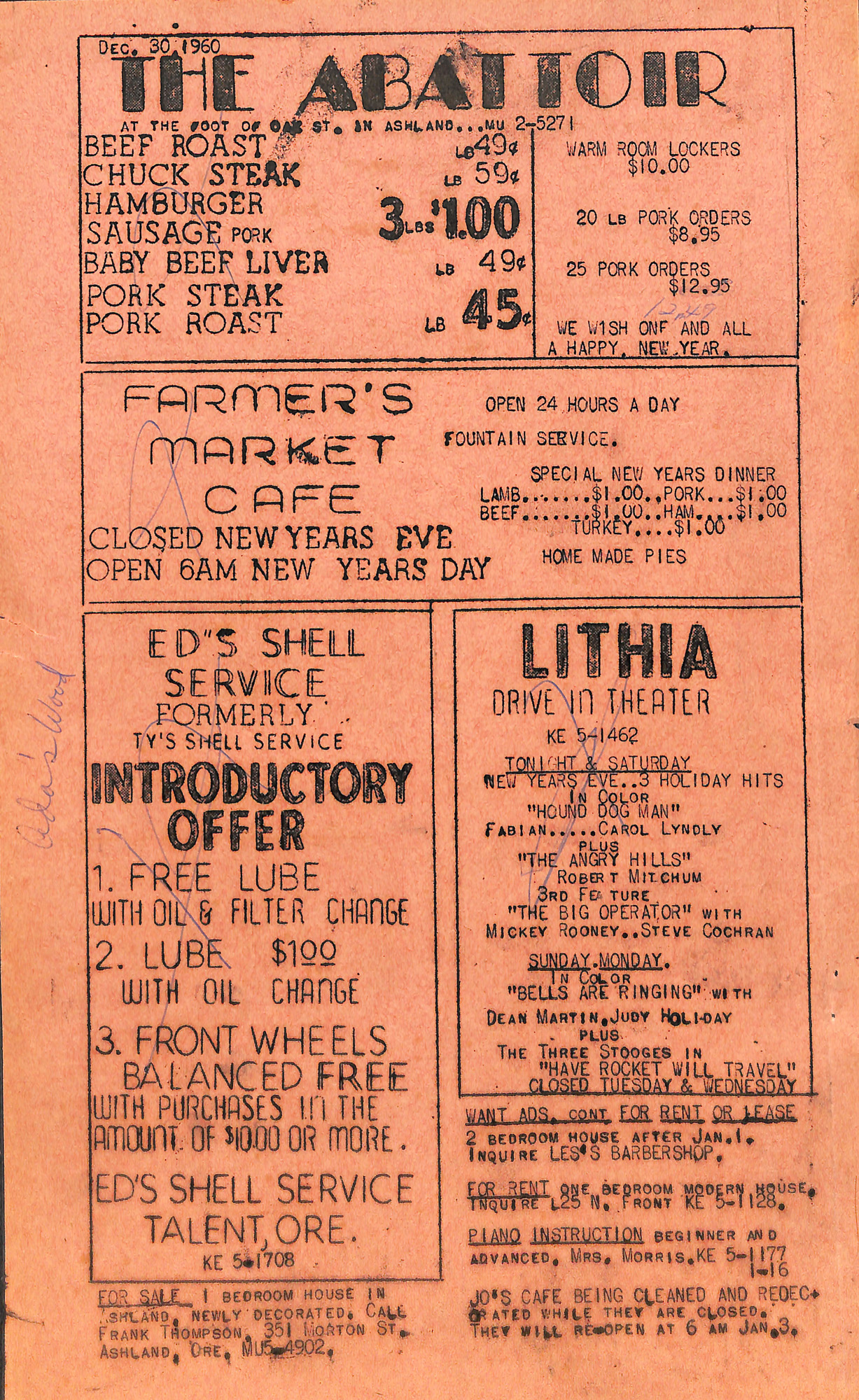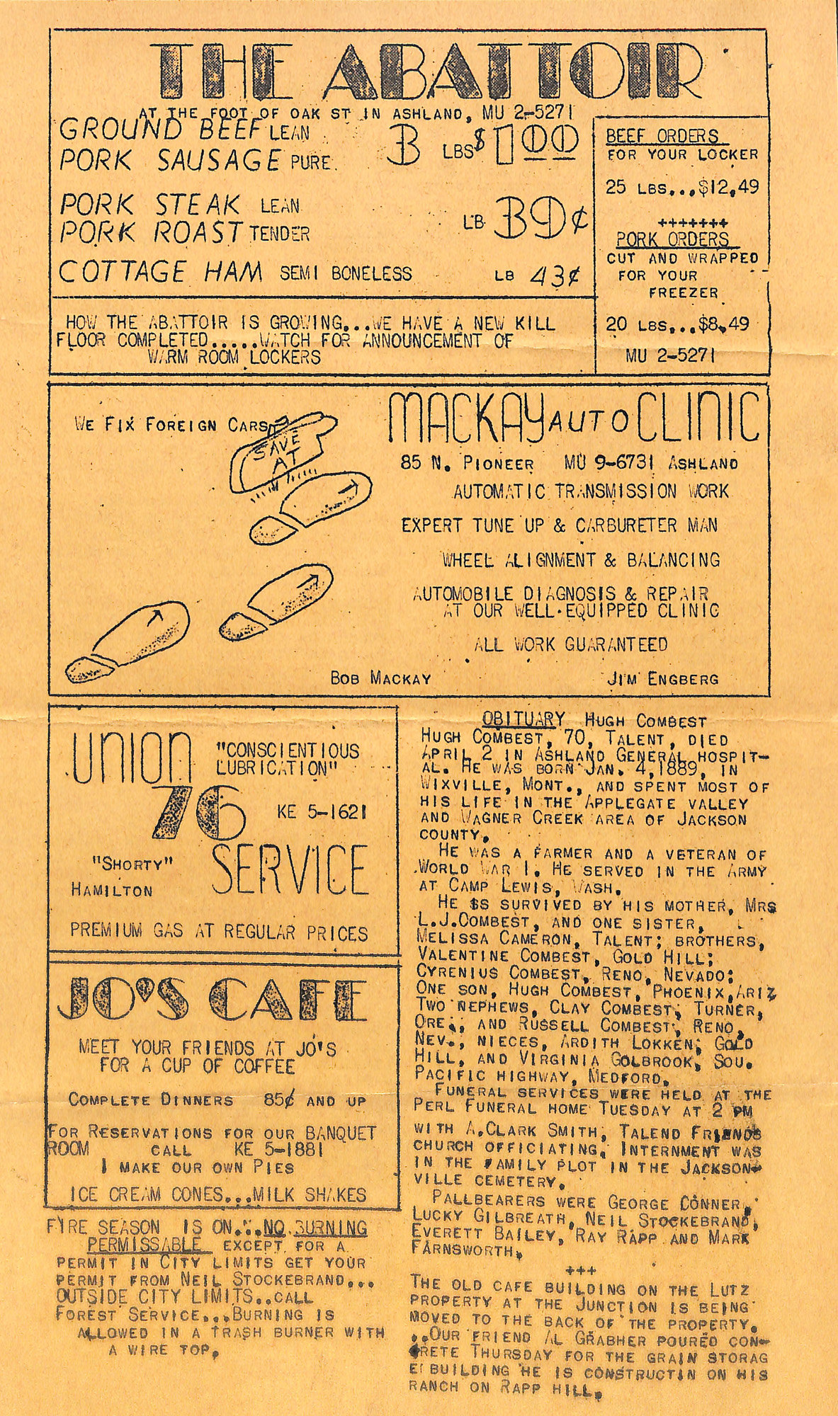 READ IT IN OUR YELLOW PAGES EVERGREEN PRINTING SERVICE ASHLAND SANITARY SERVICE NEWS FLASHES PRINTING SERVICE STEIGER GARAGE WORK TALENT LUMBER YARD FOR SALE--Roasting rabbits--5½ to 8 lbs. dressed weight…$1.50 each. See Les the Barber. LIONS NEWS--President Bill Young, Earl Schleper and Al Grabher attended a zone meeting last Wednesday night in Medford. LIONS CLUB BOARD MEETING, Dec. 15th. HERB'S WATCH REPAIR