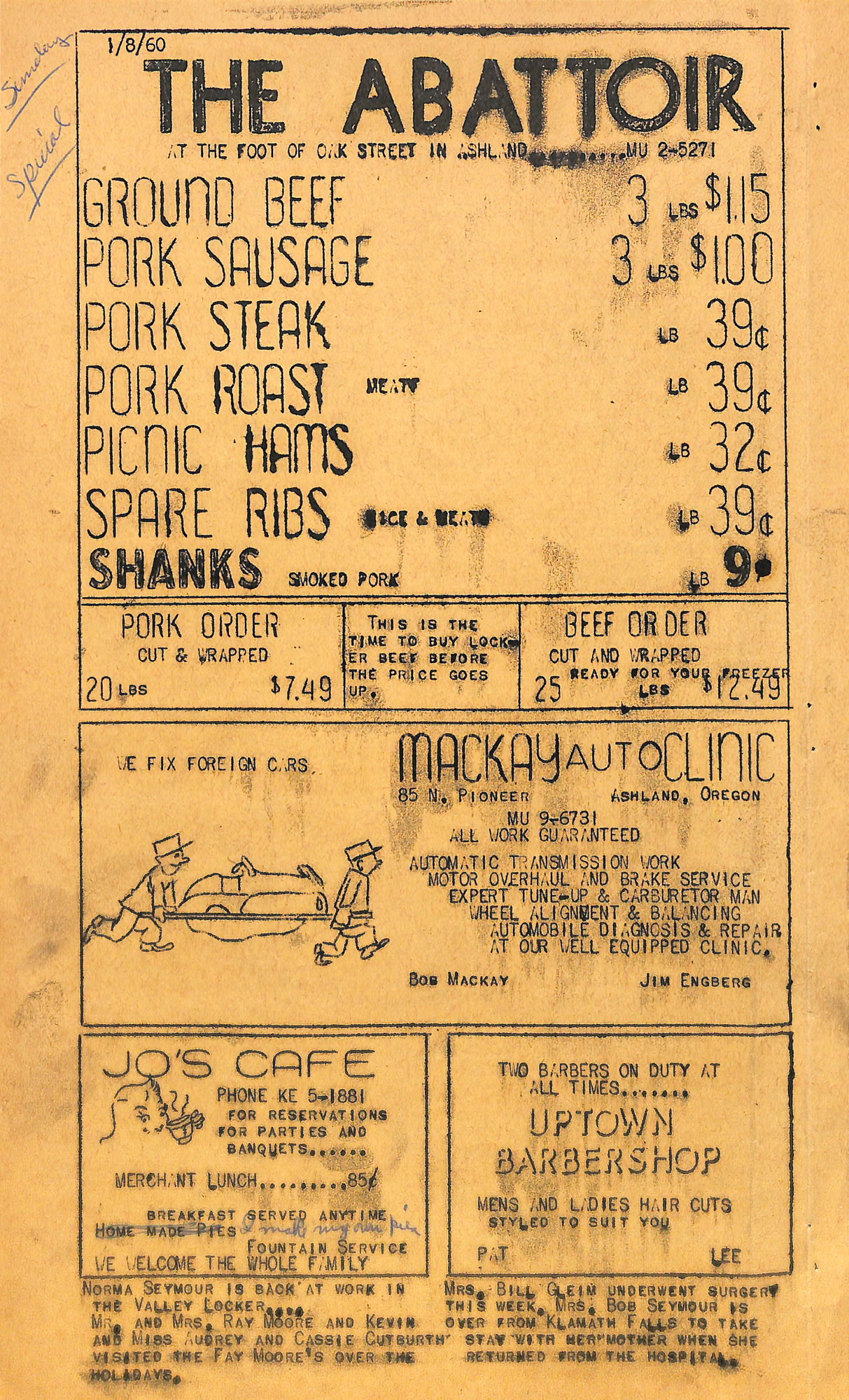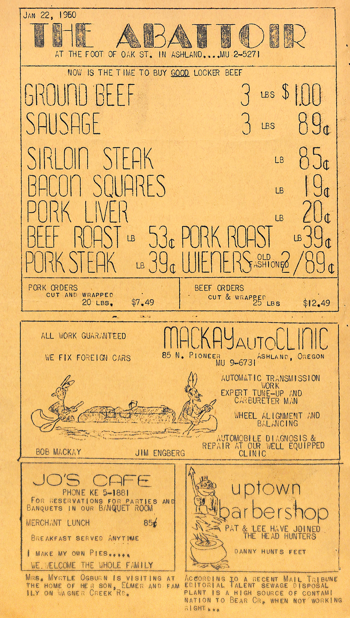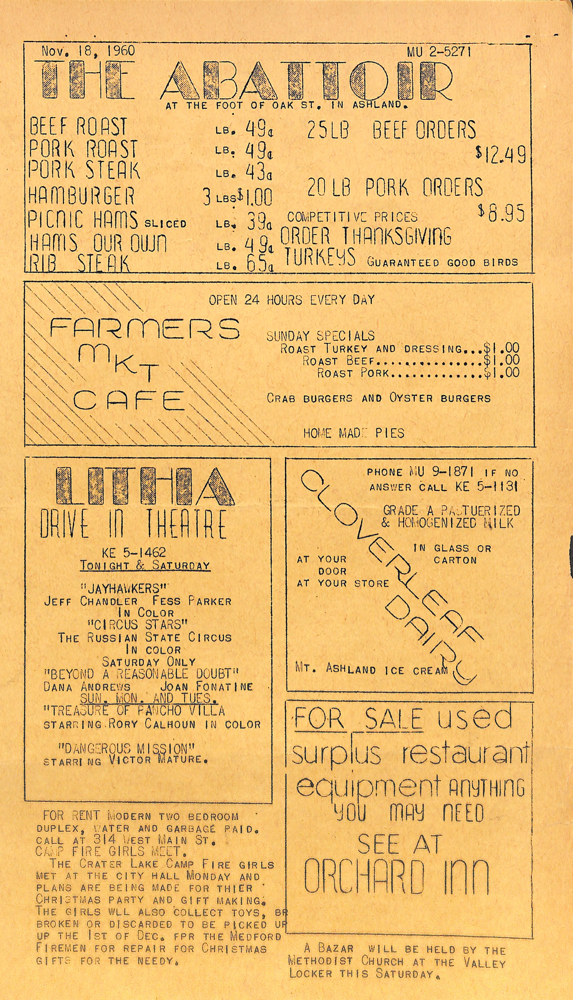 READ IT IN OUR YELLOW PAGES EVERGREEN PRINTING SERVICE ASHLAND SANITARY SERVICE NEWS FLASHES PRINTING SERVICE STEIGER GARAGE WORK TALENT LUMBER YARD FOR SALE--Roasting rabbits--5½ to 8 lbs. dressed weight…$1.50 each. See Les the Barber. LIONS NEWS--President Bill Young, Earl Schleper and Al Grabher attended a zone meeting last Wednesday night in Medford. LIONS CLUB BOARD MEETING, Dec. 15th. HERB'S WATCH REPAIR
