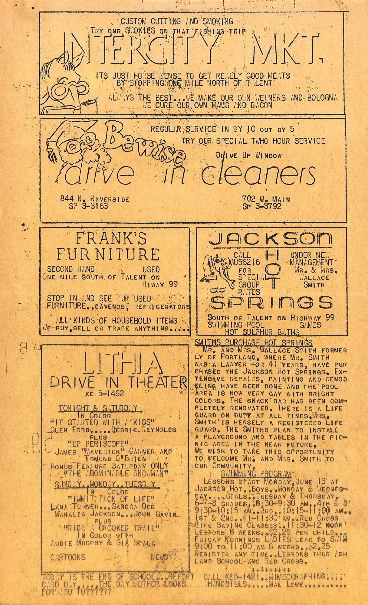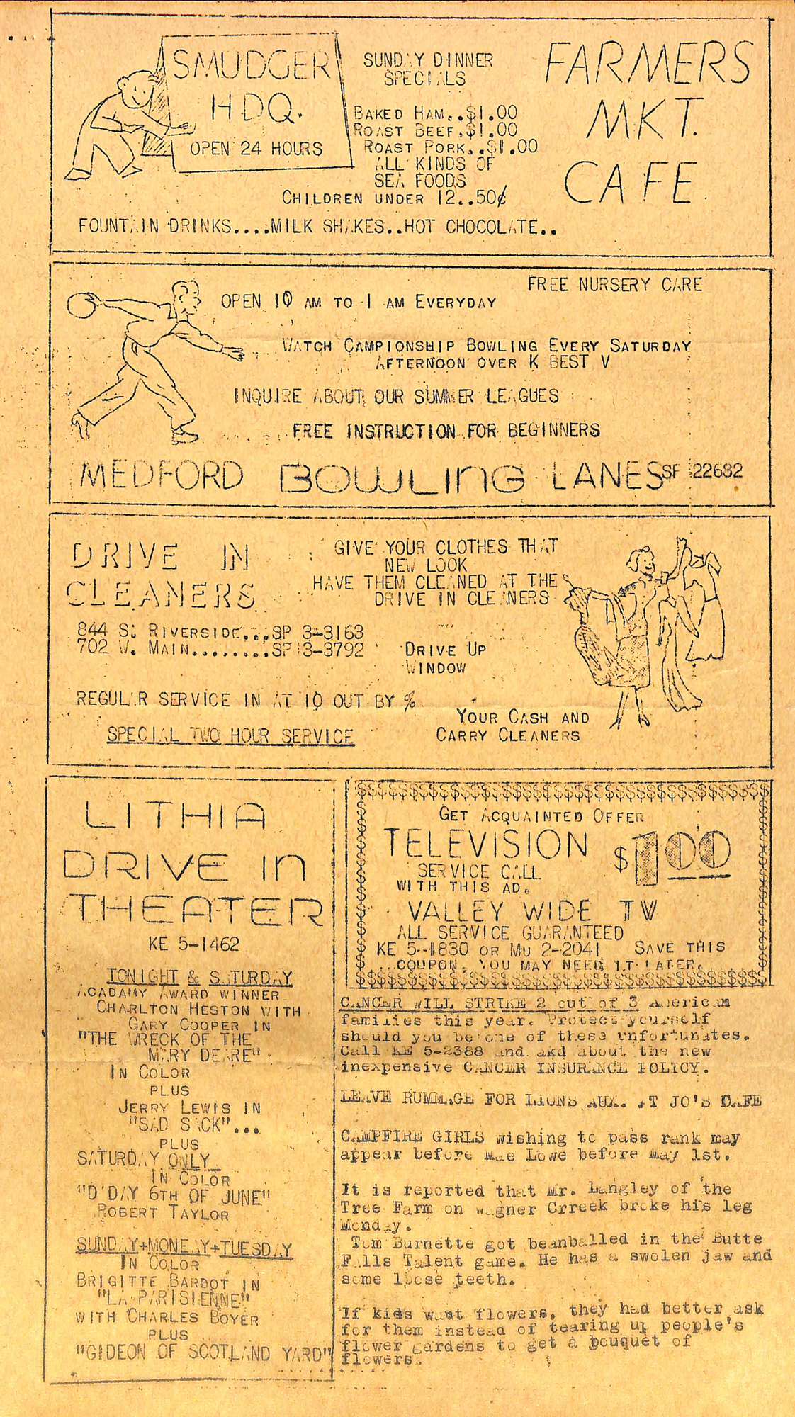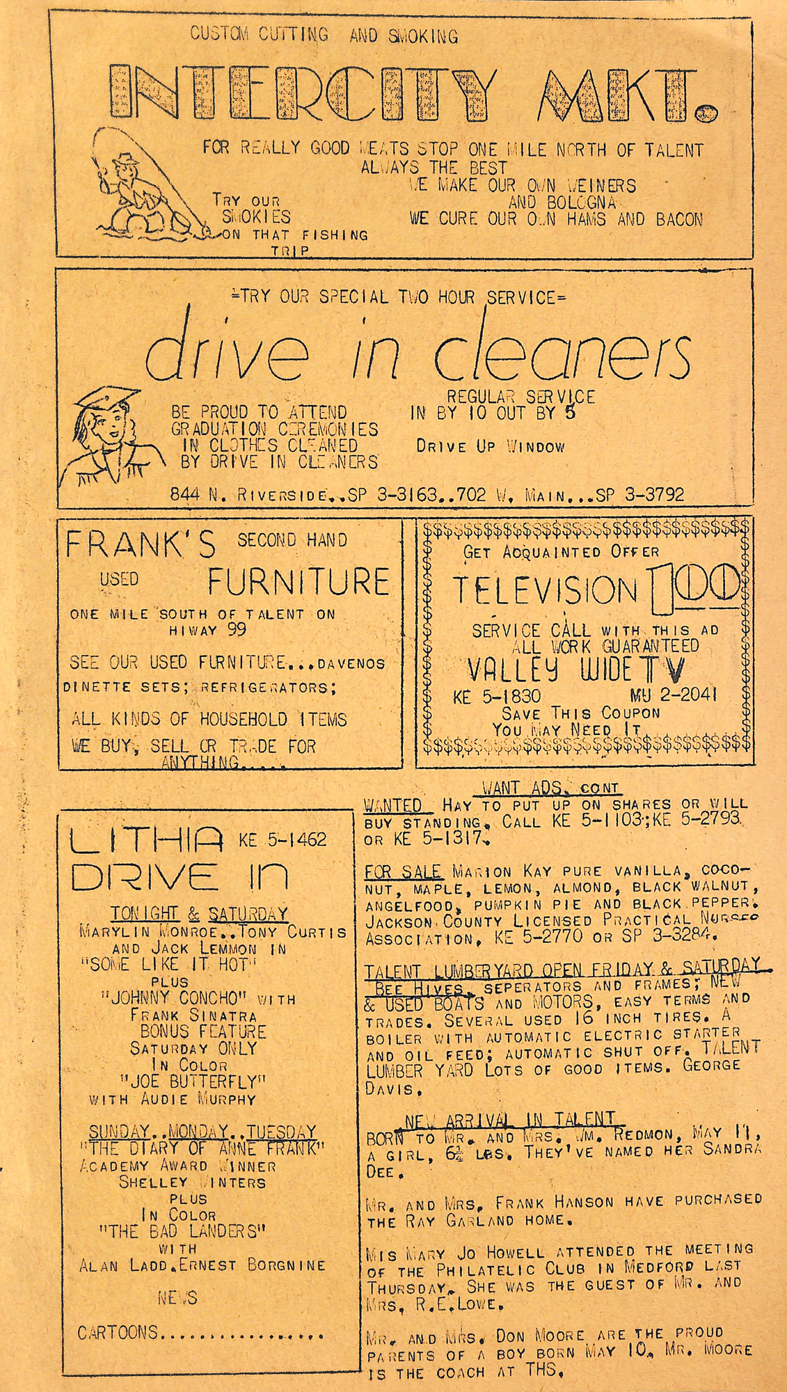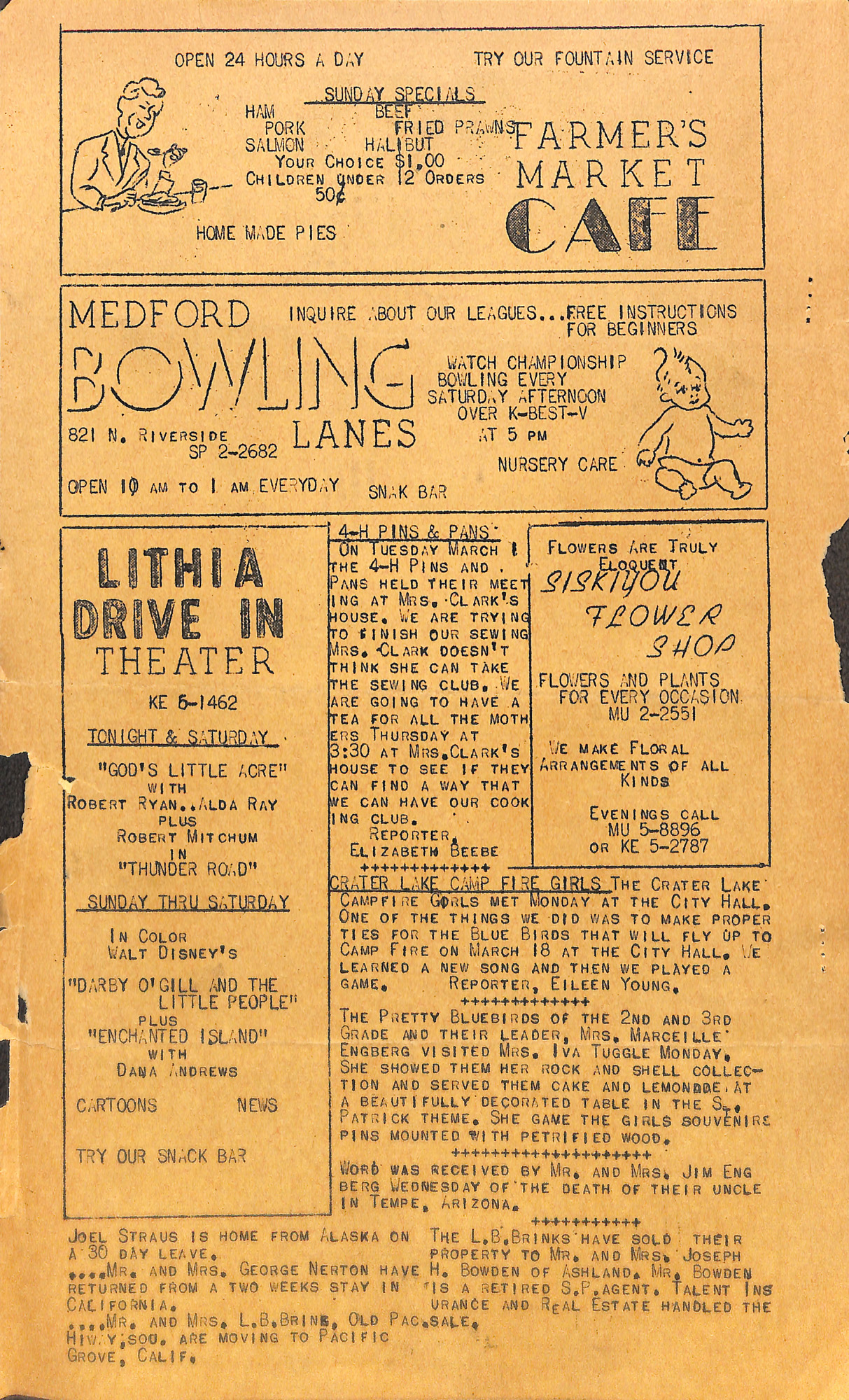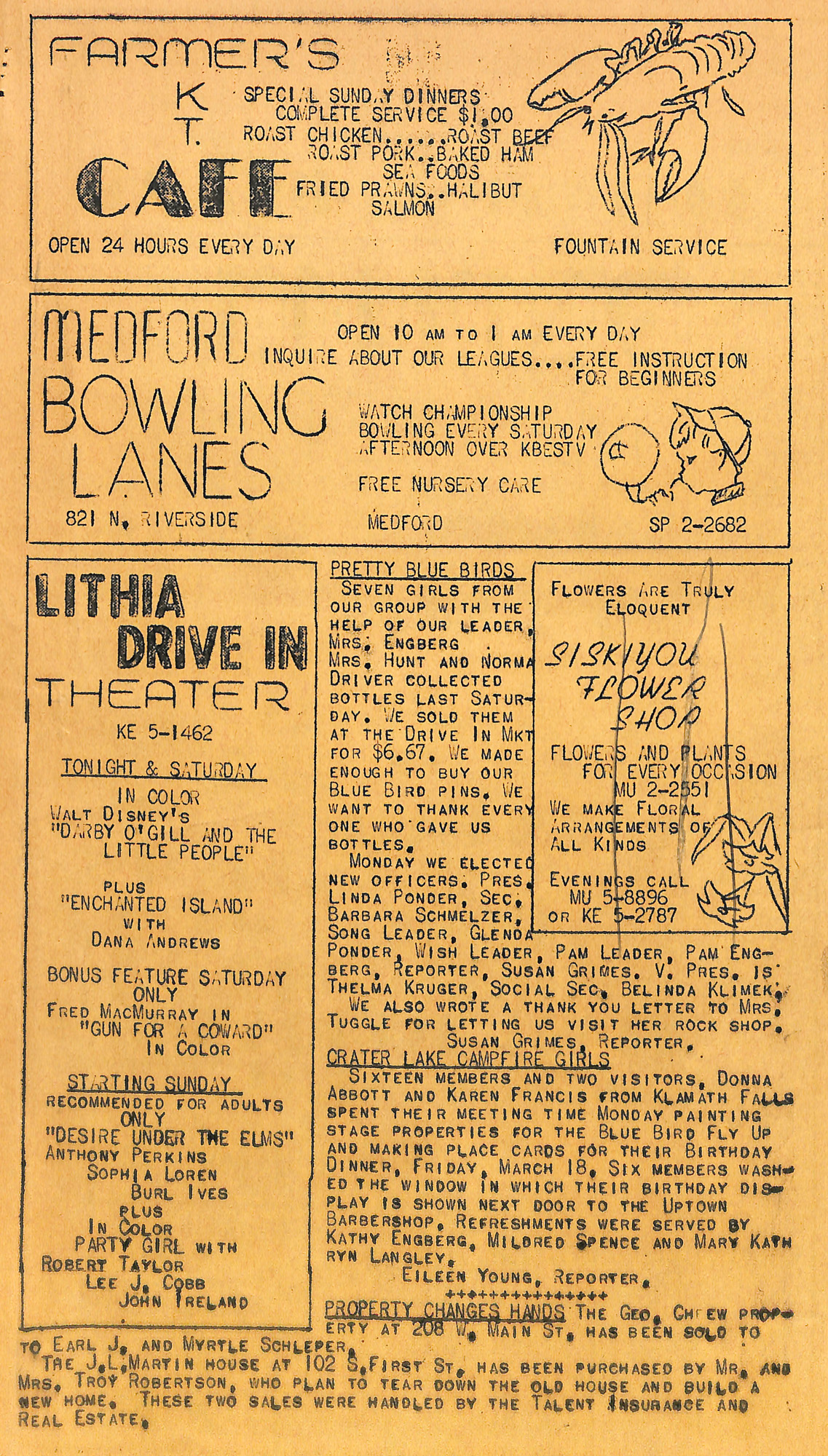For the second time in the past month, dynamite caps were found on the Talent school grounds according to M.W. Young, Police Chief. The caps were turned over to the Jackson County Sheriff's office. If what was visible from Mae's back door Thurs. aft. is any token, there'll be some mighty muscles developed among the athletes at THS…or some broken toes. Page 7, full-page ad for: VALLEY LOCKER & GROCERY Page 8, ads for: FARMER'S MARKET CAFÉ MEDFORD BOWLING LANES LITHIA DRIVE-IN THEATER SISKIYOU FLOWER SHOP 4-H PINS & PANS On Tuesday, March 1, the 4-H Pins and Pans held their meeting at Mrs. Clark's house. We are trying to finish our sewing. Mrs. Clark doesn't think she can take the sewing club. We are going to have a tea for all the mothers Thursday at 3:30 at Mrs. Clark's house to see if they can find a way that we can have our cooking club. Reporter,