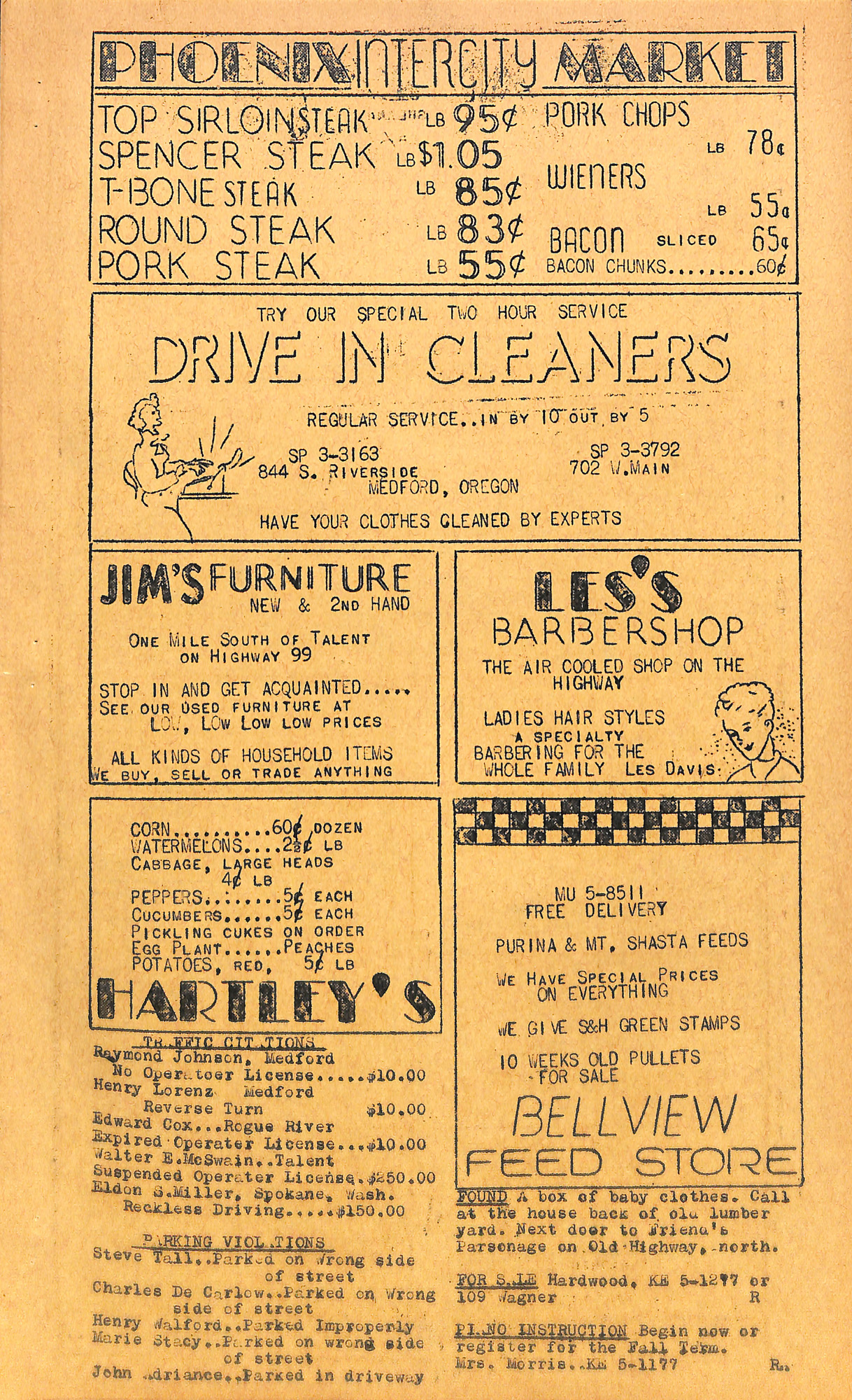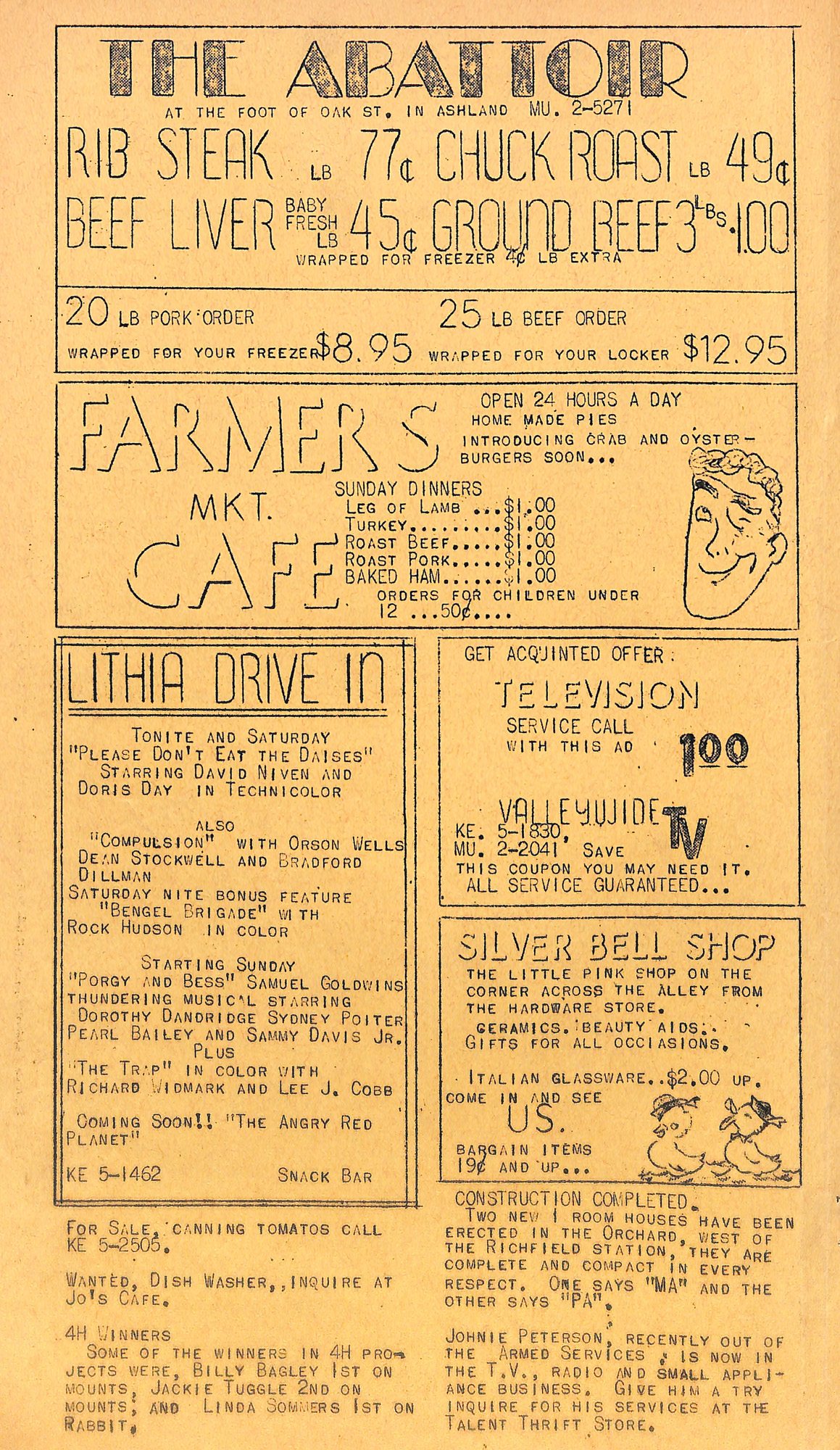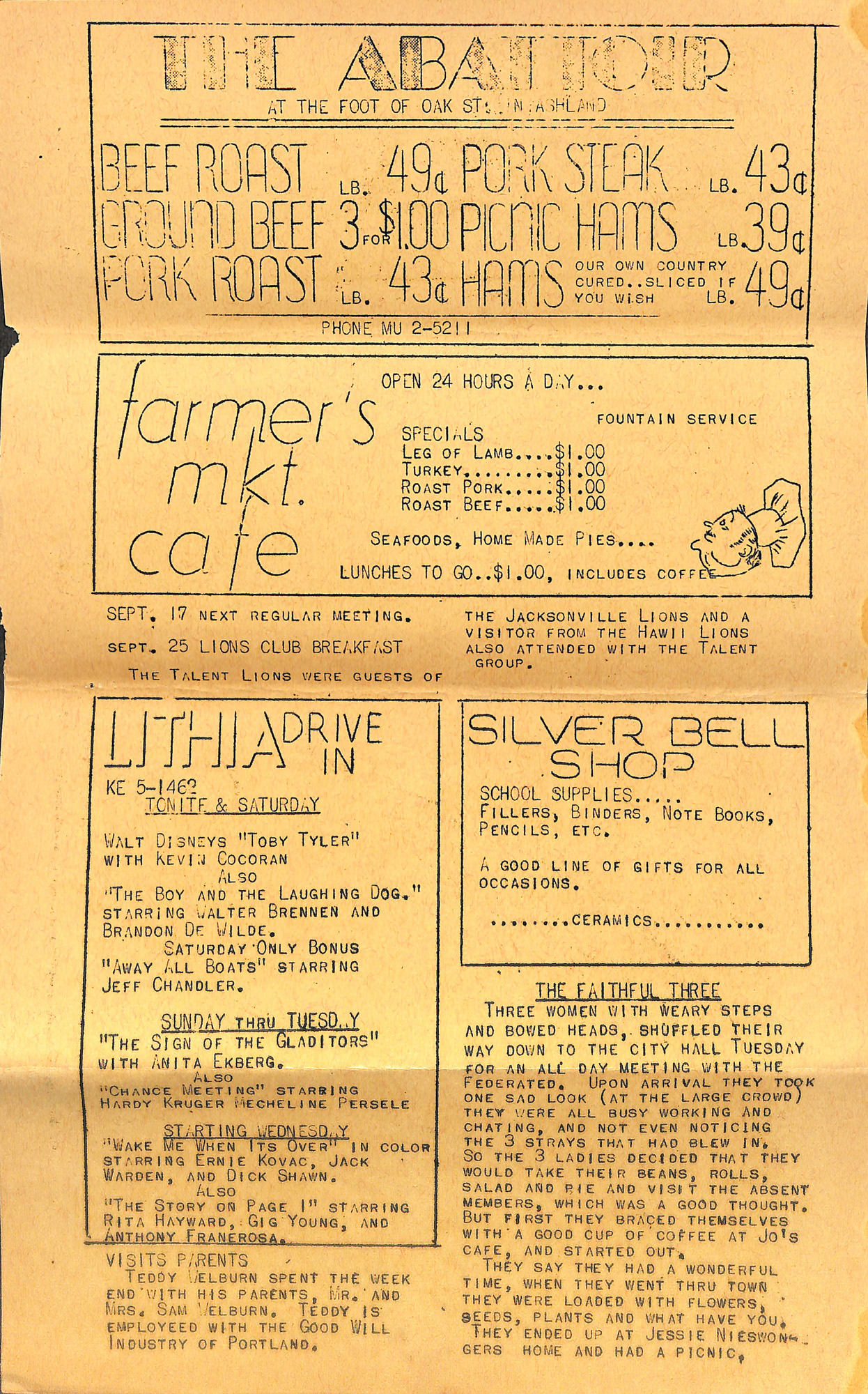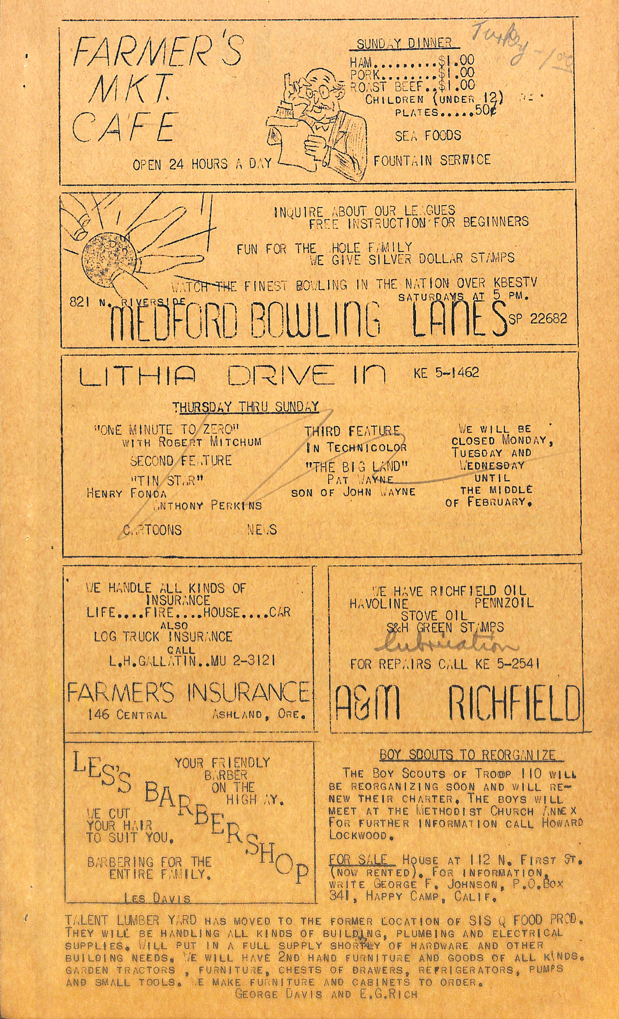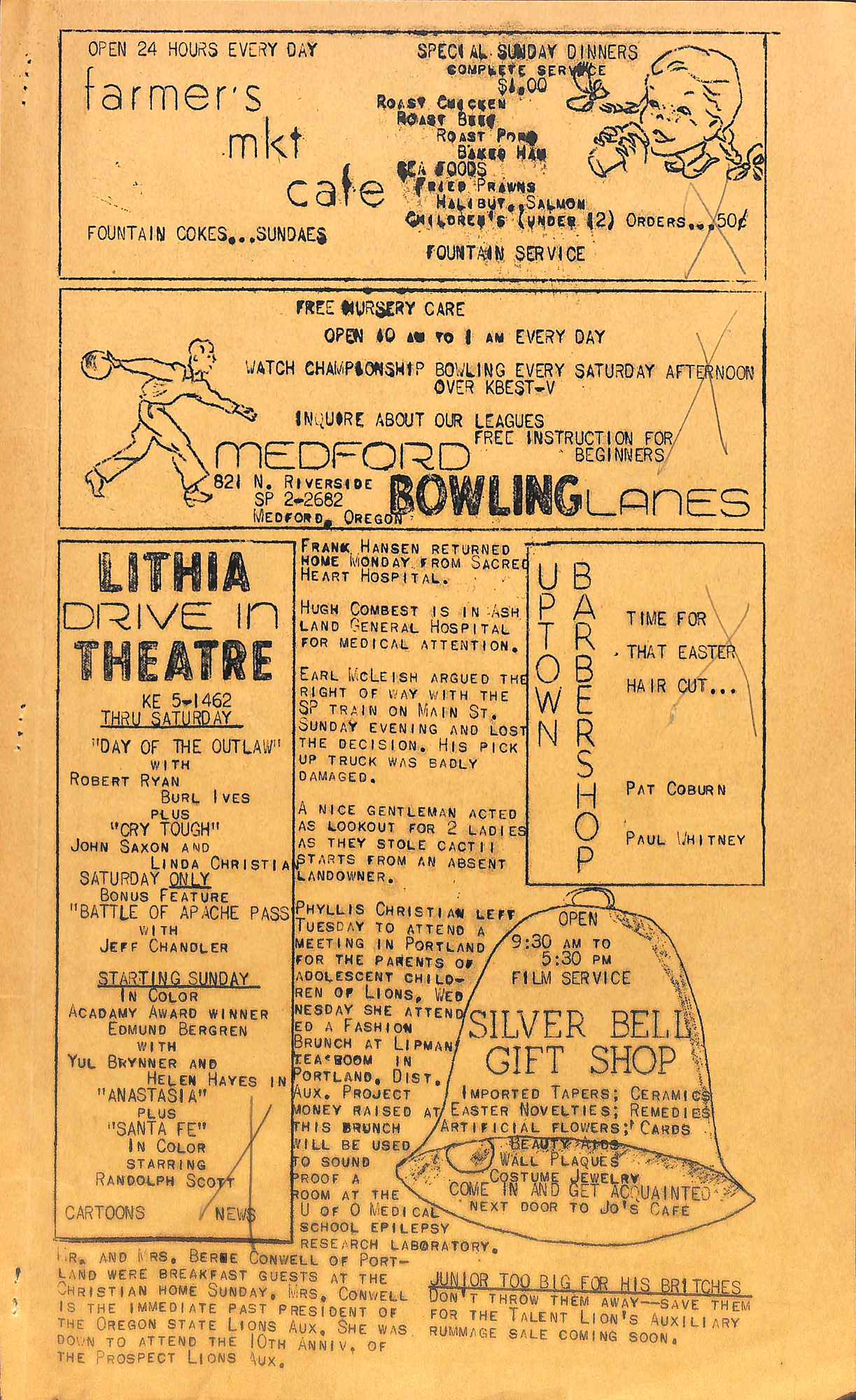 For the second time in the past month, dynamite caps were found on the Talent school grounds according to M.W. Young, Police Chief. The caps were turned over to the Jackson County Sheriff's office. If what was visible from Mae's back door Thurs. aft. is any token, there'll be some mighty muscles developed among the athletes at THS…or some broken toes. Page 7, full-page ad for: VALLEY LOCKER & GROCERY Page 8, ads for: FARMER'S MARKET CAFÉ MEDFORD BOWLING LANES LITHIA DRIVE-IN THEATER SISKIYOU FLOWER SHOP 4-H PINS & PANS On Tuesday, March 1, the 4-H Pins and Pans held their meeting at Mrs. Clark's house. We are trying to finish our sewing. Mrs. Clark doesn't think she can take the sewing club. We are going to have a tea for all the mothers Thursday at 3:30 at Mrs. Clark's house to see if they can find a way that we can have our cooking club. Reporter,