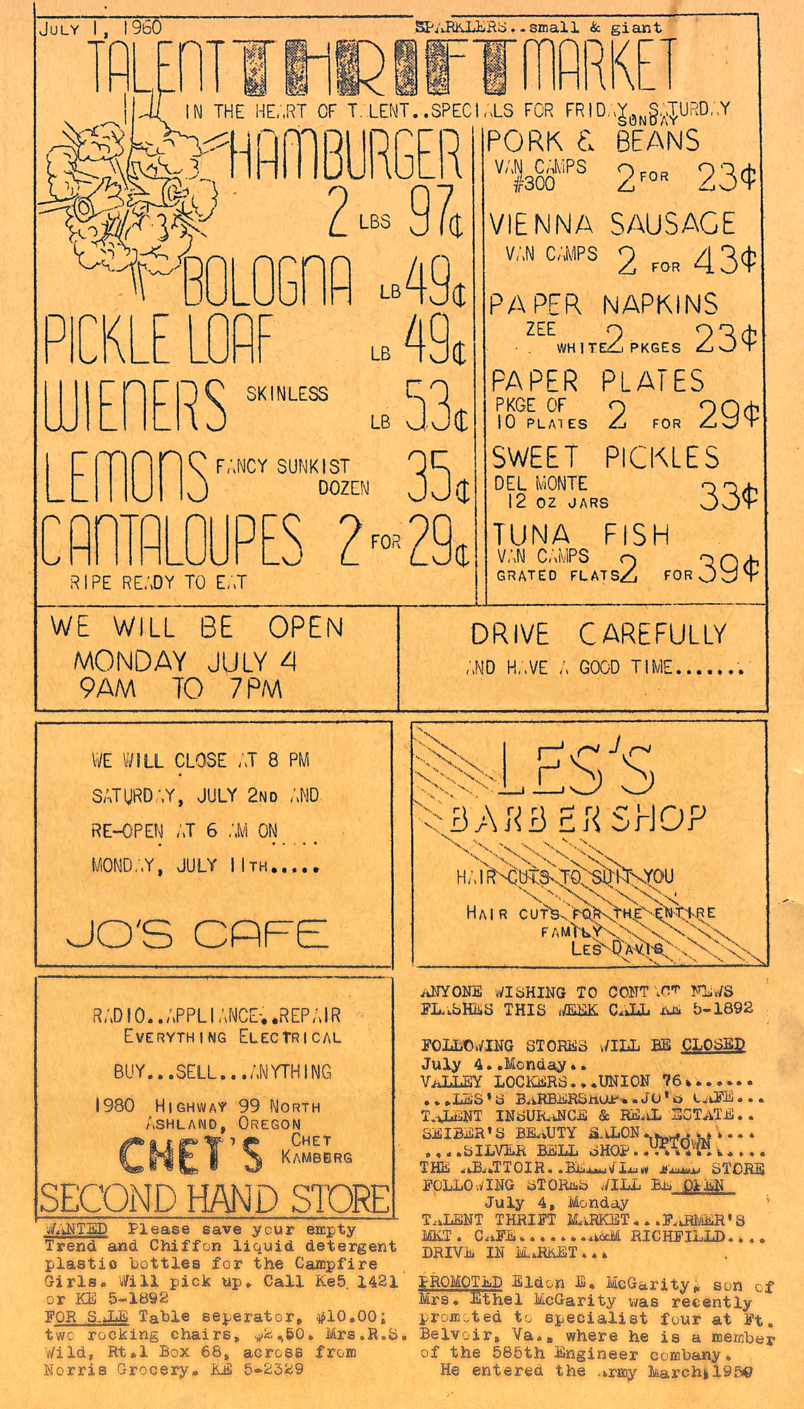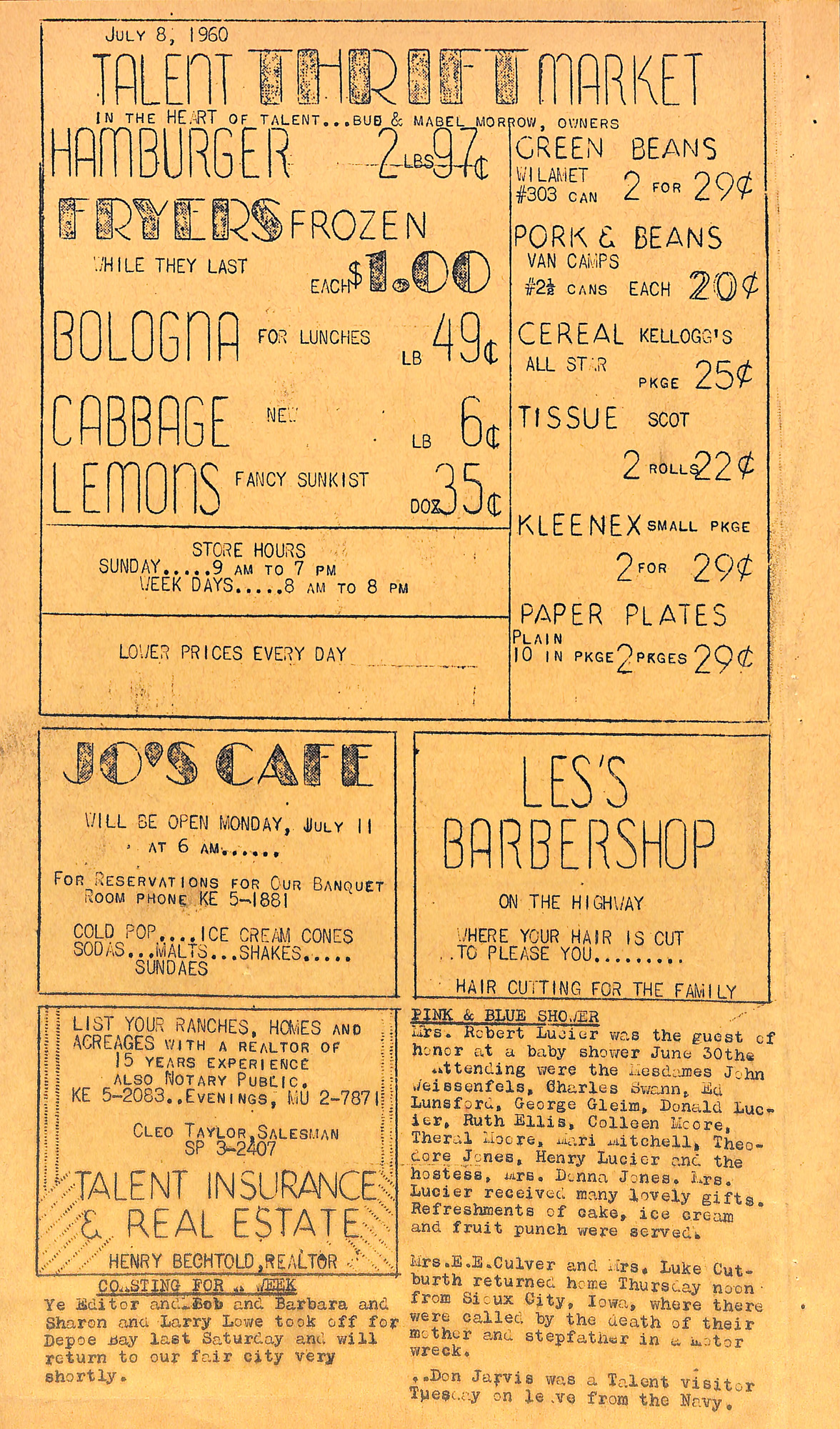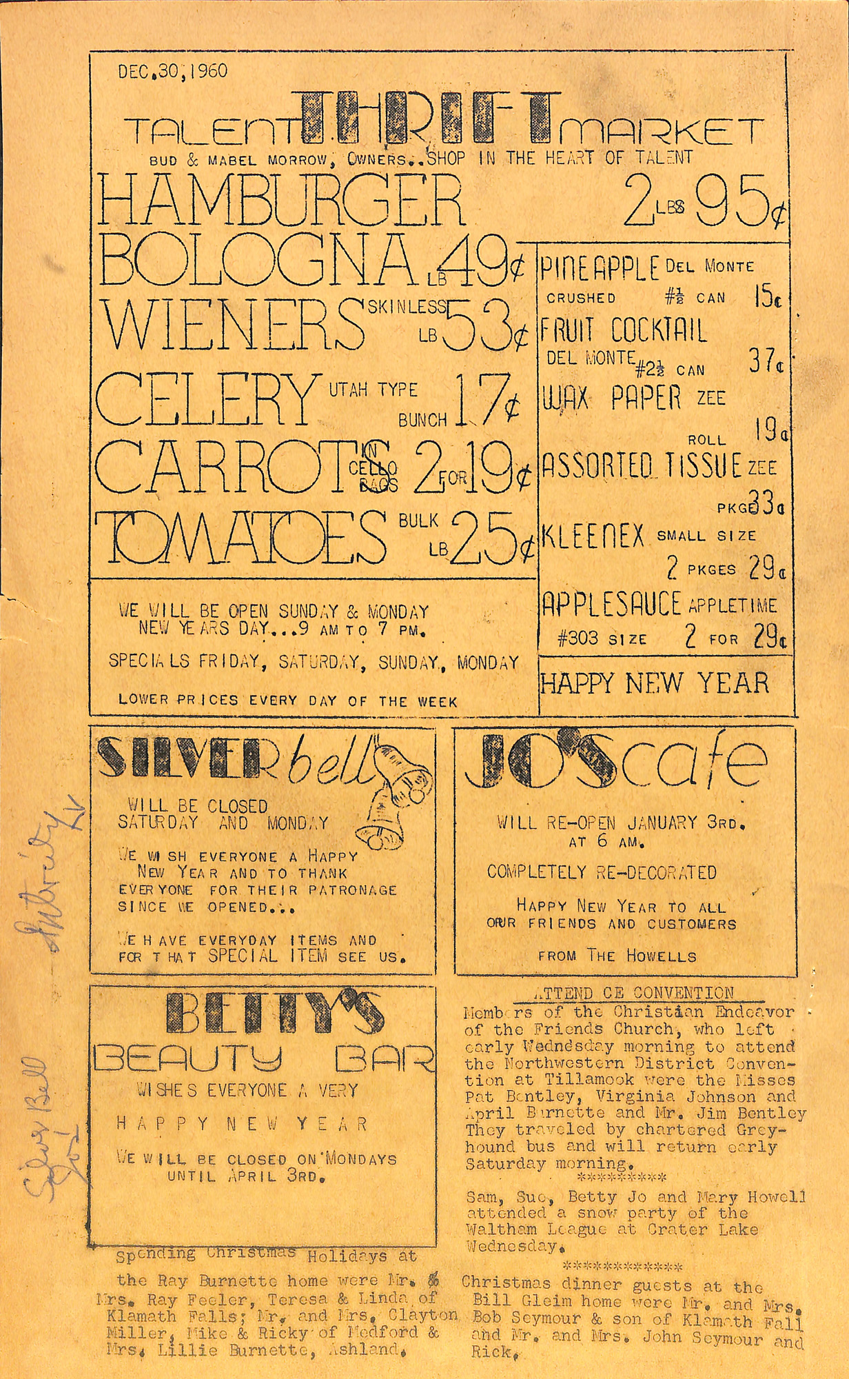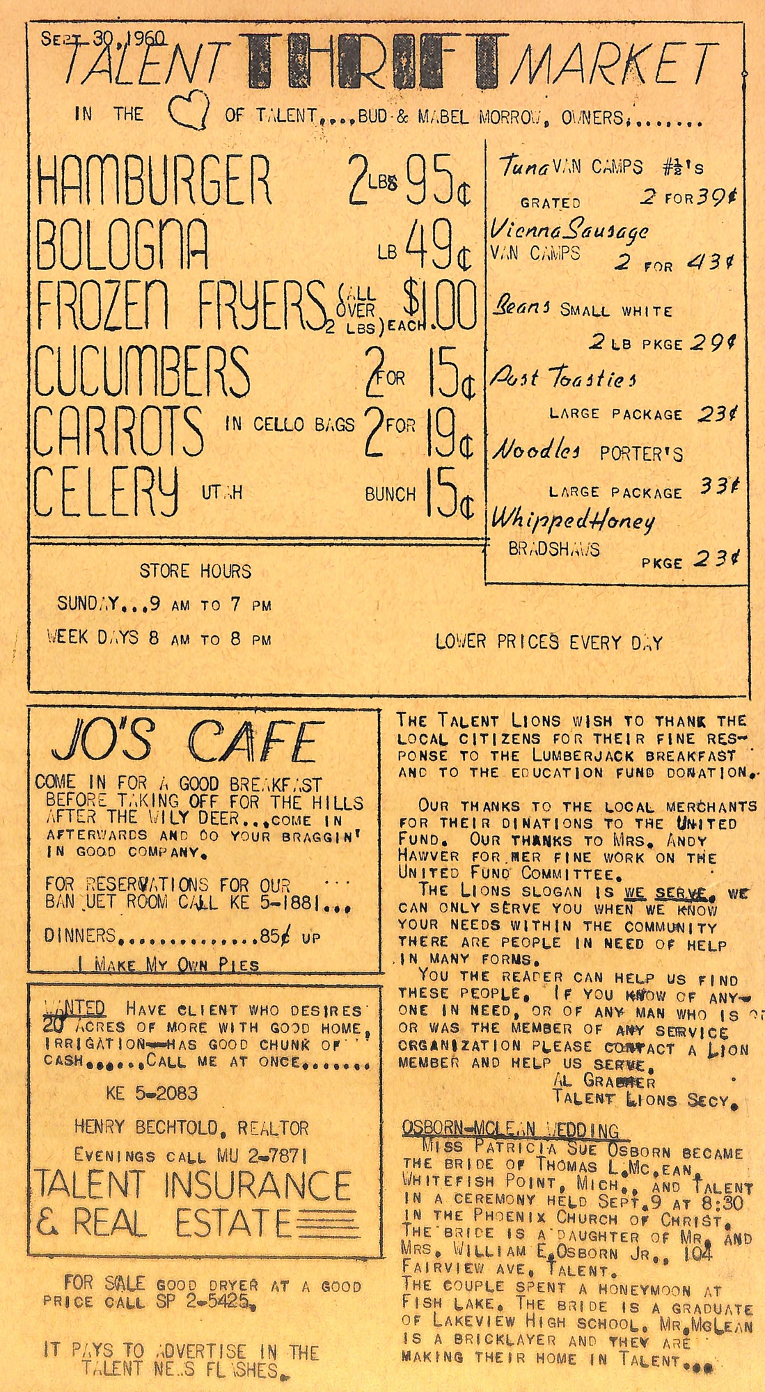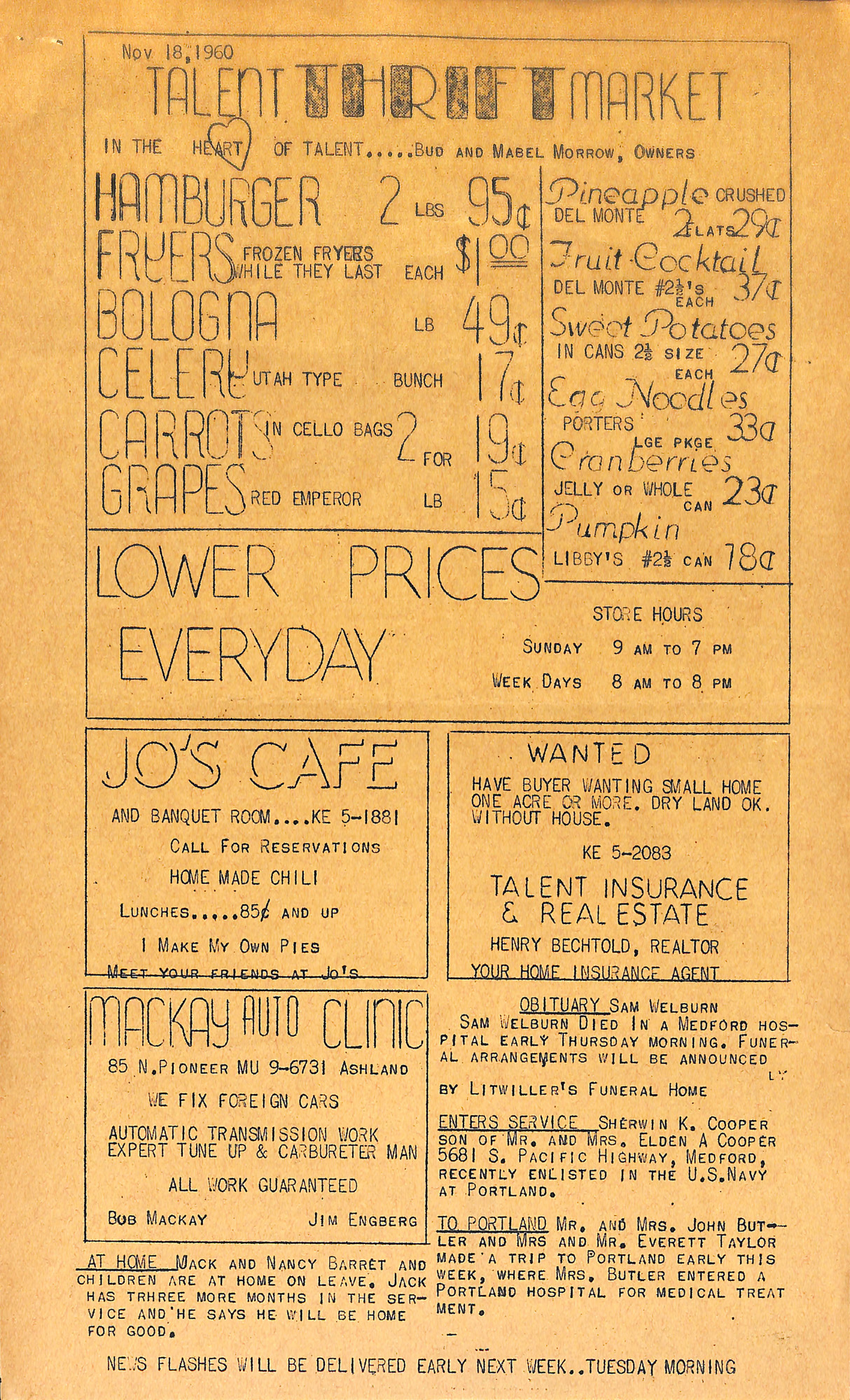 Talent News Flashes 1960- Talent News Flashes was a mimeographed newspaper and advertising shopper started by Ray’s Market in 1934. It continued until 1989 and presents a vibrant picture of the Talent community and the adjacent area for more than fifty years. While started by Ray’s, the Flashes are most remembered for their longest serving editors, Mae Lowe and Alice Burnette. Transcribed 2024-25 by Mary Tsui. Issues not transcribed below are not known to have survived; please notify me if any are discovered. Links to images of all the surviving issues can be found here. -
