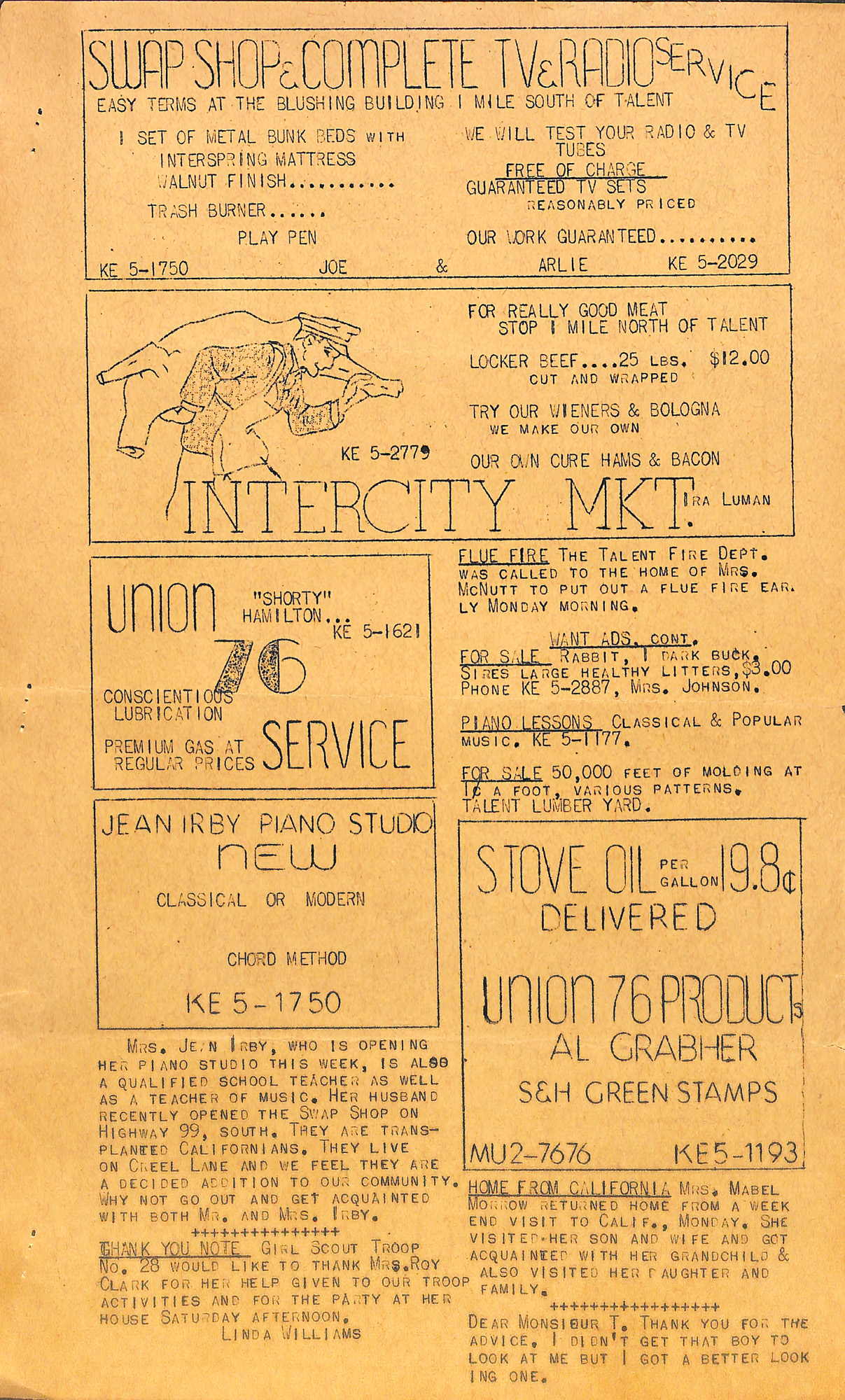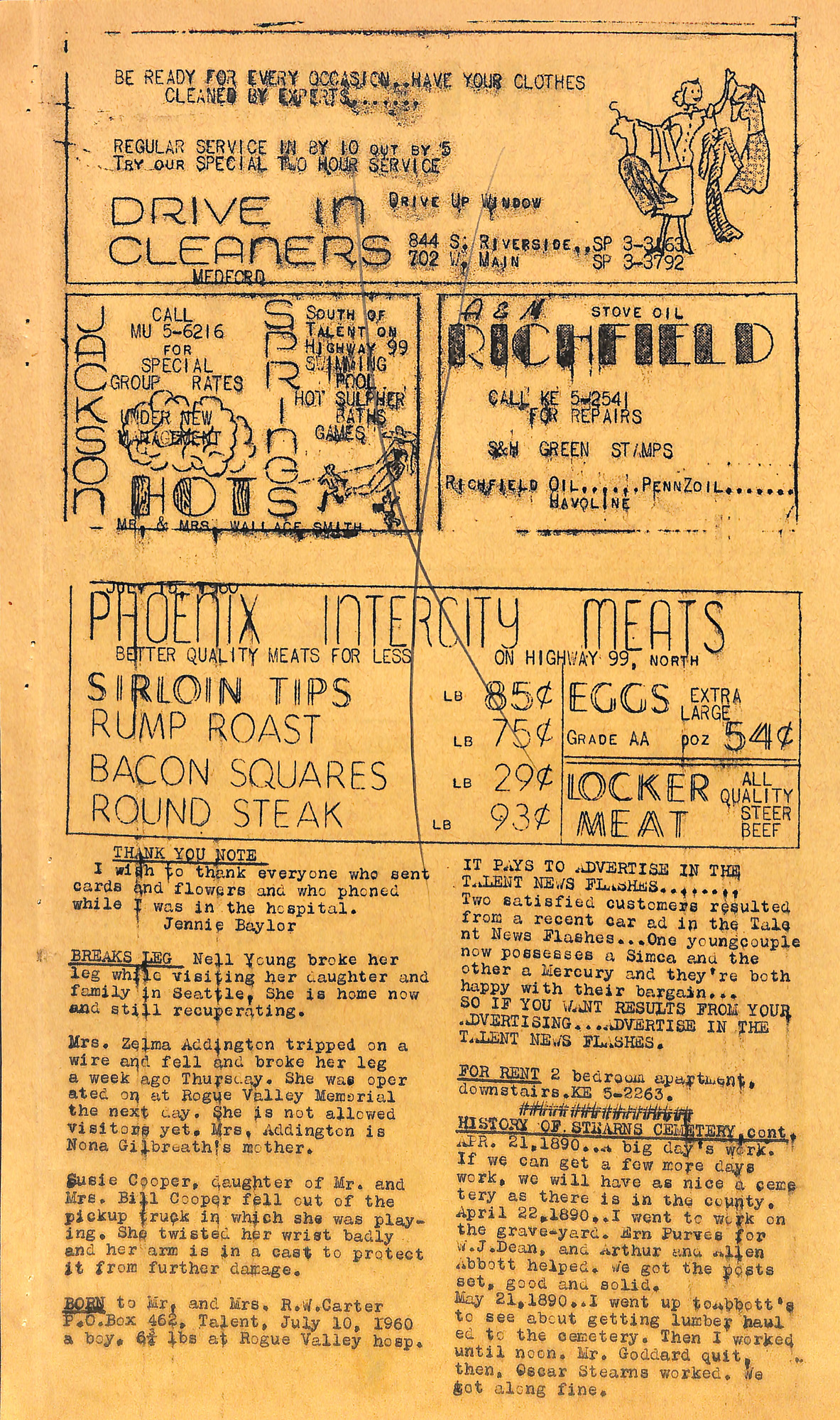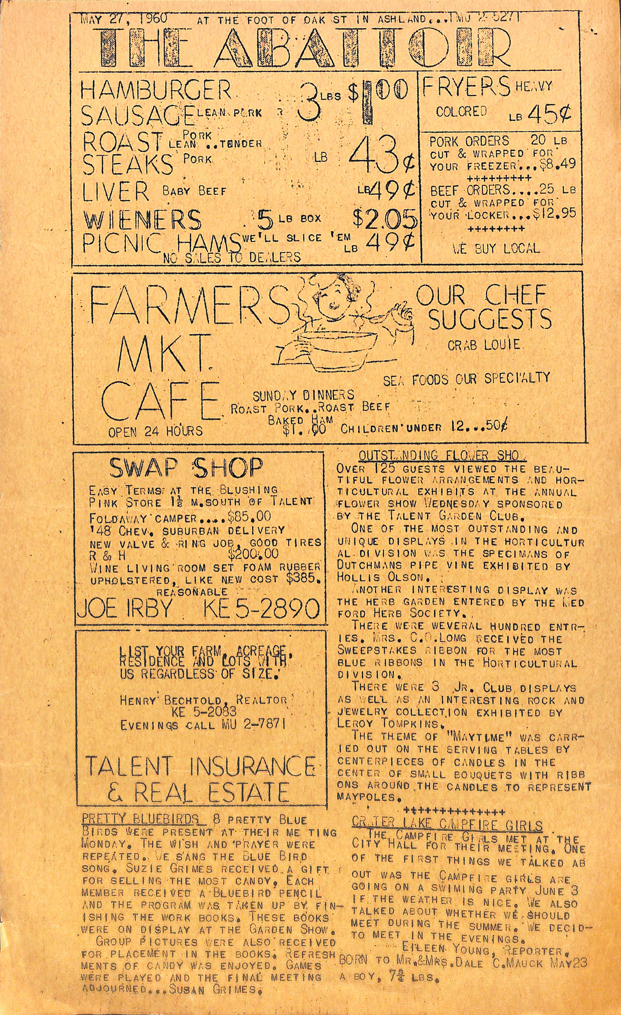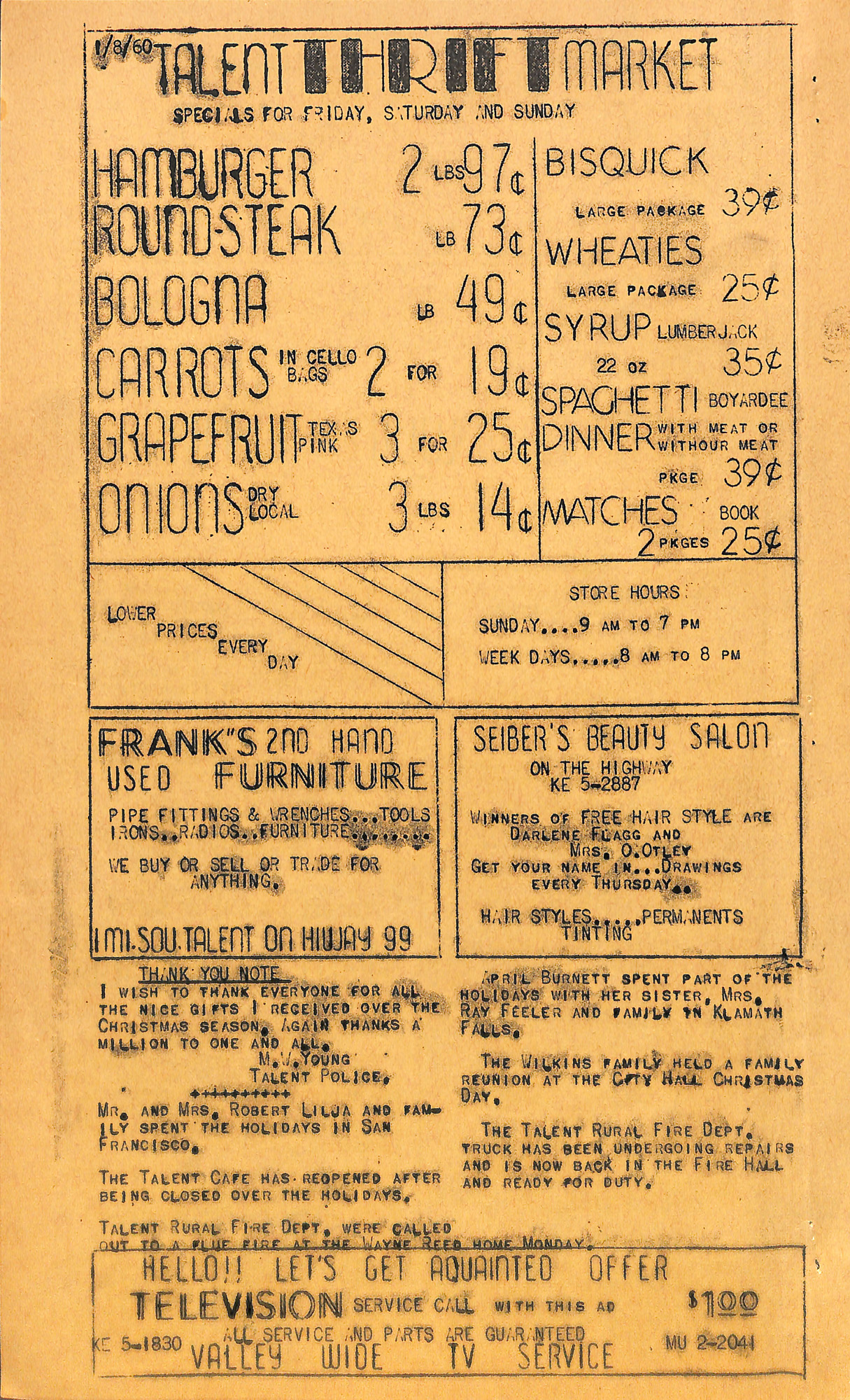 Talent News Flashes 1960- Talent News Flashes was a mimeographed newspaper and advertising shopper started by Ray’s Market in 1934. It continued until 1989 and presents a vibrant picture of the Talent community and the adjacent area for more than fifty years. While started by Ray’s, the Flashes are most remembered for their longest serving editors, Mae Lowe and Alice Burnette. Transcribed 2024-25 by Mary Tsui. Issues not transcribed below are not known to have survived; please notify me if any are discovered. Links to images of all the surviving issues can be found here. -