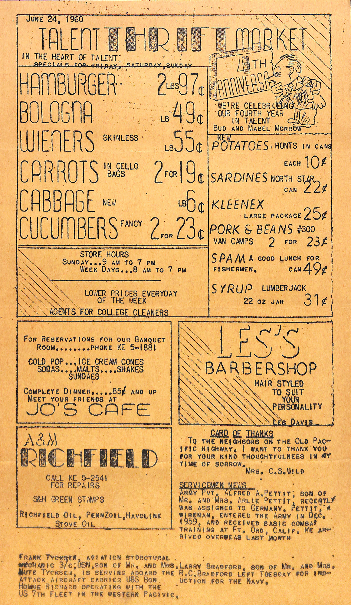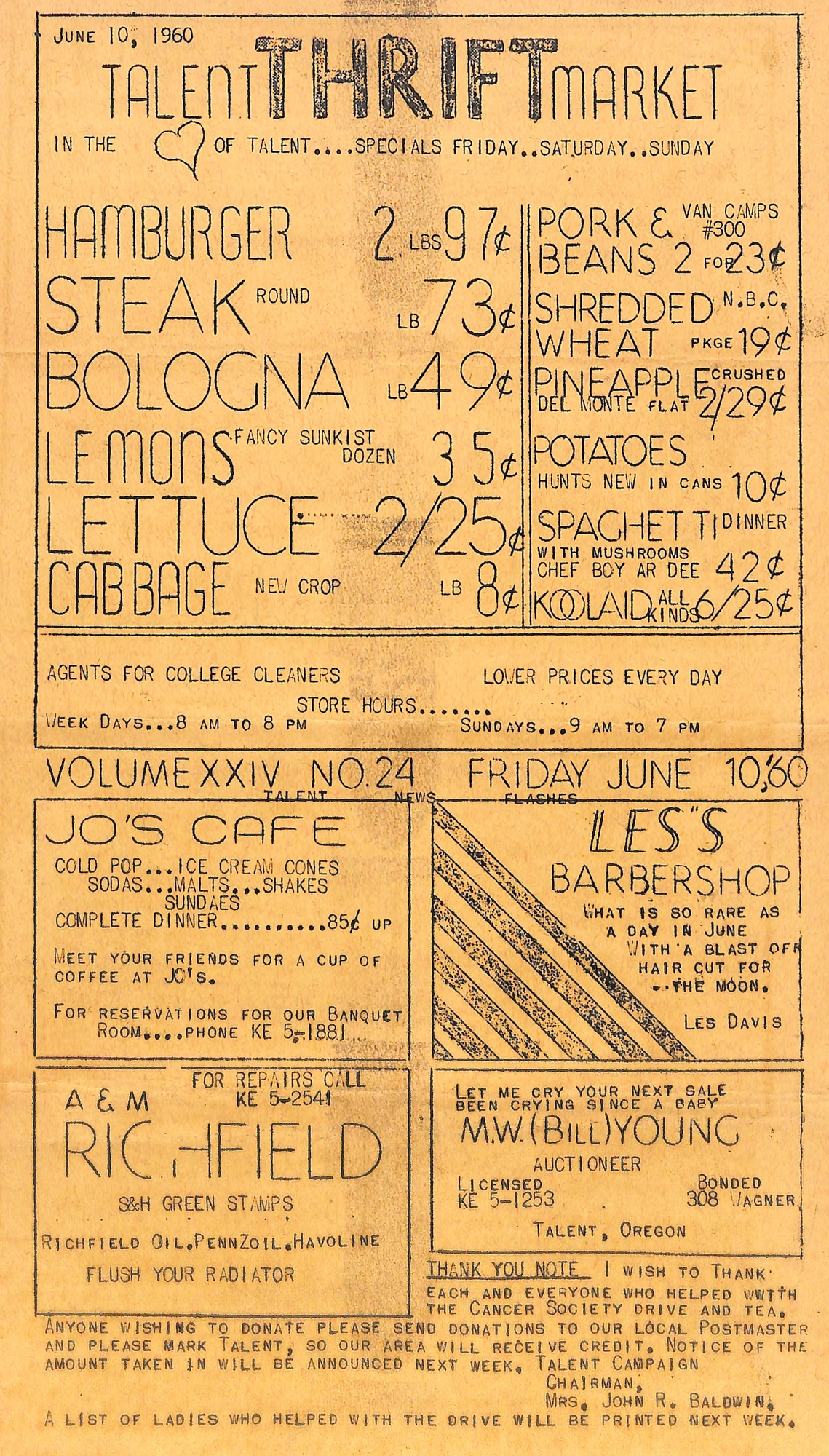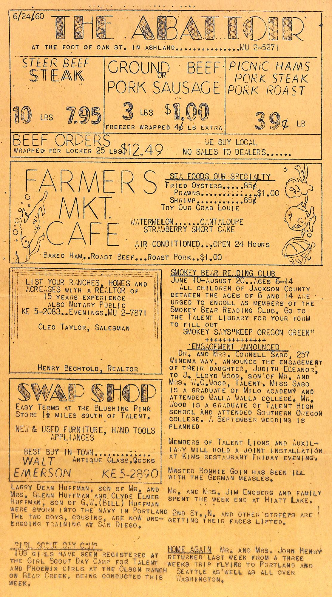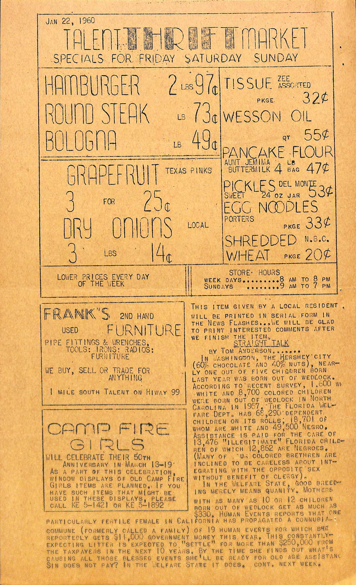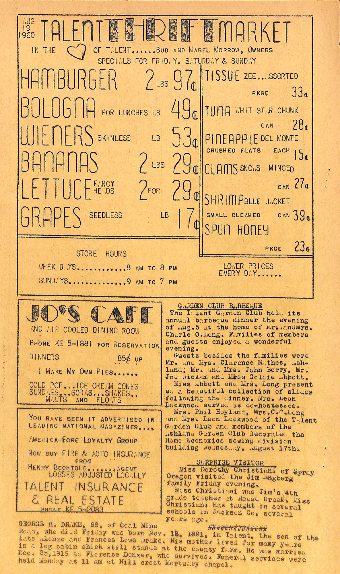 Talent News Flashes 1960- Talent News Flashes was a mimeographed newspaper and advertising shopper started by Ray’s Market in 1934. It continued until 1989 and presents a vibrant picture of the Talent community and the adjacent area for more than fifty years. While started by Ray’s, the Flashes are most remembered for their longest serving editors, Mae Lowe and Alice Burnette. Transcribed 2024-25 by Mary Tsui. Issues not transcribed below are not known to have survived; please notify me if any are discovered. Links to images of all the surviving issues can be found here. -