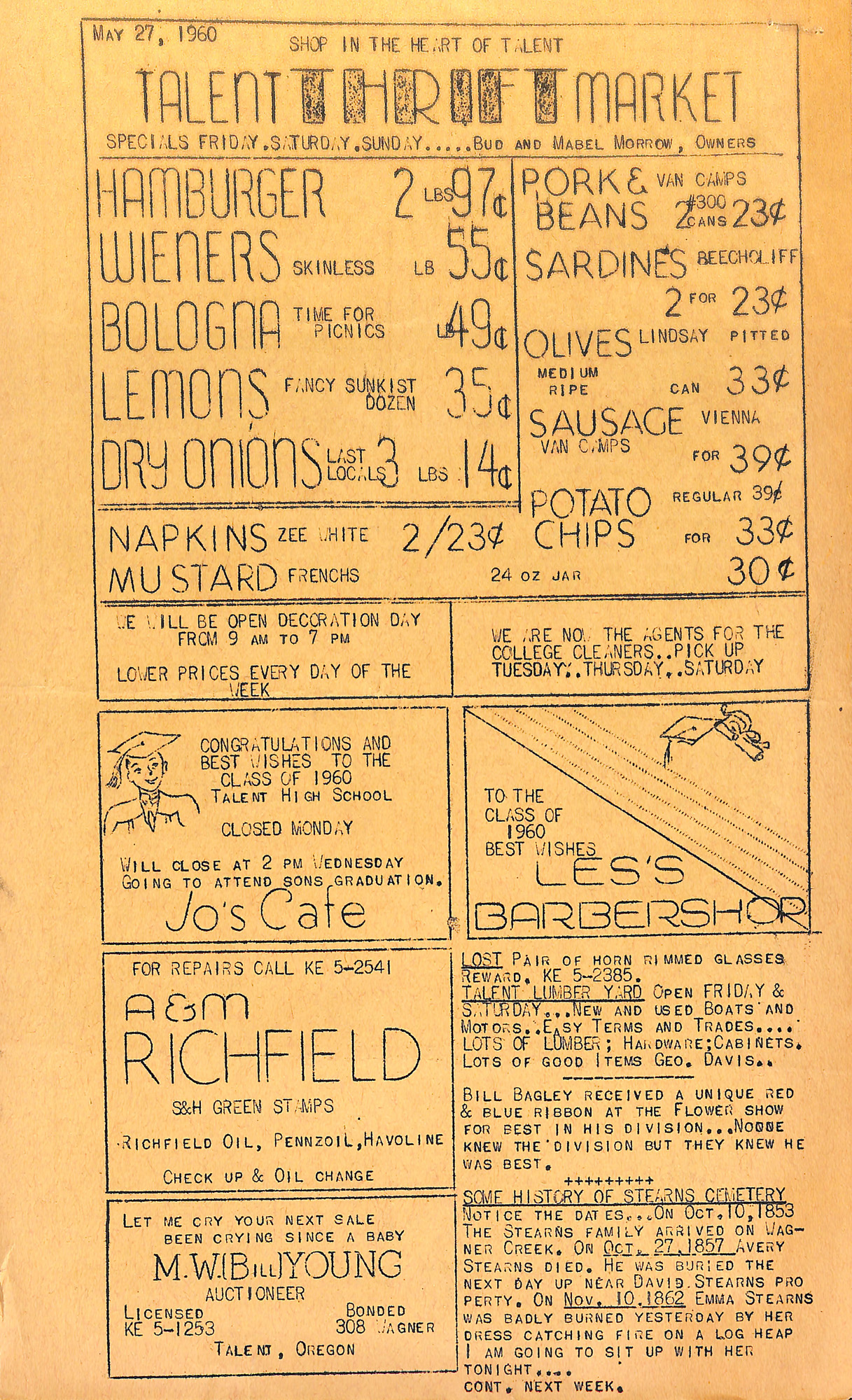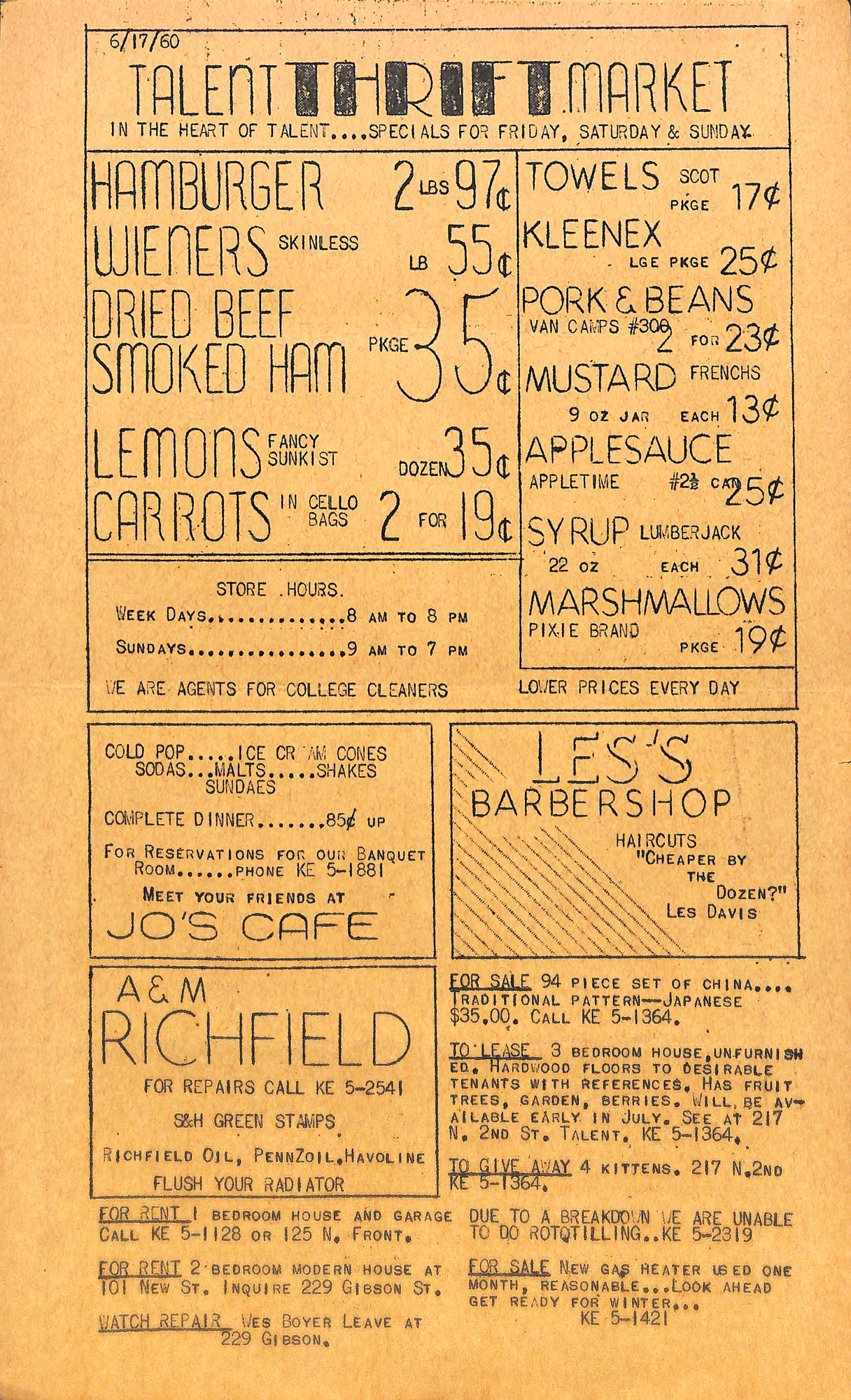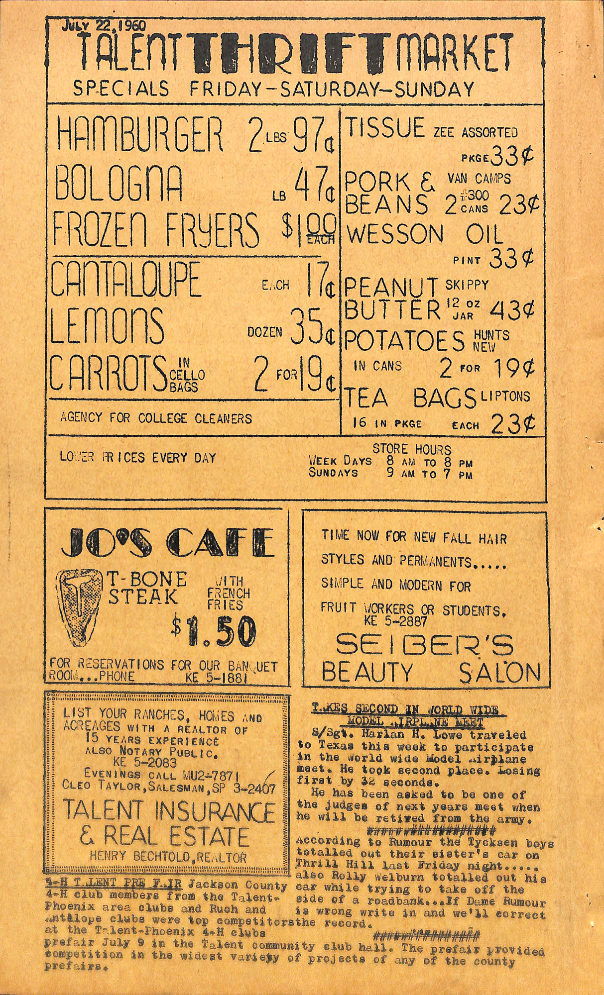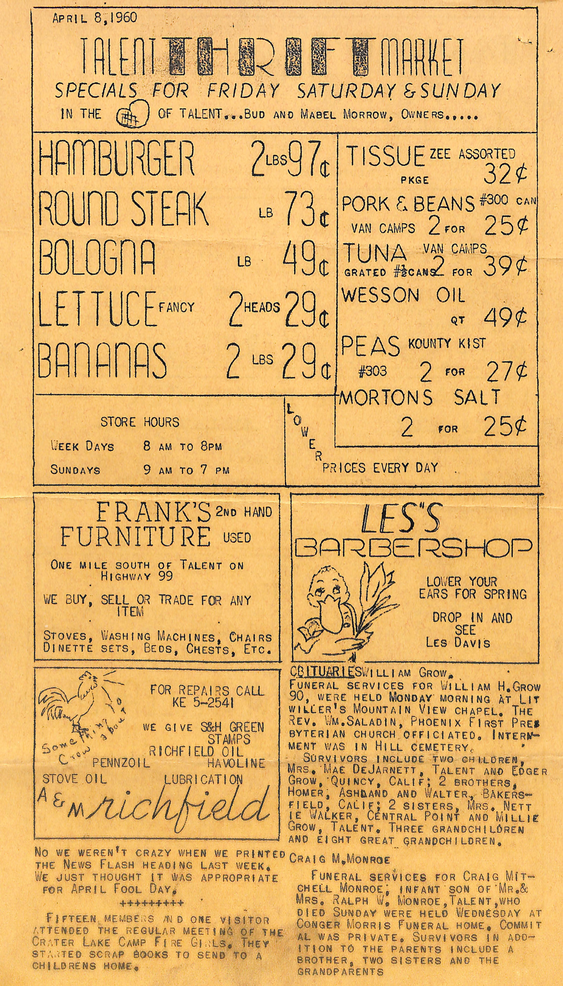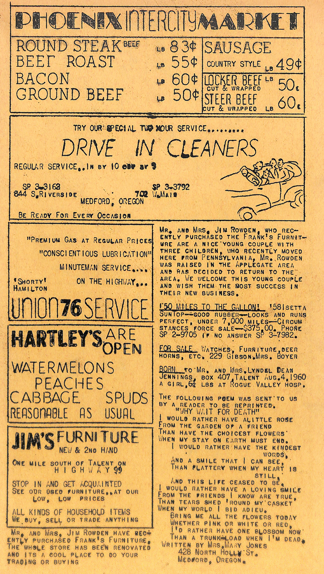 Talent News Flashes 1960- Talent News Flashes was a mimeographed newspaper and advertising shopper started by Ray’s Market in 1934. It continued until 1989 and presents a vibrant picture of the Talent community and the adjacent area for more than fifty years. While started by Ray’s, the Flashes are most remembered for their longest serving editors, Mae Lowe and Alice Burnette. Transcribed 2024-25 by Mary Tsui. Issues not transcribed below are not known to have survived; please notify me if any are discovered. Links to images of all the surviving issues can be found here. -