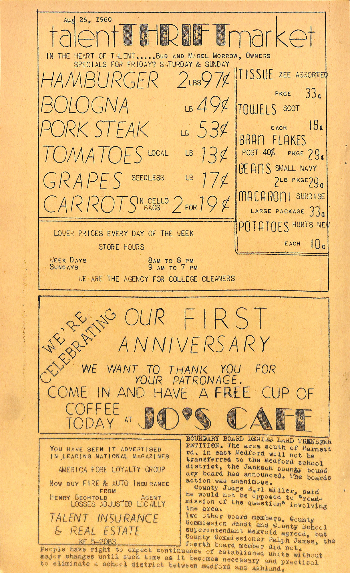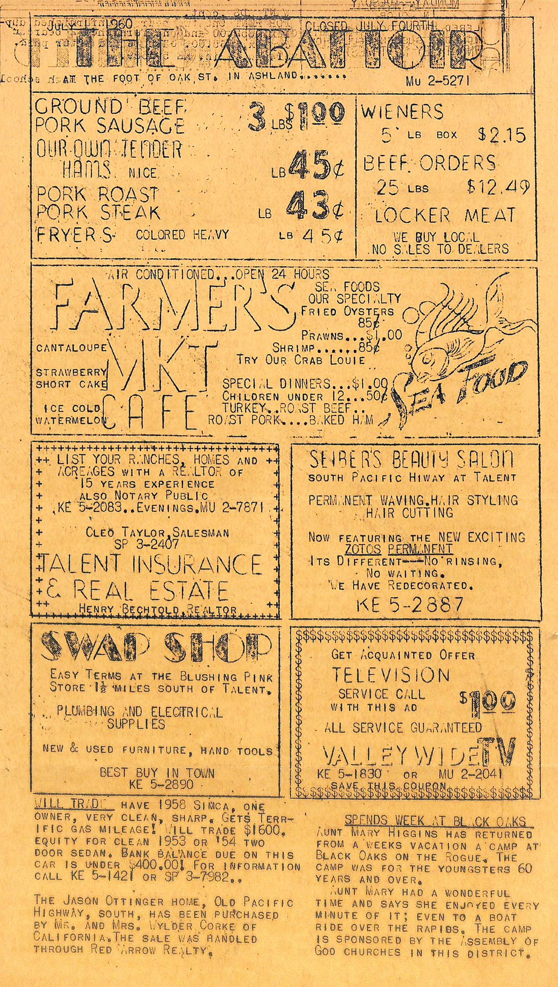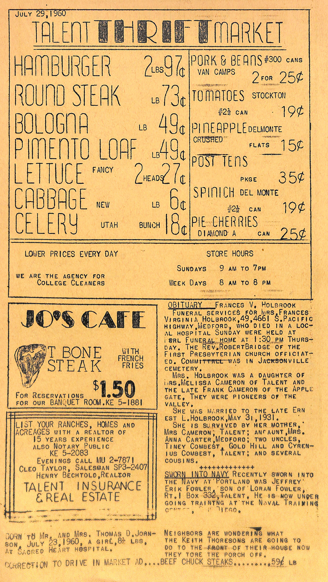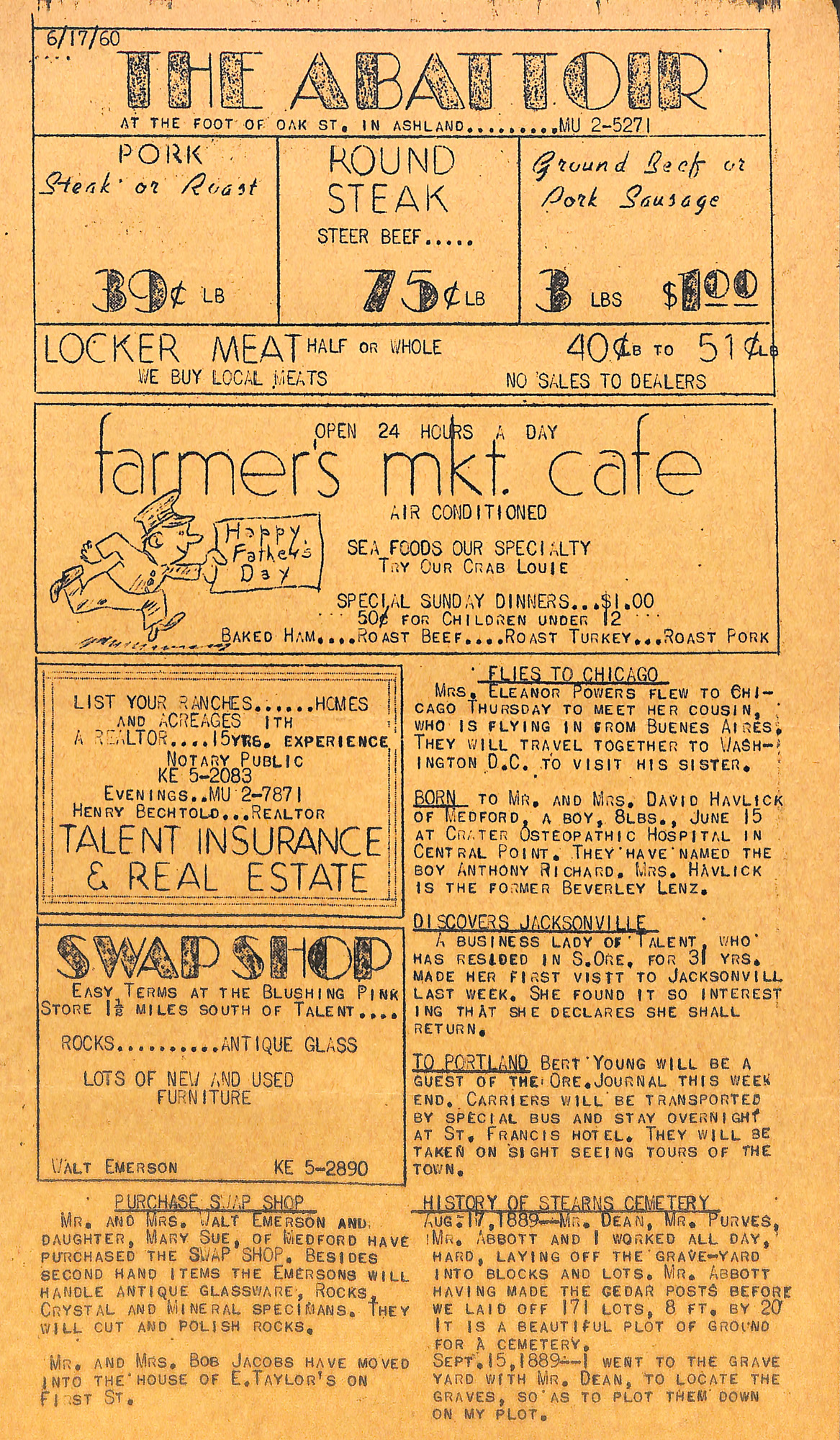 Talent News Flashes 1960- Talent News Flashes was a mimeographed newspaper and advertising shopper started by Ray’s Market in 1934. It continued until 1989 and presents a vibrant picture of the Talent community and the adjacent area for more than fifty years. While started by Ray’s, the Flashes are most remembered for their longest serving editors, Mae Lowe and Alice Burnette. Transcribed 2024-25 by Mary Tsui. Issues not transcribed below are not known to have survived; please notify me if any are discovered. Links to images of all the surviving issues can be found here. -