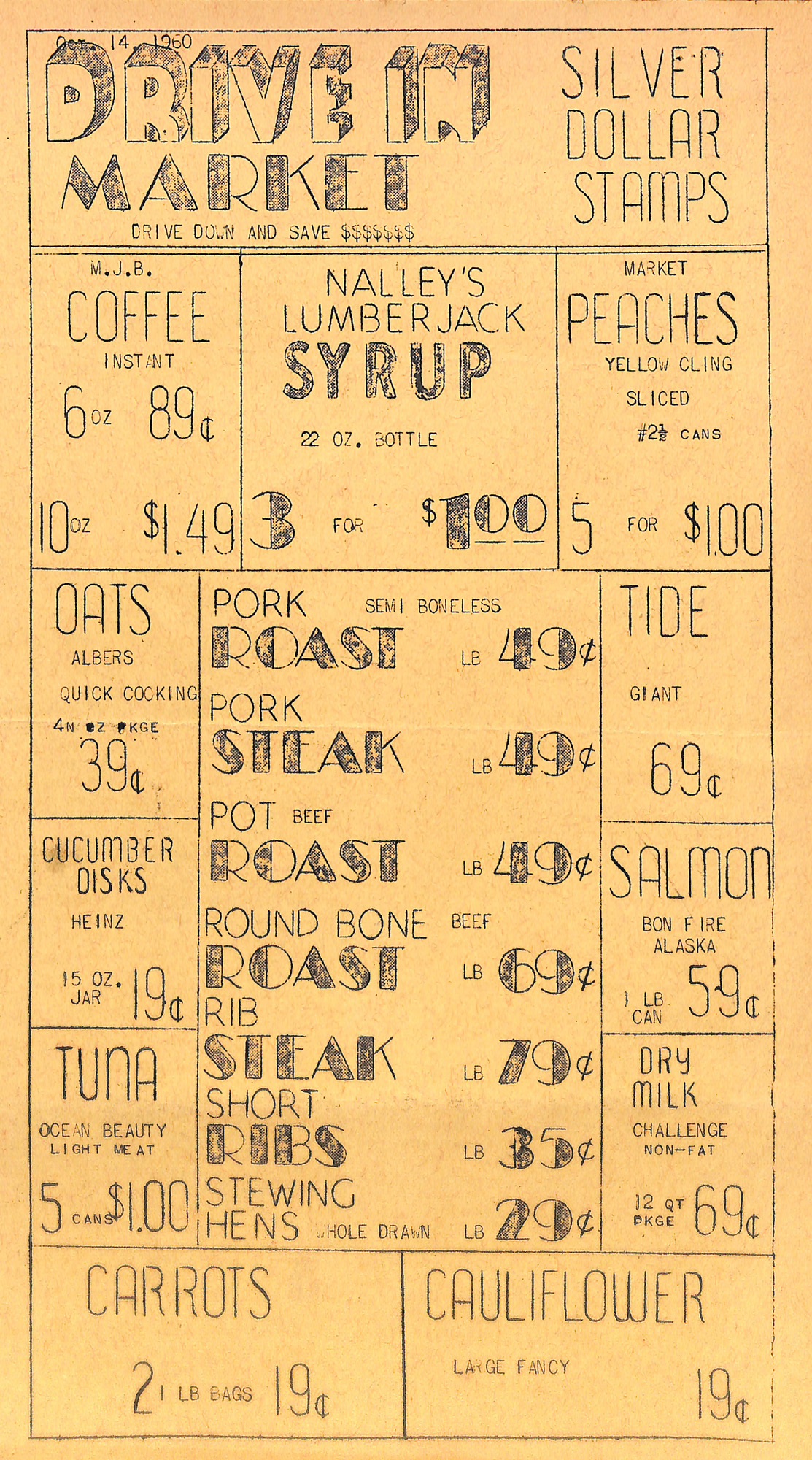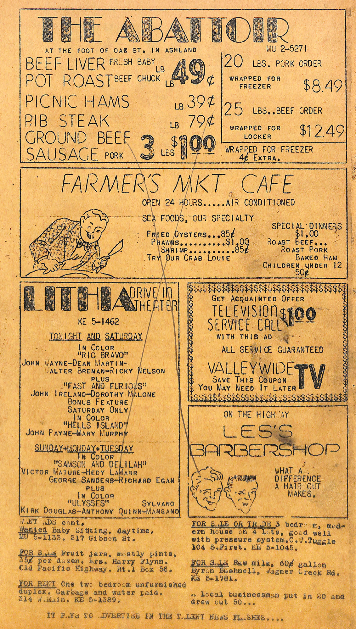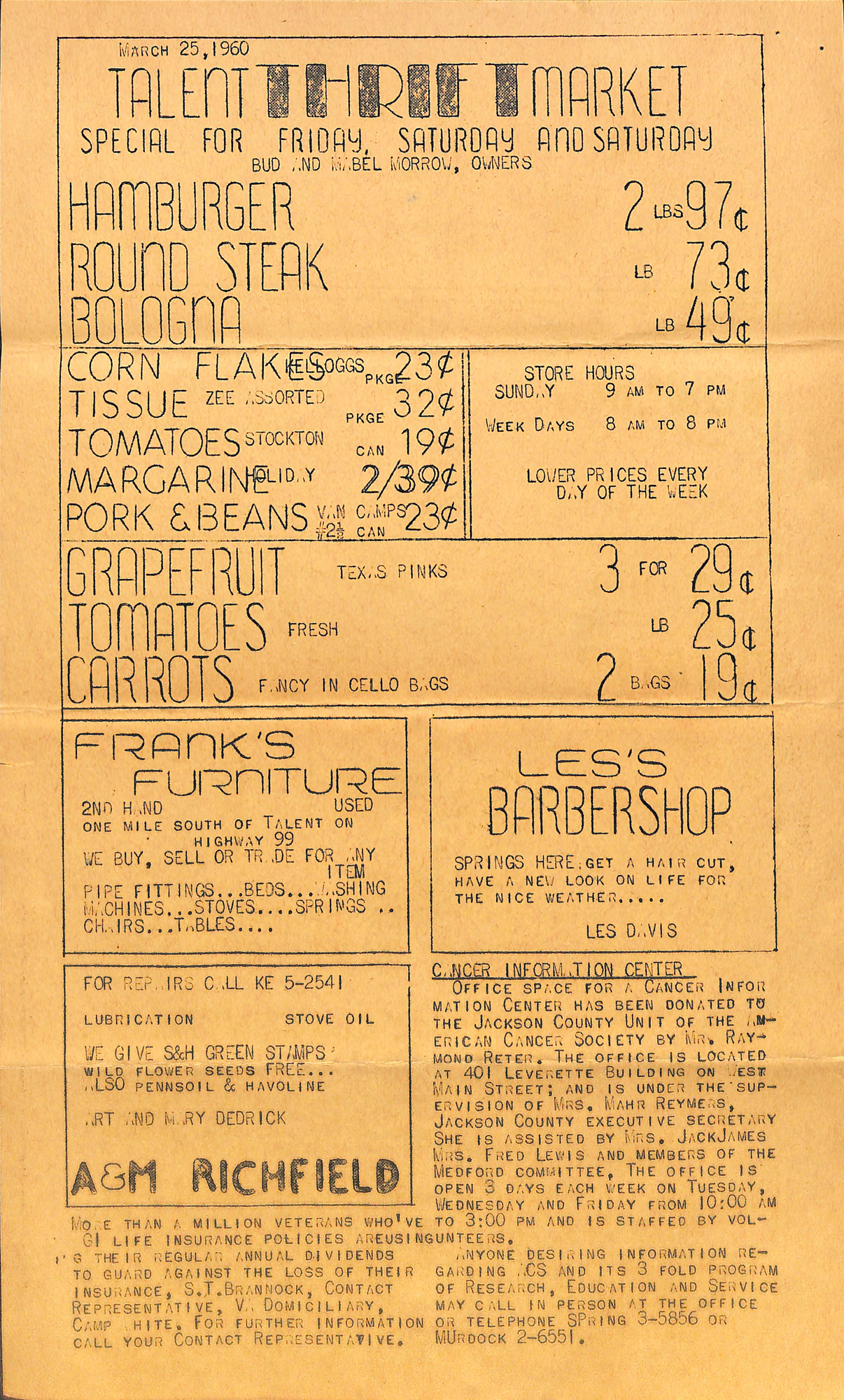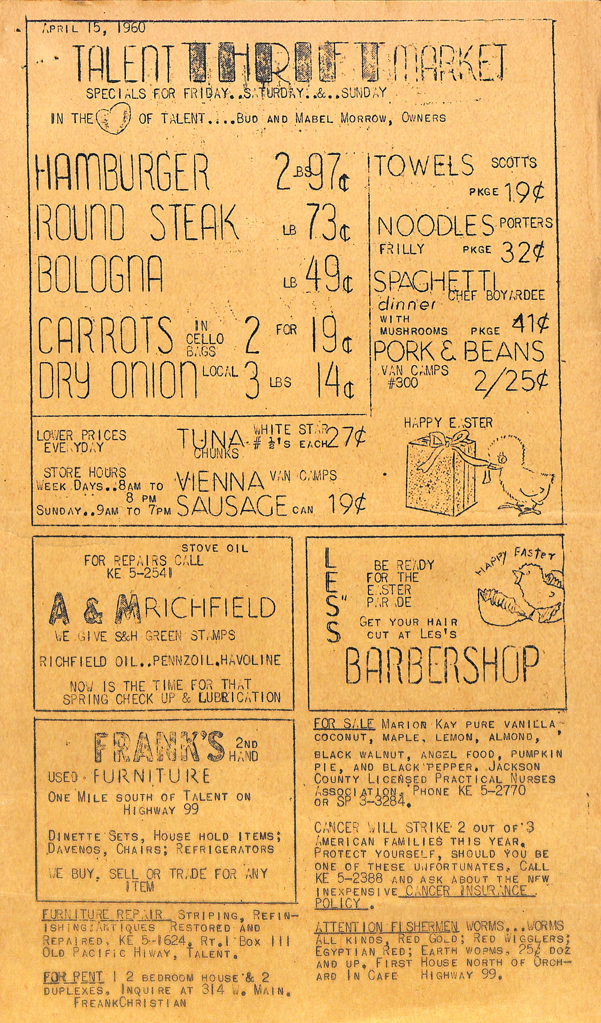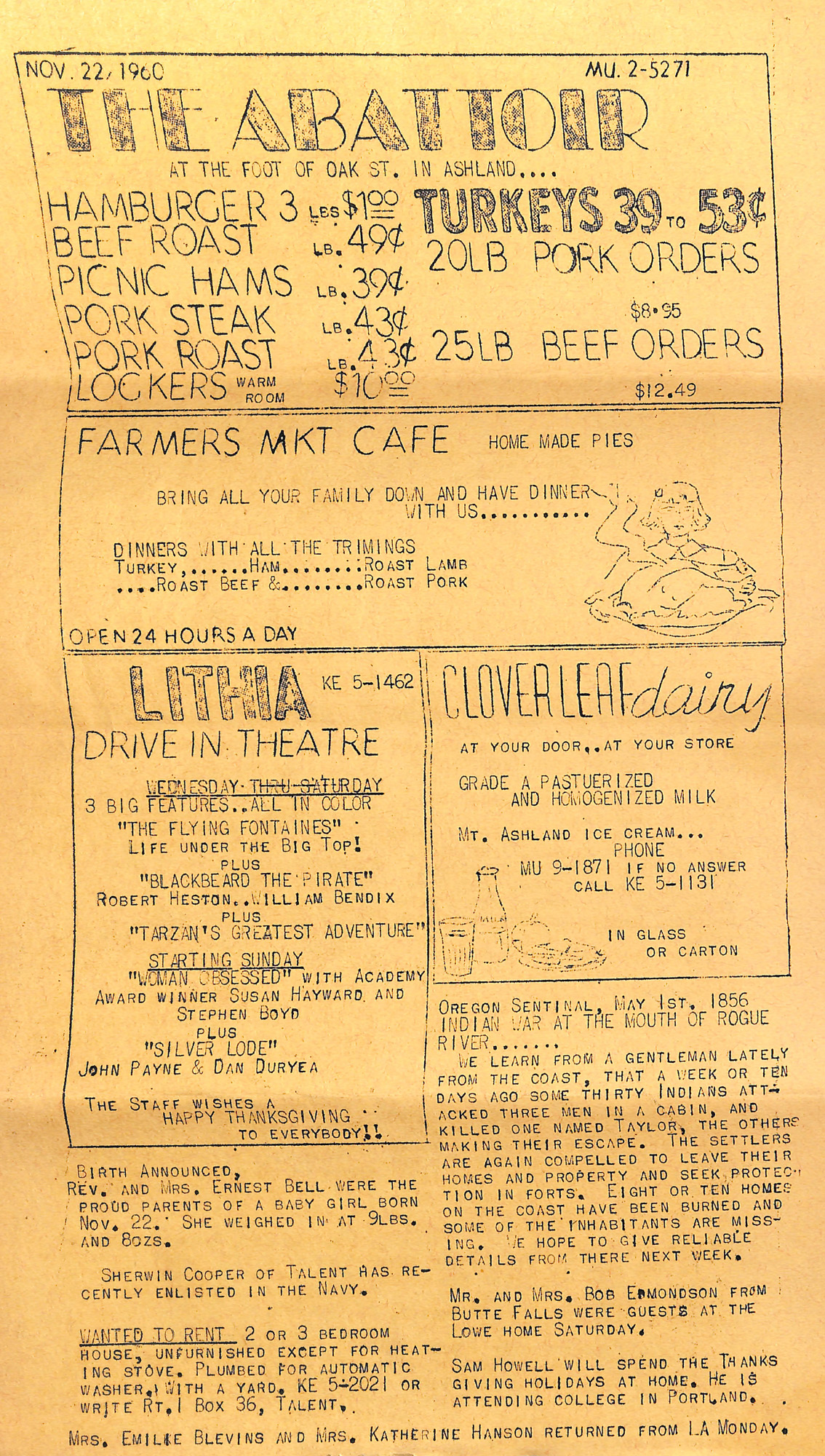 Talent News Flashes 1960- Talent News Flashes was a mimeographed newspaper and advertising shopper started by Ray’s Market in 1934. It continued until 1989 and presents a vibrant picture of the Talent community and the adjacent area for more than fifty years. While started by Ray’s, the Flashes are most remembered for their longest serving editors, Mae Lowe and Alice Burnette. Transcribed 2024-25 by Mary Tsui. Issues not transcribed below are not known to have survived; please notify me if any are discovered. Links to images of all the surviving issues can be found here. -