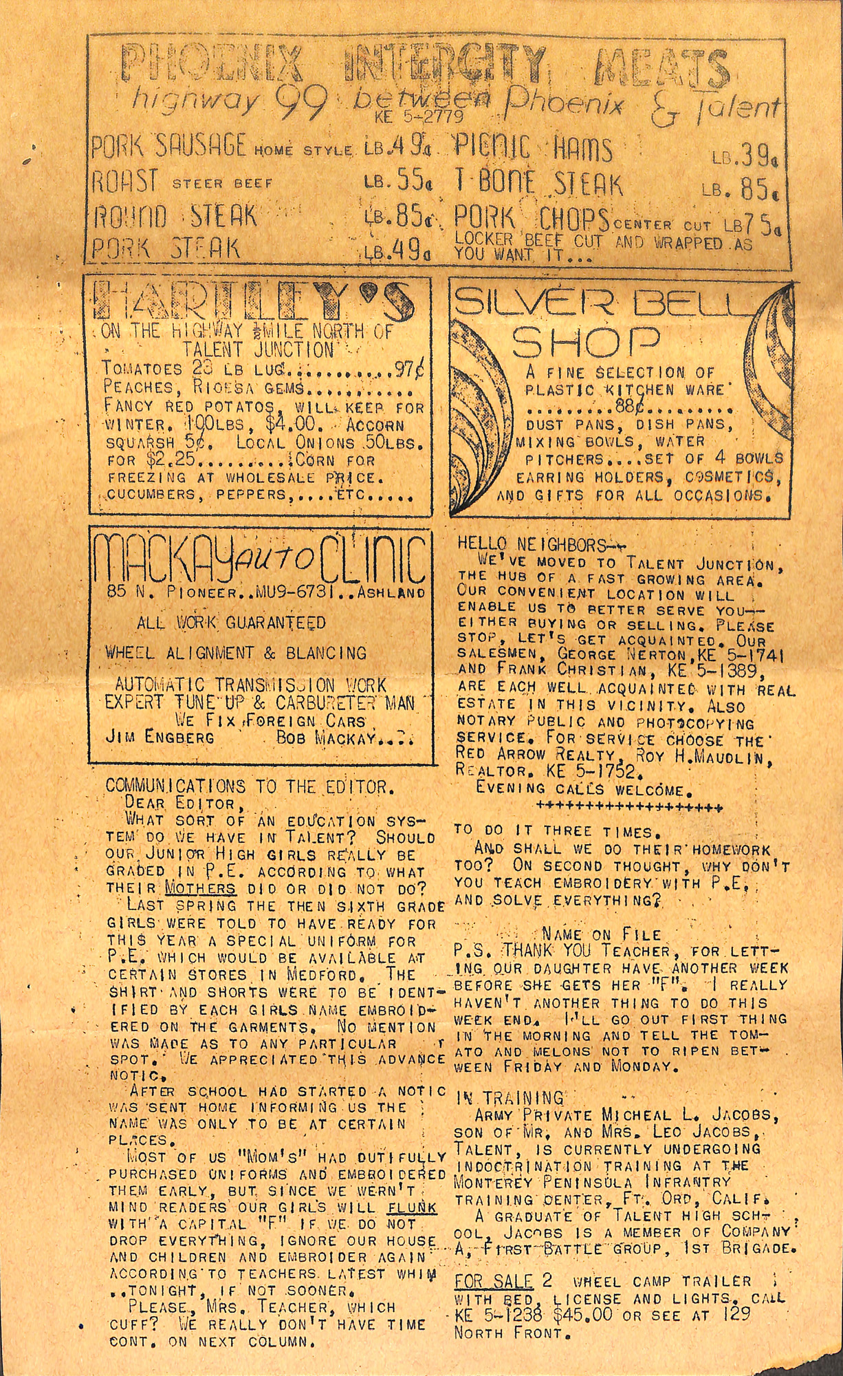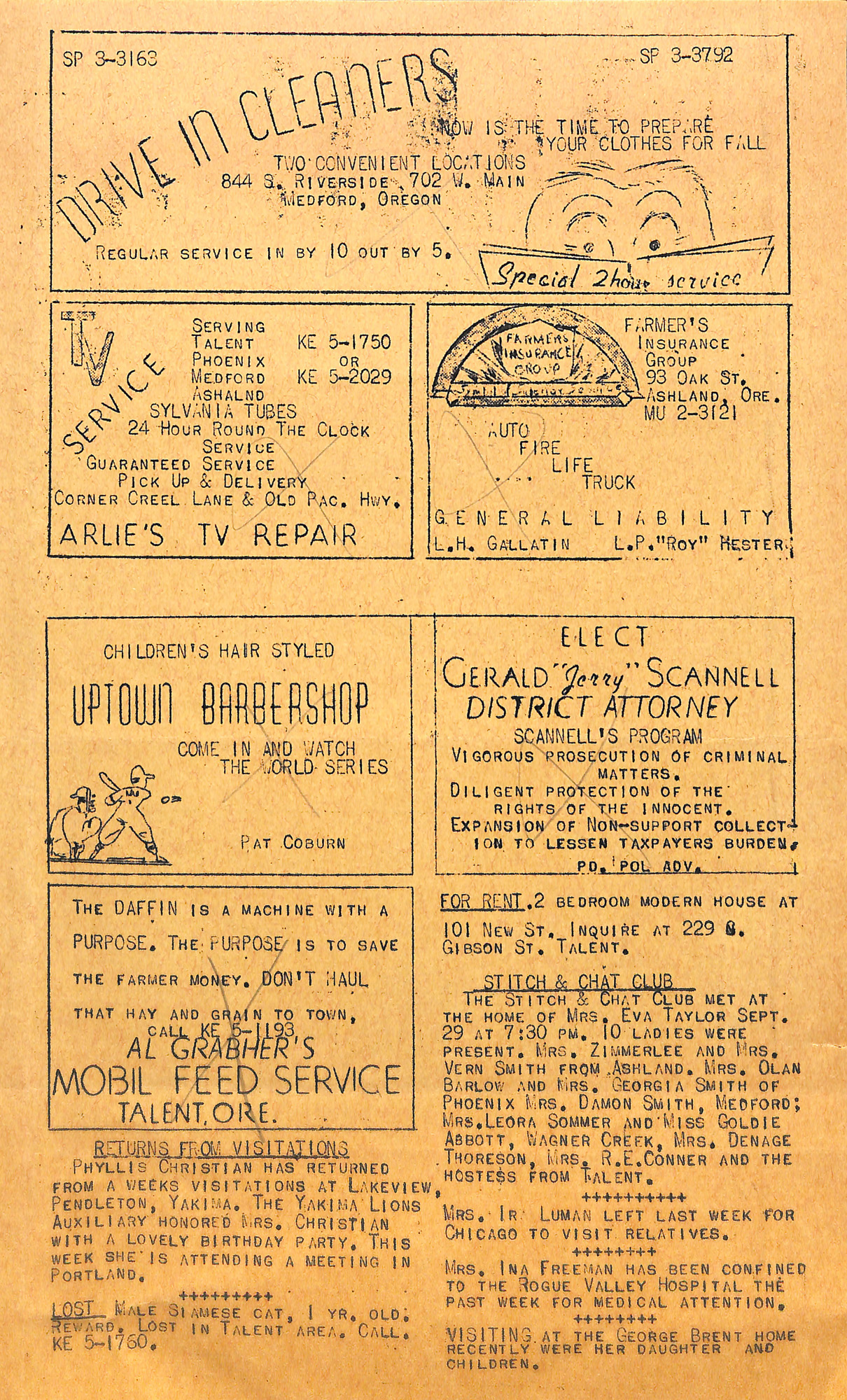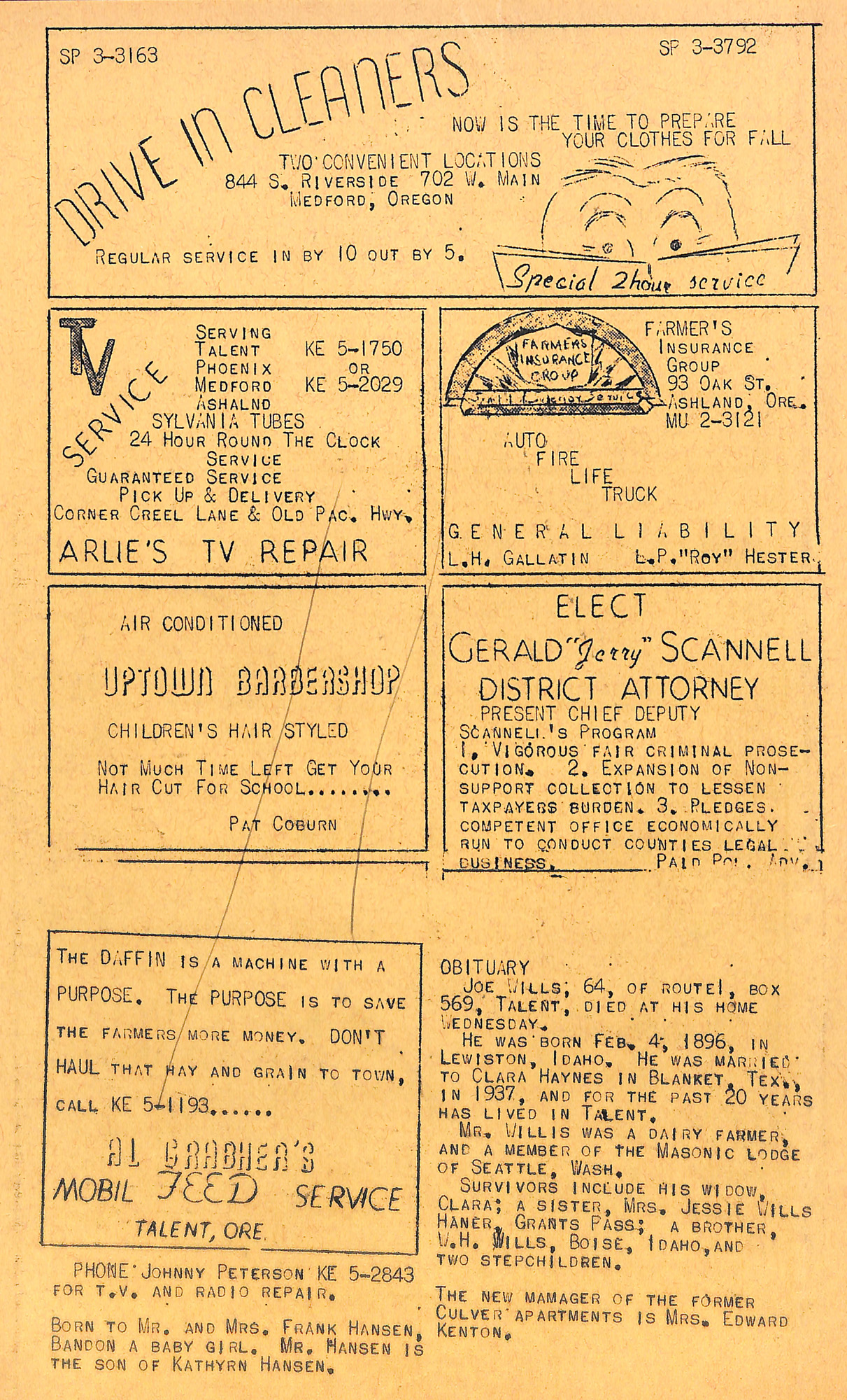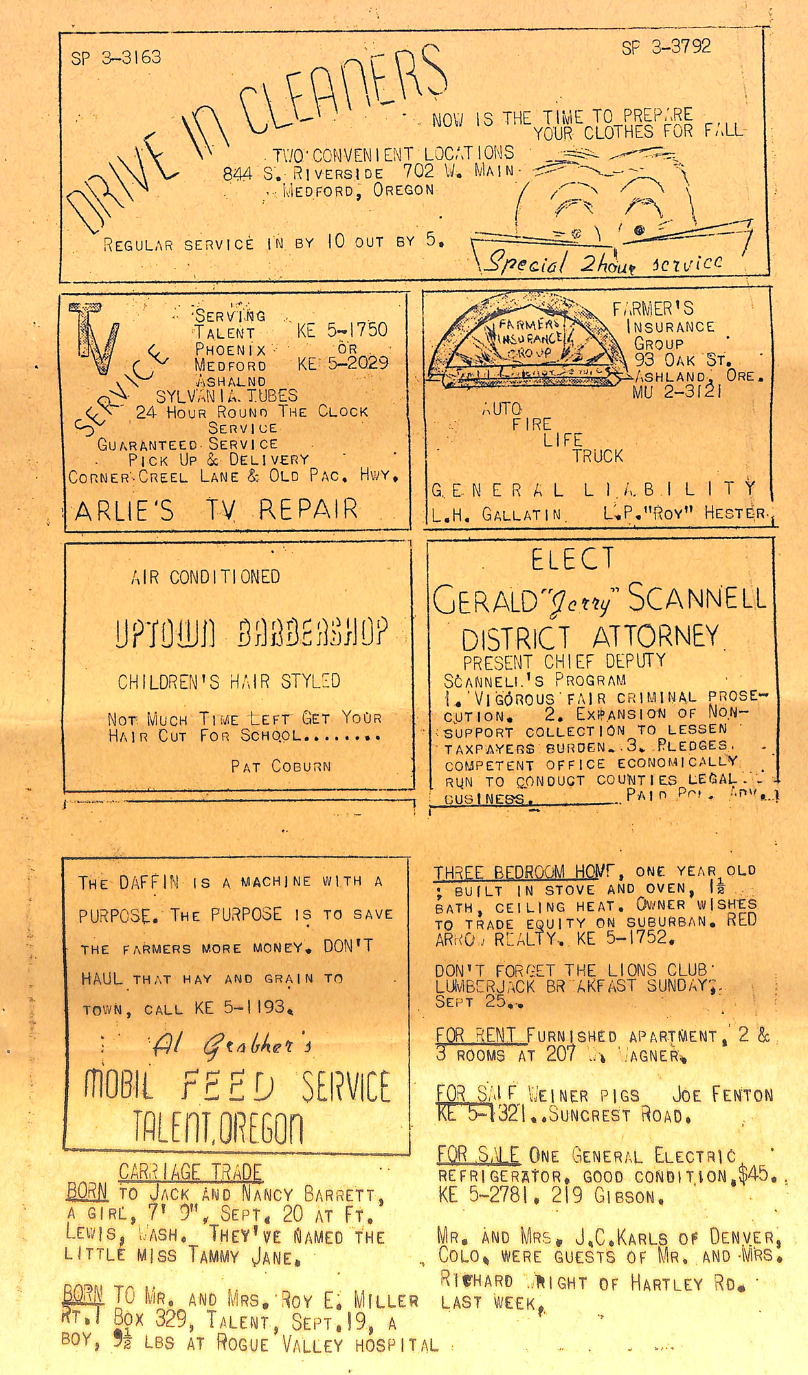 STEIGER GARAGE WORK TOM SAGER TRACTOR GRADING & ROTOTILLING 2-BEDROOM MODERN, REDECORATED HOUSE FOR RENT STARK'S TREES AND SHRUBS Vote for Ed McGinty for Surveyor. Page 8, full-page ad for: VALLEY LOCKER & GROCERY Page 9, ads for: DRIVE-IN CLEANERS ARLIE'S TV REPAIR SERVICE FARMER'S INSURANCE--L.H. GALLATIN UPTOWN BARBERSHOP ELECT GERALD "JERRY" SCANNELL--District Attorney AL GRABHER'S MOBILE FEED SERVICE FOR SALE--Small chrome table and 2 chairs; vacuum cleaner; power mower; cream separator; projector & screen. KE 5-1729. Anytime after 6 pm Saturday. FOR RENT--2- & 3-room furnished apts, $25, $30, $35 per month. Water. Garbage paid. Pay electricity for lights and refrigerator. KE 5-1276. FOR SALE--2 home sites with beautiful view, irrigation and small acreage. By owner. Call evenings. SP 3-3714. FOUND--Bunch of keys on ring. Owner may have same by identifying at 109 S. 2nd St., Talent. LETTER TO THE EDITOR--cont. from last wk. …must be in the designated places. No mention was made of flunking. Since most 7th and 8th grade girls are capable of embroidering, one week seemed sufficient time. This was later extended since two mothers called me requesting additional time and I felt it only fair to give everyone an extra week. The statement was made that most mothers had embroidered the uniform before school started and consequently had them in the wrong place. My records for the first week of school show eight girls had their names in the wrong place on their shorts. The shirts were all right. To those eight mothers, I apologize for causing them extra work. I am happy the other one hundred twelve waited. Sincerely,
