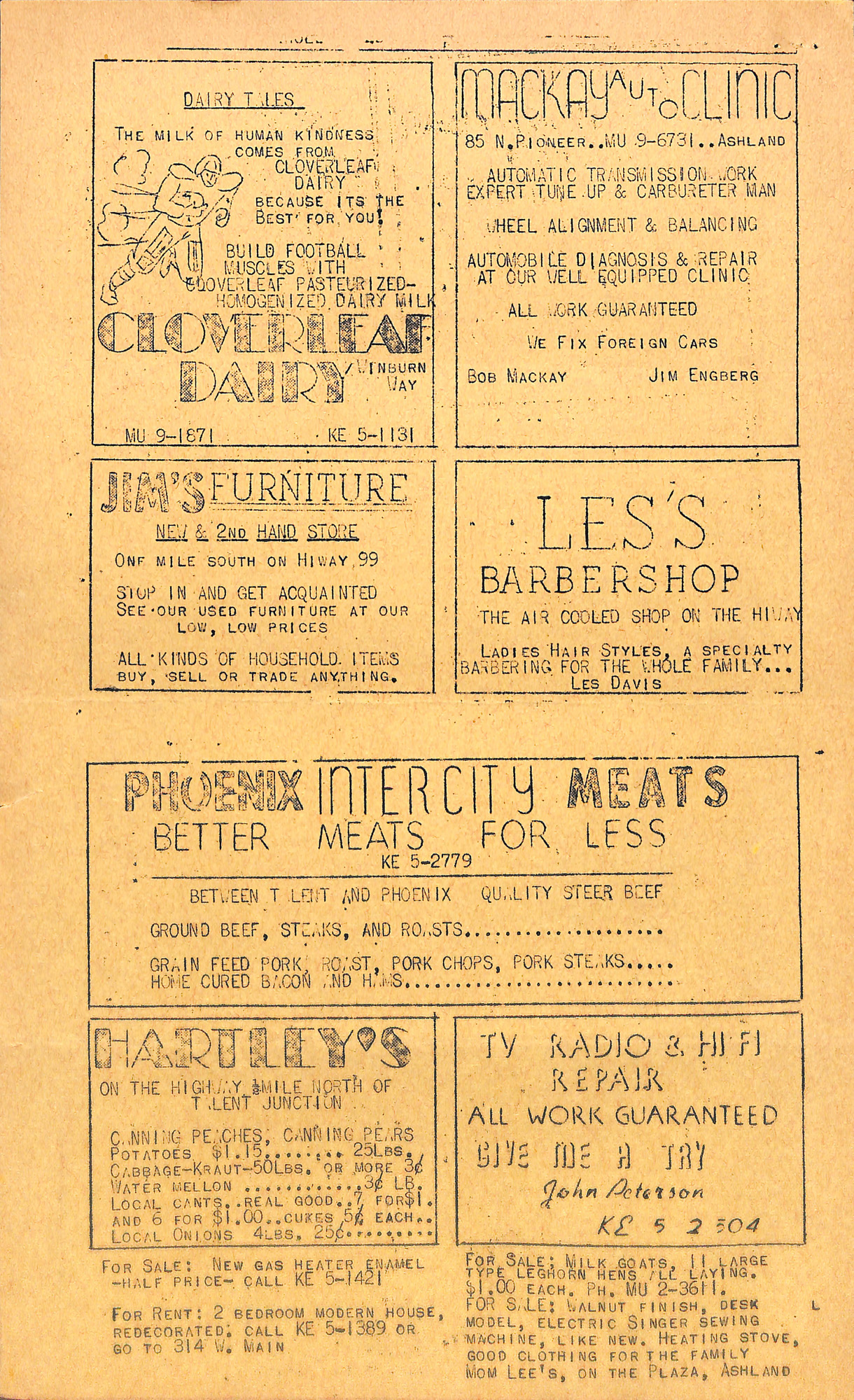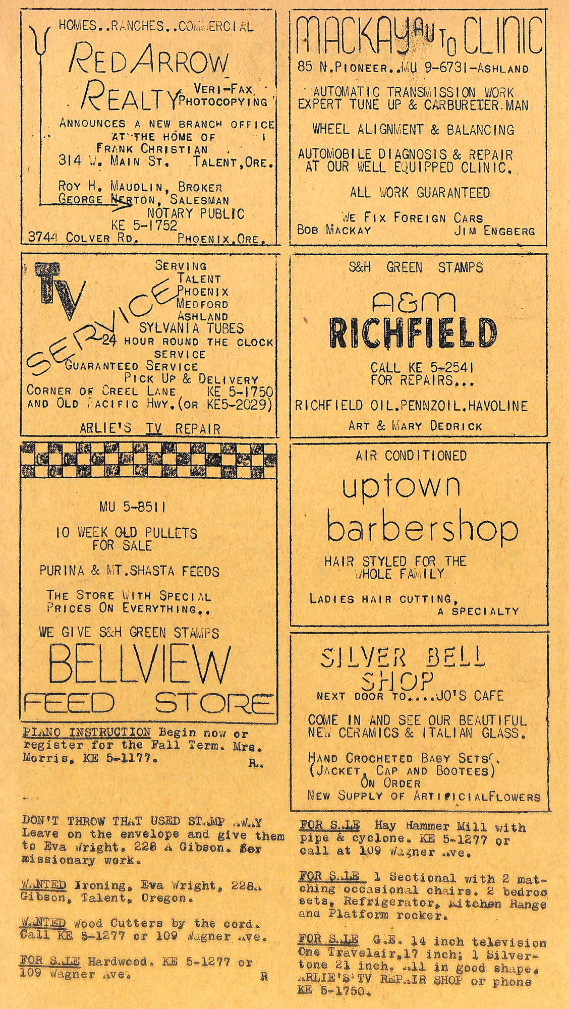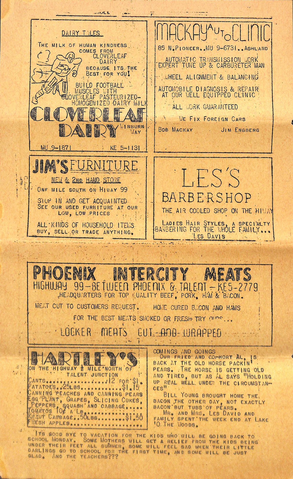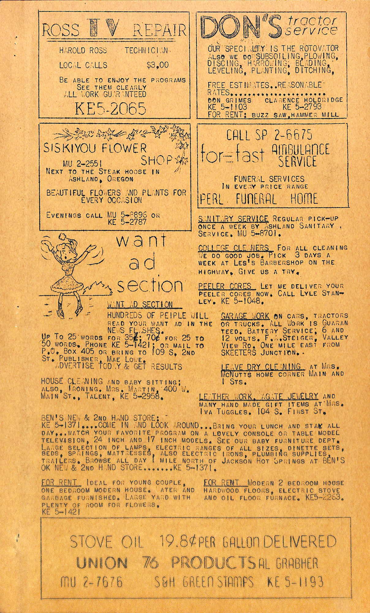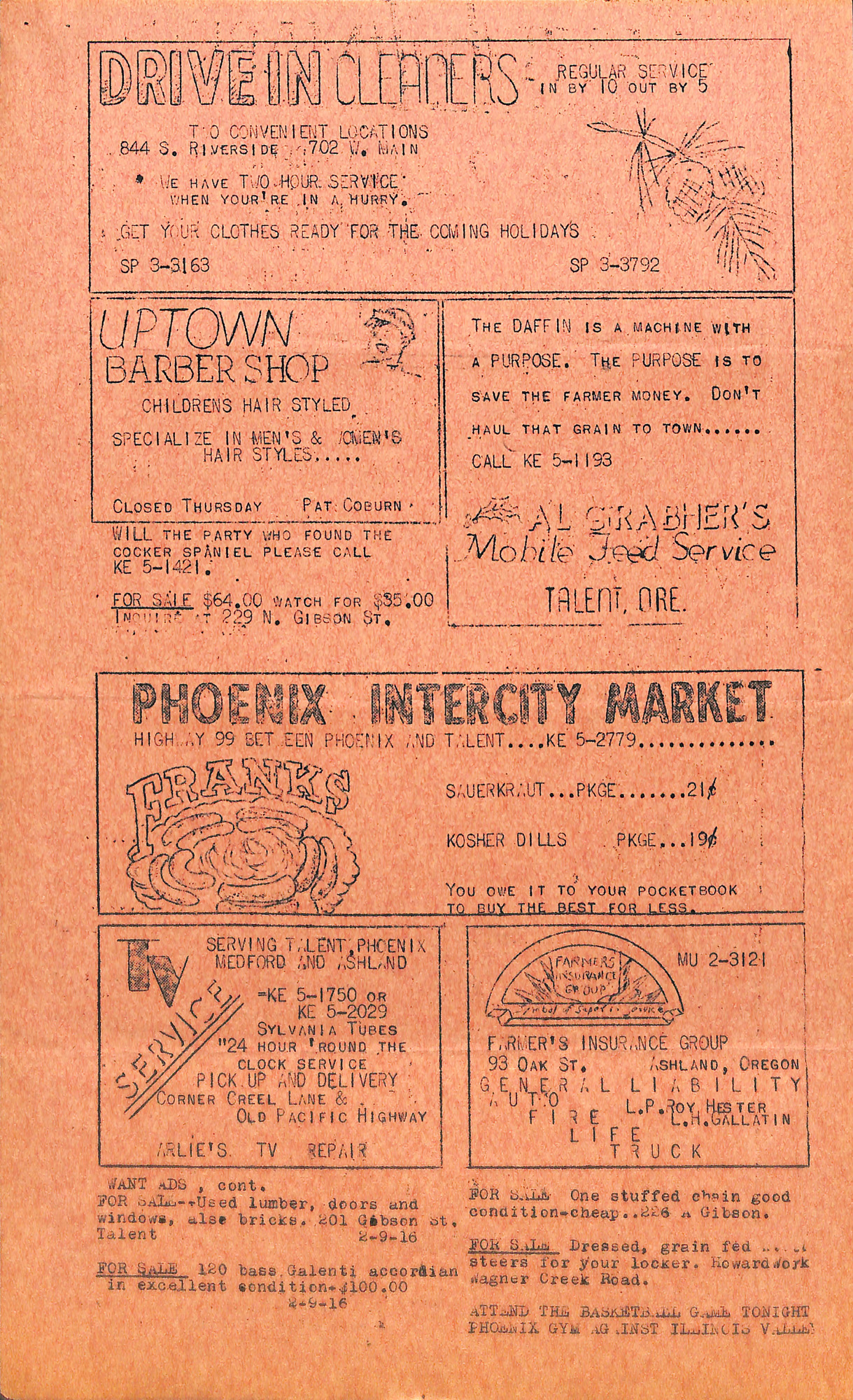 STEIGER GARAGE WORK TOM SAGER TRACTOR GRADING & ROTOTILLING 2-BEDROOM MODERN, REDECORATED HOUSE FOR RENT STARK'S TREES AND SHRUBS Vote for Ed McGinty for Surveyor. Page 8, full-page ad for: VALLEY LOCKER & GROCERY Page 9, ads for: DRIVE-IN CLEANERS ARLIE'S TV REPAIR SERVICE FARMER'S INSURANCE--L.H. GALLATIN UPTOWN BARBERSHOP ELECT GERALD "JERRY" SCANNELL--District Attorney AL GRABHER'S MOBILE FEED SERVICE FOR SALE--Small chrome table and 2 chairs; vacuum cleaner; power mower; cream separator; projector & screen. KE 5-1729. Anytime after 6 pm Saturday. FOR RENT--2- & 3-room furnished apts, $25, $30, $35 per month. Water. Garbage paid. Pay electricity for lights and refrigerator. KE 5-1276. FOR SALE--2 home sites with beautiful view, irrigation and small acreage. By owner. Call evenings. SP 3-3714. FOUND--Bunch of keys on ring. Owner may have same by identifying at 109 S. 2nd St., Talent. LETTER TO THE EDITOR--cont. from last wk. …must be in the designated places. No mention was made of flunking. Since most 7th and 8th grade girls are capable of embroidering, one week seemed sufficient time. This was later extended since two mothers called me requesting additional time and I felt it only fair to give everyone an extra week. The statement was made that most mothers had embroidered the uniform before school started and consequently had them in the wrong place. My records for the first week of school show eight girls had their names in the wrong place on their shorts. The shirts were all right. To those eight mothers, I apologize for causing them extra work. I am happy the other one hundred twelve waited. Sincerely,