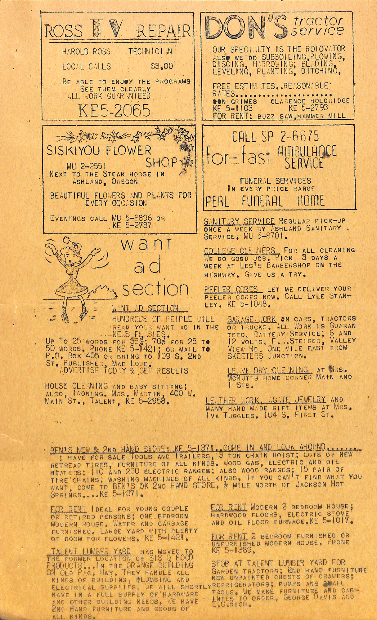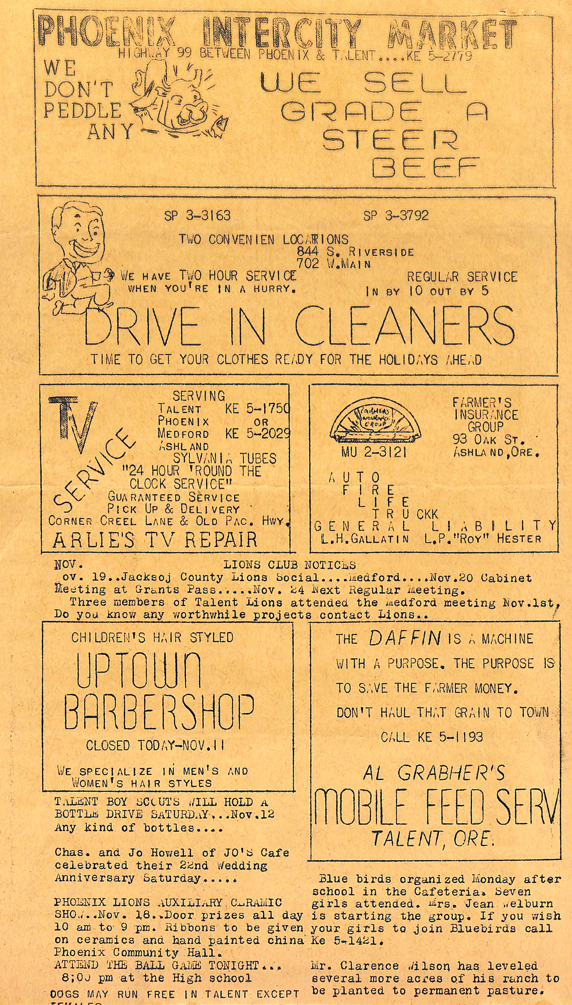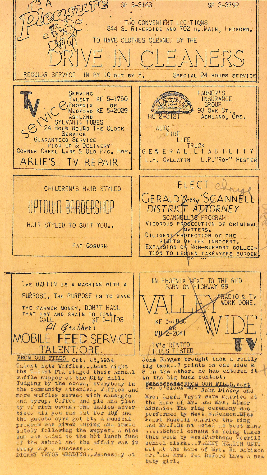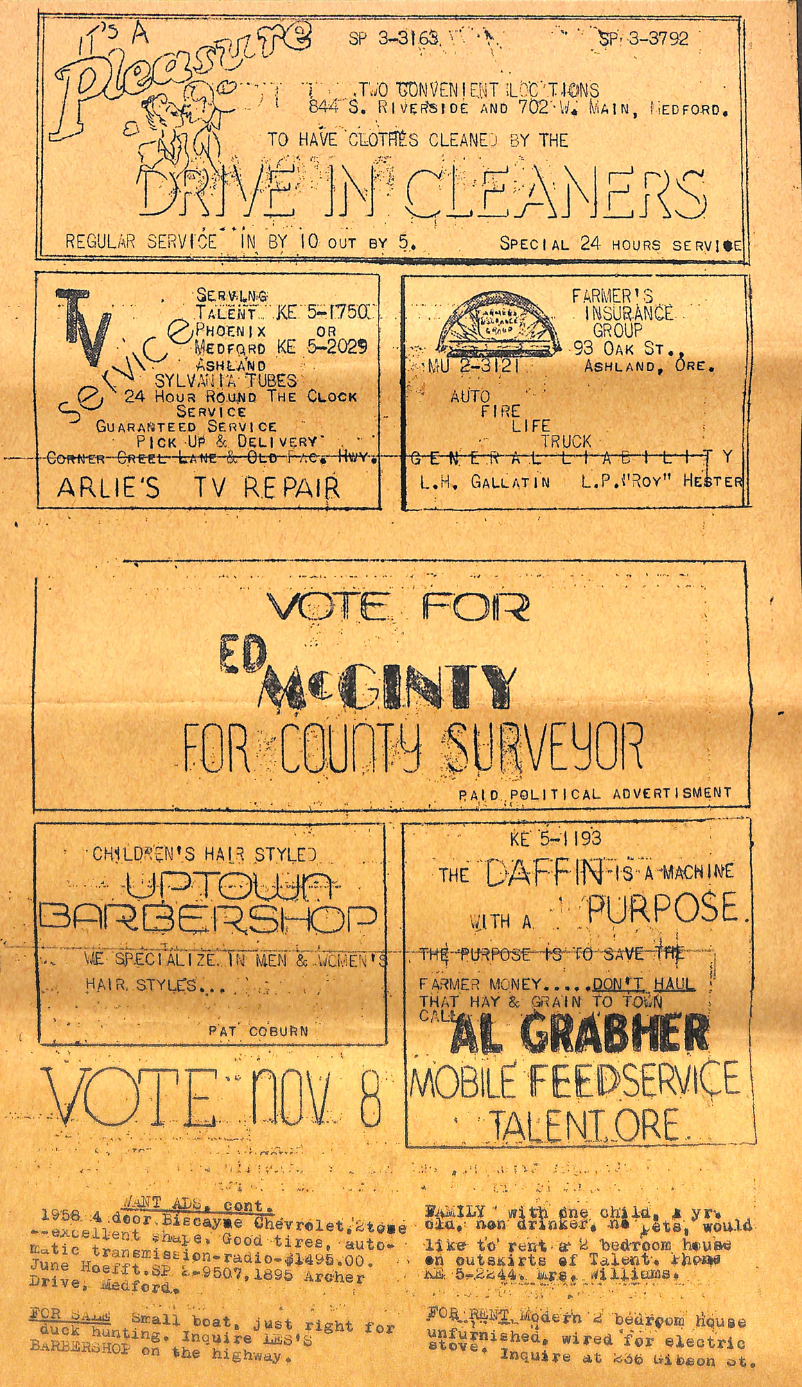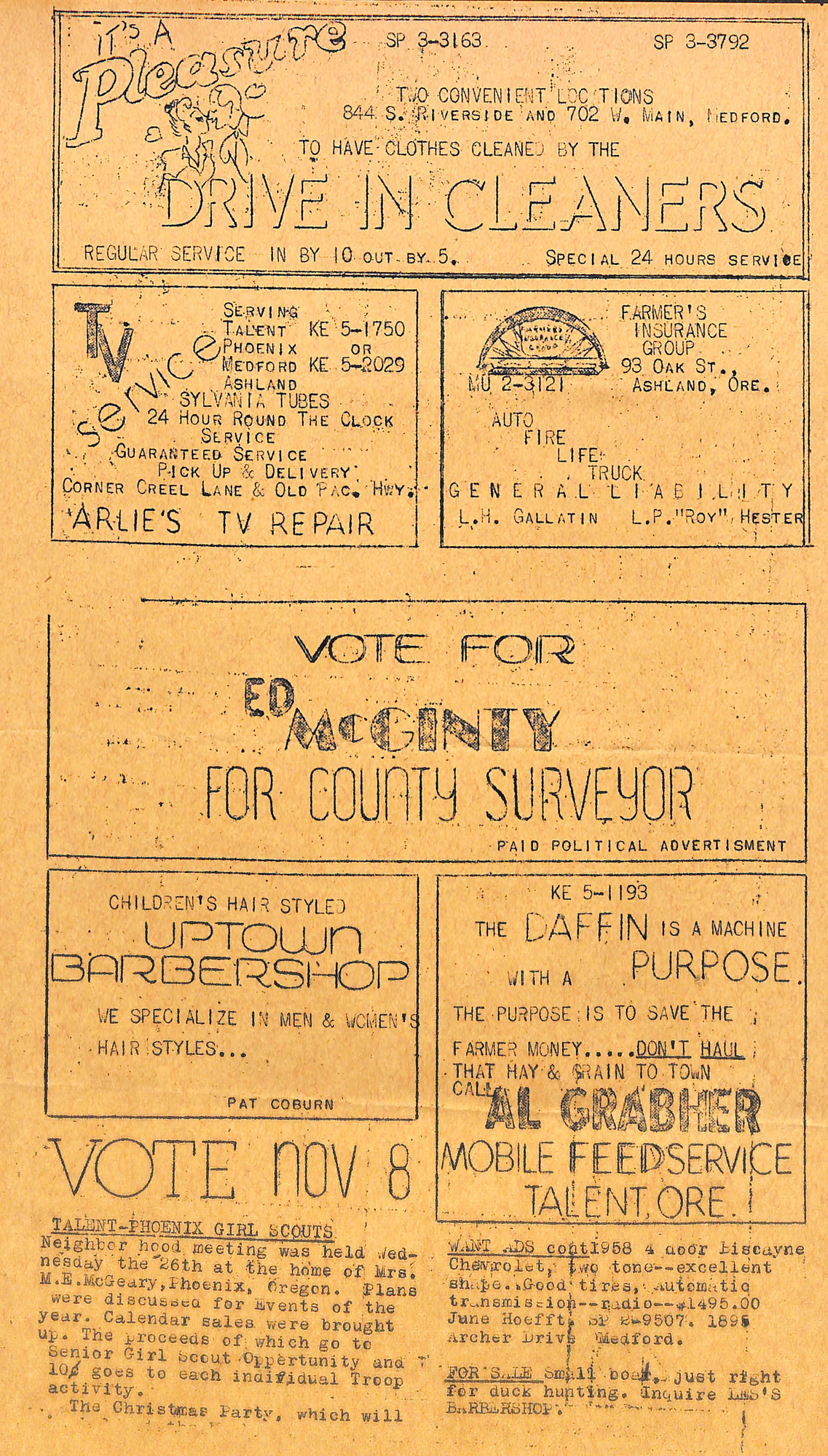 HERB'S WATCH REPAIR IVA TUGGLE'S DECORATED CAKES FOR SALE--3-bedroom modern house on 4 lots. Page 7, full-page ad for: VALLEY LOCKER & GROCERY Page 8, ads for: DRIVE-IN CLEANERS ARLIE'S TV REPAIR SERVICE FARMER'S INSURANCE--L.H. GALLATIN VOTE FOR ED McGINTY FOR COUNTY SURVEYOR UPTOWN BARBERSHOP AL GRABHER'S MOBILE FEED SERVICE VOTE NOV. 8 WANT ADS, cont. FOR SALE--Small boat, just right for duck hunting. Inquire LES' BARBERSHOP on the highway. FAMILY--with one child, 1 yr. old, non-drinker, no pets, would like to rent a 2-bedroom house on outskirts of Talent. Phone KE 5-2244. Mrs. Williams. FOR RENT--Modern 2-bedroom house, unfurnished, wired for electric stove. Inquire at 236 Gibson St. Page 9, ads for: ELECT ALAN B. HOLMES FOR DISTRICT ATTORNEY CHET RAPP FOR COUNTY TREASURER VOTE FOR HERBERT HUNTER--STATE CERTIFIED APPRAISER RETAIN HOWARD BELTON--Republican--AS YOUR STATE TREASURER ENLISTS IN WOMEN'S AIR FORCE