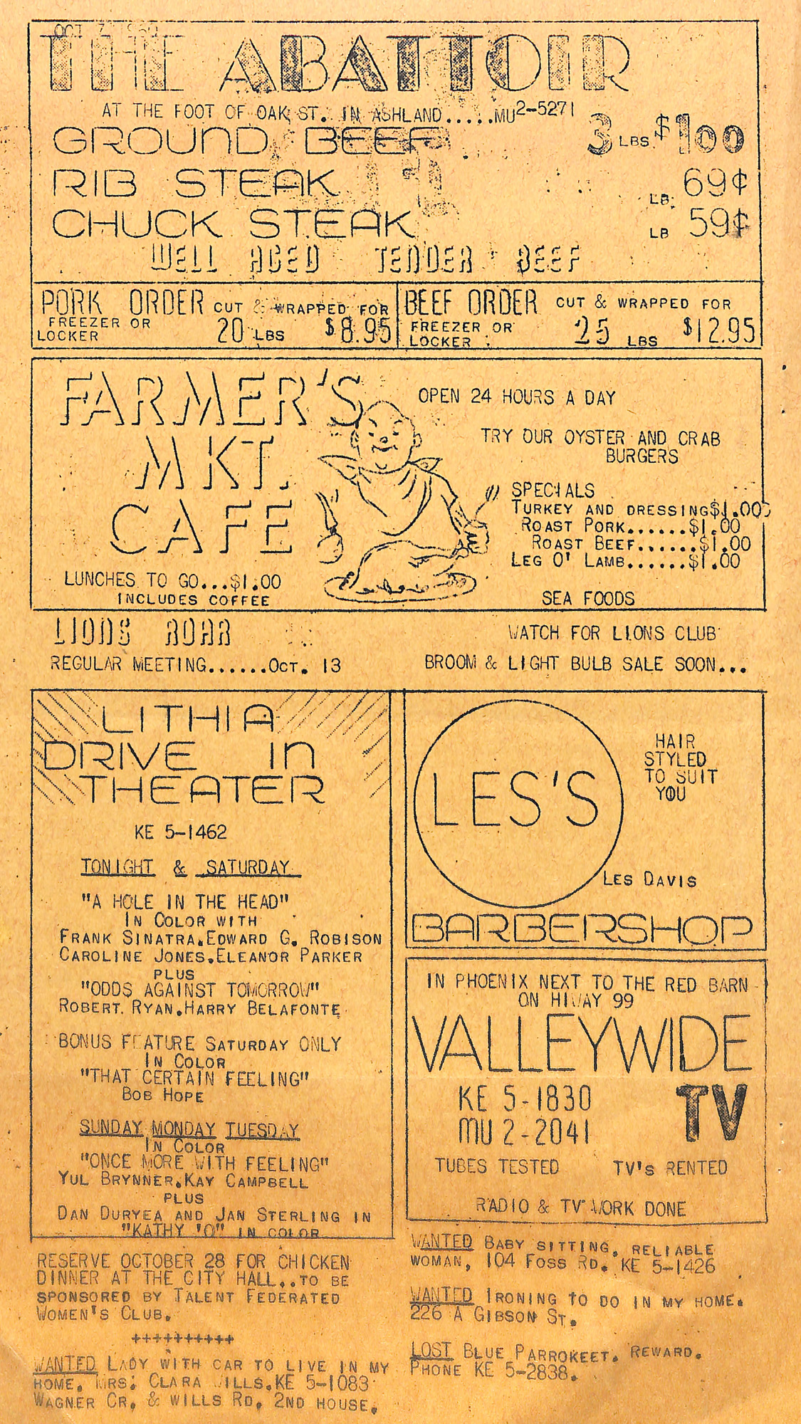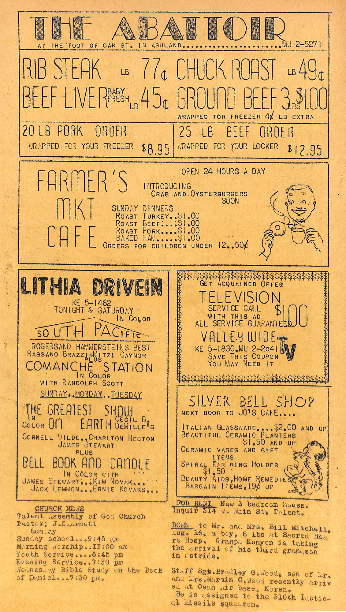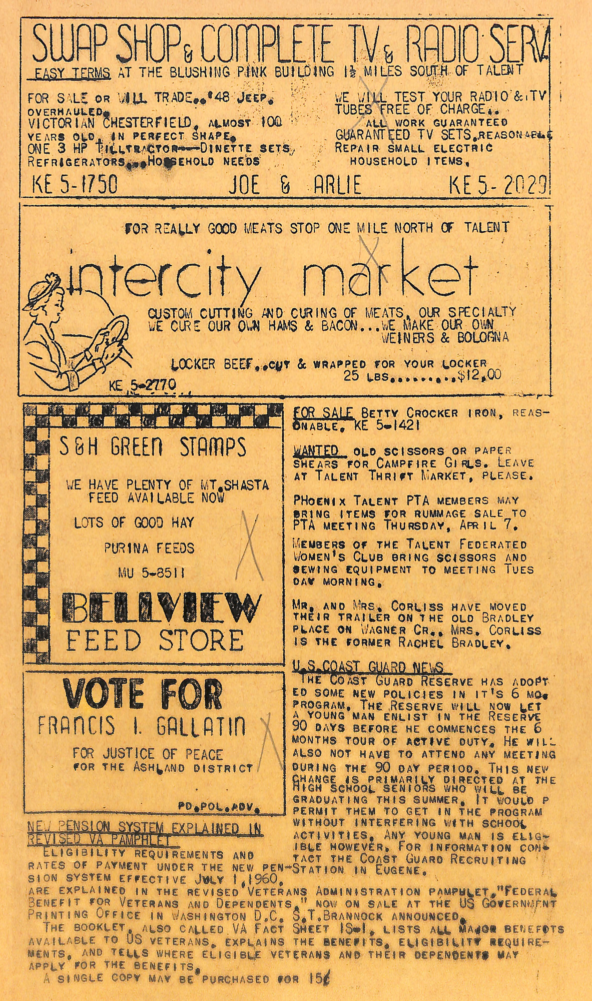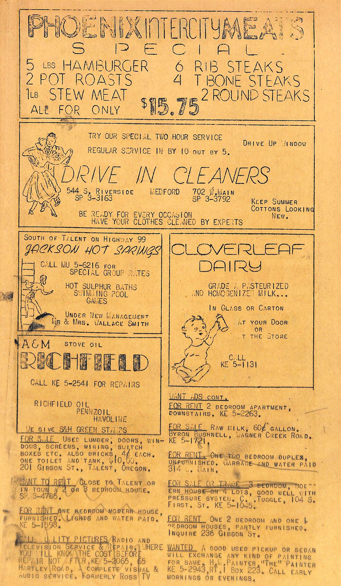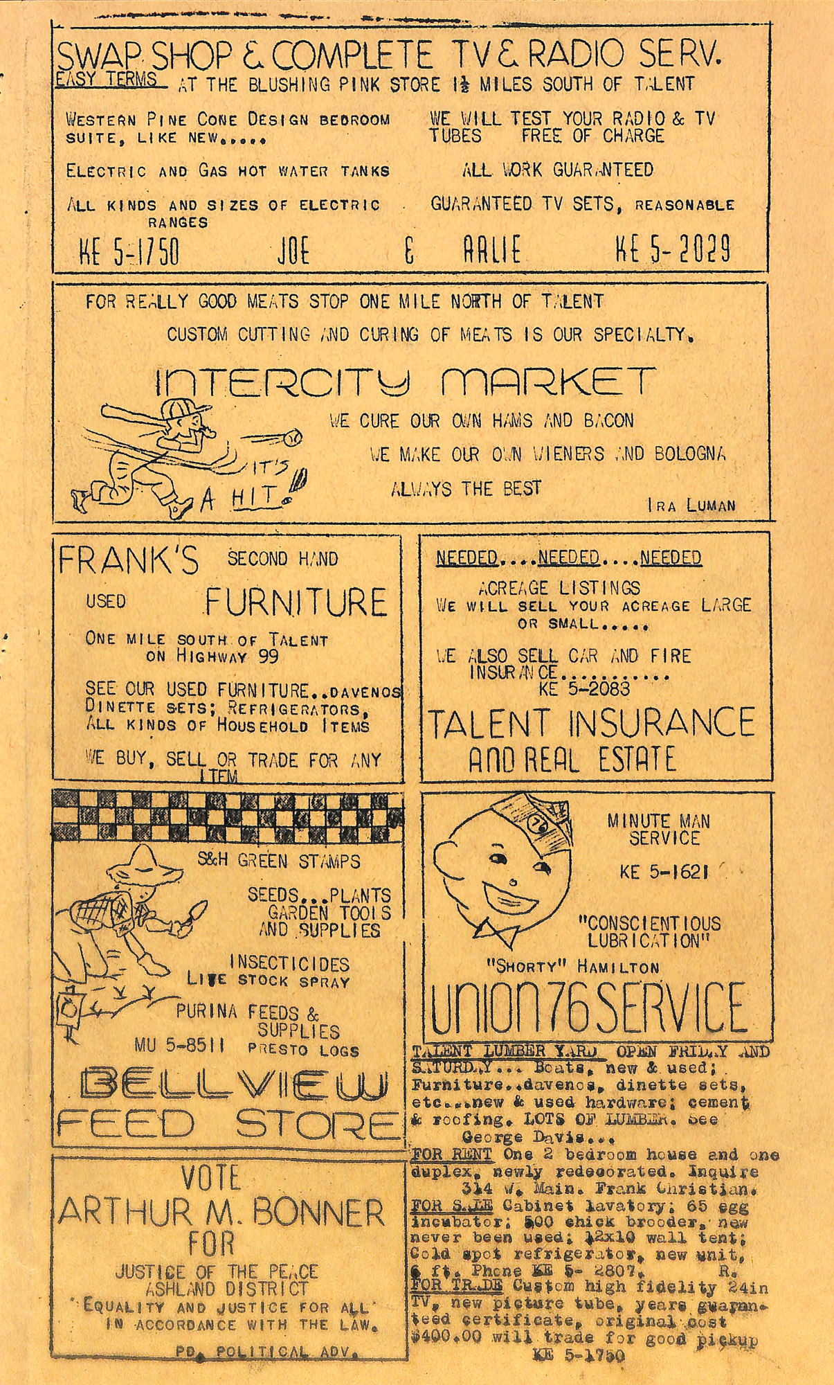HERB'S WATCH REPAIR IVA TUGGLE'S DECORATED CAKES FOR SALE--3-bedroom modern house on 4 lots. Page 7, full-page ad for: VALLEY LOCKER & GROCERY Page 8, ads for: DRIVE-IN CLEANERS ARLIE'S TV REPAIR SERVICE FARMER'S INSURANCE--L.H. GALLATIN VOTE FOR ED McGINTY FOR COUNTY SURVEYOR UPTOWN BARBERSHOP AL GRABHER'S MOBILE FEED SERVICE VOTE NOV. 8 WANT ADS, cont. FOR SALE--Small boat, just right for duck hunting. Inquire LES' BARBERSHOP on the highway. FAMILY--with one child, 1 yr. old, non-drinker, no pets, would like to rent a 2-bedroom house on outskirts of Talent. Phone KE 5-2244. Mrs. Williams. FOR RENT--Modern 2-bedroom house, unfurnished, wired for electric stove. Inquire at 236 Gibson St. Page 9, ads for: ELECT ALAN B. HOLMES FOR DISTRICT ATTORNEY CHET RAPP FOR COUNTY TREASURER VOTE FOR HERBERT HUNTER--STATE CERTIFIED APPRAISER RETAIN HOWARD BELTON--Republican--AS YOUR STATE TREASURER ENLISTS IN WOMEN'S AIR FORCE