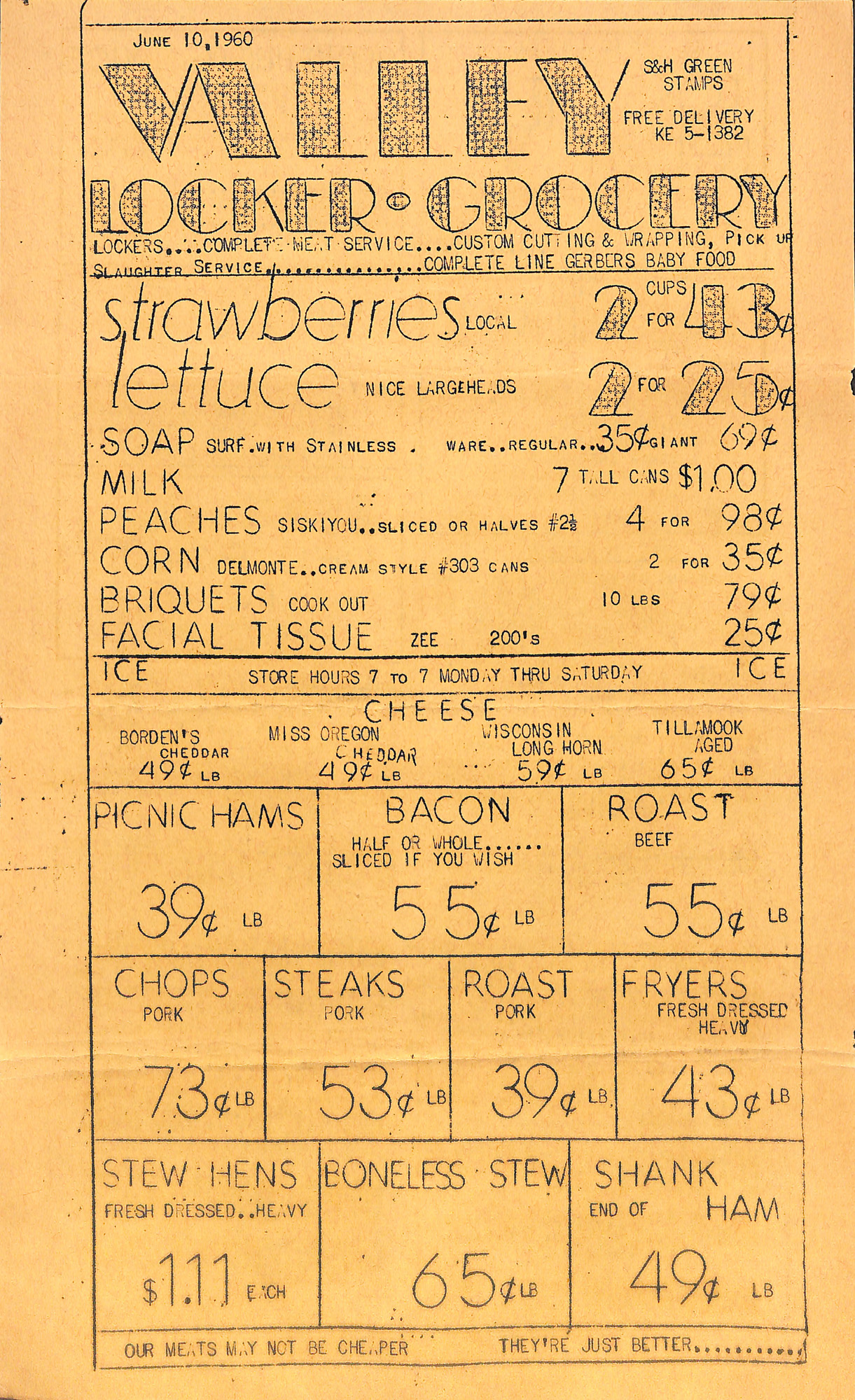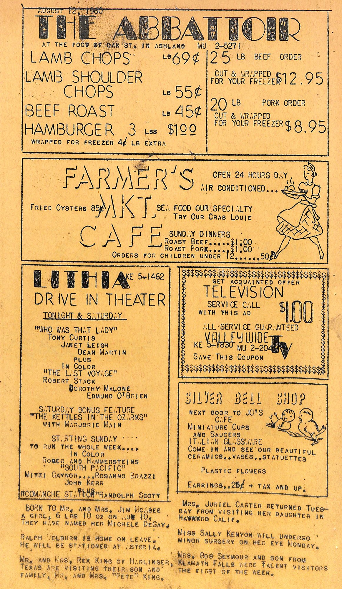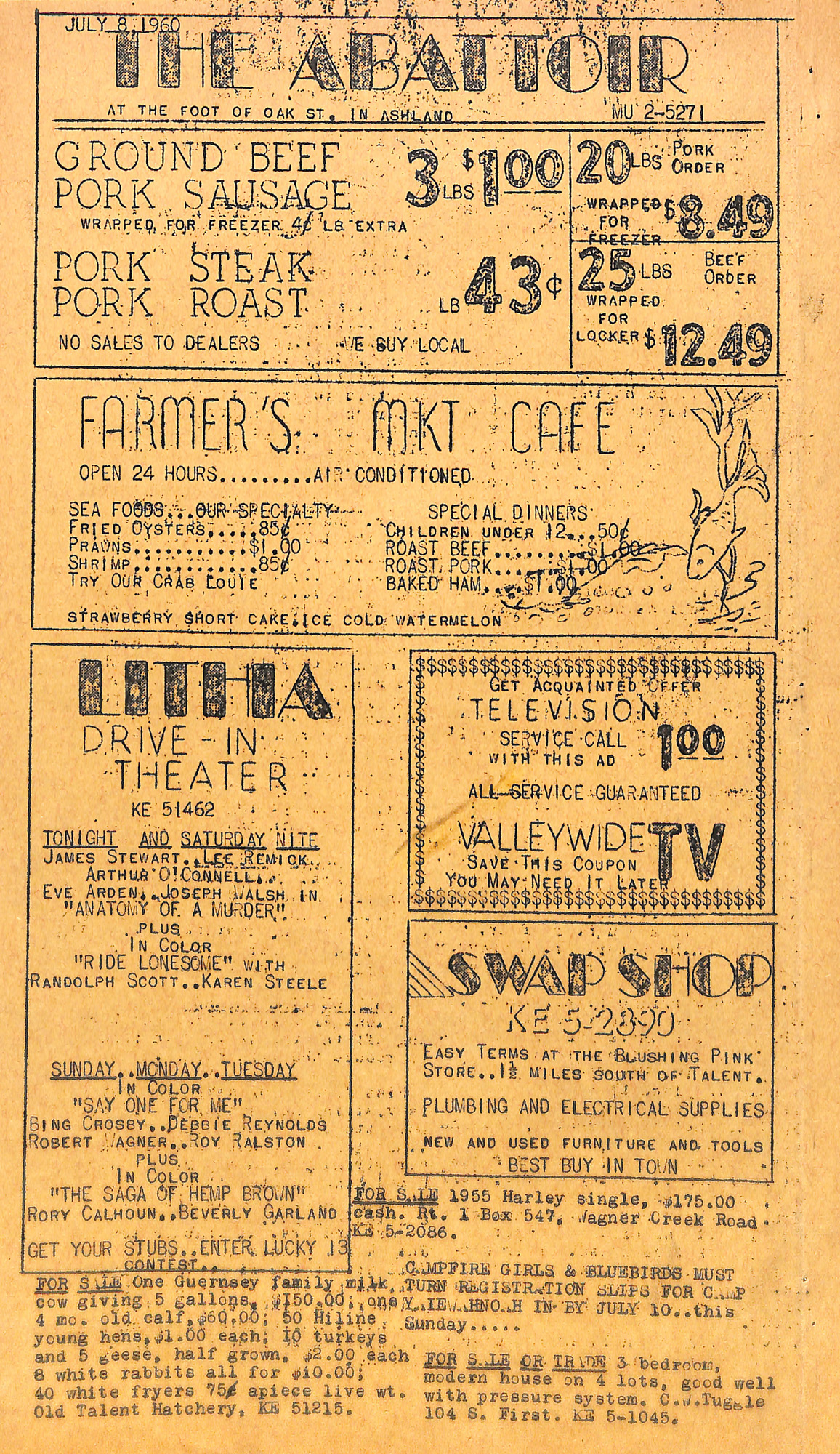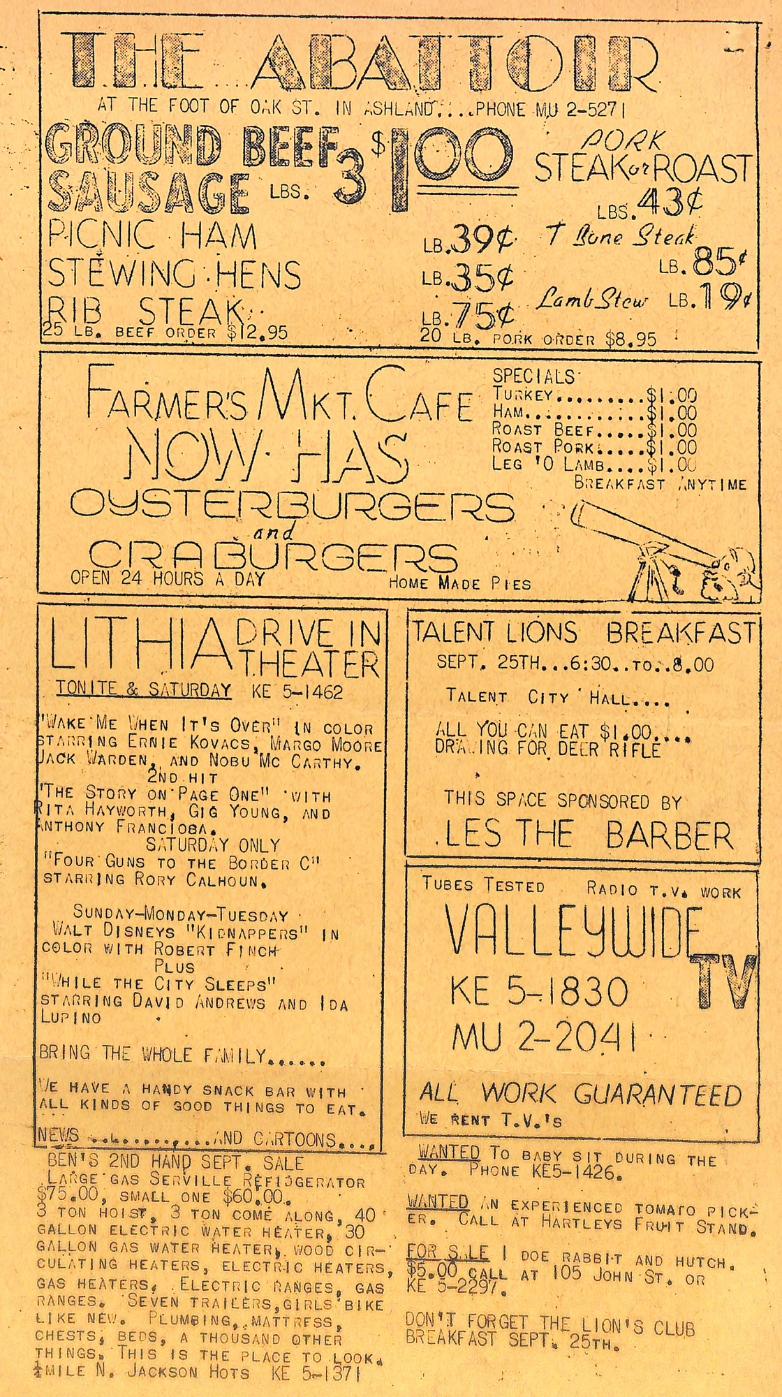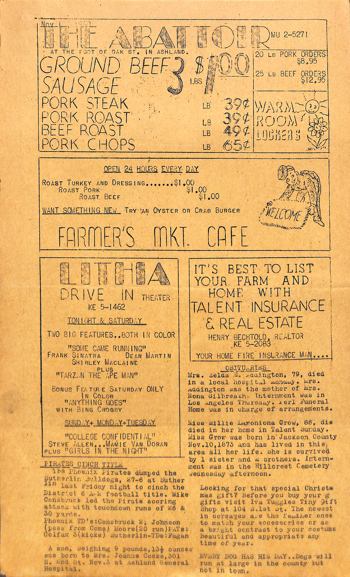 HERB'S WATCH REPAIR IVA TUGGLE'S DECORATED CAKES FOR SALE--3-bedroom modern house on 4 lots. Page 7, full-page ad for: VALLEY LOCKER & GROCERY Page 8, ads for: DRIVE-IN CLEANERS ARLIE'S TV REPAIR SERVICE FARMER'S INSURANCE--L.H. GALLATIN VOTE FOR ED McGINTY FOR COUNTY SURVEYOR UPTOWN BARBERSHOP AL GRABHER'S MOBILE FEED SERVICE VOTE NOV. 8 WANT ADS, cont. FOR SALE--Small boat, just right for duck hunting. Inquire LES' BARBERSHOP on the highway. FAMILY--with one child, 1 yr. old, non-drinker, no pets, would like to rent a 2-bedroom house on outskirts of Talent. Phone KE 5-2244. Mrs. Williams. FOR RENT--Modern 2-bedroom house, unfurnished, wired for electric stove. Inquire at 236 Gibson St. Page 9, ads for: ELECT ALAN B. HOLMES FOR DISTRICT ATTORNEY CHET RAPP FOR COUNTY TREASURER VOTE FOR HERBERT HUNTER--STATE CERTIFIED APPRAISER RETAIN HOWARD BELTON--Republican--AS YOUR STATE TREASURER ENLISTS IN WOMEN'S AIR FORCE