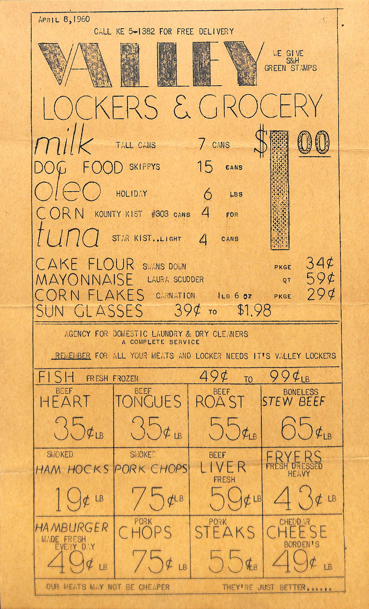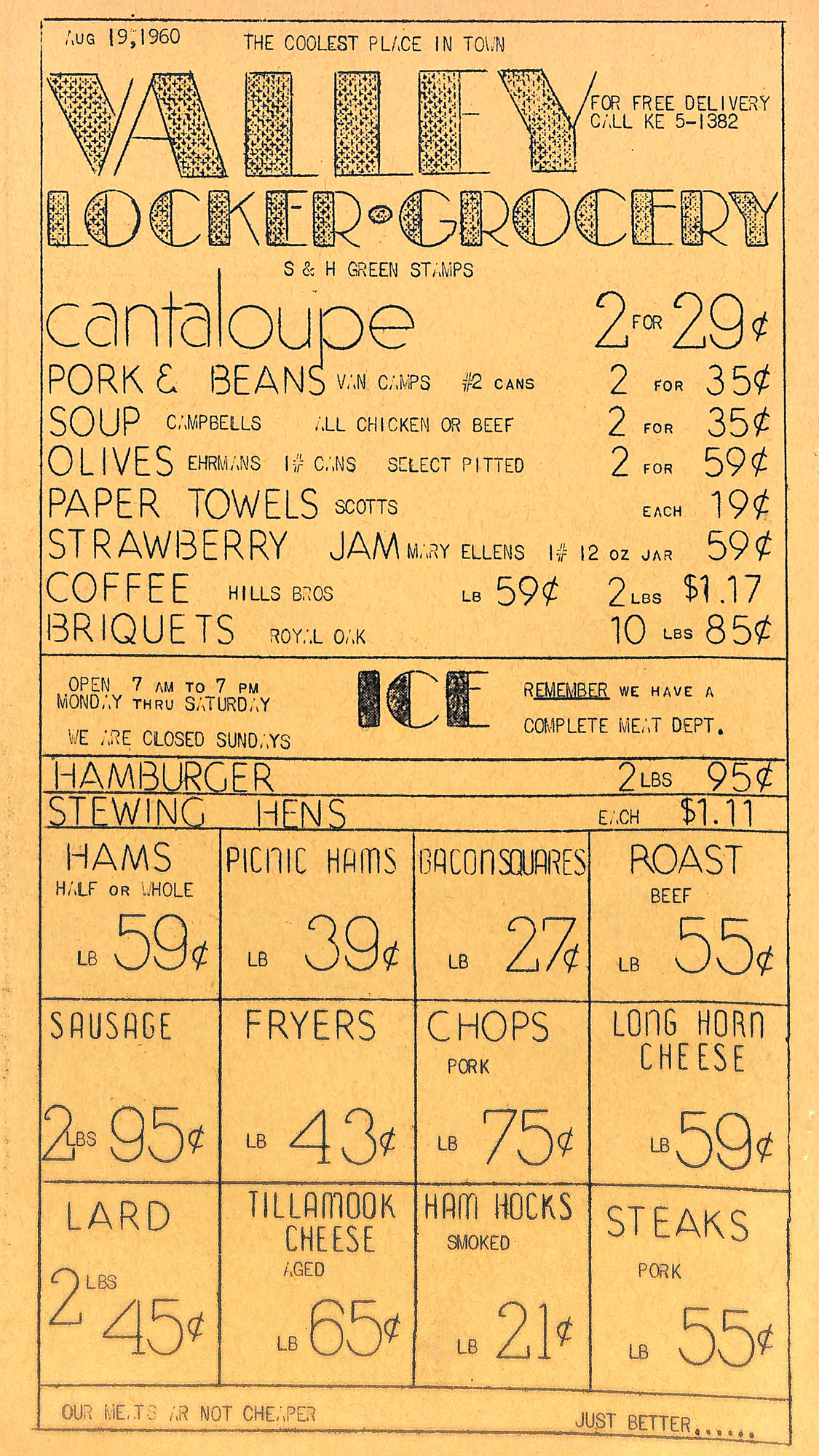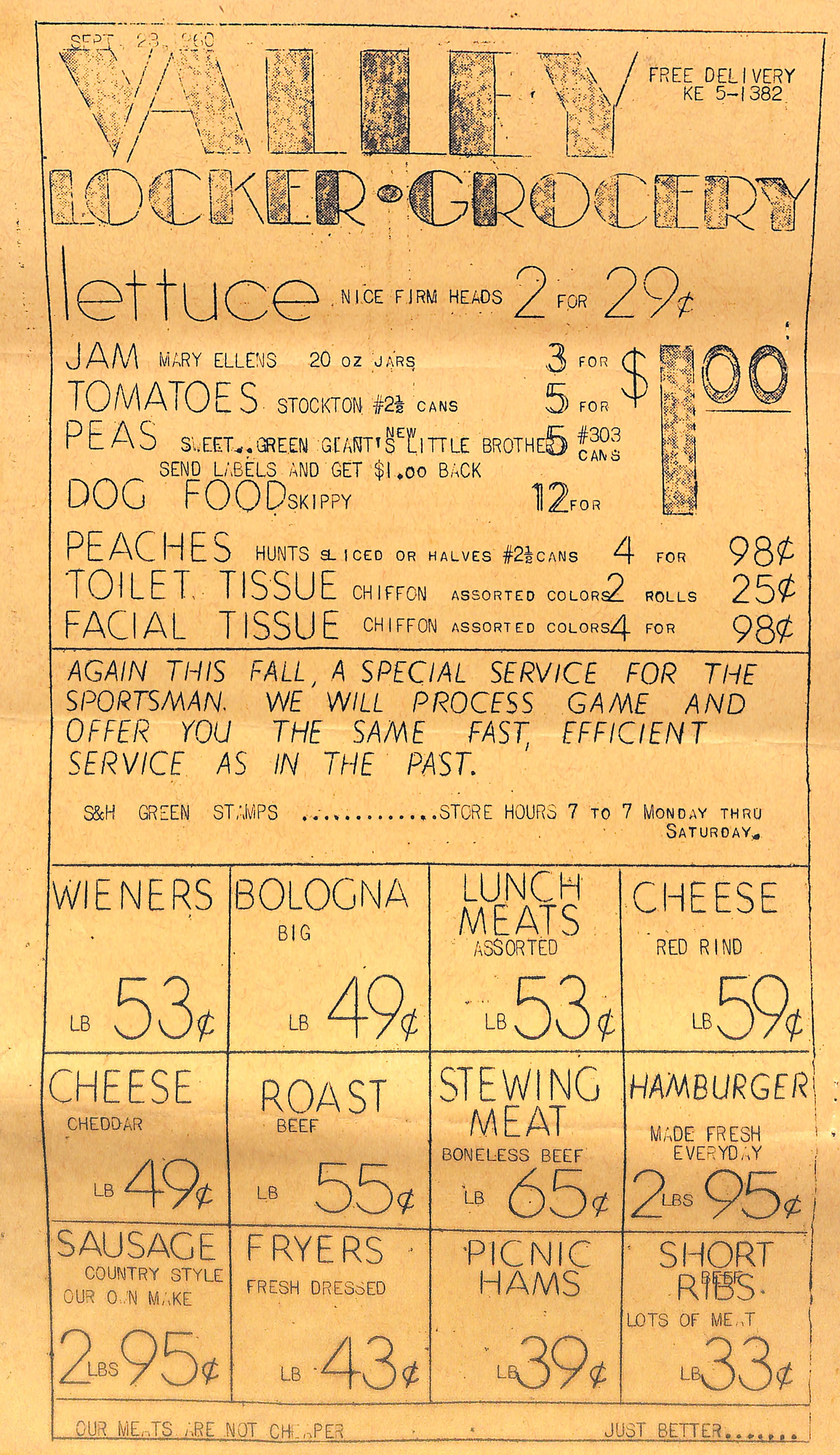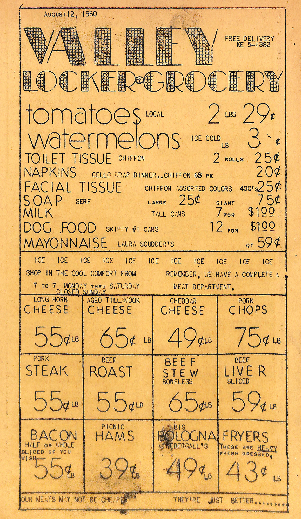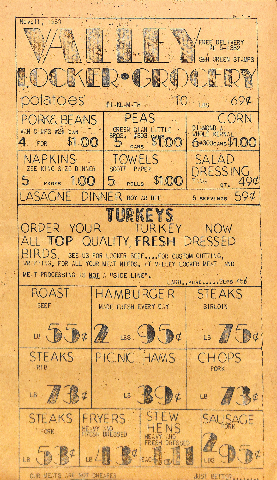 HERB'S WATCH REPAIR IVA TUGGLE'S DECORATED CAKES FOR SALE--3-bedroom modern house on 4 lots. Page 7, full-page ad for: VALLEY LOCKER & GROCERY Page 8, ads for: DRIVE-IN CLEANERS ARLIE'S TV REPAIR SERVICE FARMER'S INSURANCE--L.H. GALLATIN VOTE FOR ED McGINTY FOR COUNTY SURVEYOR UPTOWN BARBERSHOP AL GRABHER'S MOBILE FEED SERVICE VOTE NOV. 8 WANT ADS, cont. FOR SALE--Small boat, just right for duck hunting. Inquire LES' BARBERSHOP on the highway. FAMILY--with one child, 1 yr. old, non-drinker, no pets, would like to rent a 2-bedroom house on outskirts of Talent. Phone KE 5-2244. Mrs. Williams. FOR RENT--Modern 2-bedroom house, unfurnished, wired for electric stove. Inquire at 236 Gibson St. Page 9, ads for: ELECT ALAN B. HOLMES FOR DISTRICT ATTORNEY CHET RAPP FOR COUNTY TREASURER VOTE FOR HERBERT HUNTER--STATE CERTIFIED APPRAISER RETAIN HOWARD BELTON--Republican--AS YOUR STATE TREASURER ENLISTS IN WOMEN'S AIR FORCE