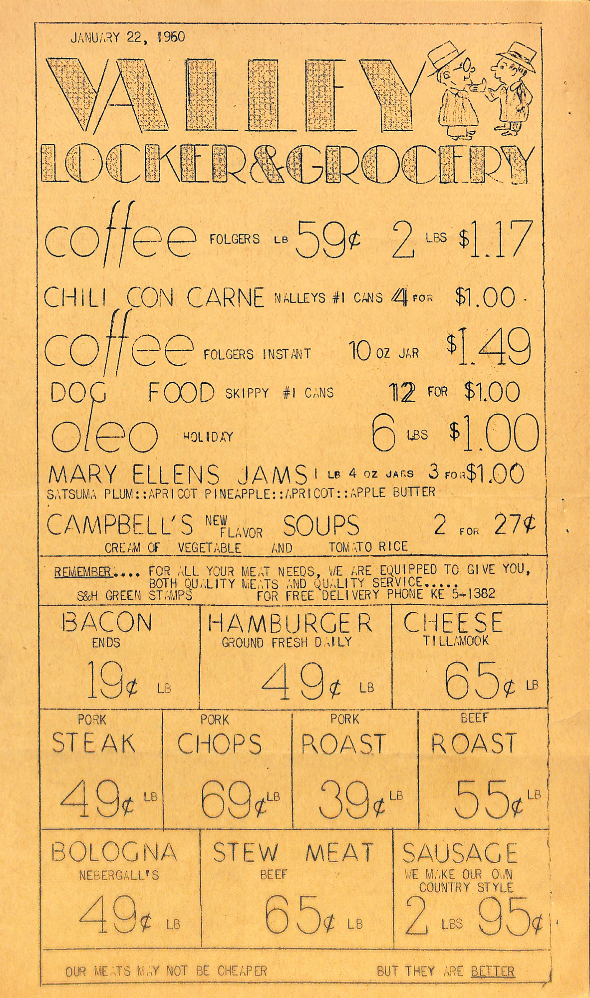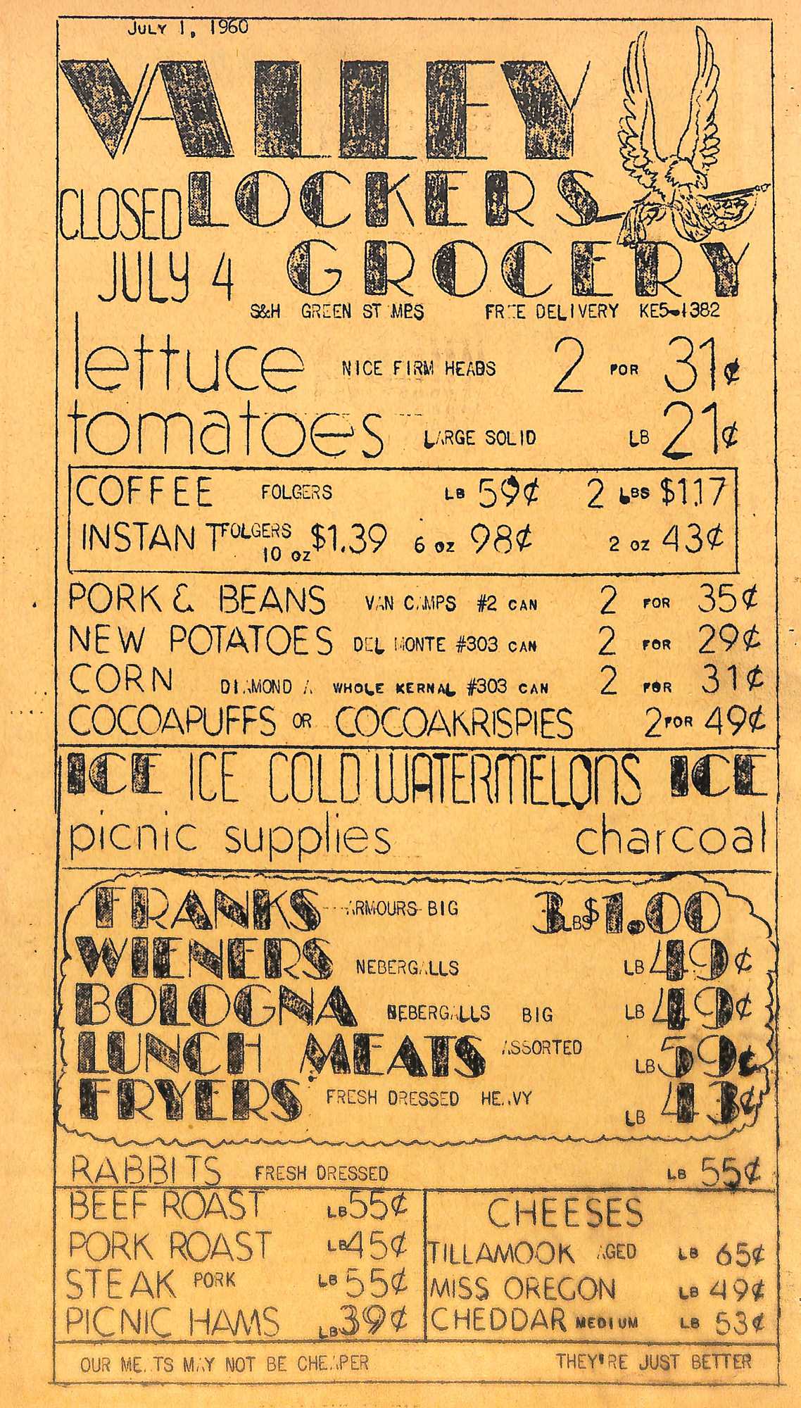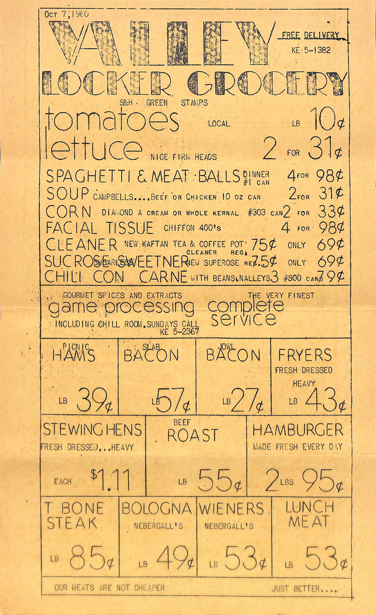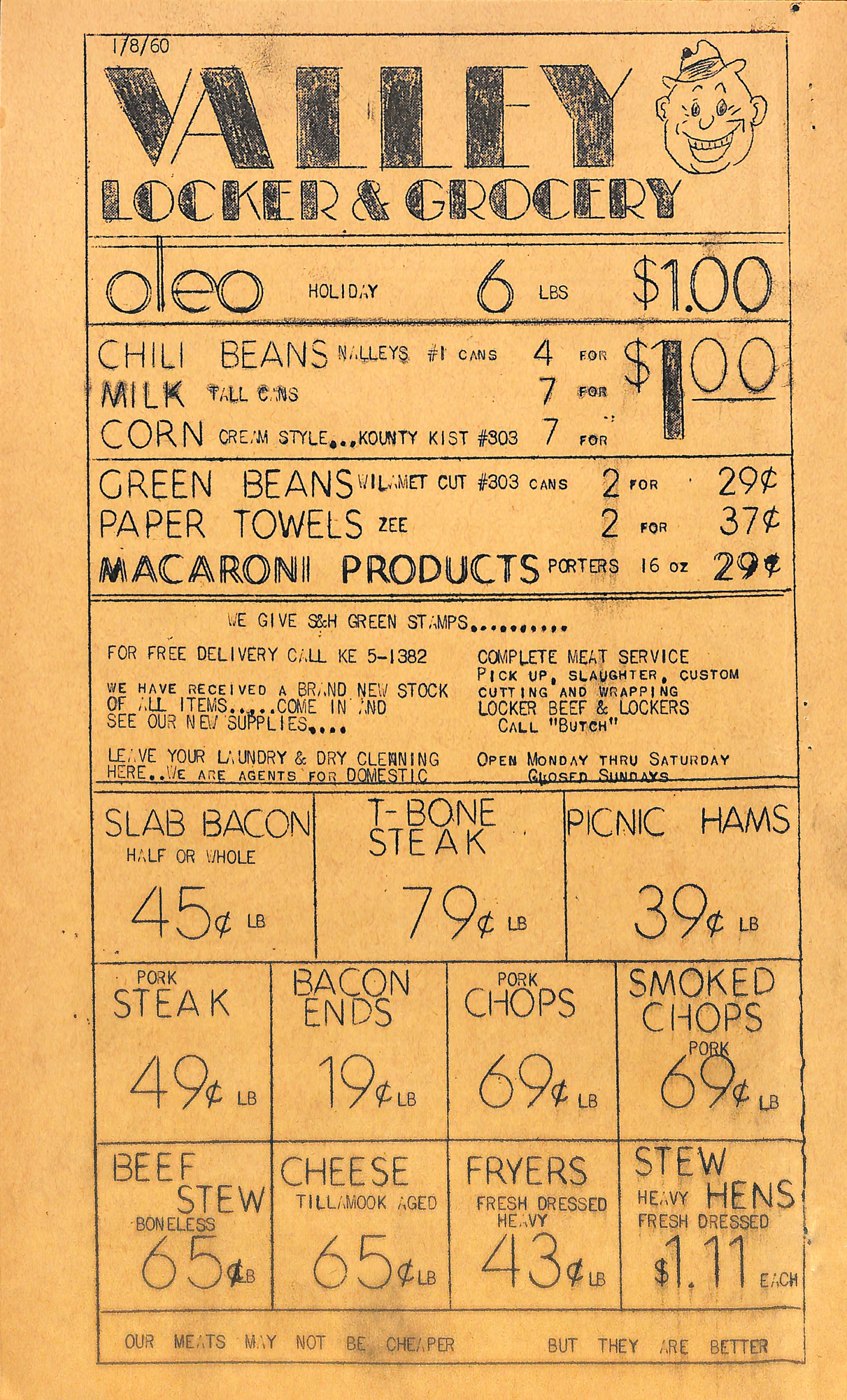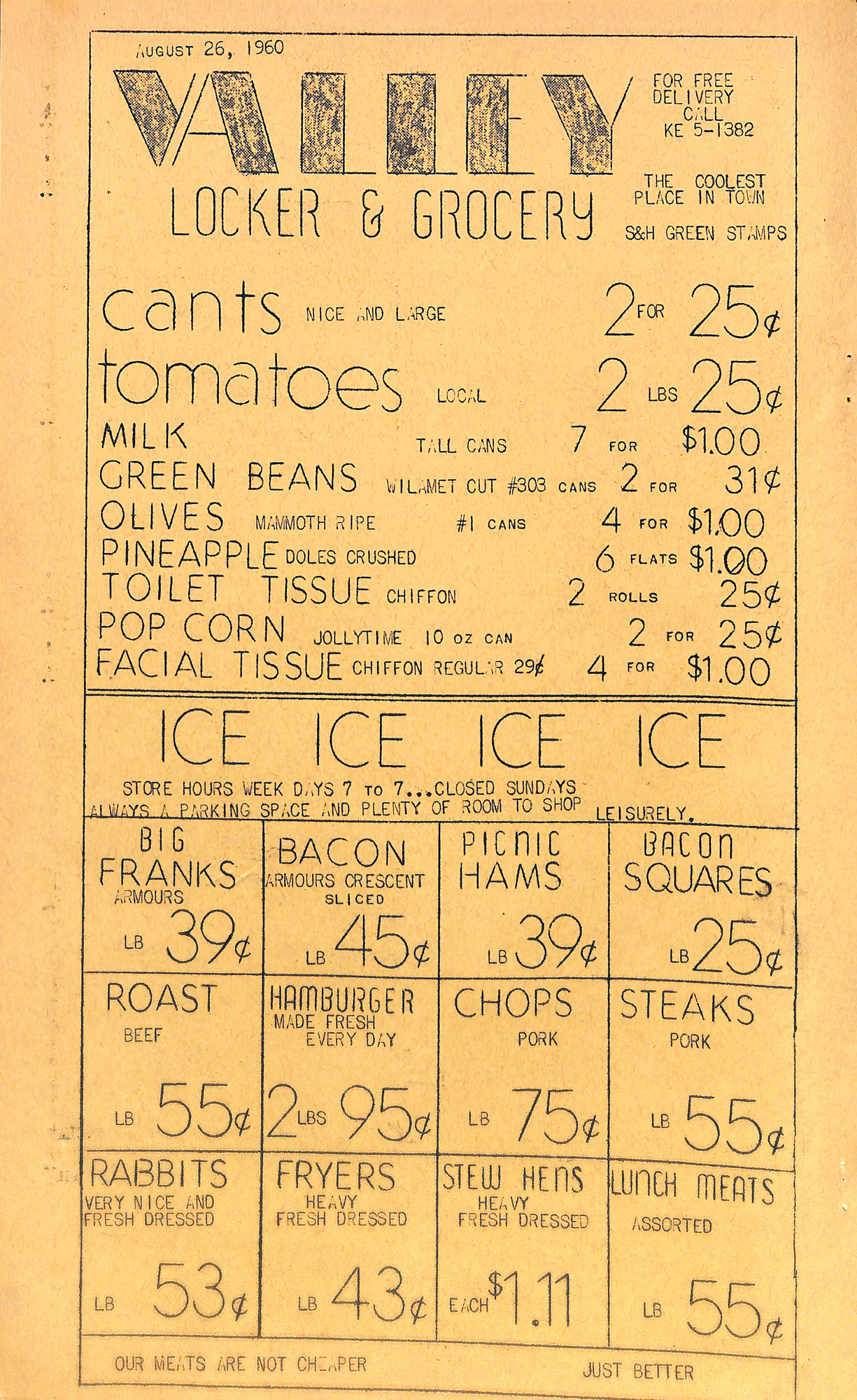 HERB'S WATCH REPAIR IVA TUGGLE'S DECORATED CAKES FOR SALE--3-bedroom modern house on 4 lots. Page 7, full-page ad for: VALLEY LOCKER & GROCERY Page 8, ads for: DRIVE-IN CLEANERS ARLIE'S TV REPAIR SERVICE FARMER'S INSURANCE--L.H. GALLATIN VOTE FOR ED McGINTY FOR COUNTY SURVEYOR UPTOWN BARBERSHOP AL GRABHER'S MOBILE FEED SERVICE VOTE NOV. 8 WANT ADS, cont. FOR SALE--Small boat, just right for duck hunting. Inquire LES' BARBERSHOP on the highway. FAMILY--with one child, 1 yr. old, non-drinker, no pets, would like to rent a 2-bedroom house on outskirts of Talent. Phone KE 5-2244. Mrs. Williams. FOR RENT--Modern 2-bedroom house, unfurnished, wired for electric stove. Inquire at 236 Gibson St. Page 9, ads for: ELECT ALAN B. HOLMES FOR DISTRICT ATTORNEY CHET RAPP FOR COUNTY TREASURER VOTE FOR HERBERT HUNTER--STATE CERTIFIED APPRAISER RETAIN HOWARD BELTON--Republican--AS YOUR STATE TREASURER ENLISTS IN WOMEN'S AIR FORCE