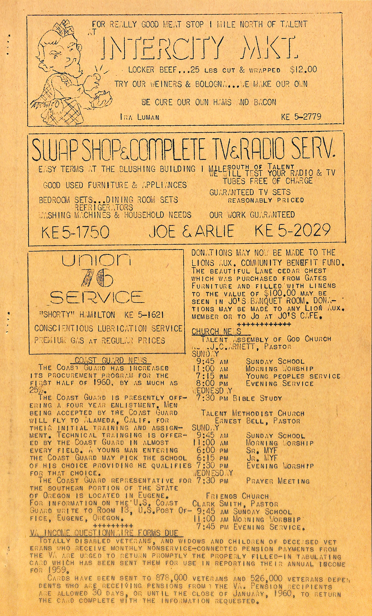 FOR RENT--Modern 2-bedroom house, hardwood floors, electric stove and oil floor furnace. KE 5-2263. Page 6, full-page ad for: VALLEY LOCKER & GROCERY Page 7, ads for: INTERCITY MARKET SWAP SHOP & COMPLETE TV & RADIO SERVICE--Joe & Arlie UNION 76 SERVICE--"Shorty" Hamilton COAST GUARD NEWS The Coast Guard has increased its procurement program for the first half of 1960 by as much as 25%. The Coast Guard is presently offering a four-year enlistment. Men being accepted by the Coast Guard will fly to Alameda, Calif. for their initial training and assignment. Technical training is offered by the Coast Guard in almost every field. A young man entering the Coast Guard may pick the school of his choice providing he qualifies for that choice. The Coast Guard representative for the southern portion of the state of Oregon is located in Eugene. For information on the U.S. Coast Guard write to Room 13, U.S. Post Office, Eugene, Oregon. VA INCOME QUESTIONNAIRE FORMS DUE Totally disabled veterans and widow and children of deceased veterans who receive monthly non-service-connected pension payments from the VA are urged to return promptly the properly filled-in tabulating card which has been sent them for use in reporting their annual income for 1959. Cards have been sent to 878,000 veterans and 526,000 veterans' dependents who are receiving pensions from the VA. Pension recipients are allowed 30 days or until the close of January, 1960, to return the card complete with the information requested. DONATIONS MAY NOW BE MADE TO THE LIONS AUX. COMMUNITY BENEFIT FUND The beautiful Lane cedar chest which was purchased from Gates Furniture and filled with linens to the value of $100.00 may be see in JO'S BANQUET ROOM. Donations may be made to any Lion Aux. member or to Jo at JO'S CAFÉ. CHURCH NEWS