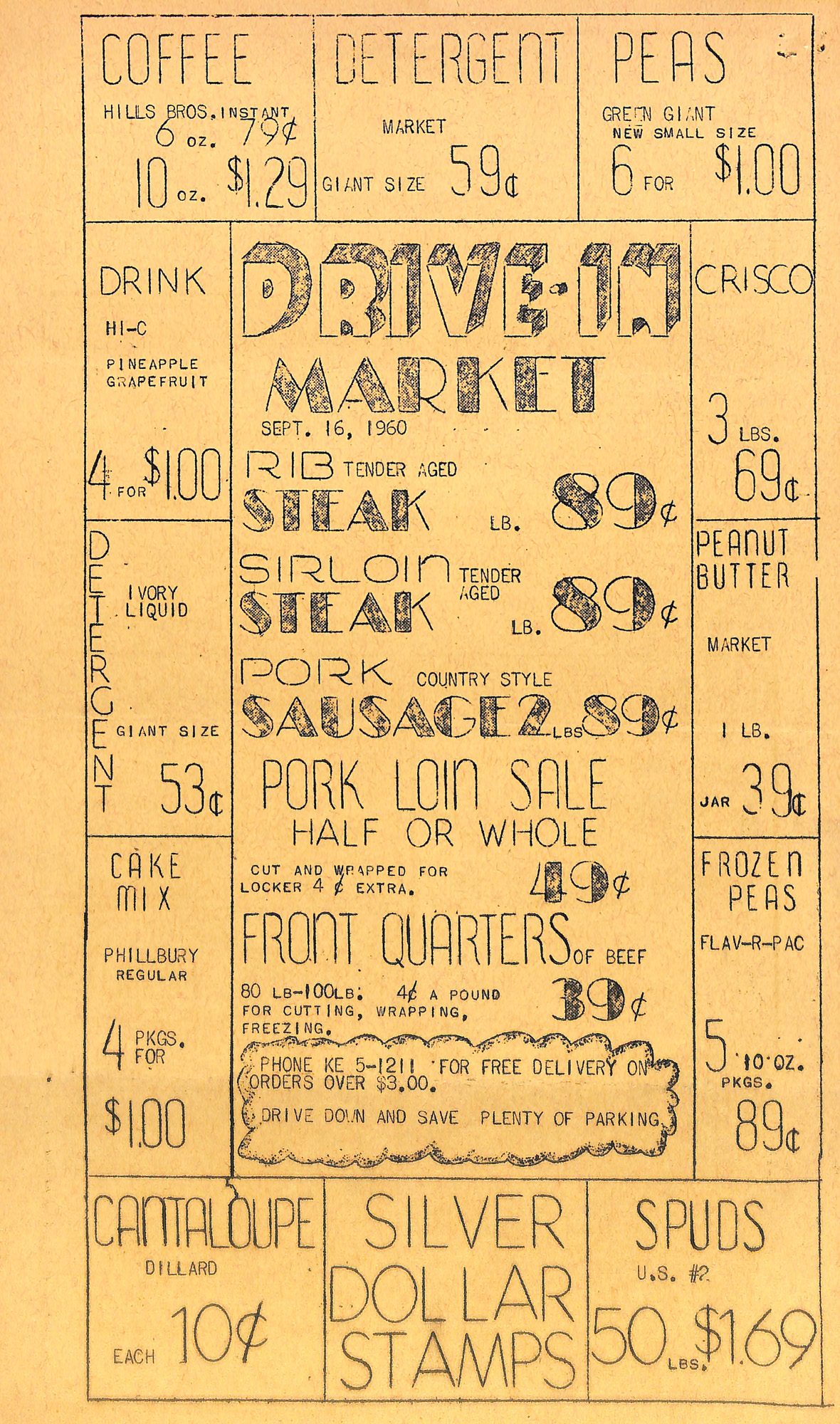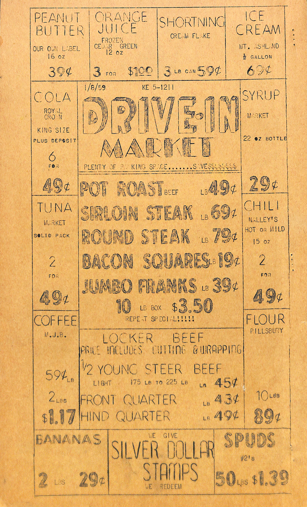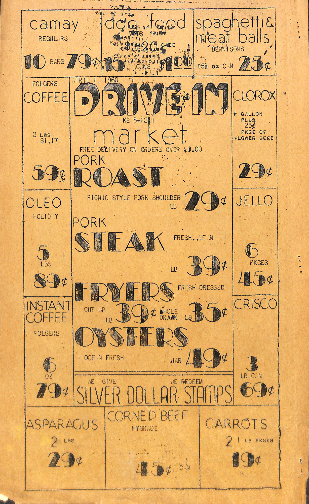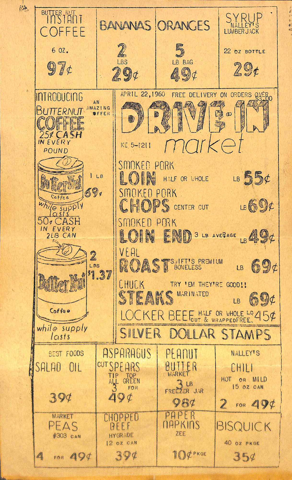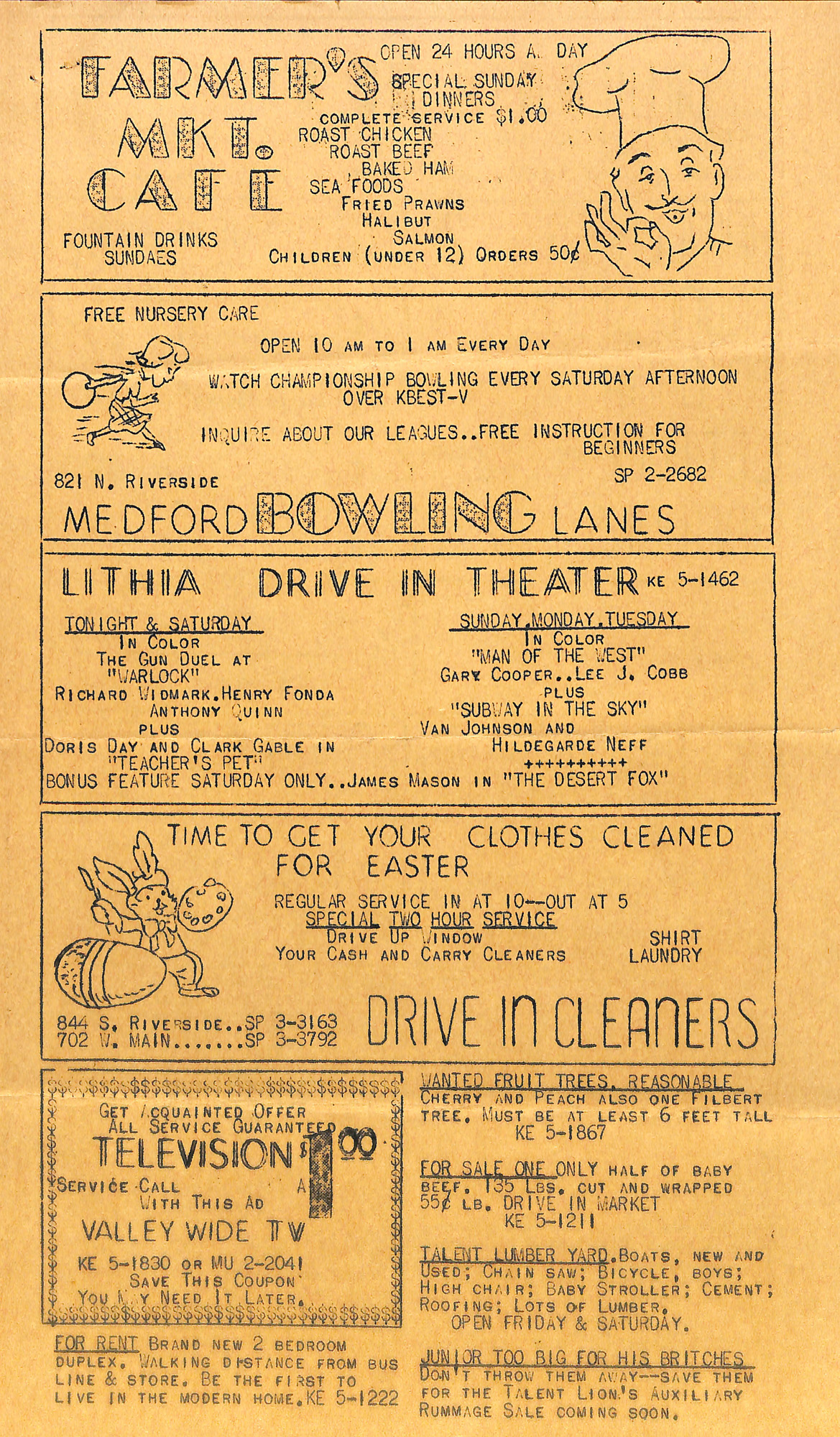 Page 6, full-page ad for: DRIVE-IN MARKET Page 7, full-page ad for: VALLEY LOCKERS & GROCERY Page 8, ads for: FARMER'S MARKET CAFÉ MEDFORD BOWLING LANES LITHIA DRIVE-IN THEATER DRIVE-IN CLEANERS--Time to get your clothes cleaned for Easter VALLEY WIDE TV FOR RENT--Brand new 2-bedroom duplex. Walking distance from bus line & store. Be the first to live in the modern home. KE 5-1222. WANTED FRUIT TREES, REASONABLE. Cherry and Peach also one Filbert tree. Must be at least 6 feet tall. KE 5-1867. FOR SALE ONE ONLY half of baby beef. 135 lbs. cut and wrapped 55¢ lb. DRIVE IN MARKET. KE 5-1211. TALENT LUMBER YARD