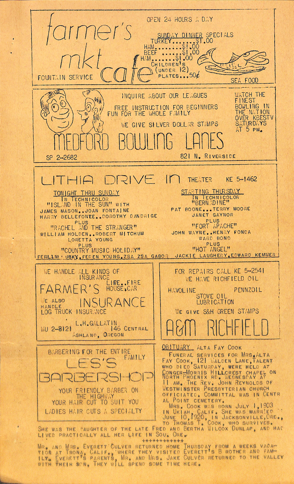 FOR RENT--Modern 2-bedroom house; hardwood floors, electric stove and oil floor furnace. KE 5-1017. FOR RENT--2-bedroom furnished or unfurnished modern house. Phone KE 5-1389. Page 4, full-page ad for: VALLEY LOCKER & GROCERY Page 5, ads for: FARMER'S MARKET CAFÉ MEDFORD BOWLING LANES LITHIA DRIVE-IN FARMER'S INSURANCE--L.H. GALLATIN A&M RICHFIELD LES' BARBERSHOP OBITUARY--Alta Fay Cook Funeral services for Mrs. Alta Fay Cook, 121 Walden Lane, Talent, who died Saturday, were held at Conger-Morris Hillcrest Chapel on North Phoenix Rd. Wednesday at 11am. The Rev. John Reynolds of Westminster Presbyterian church officiated. Committal was in Central Point cemetery. Mrs. Cook was born July 1, 1903 in Ukiah, Calif. She was married June 10, 1920, in Jacksonville, Ore. to Thomas T. Cook, who survives. She was the daughter of the late Fred and Bertha Wilcox Dunlap, and had lived practically all her life in Sou. Ore. Mr. and Mrs. Everett Culver returned home Thursday from a week's vacation at Trona, Calif. where they visited Everett's brother and family. Everett's parents, Mr. and Mrs. Jake Culver, returned to the valley with their son. They will spend some time here. CAMP FIRE GIRLS WILL CELEBRATE THEIR 50TH anniversary in March 13-19. As a part of this celebration, window displays of old Camp Fire Girls items are planned. If you have such items that might be used in these displays, please call KE 5-1421 or KE 5-1892. This item given by a local resident will be printed in serial form in the News Flashes…We will be glad to print interested comments after we finish the item. STRAIGHT TALK