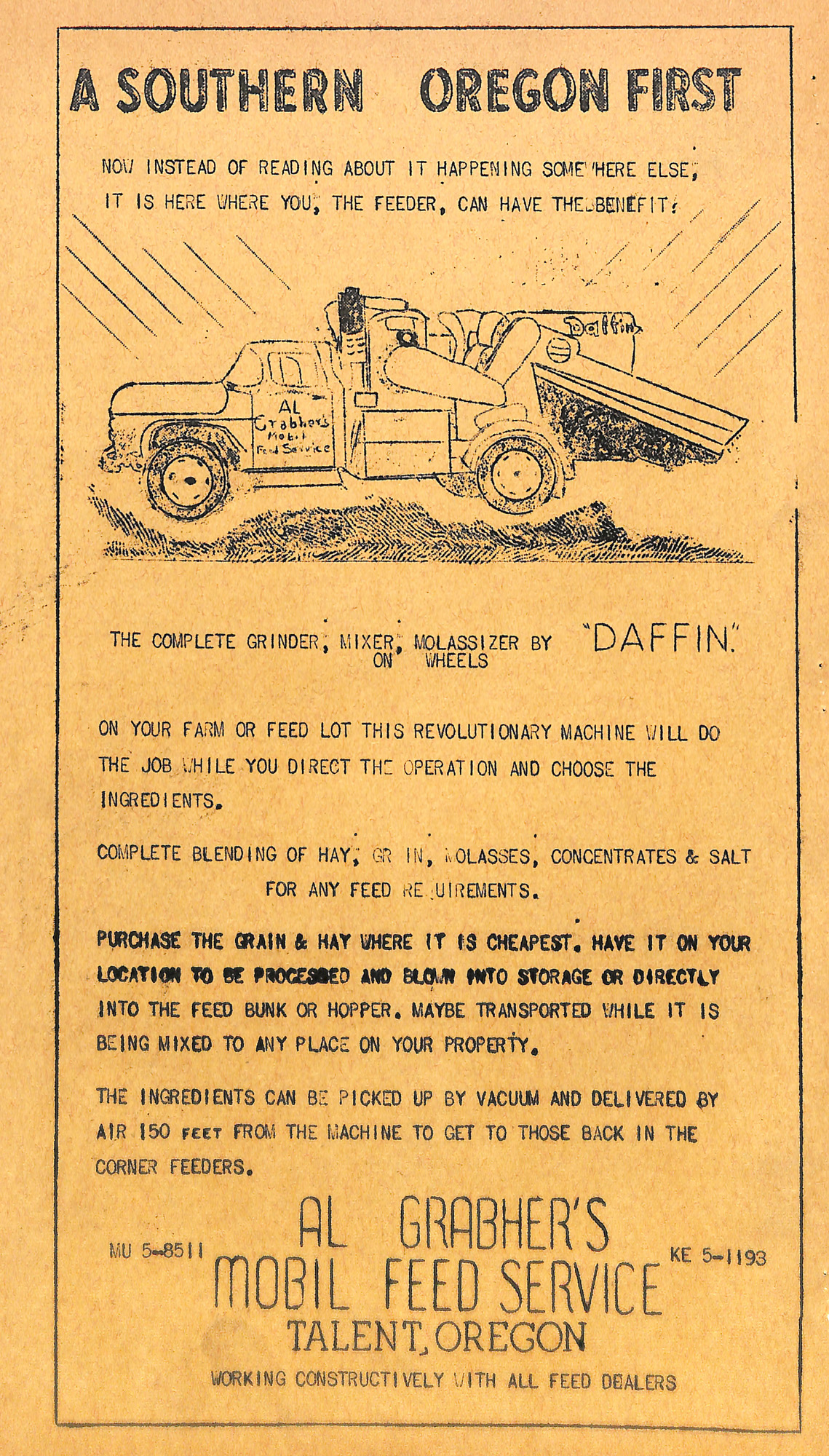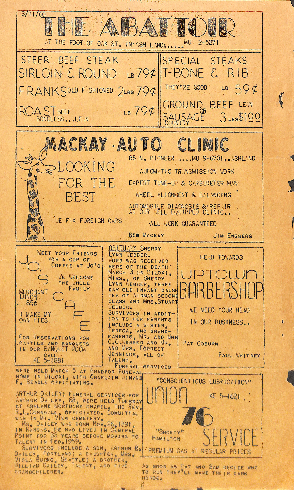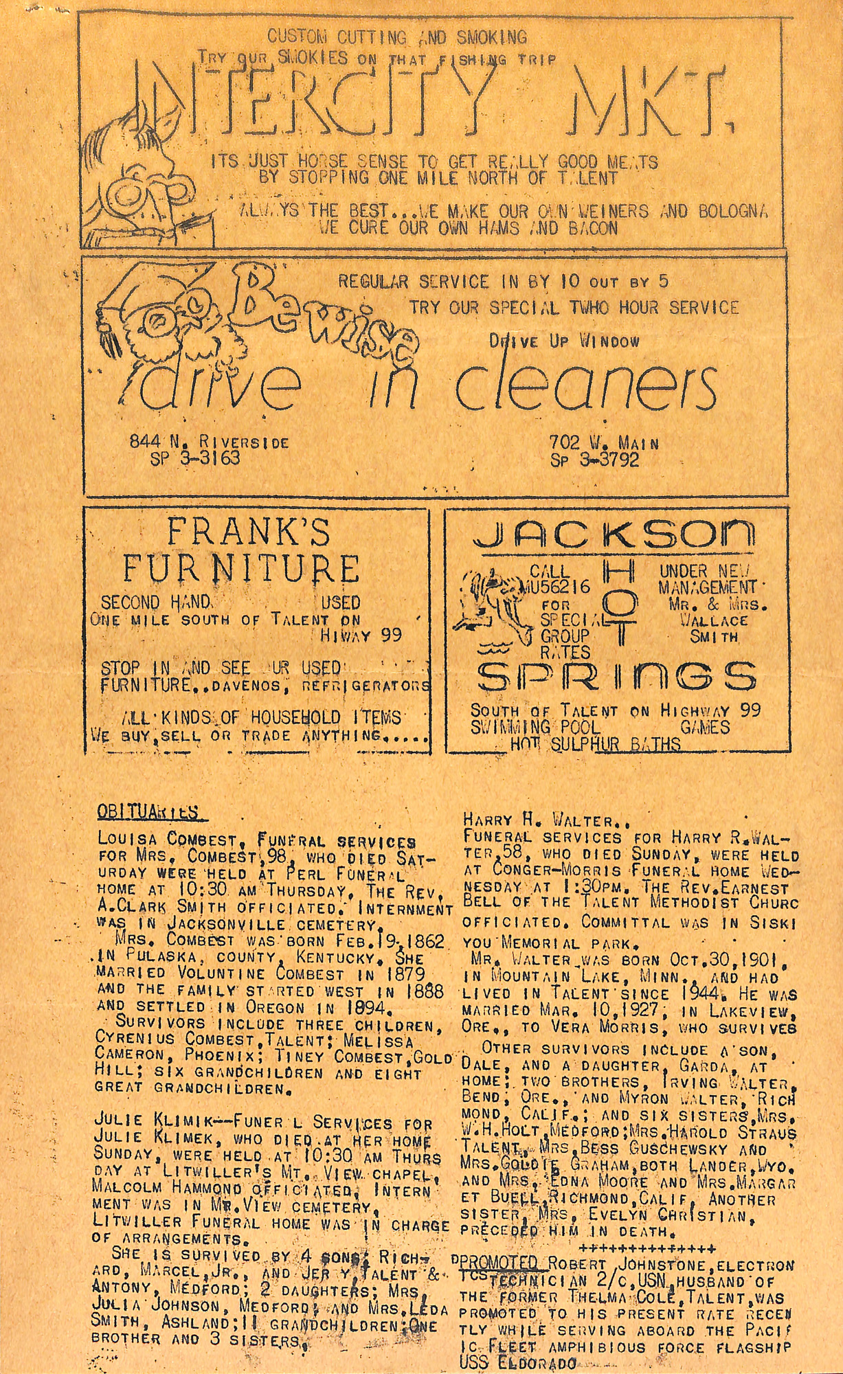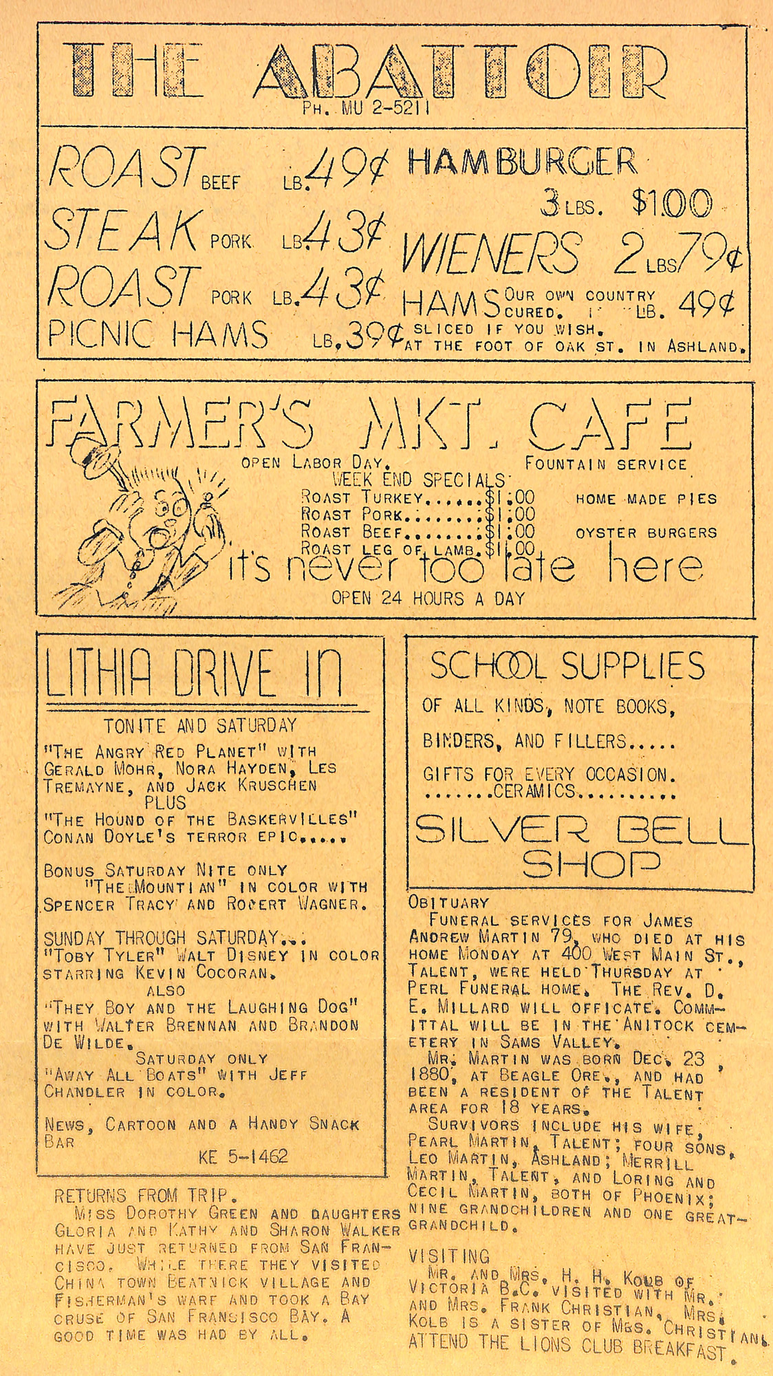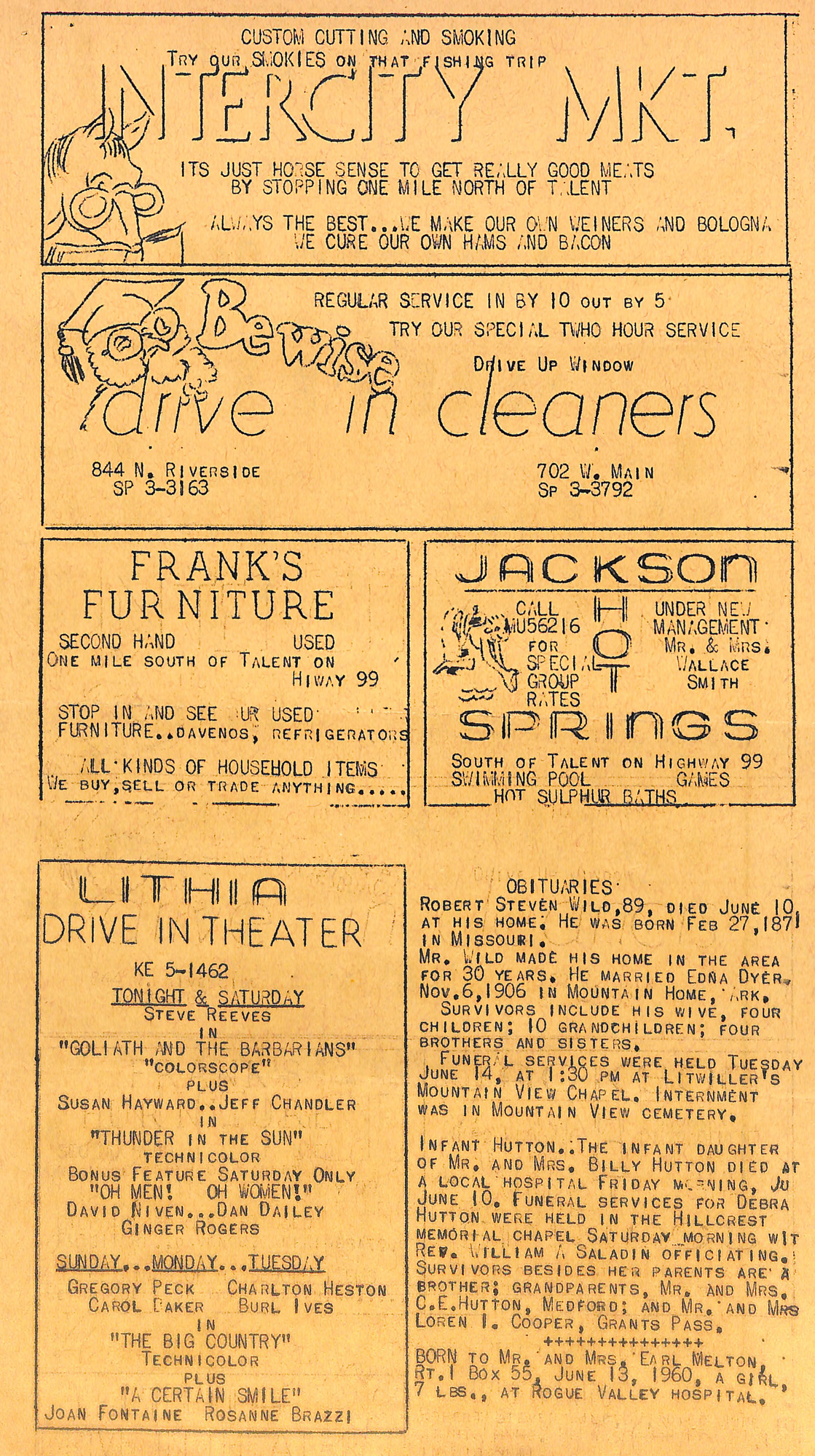 Page 2, ads for: THE ABATTOIR MACKAY AUTO CLINIC JO'S CAFÉ UPTOWN BARBERSHOP UNION 76 SERVICE OBITUARY--Sherry Lynn Webber. Word was received here of the death March 3 in Biloxi, Miss. of Sherry Lynn Webber, three-day-old infant daughter of Airman second class and Mrs. Stuart Webber. Survivors in addition to her parents include a sister, Teresa, and grandparents, Mr. and Mrs. C.O. Webber and Mr. and Mrs. Forrest Jennings, all of Talent. Funeral services were held March 5 at Bradford Funeral Home in Biloxi, with Chaplain Winans F. Beadle officiating. ARTHUR DAILEY: Funeral services for Arthur Dailey, 68, were held Tuesday at Ashland Mortuary Chapel. The Rev. R.L. Cornwall officiated. Committal was in Mtn. View cemetery. Mr. Dailey was born Nov. 26, 1891, in Kansas. He had lived in Central Point for 33 years before moving to Talent in Feb. 1959. Survivors include a son, Arthur F. Dailey, Portland; a daughter, Mrs. Viola Burns, Seattle; a brother, William Dailey, Talent, and five grandchildren. As soon as Pat and Sam decide who to run, they'll name their dark horse. Page 3, full-page ad for: DRIVE-IN MARKET Page 4, ads for: ROSS TV REPAIR DON'S FARMING SERVICE--Don Grimes, Clarence Holdridge FARMER'S INSURANCE--L.H. GALLATIN PERL FUNERAL HOME & AMBULANCE SERVICE IT'S