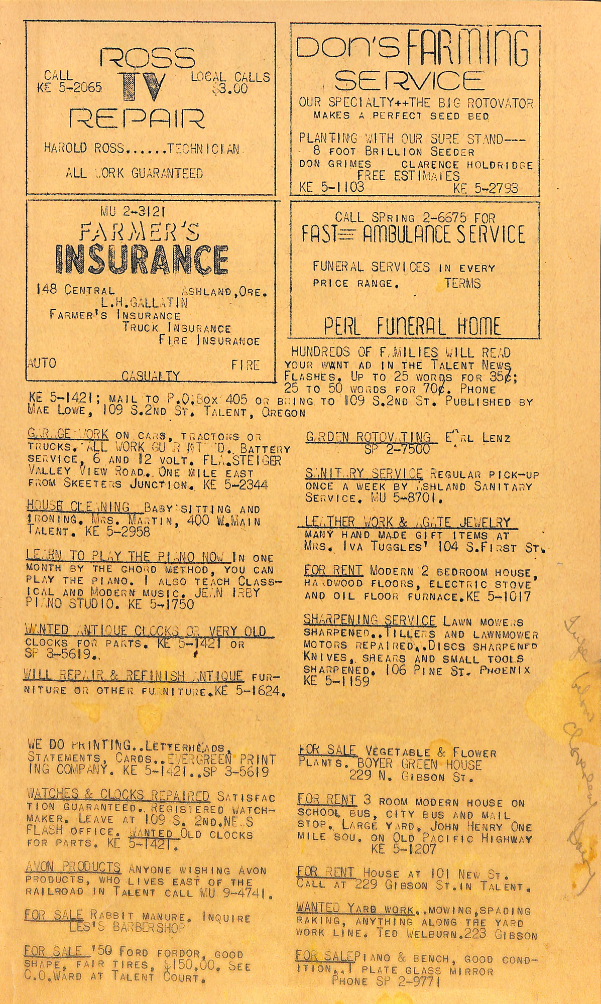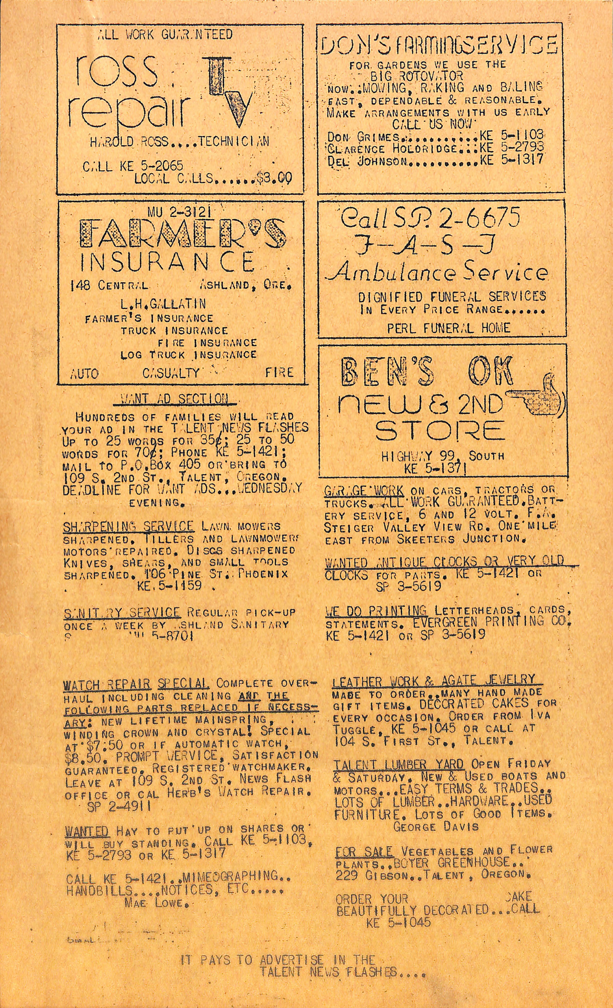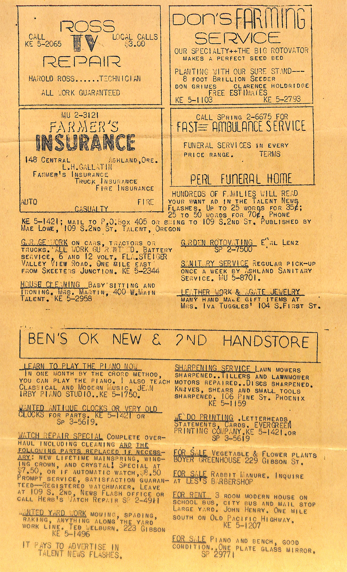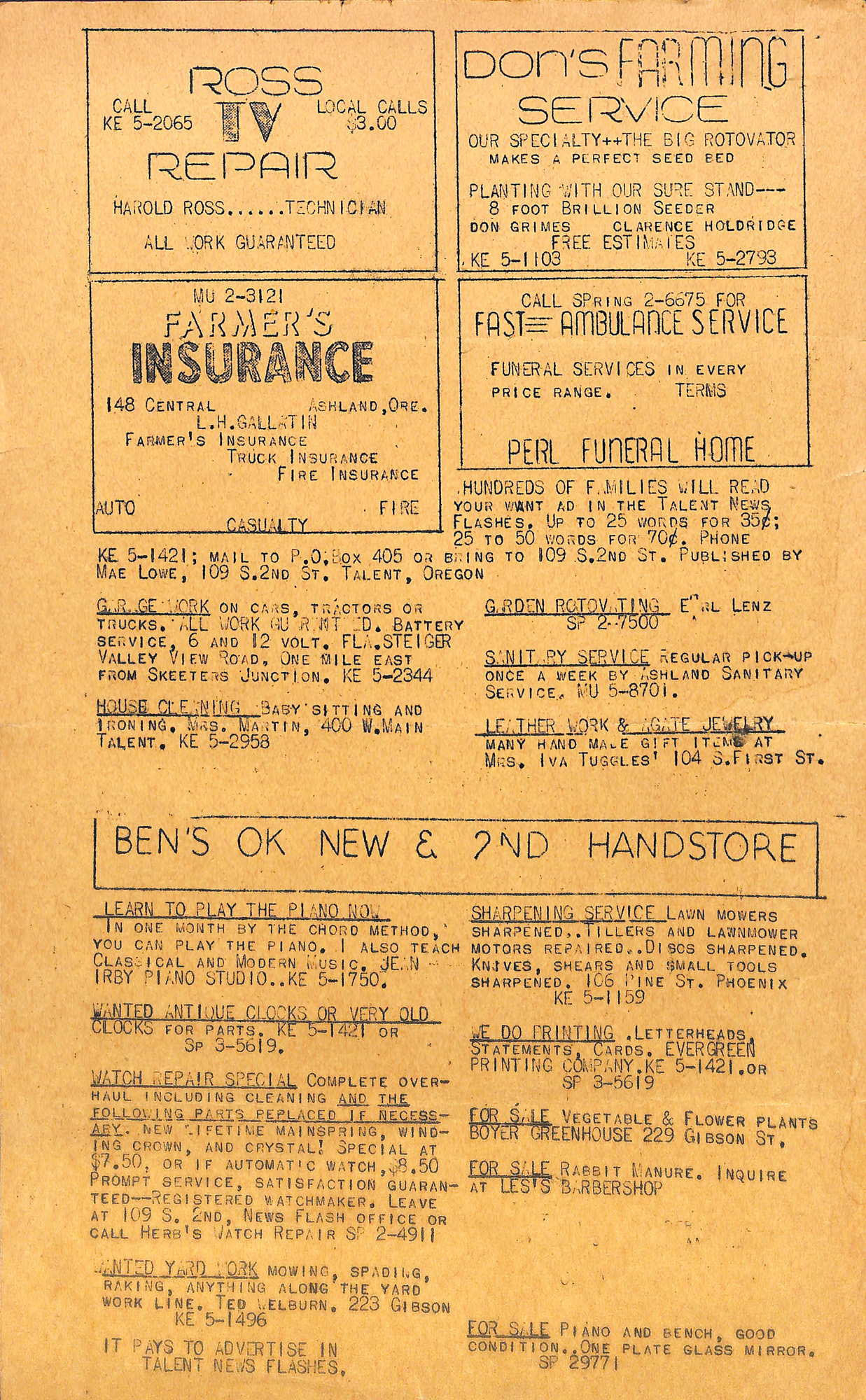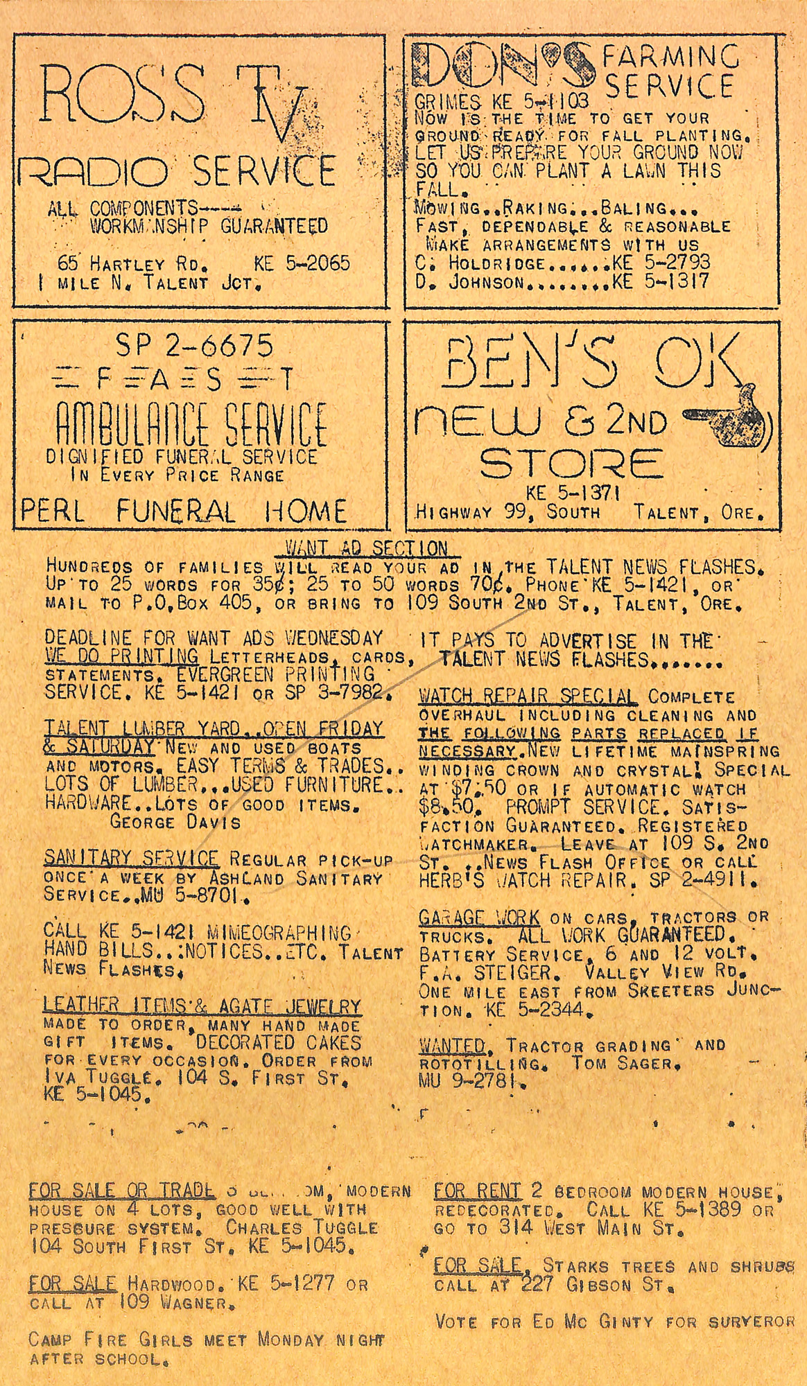 WANTED--Yard work; mowing, spading, raking, anything along the yard work line. Ted Welburn. 223 Gibson--KE 5-1496. Page 3, ads for: ROSS TV REPAIR DON'S FARMING SERVICE FARMER'S INSURANCE--L.H. GALLATIN PERL FUNERAL HOME & AMBULANCE SERVICE BEN'S OK NEW & 2ND HAND STORE HUNDREDS OF FAMILIES WILL READ your want ad in the TALENT NEWS FLASHES. Up to 25 words for 35¢; 25 to 50 words for 70¢. Phone KE 5-1421; mail to P.O. Box 405 or bring to 109 S. 2nd St. Published by Mae Lowe, 109 S. 2nd St., Talent, Ore. STEIGER GARAGE WORK