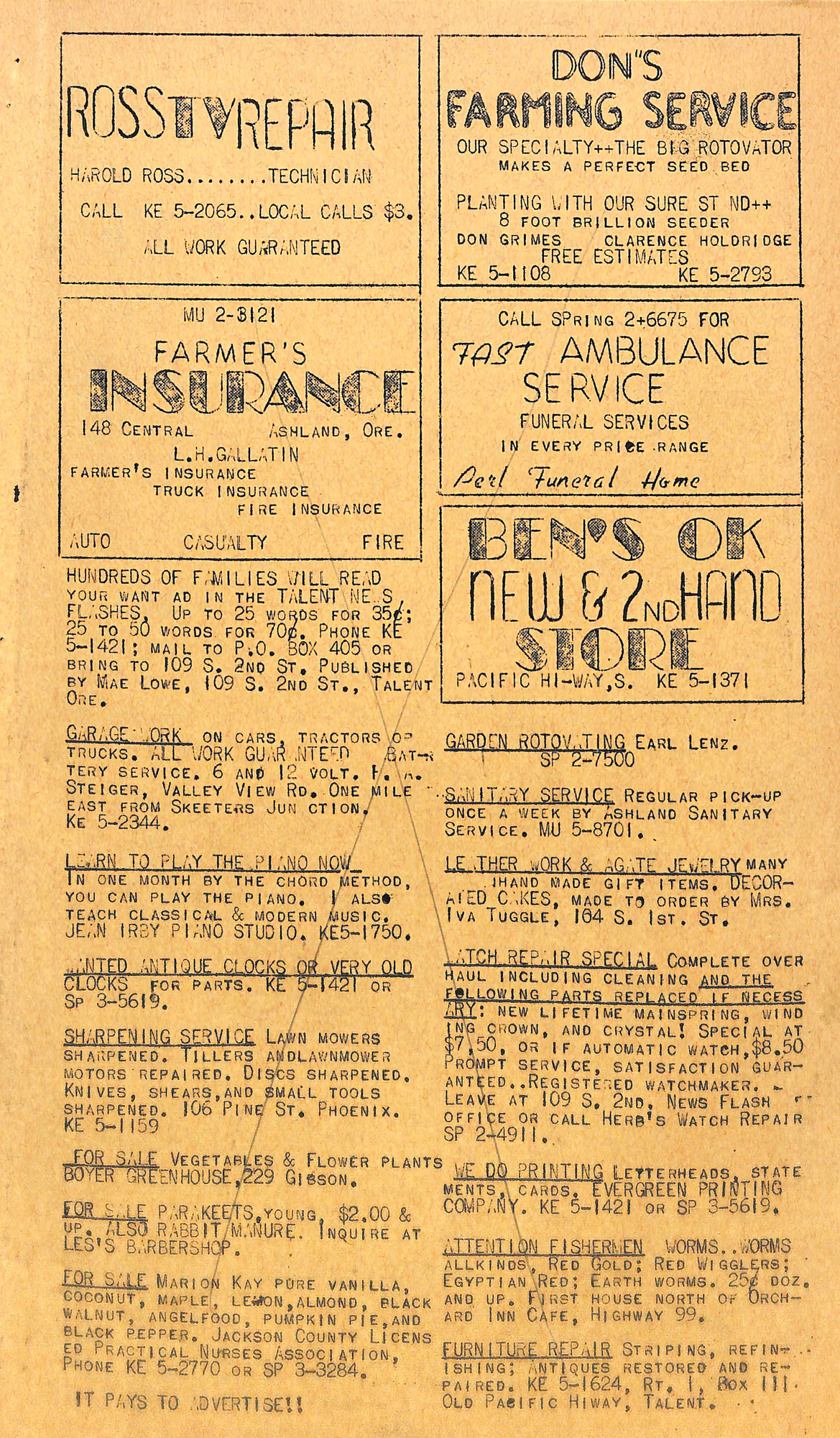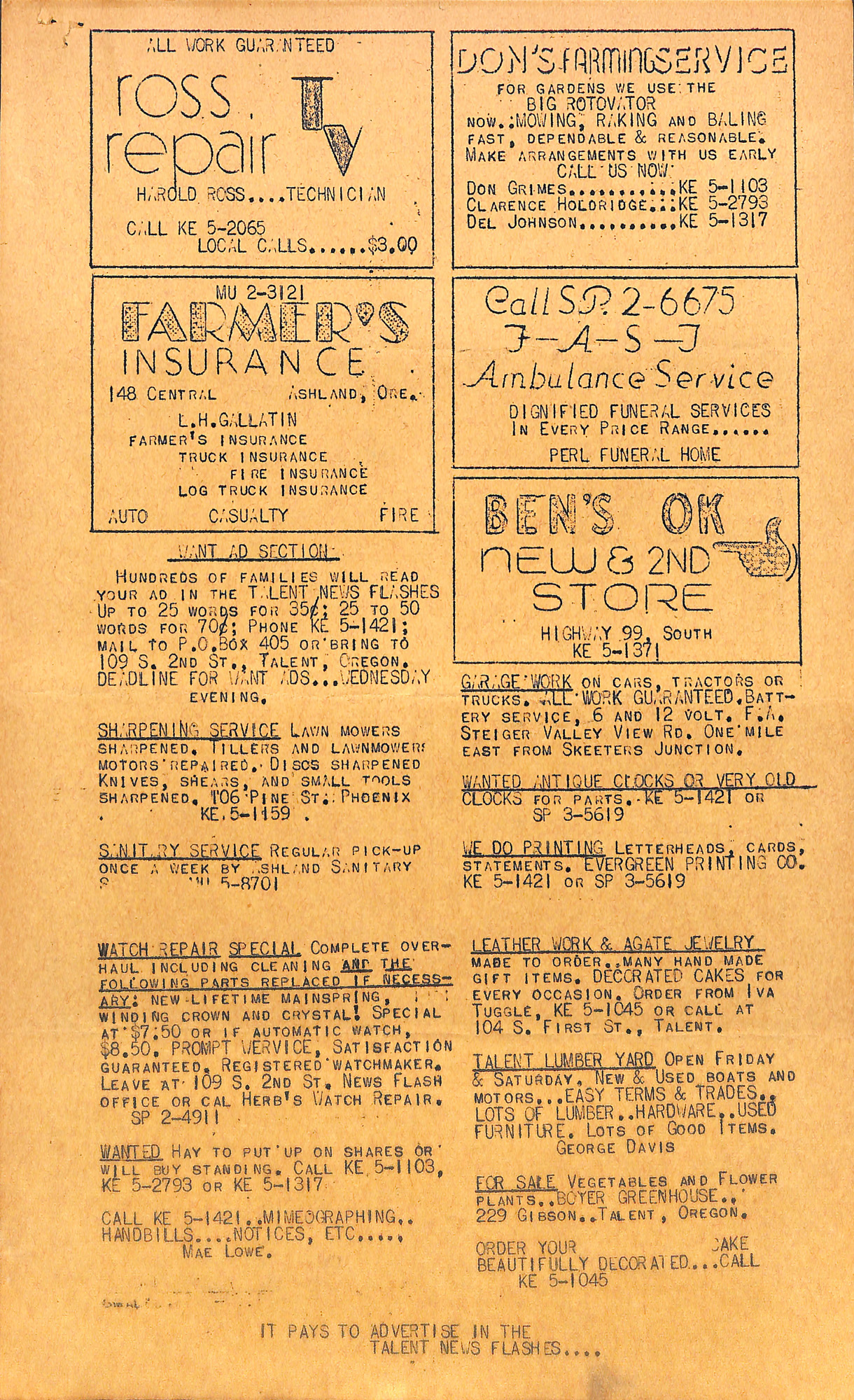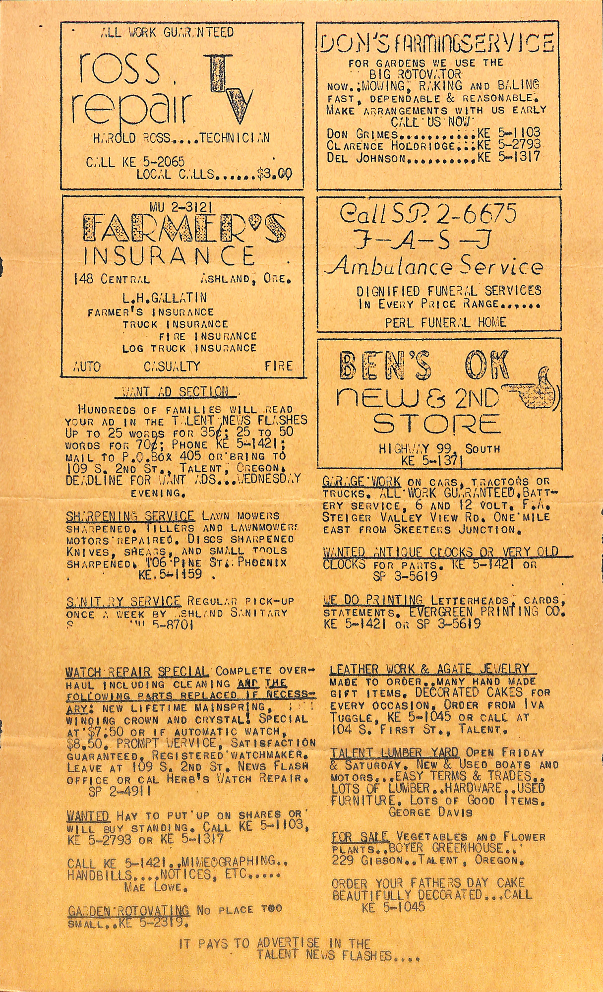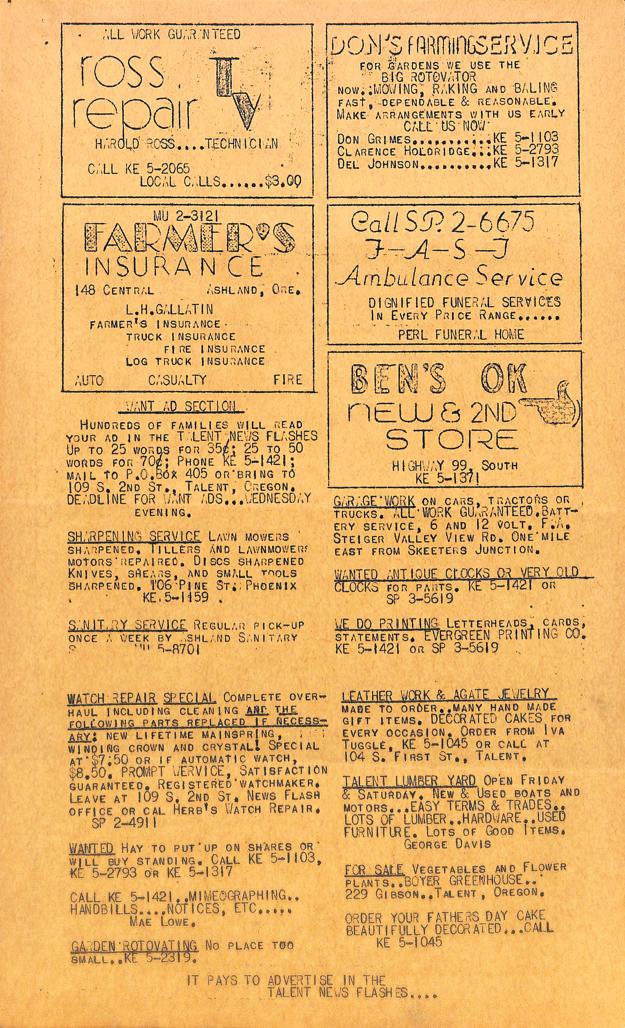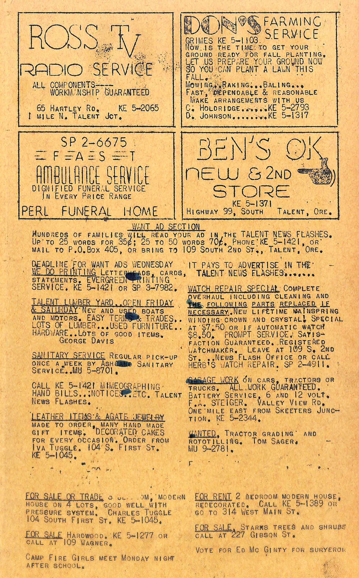 WANTED--Yard work; mowing, spading, raking, anything along the yard work line. Ted Welburn. 223 Gibson--KE 5-1496. Page 3, ads for: ROSS TV REPAIR DON'S FARMING SERVICE FARMER'S INSURANCE--L.H. GALLATIN PERL FUNERAL HOME & AMBULANCE SERVICE BEN'S OK NEW & 2ND HAND STORE HUNDREDS OF FAMILIES WILL READ your want ad in the TALENT NEWS FLASHES. Up to 25 words for 35¢; 25 to 50 words for 70¢. Phone KE 5-1421; mail to P.O. Box 405 or bring to 109 S. 2nd St. Published by Mae Lowe, 109 S. 2nd St., Talent, Ore. STEIGER GARAGE WORK