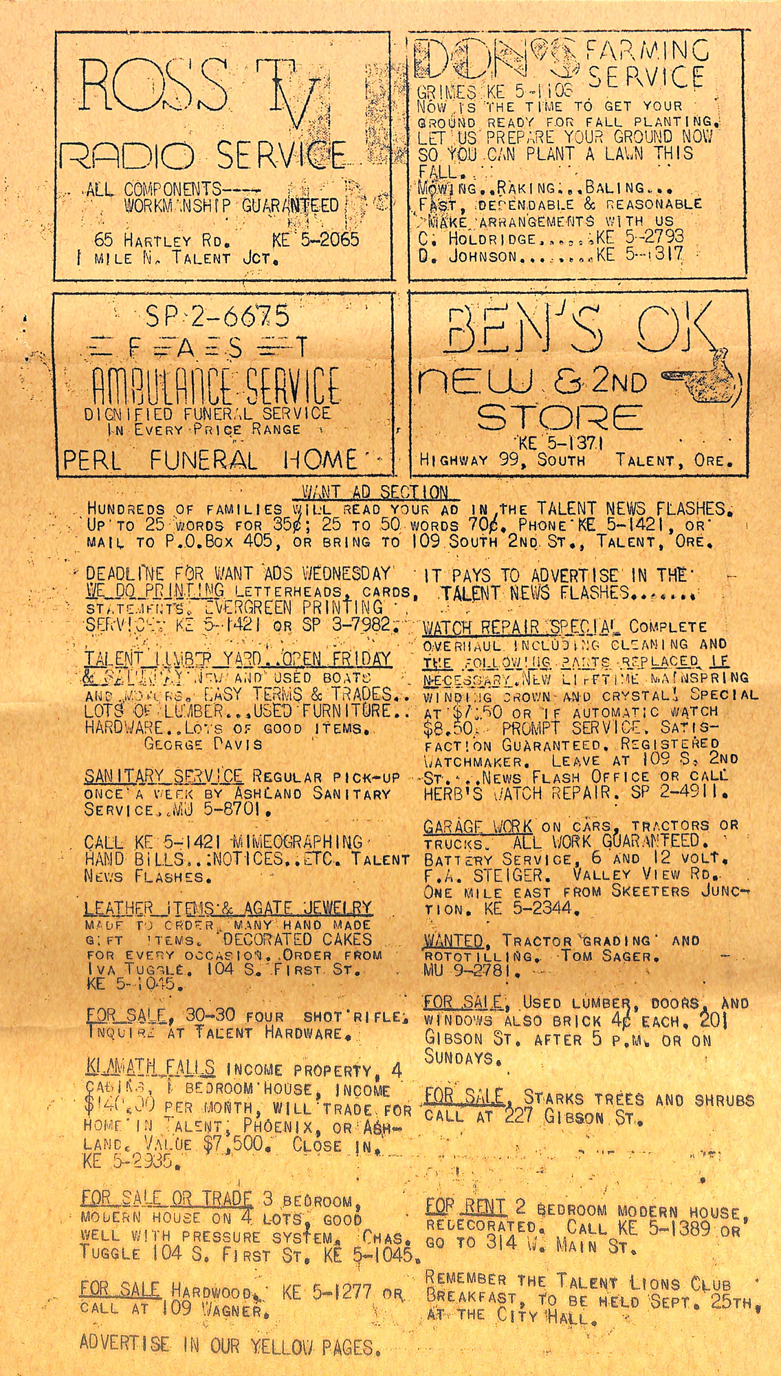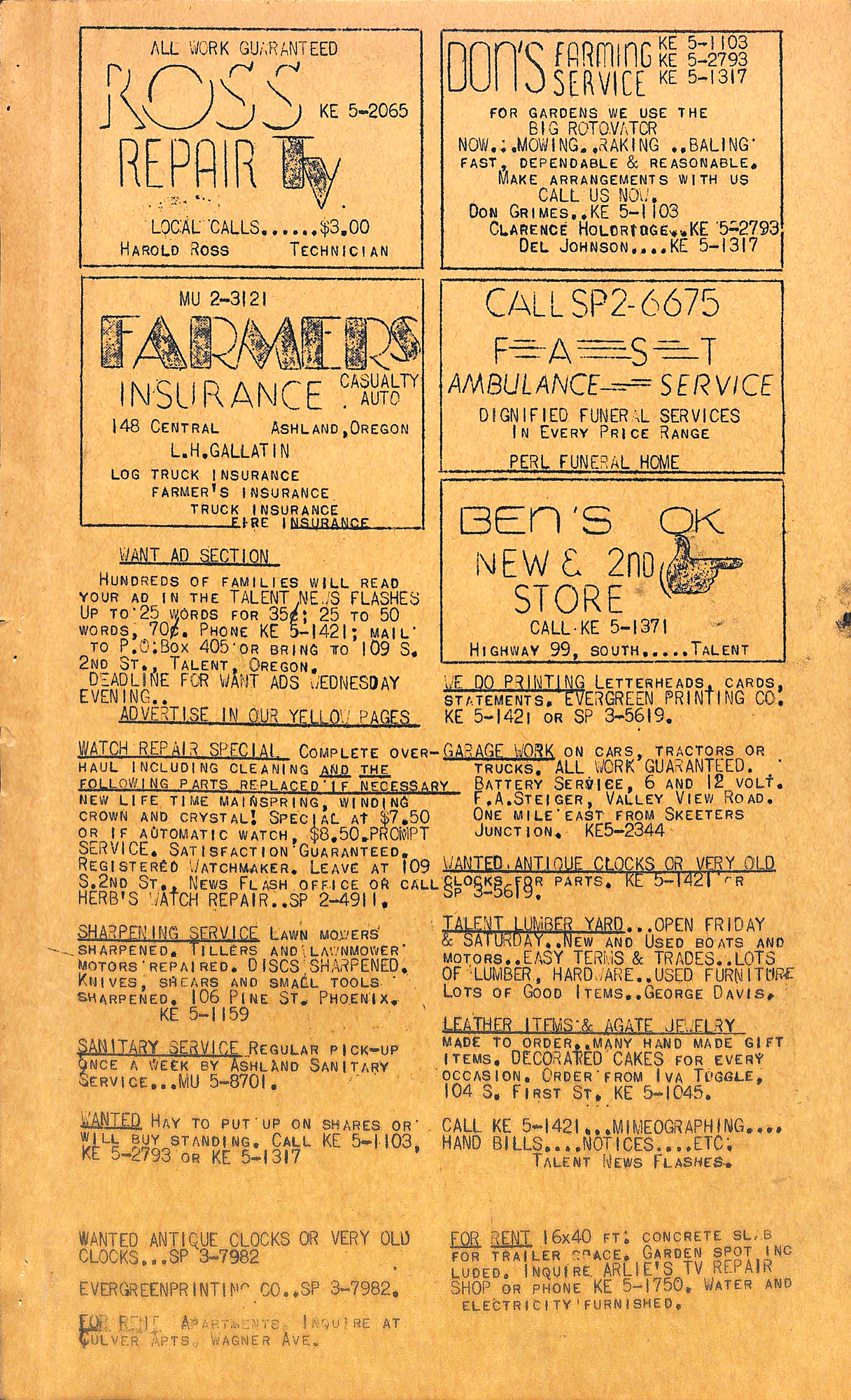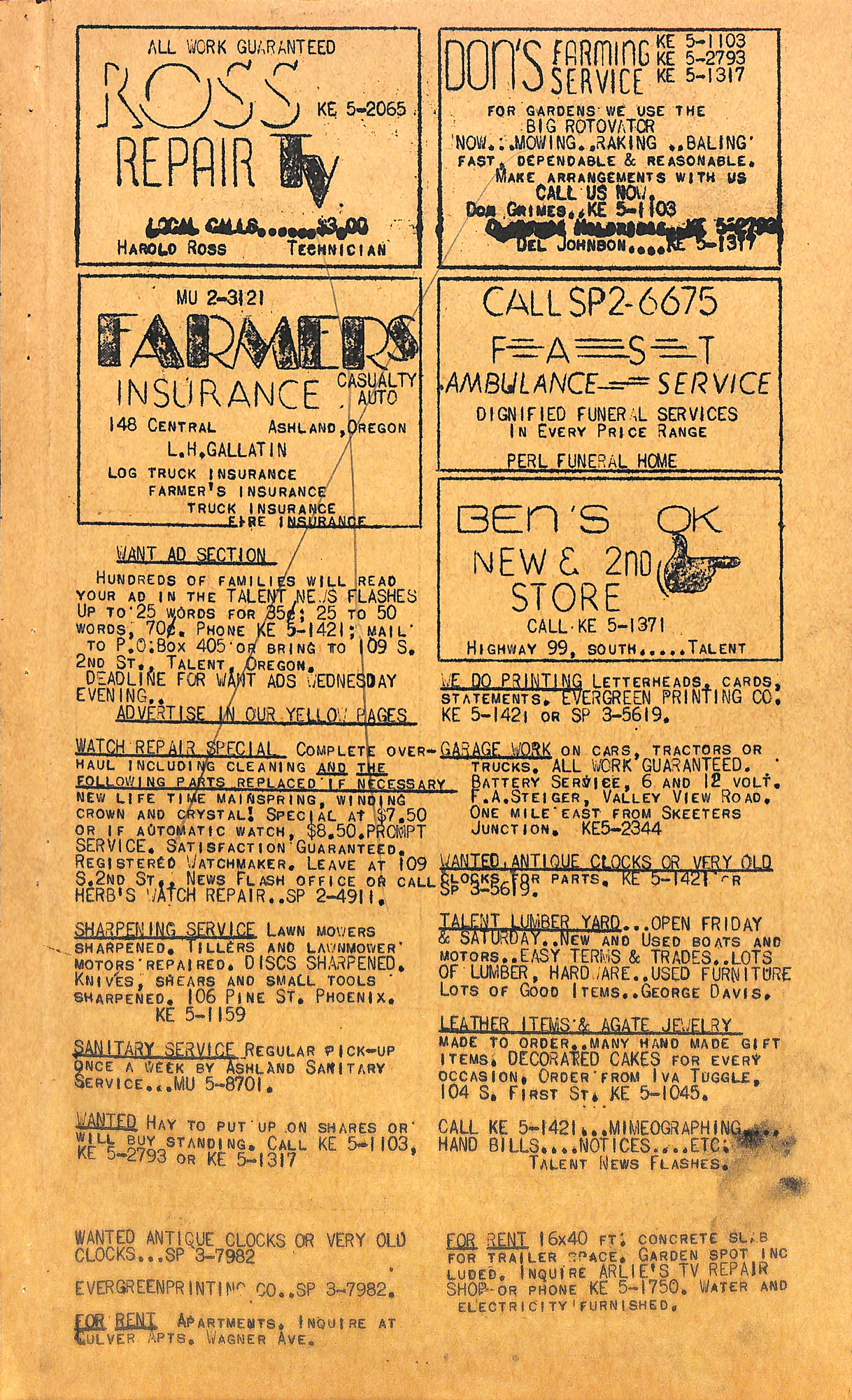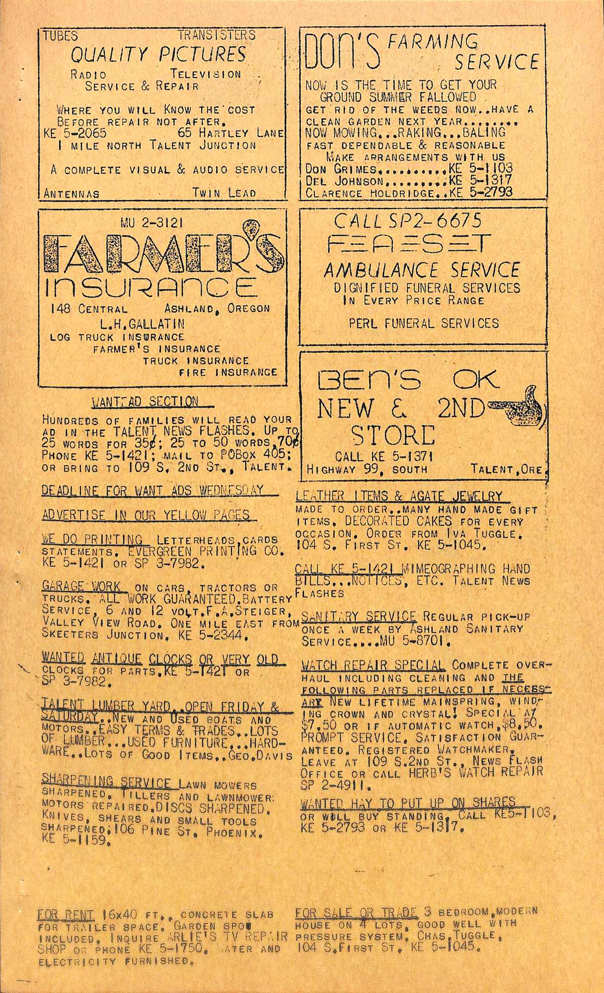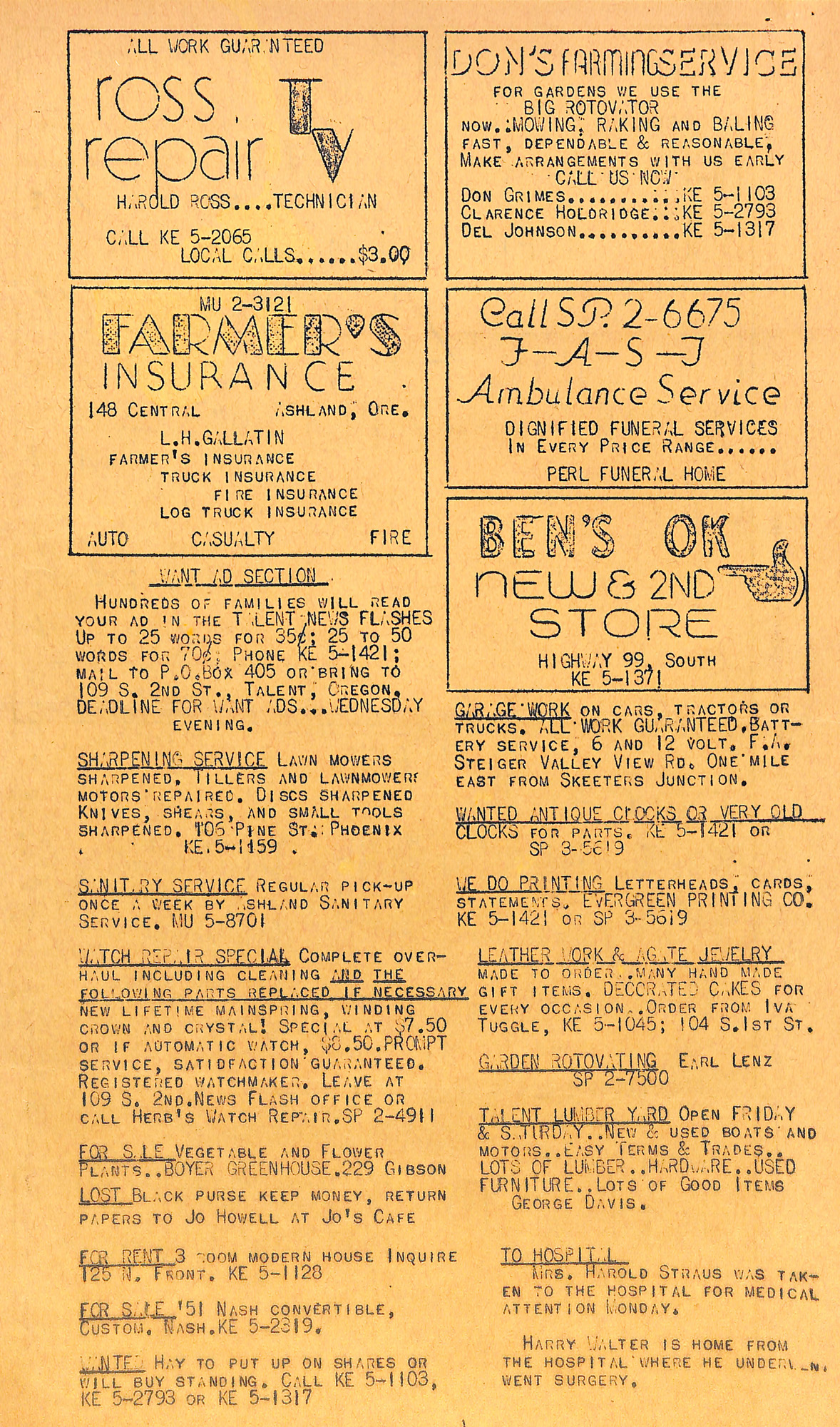 WANTED--Yard work; mowing, spading, raking, anything along the yard work line. Ted Welburn. 223 Gibson--KE 5-1496. Page 3, ads for: ROSS TV REPAIR DON'S FARMING SERVICE FARMER'S INSURANCE--L.H. GALLATIN PERL FUNERAL HOME & AMBULANCE SERVICE BEN'S OK NEW & 2ND HAND STORE HUNDREDS OF FAMILIES WILL READ your want ad in the TALENT NEWS FLASHES. Up to 25 words for 35¢; 25 to 50 words for 70¢. Phone KE 5-1421; mail to P.O. Box 405 or bring to 109 S. 2nd St. Published by Mae Lowe, 109 S. 2nd St., Talent, Ore. STEIGER GARAGE WORK