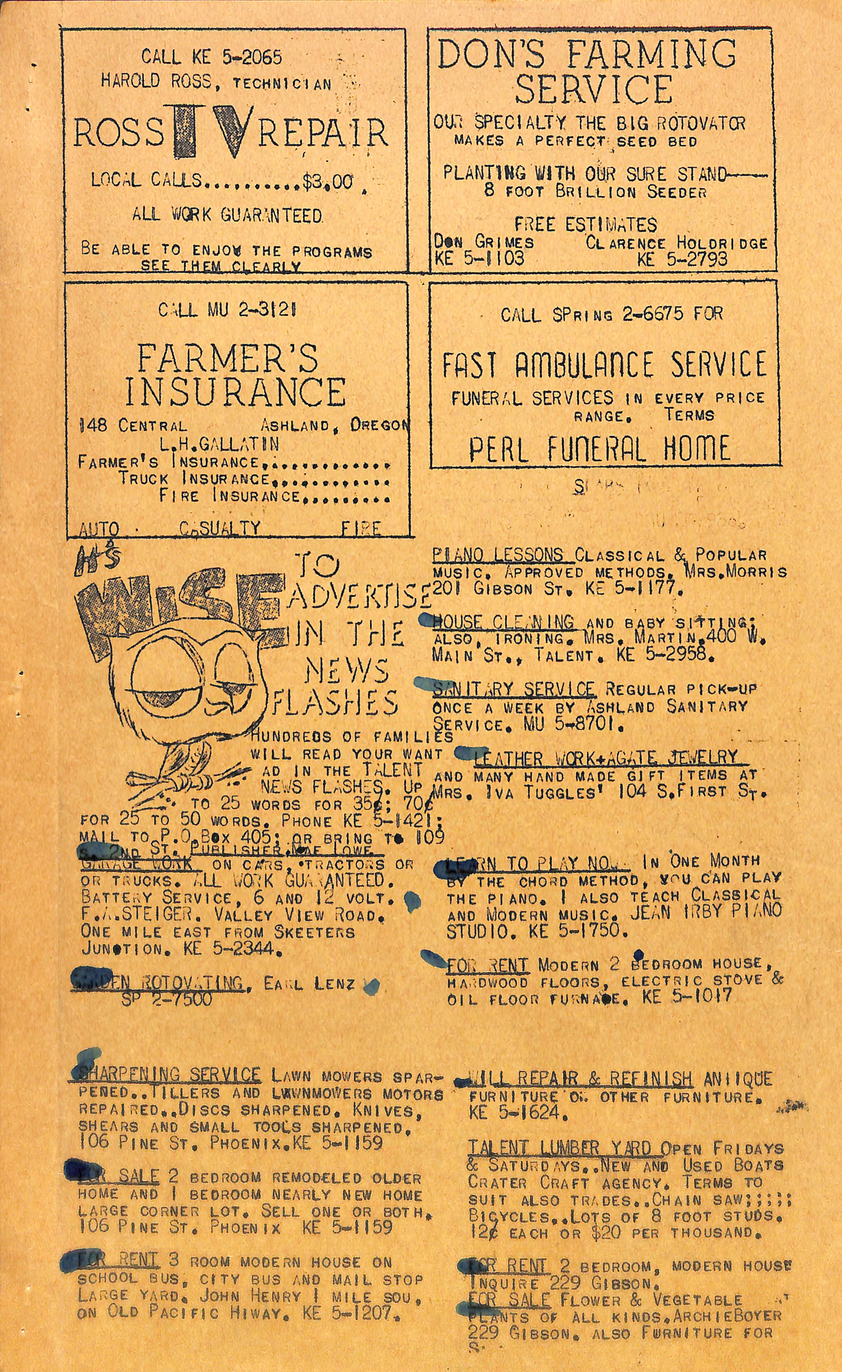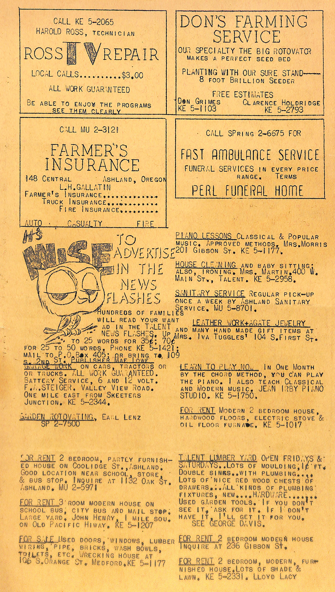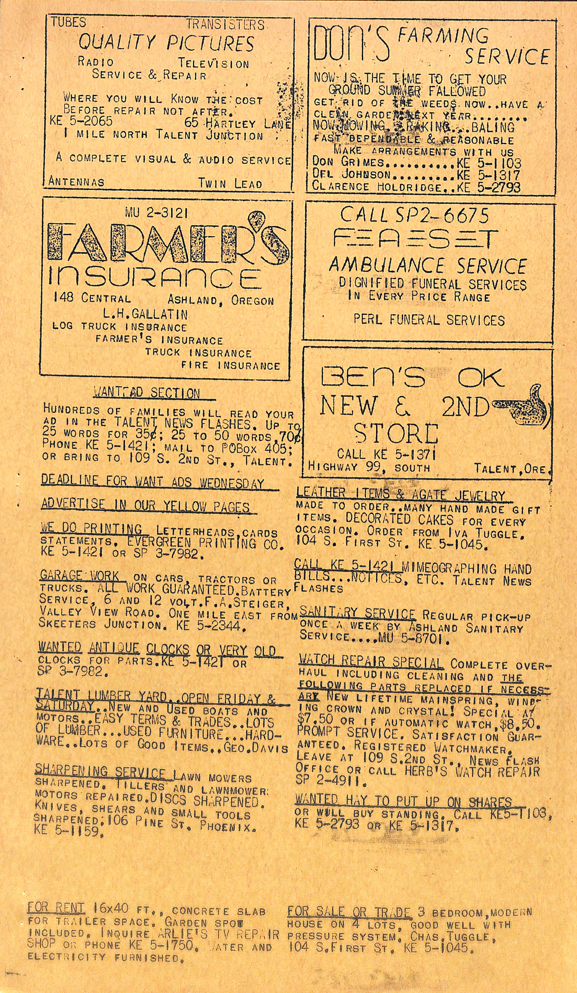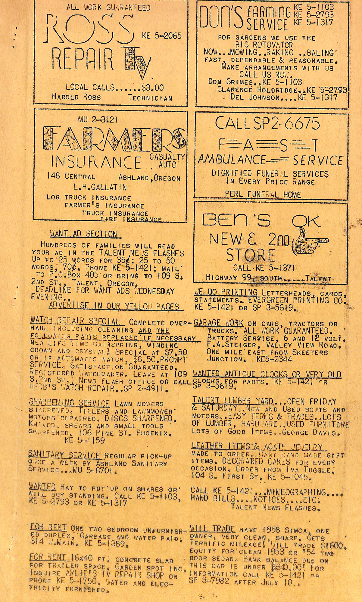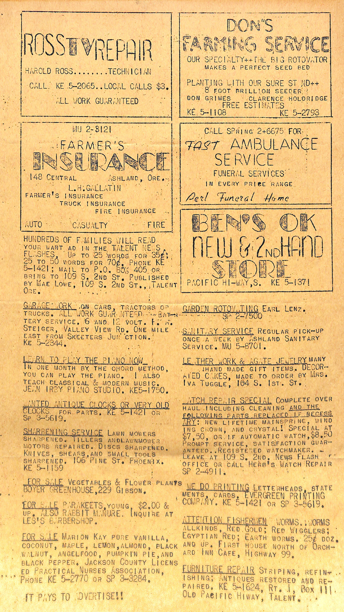 WANTED--Yard work; mowing, spading, raking, anything along the yard work line. Ted Welburn. 223 Gibson--KE 5-1496. Page 3, ads for: ROSS TV REPAIR DON'S FARMING SERVICE FARMER'S INSURANCE--L.H. GALLATIN PERL FUNERAL HOME & AMBULANCE SERVICE BEN'S OK NEW & 2ND HAND STORE HUNDREDS OF FAMILIES WILL READ your want ad in the TALENT NEWS FLASHES. Up to 25 words for 35¢; 25 to 50 words for 70¢. Phone KE 5-1421; mail to P.O. Box 405 or bring to 109 S. 2nd St. Published by Mae Lowe, 109 S. 2nd St., Talent, Ore. STEIGER GARAGE WORK