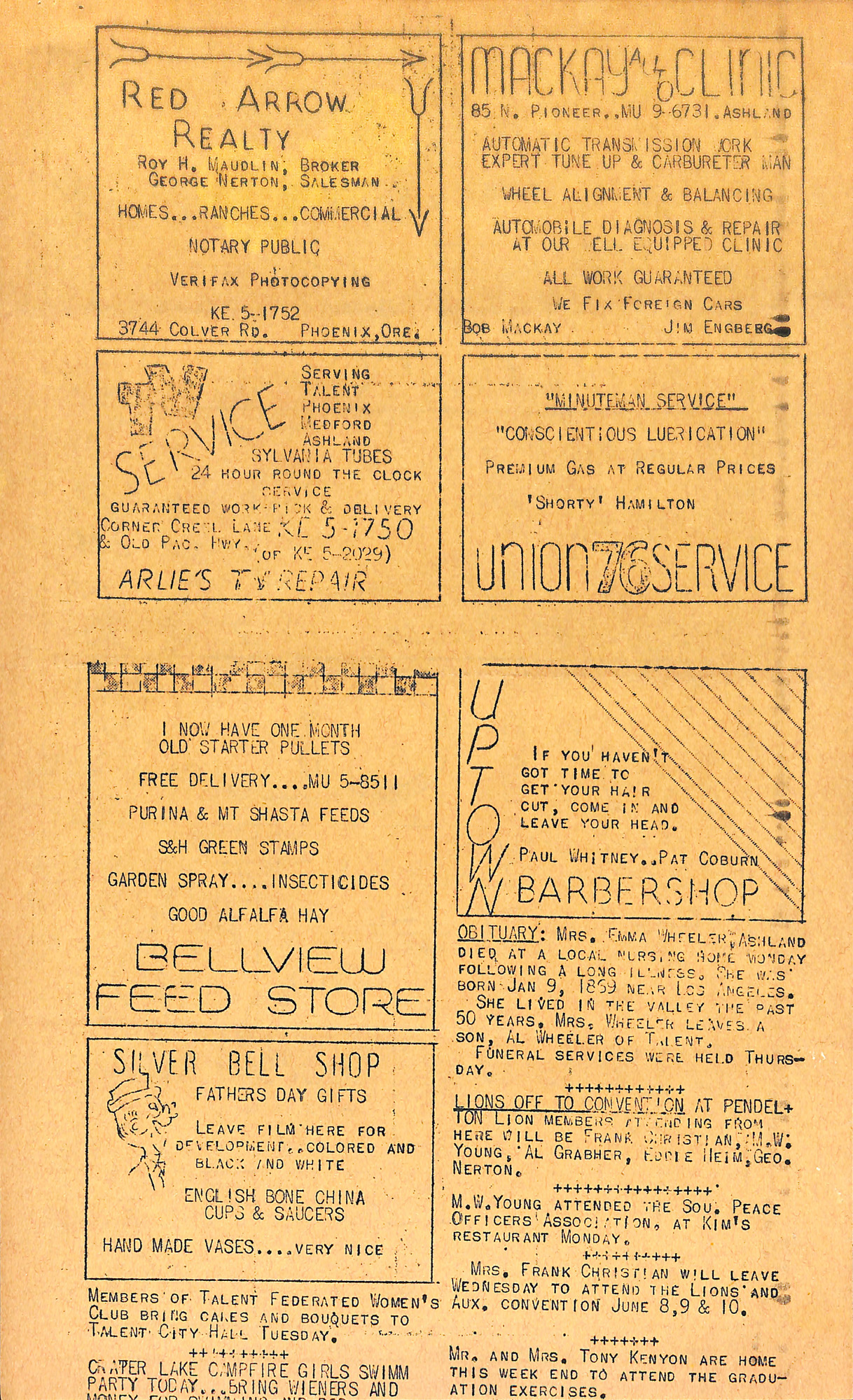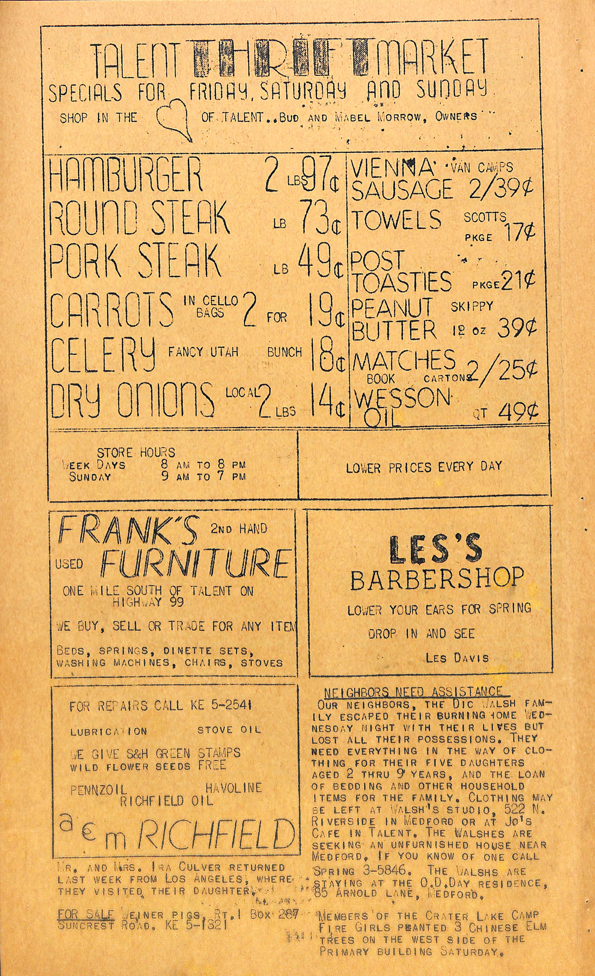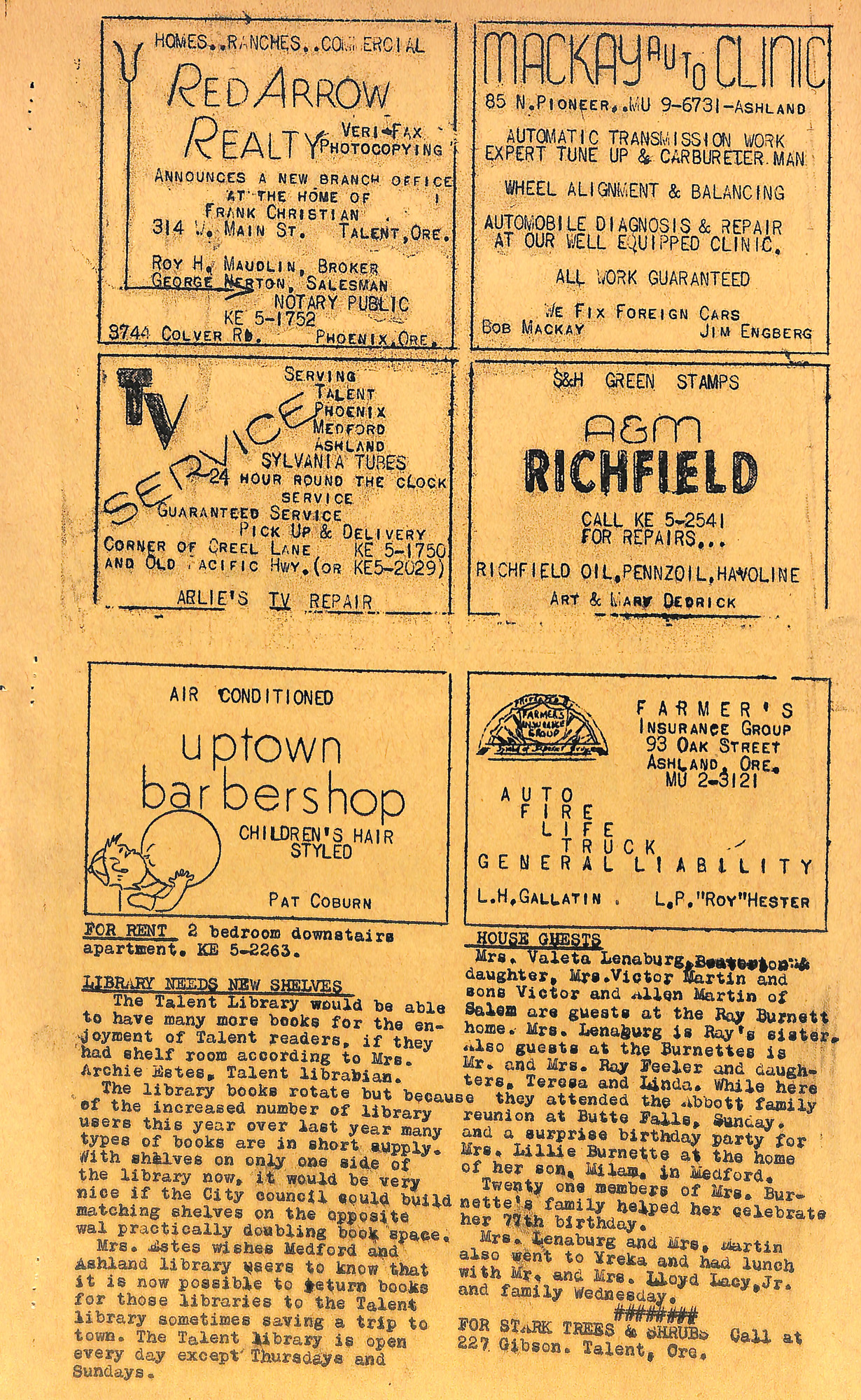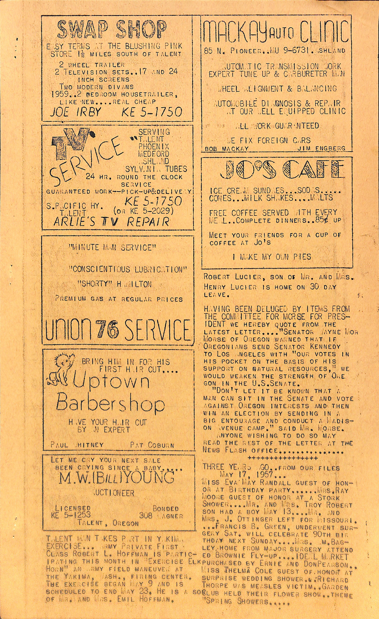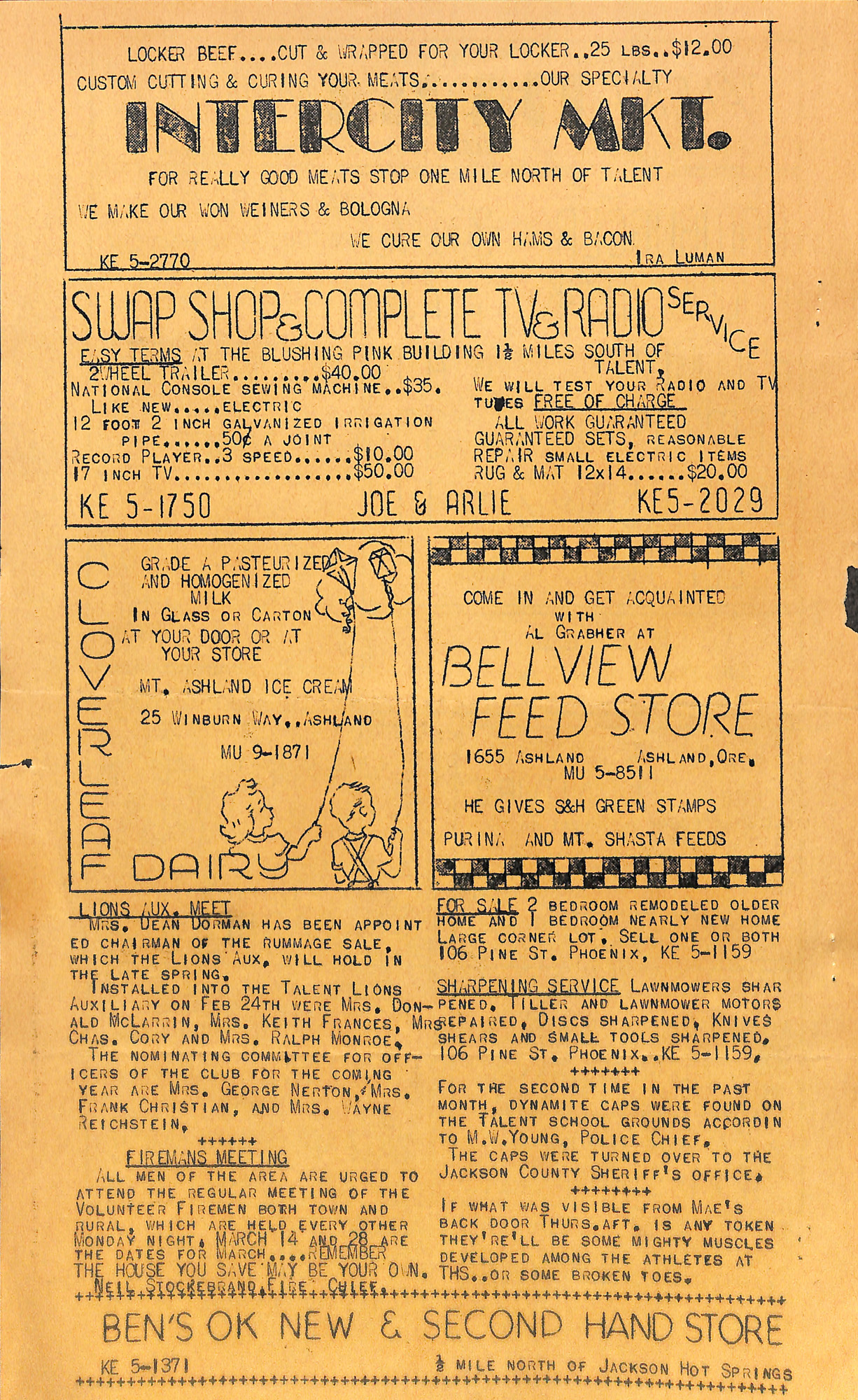 FOR RENT--2-bedroom modern house. Inquire at 236 Gibson St. FOR RENT--2-bedroom, modern, furnished house. Lots of shade & lawn. KE 5-2331. Lloyd Lacy. Page 5, ads for: TALENT THRIFT MARKET FRANK'S FURNITURE LES DAVIS BARBERSHOP A&M RICHFIELD TALENT INSURANCE & REAL ESTATE CORNY the CORNBALL is back from California. Goldie Davis has bought herself a little green bug. Nash Metropolitan, to be exact. Stop at Richfield A&M station and get your Wild Flower Seeds FREE. WANT AD SECTION, cont. FOR SALE--Betty Crocker Iron. Almost new, $5.00. 109 S. 2nd St. FOR SALE--Studio couch, good condition; cabinet sewing machine, Mrs. Ira Culver. KE 5-2263. Page 6, ads for: INTERCITY MARKET--Ira Luman SWAP SHOP & COMPLETE TV & RADIO SERVICE--Joe & Arlie CLOVERLEAF DAIRY BELLVIEW FEED STORE Come in and get acquainted with Al Grabher, 1655 Ashland BEN'S OK NEW & SECOND HAND STORE LIONS AUX. MEET Mrs. Dean Dorman has been appointed chairman of the rummage sale which the Lions Aux. will hold in the late spring. Installed into the Talent Lions Auxiliary on Feb. 24th were Mrs. Donald McLarrin, Mrs. Keith Frances, Mrs. Chas. Cory and Mrs. Ralph Monroe. The nominating committee for officers of the club for the coming year are Mrs. George Nerton, Mrs. Frank Christian, and Mrs. Wayne Reichstein. FIREMEN'S MEETING All men of the area are urged to attend the regular meeting of the Volunteer Firemen, both town and rural, which are held every other Monday night. MARCH 14 AND 28 are the dates for March…REMEMBER, THE HOUSE YOU SAVE MAY BE YOUR OWN.--Neil Stockebrand, Fire Chief. FOR SALE--2-bedroom remodeled older home and 1-bedroom nearly new home. Large corner lot. Sell one or both. 106 Pine St. Phoenix, KE 5-1159. SHARPENING SERVICE