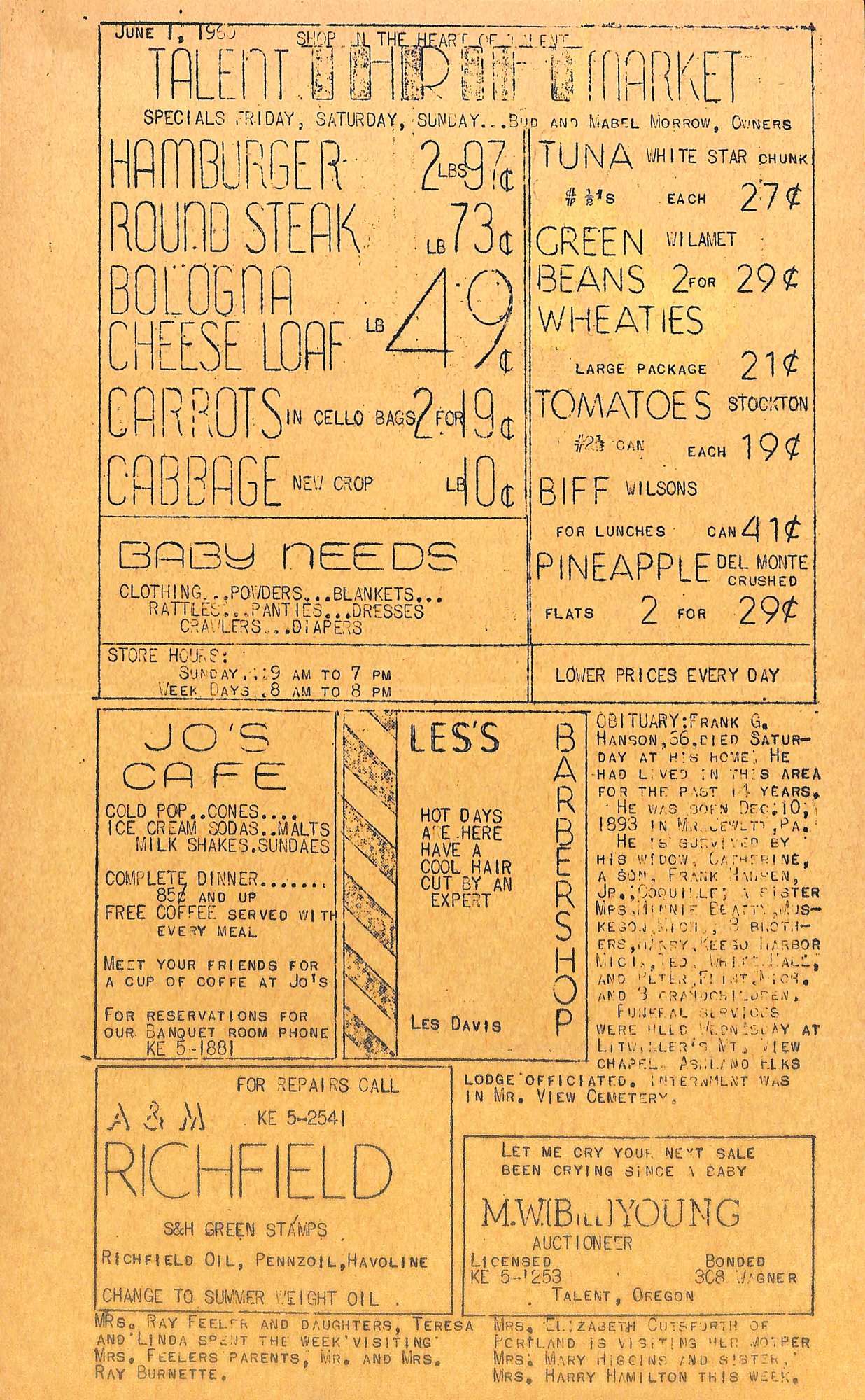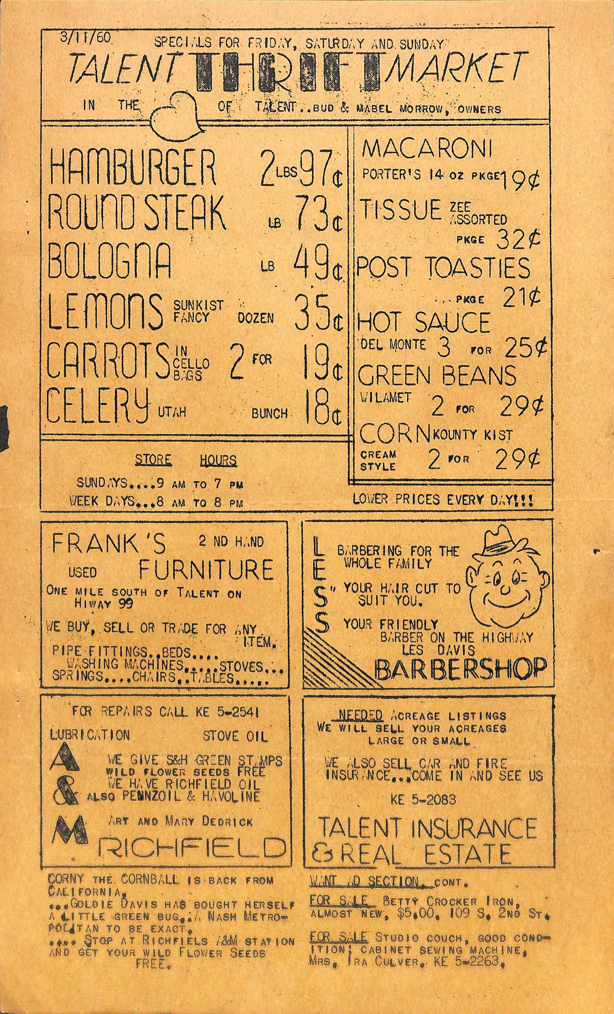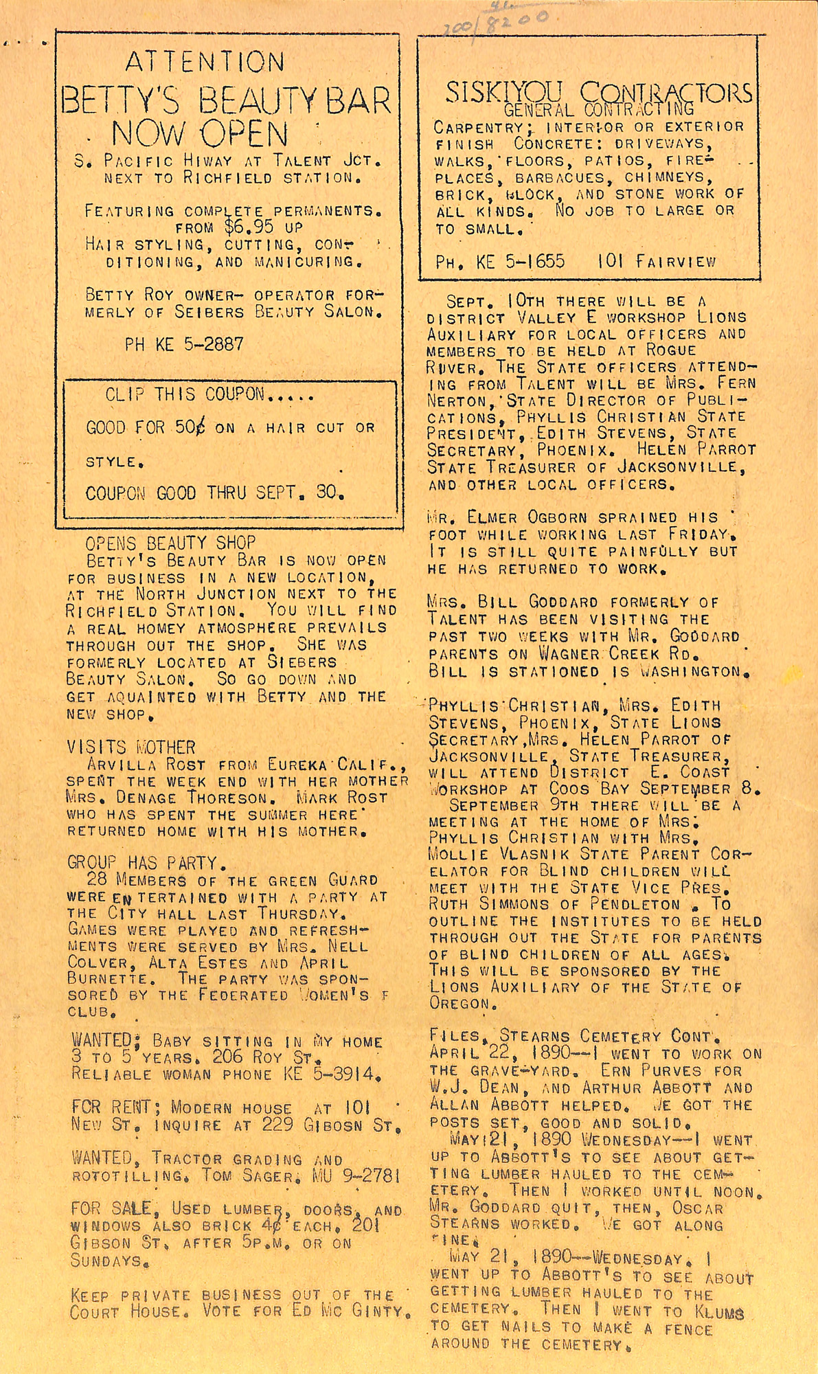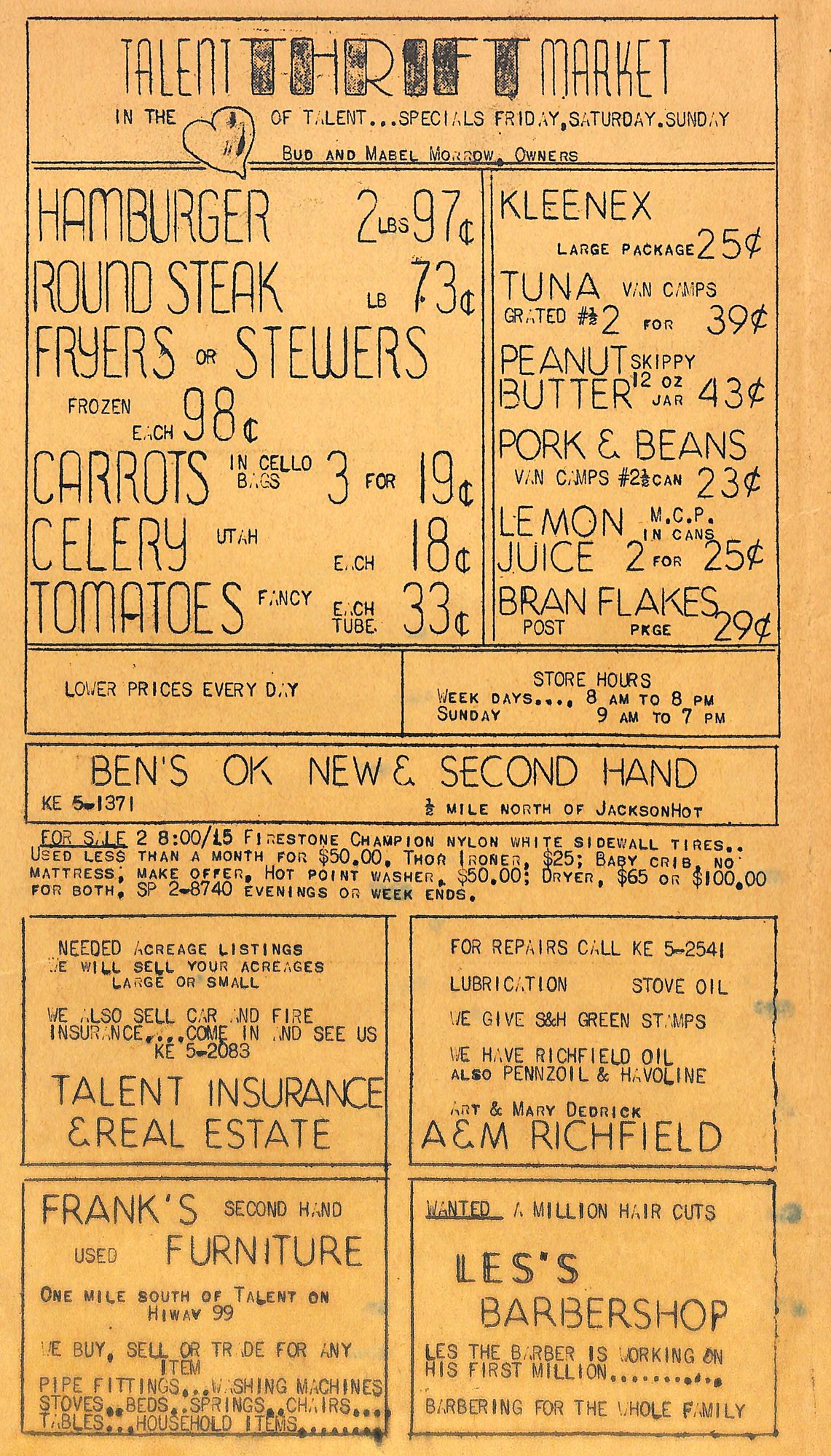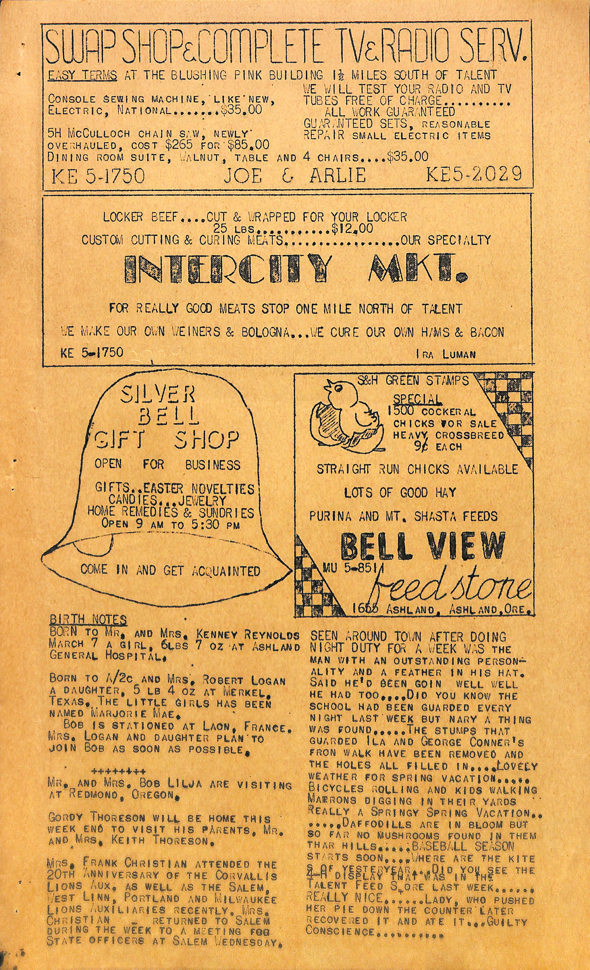 FOR RENT--2-bedroom modern house. Inquire at 236 Gibson St. FOR RENT--2-bedroom, modern, furnished house. Lots of shade & lawn. KE 5-2331. Lloyd Lacy. Page 5, ads for: TALENT THRIFT MARKET FRANK'S FURNITURE LES DAVIS BARBERSHOP A&M RICHFIELD TALENT INSURANCE & REAL ESTATE CORNY the CORNBALL is back from California. Goldie Davis has bought herself a little green bug. Nash Metropolitan, to be exact. Stop at Richfield A&M station and get your Wild Flower Seeds FREE. WANT AD SECTION, cont. FOR SALE--Betty Crocker Iron. Almost new, $5.00. 109 S. 2nd St. FOR SALE--Studio couch, good condition; cabinet sewing machine, Mrs. Ira Culver. KE 5-2263. Page 6, ads for: INTERCITY MARKET--Ira Luman SWAP SHOP & COMPLETE TV & RADIO SERVICE--Joe & Arlie CLOVERLEAF DAIRY BELLVIEW FEED STORE Come in and get acquainted with Al Grabher, 1655 Ashland BEN'S OK NEW & SECOND HAND STORE LIONS AUX. MEET Mrs. Dean Dorman has been appointed chairman of the rummage sale which the Lions Aux. will hold in the late spring. Installed into the Talent Lions Auxiliary on Feb. 24th were Mrs. Donald McLarrin, Mrs. Keith Frances, Mrs. Chas. Cory and Mrs. Ralph Monroe. The nominating committee for officers of the club for the coming year are Mrs. George Nerton, Mrs. Frank Christian, and Mrs. Wayne Reichstein. FIREMEN'S MEETING All men of the area are urged to attend the regular meeting of the Volunteer Firemen, both town and rural, which are held every other Monday night. MARCH 14 AND 28 are the dates for March…REMEMBER, THE HOUSE YOU SAVE MAY BE YOUR OWN.--Neil Stockebrand, Fire Chief. FOR SALE--2-bedroom remodeled older home and 1-bedroom nearly new home. Large corner lot. Sell one or both. 106 Pine St. Phoenix, KE 5-1159. SHARPENING SERVICE