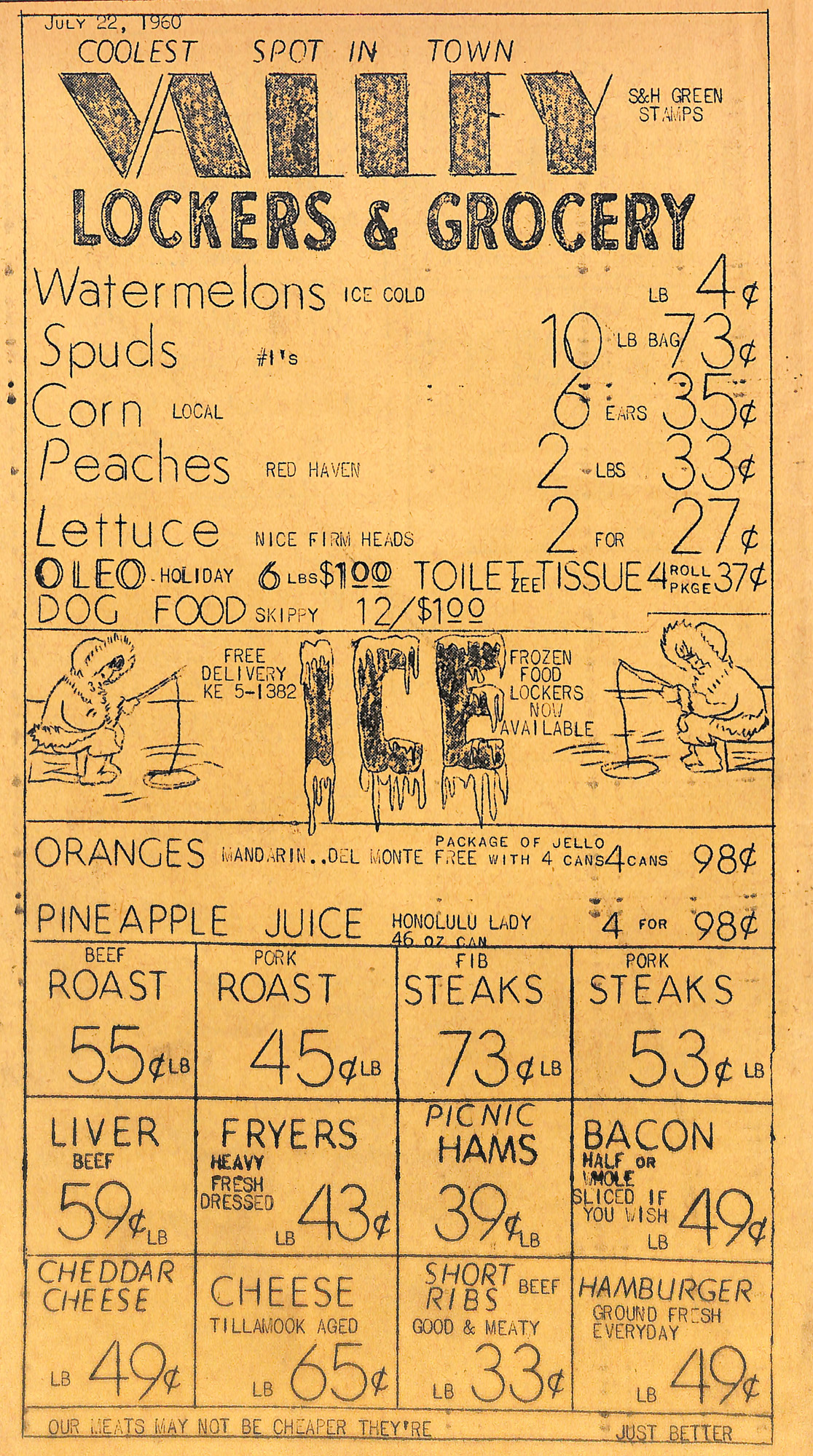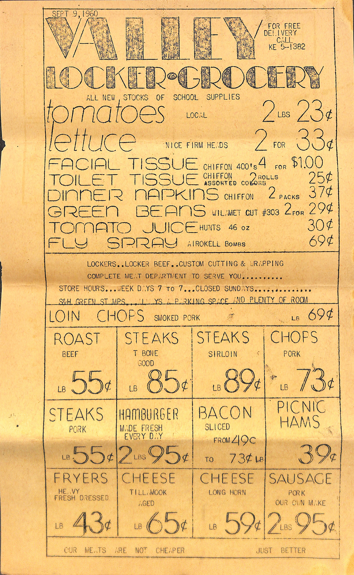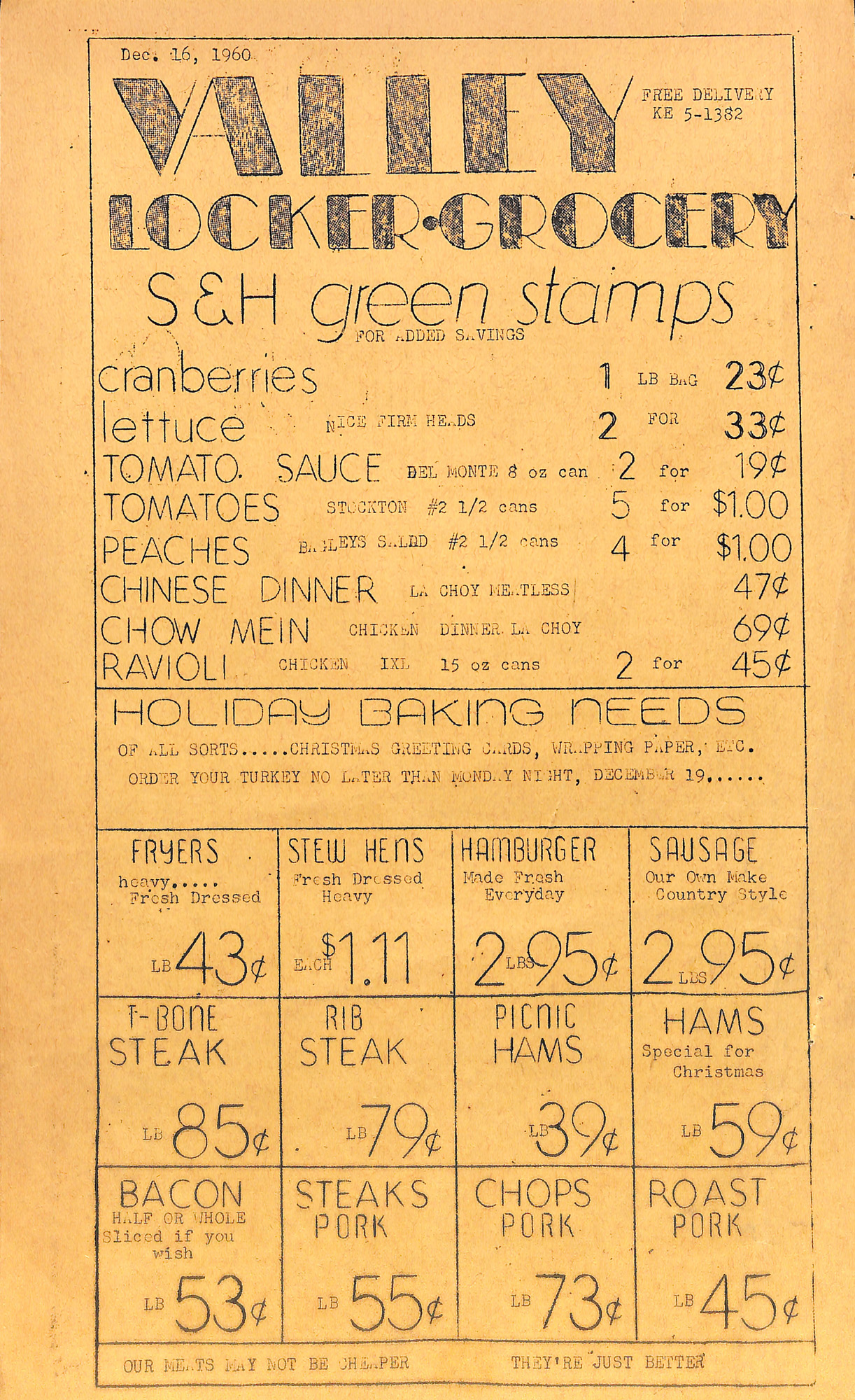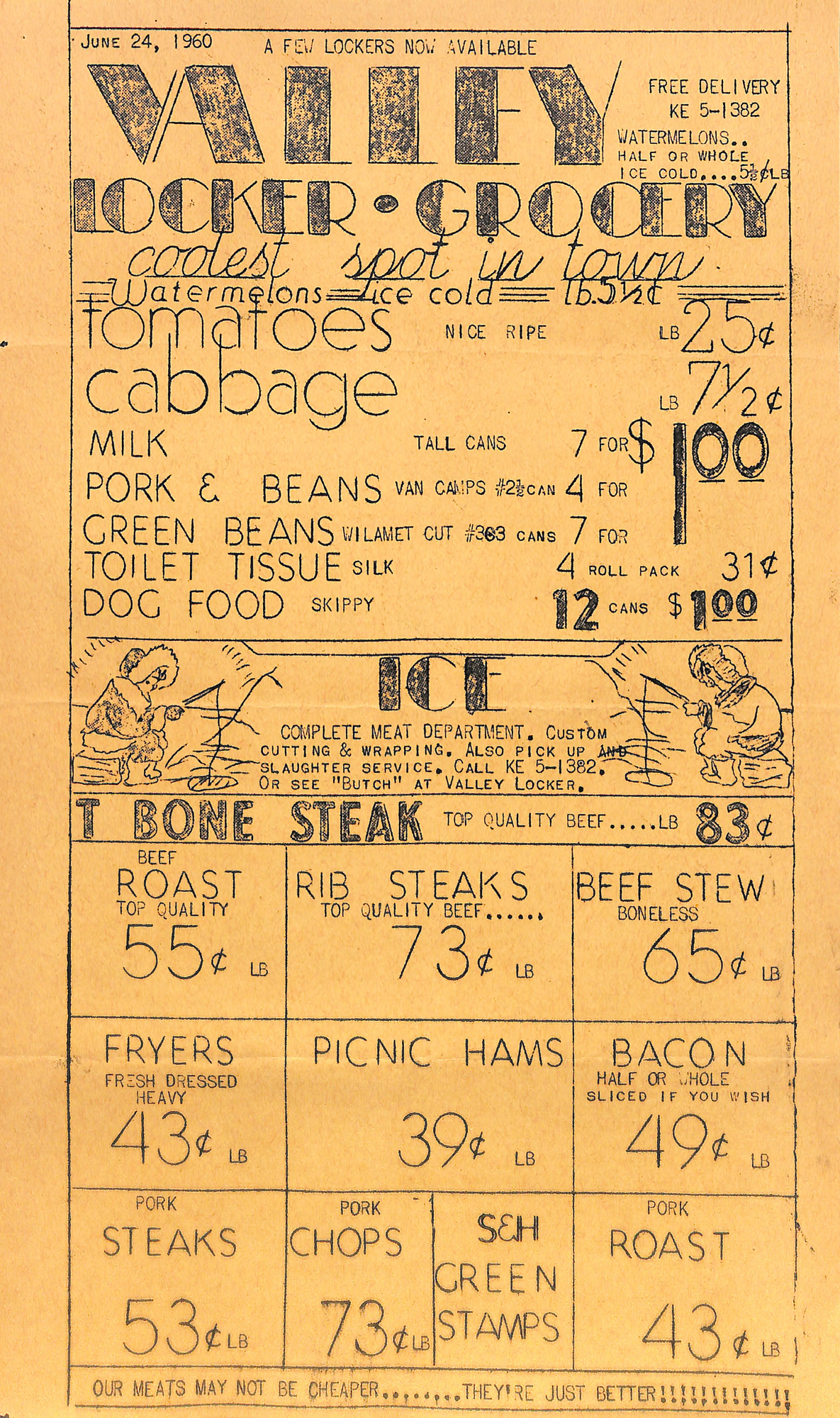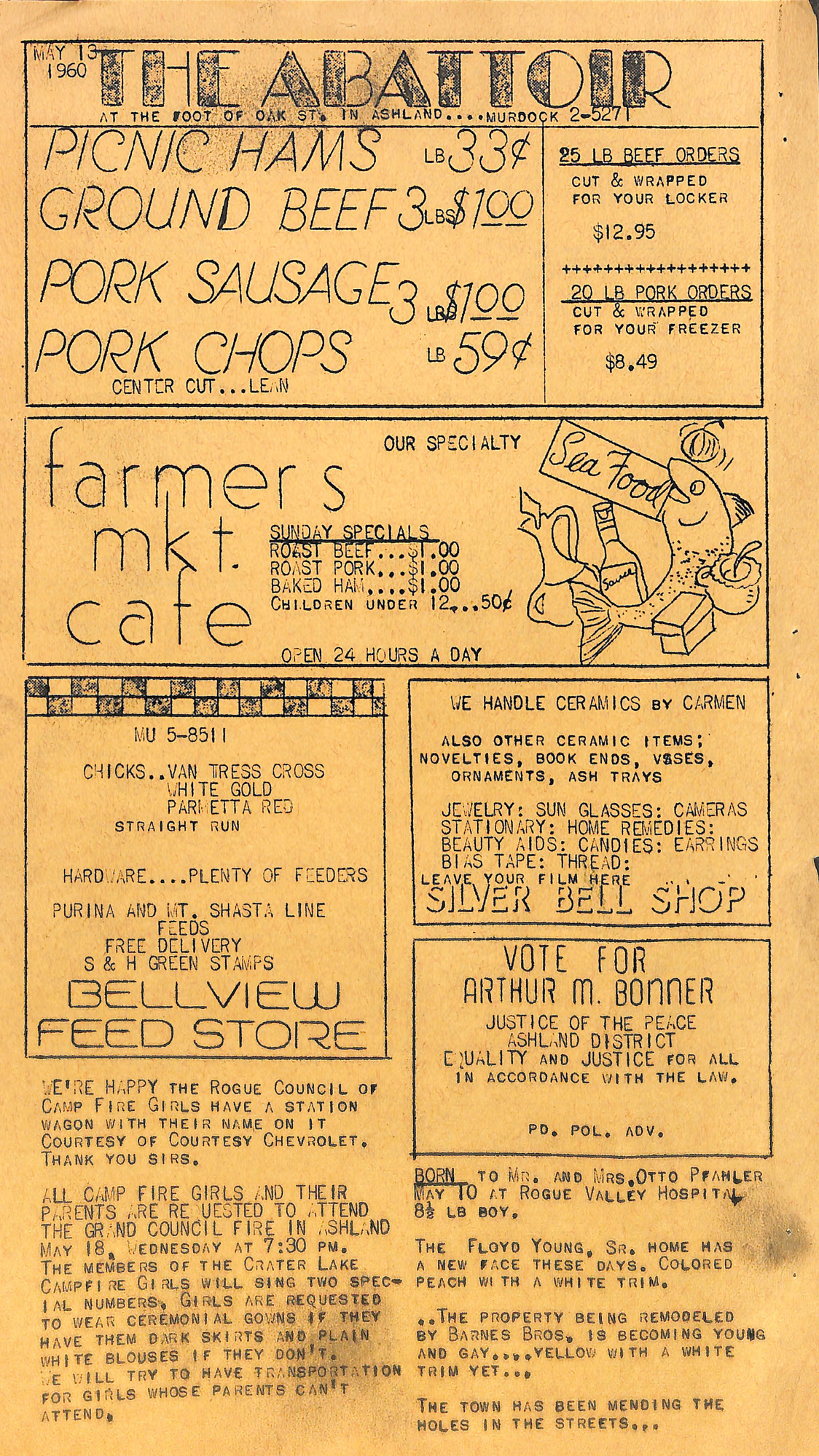 READ IT IN OUR YELLOW PAGES. EVERGREEN PRINTING SERVICE ASHLAND SANITARY SERVICE NEWS FLASHES PRINTING SERVICE STEIGER GARAGE WORK TALENT LUMBER YARD HERB'S WATCH REPAIR HARDWOOD FOR SALE STARK TREES AND SHRUBS FURNISHED APARTMENTS FOR RENT BEN'S OK NEW & 2ND HAND STORE--JANUARY SALE Page 4, full-page ad for: VALLEY LOCKER & GROCERY Page 5, ads for: DRIVE-IN CLEANERS ARLIE'S TV REPAIR SERVICE FARMER'S INSURANCE--L.H. GALLATIN UPTOWN BARBERSHOP AL GRABHER'S MOBILE FEED STORE PHOENIX INTERCITY MARKET FOR SALE--$15.00 Wards largest spring-mounted hobby horse. New $31.95. For sale $15.00 size 12 maternity wardrobe. KE 5-1015. After 5 p.m. LAST CHANCE--This is the last day for "The Tiny Gift Shop." For some real knock down prices, see Iva Tuggle at 104 S. First St. Open from 9 until 9 Friday, Dec. 16.--today, ONLY. This is my way of saying a very special "Thank You" for your patronage and for making our vacation possible. May the joy of Christmas be with you today and always.--Tiny Gift Shop BORN to Mr. and Mrs. William Reichstein, a girl named Heidi Lynn. She was born on Dec. 2, 1960 at the Ashland General Hospital. FOR SALE--80" bass accordion. Bargain for cash. Phone KE 5-2363. WOOD FOR SALE--KE 5-2231. Clarence Wienecke. Call after 5 pm. FOR SALE--6 young, white laying hens and rooster…$5.00; 1 large doe rabbit, $2.00; 1 automatic light control for 300 chicken house; 1 salmon pole and reel, hardly used, cost $45.00 for $10; 1 $30.00 International "WeedChopper," electric fence charger, good shape, $10.00. OLD HATCHERY. Phone KE 5-1215. USED LUMBER FOR SALE