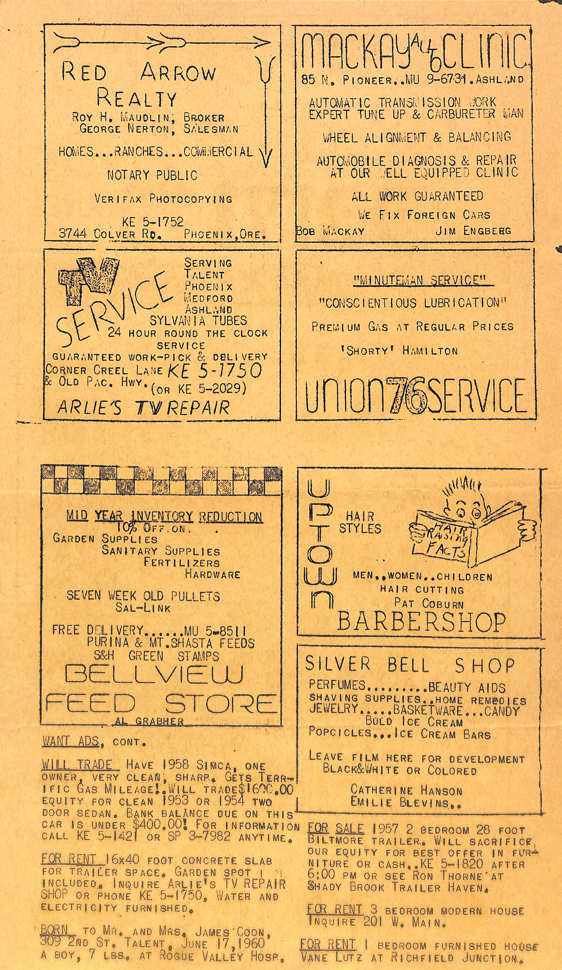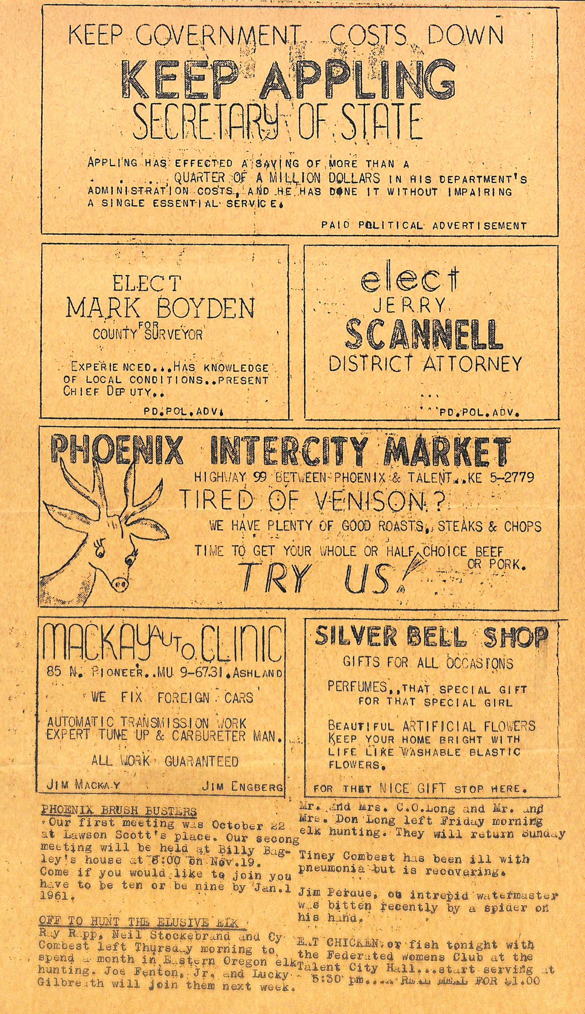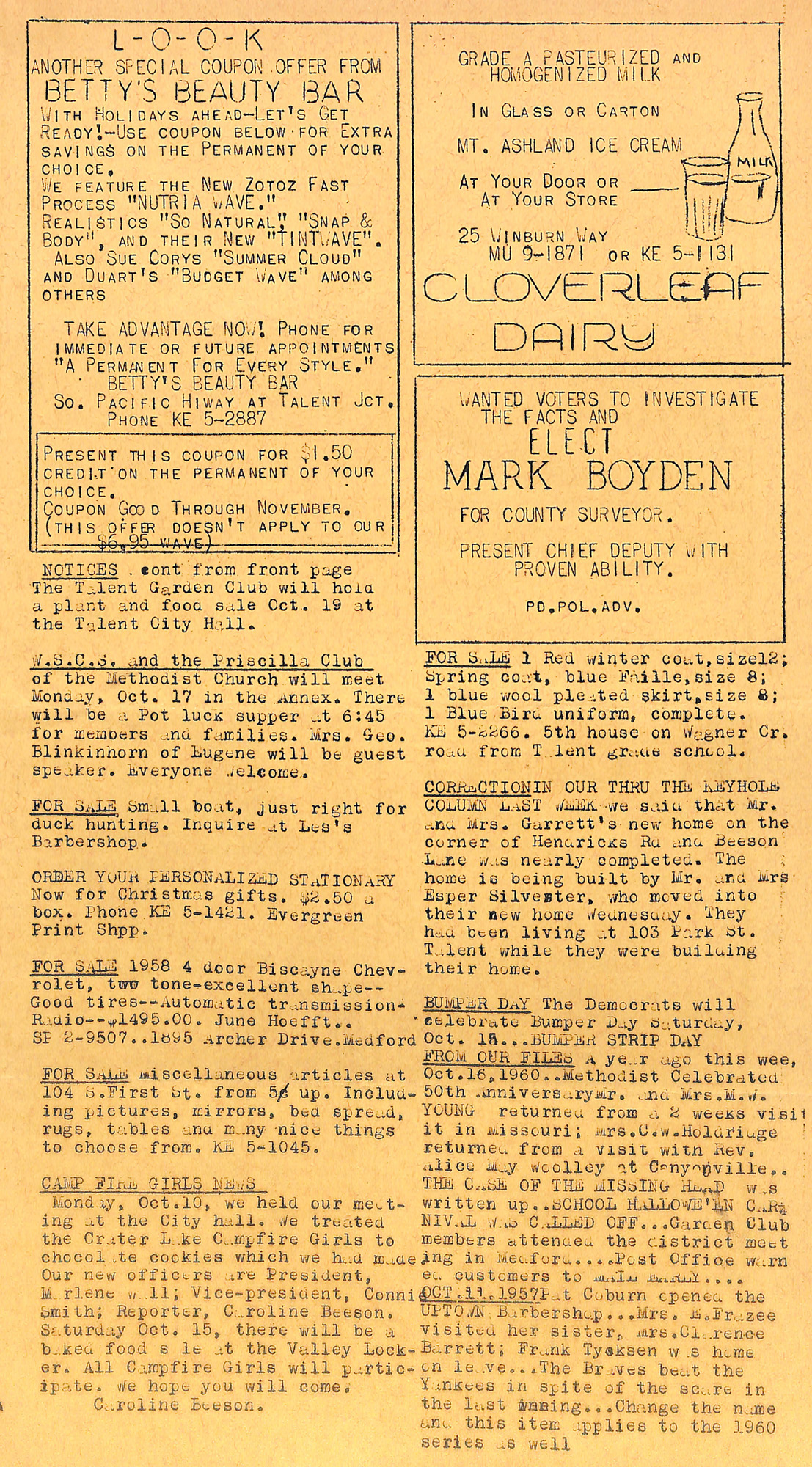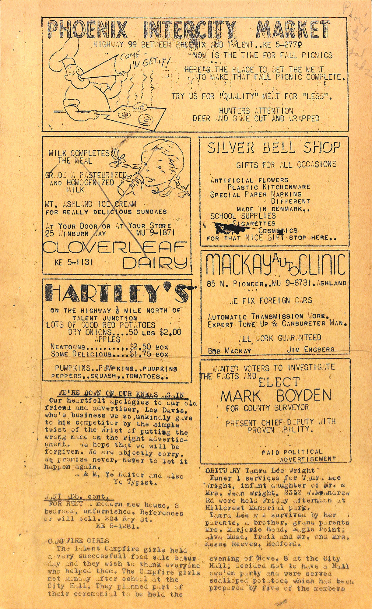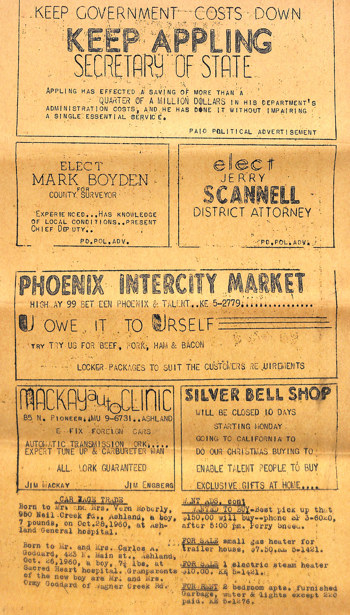 2541 Sandy Terrace, Medford, Oregon Page 4, ads for: KEEP APPLING SECRETARY OF STATE--Keep government costs down ELECT MARK BOYDEN for County Surveyor ELECT JERRY SCANNELL--District Attorney PHOENIX INTERCITY MARKET MACKAY AUTO CLINIC SILVER BELL S HOP CARRIAGE TRADE Born to Mr. and Mrs. Vern Moberly, 950 Neil Creek Rd., Ashland, a boy, 7 pounds, on Oct. 28, 1960, at Ashland General Hospital. Born to Mr. and Mrs. Carlos A. Goddard, 423 N. Main St., Ashland, Oct. 26, 1960, a boy, 7¼ lbs., at Sacred Heart Hospital. Grandparents of the new boy are Mr. and Mrs. Ormy Goddard of Wagner Creek Rd. WANT ADS cont. WANTED TO BUY--Best pickup that $150.00 will buy--phone SP 3-6020 after 5:00 pm. Perry Sneed. FOR SALE--small gas heater for trailer house. $7.50. KE 5-1421. FOR SALE--1 electric steam heater--$10.00. KE 5-1421. FOR RENT--2-bedroom apts. Furnished. Garbage, water & lights except 220 paid. KE 5-1276. Page 5, ads for: TALENT THRIFT MARKET JO'S CAFÉ LITHIA DRIVE-IN THEATER TALENT INSURANCE & REAL ESTATE We're supporting Chet Rapp in his race for the County Treasurer. Mr. Rapp is a local boy, well qualified for this position. He is a young man who we feel is competent. He is a graduate of Talent High School and Southern Oregon College. VOTE DAYLIGHT SAVINGS TIME NO