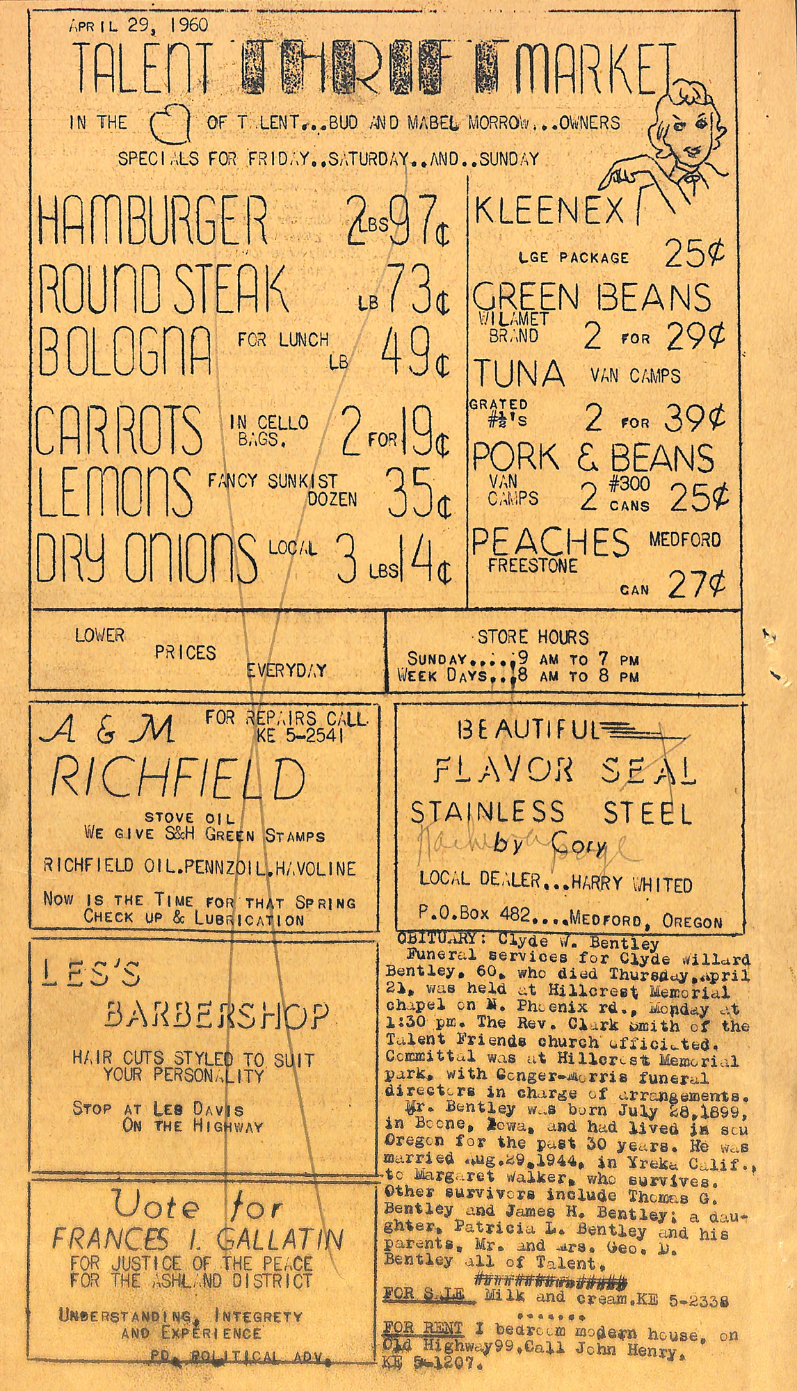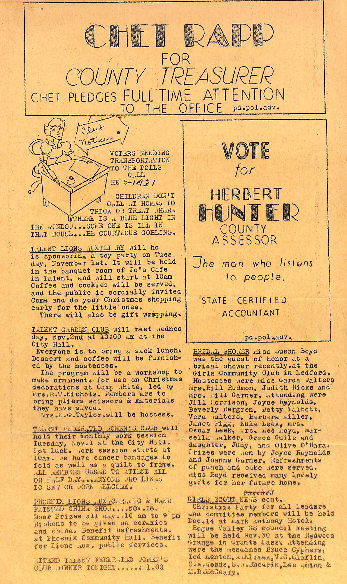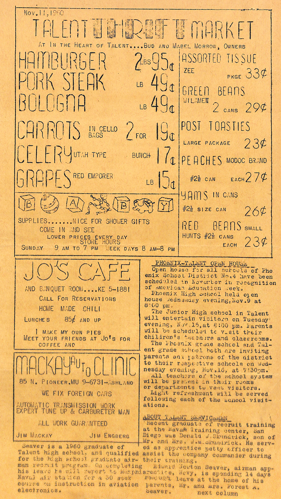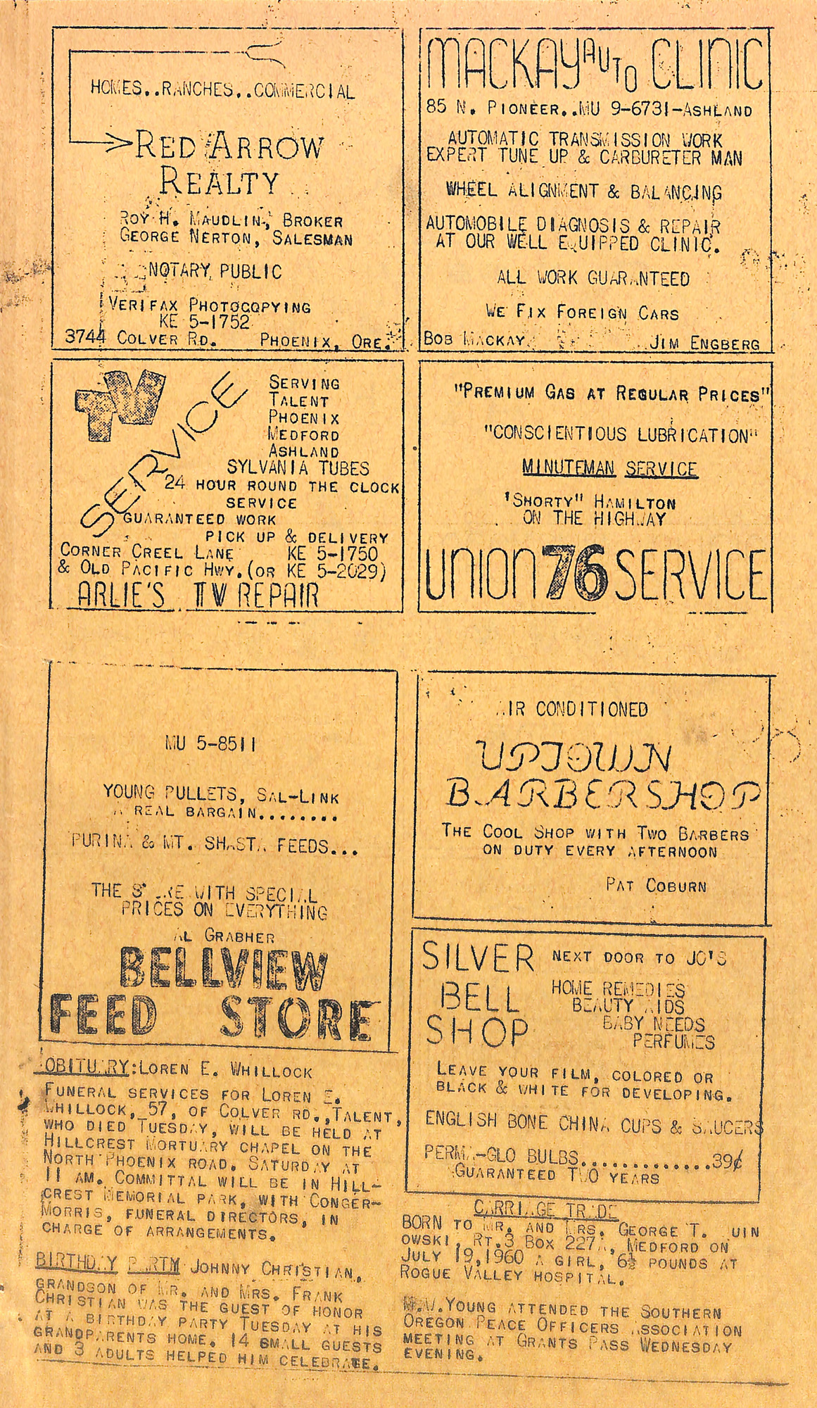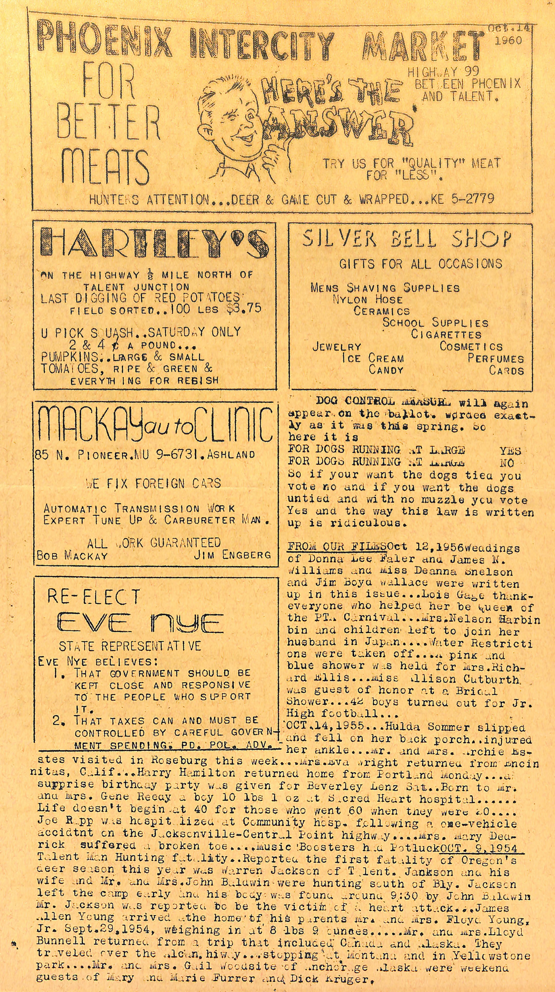 2541 Sandy Terrace, Medford, Oregon Page 4, ads for: KEEP APPLING SECRETARY OF STATE--Keep government costs down ELECT MARK BOYDEN for County Surveyor ELECT JERRY SCANNELL--District Attorney PHOENIX INTERCITY MARKET MACKAY AUTO CLINIC SILVER BELL S HOP CARRIAGE TRADE Born to Mr. and Mrs. Vern Moberly, 950 Neil Creek Rd., Ashland, a boy, 7 pounds, on Oct. 28, 1960, at Ashland General Hospital. Born to Mr. and Mrs. Carlos A. Goddard, 423 N. Main St., Ashland, Oct. 26, 1960, a boy, 7¼ lbs., at Sacred Heart Hospital. Grandparents of the new boy are Mr. and Mrs. Ormy Goddard of Wagner Creek Rd. WANT ADS cont. WANTED TO BUY--Best pickup that $150.00 will buy--phone SP 3-6020 after 5:00 pm. Perry Sneed. FOR SALE--small gas heater for trailer house. $7.50. KE 5-1421. FOR SALE--1 electric steam heater--$10.00. KE 5-1421. FOR RENT--2-bedroom apts. Furnished. Garbage, water & lights except 220 paid. KE 5-1276. Page 5, ads for: TALENT THRIFT MARKET JO'S CAFÉ LITHIA DRIVE-IN THEATER TALENT INSURANCE & REAL ESTATE We're supporting Chet Rapp in his race for the County Treasurer. Mr. Rapp is a local boy, well qualified for this position. He is a young man who we feel is competent. He is a graduate of Talent High School and Southern Oregon College. VOTE DAYLIGHT SAVINGS TIME NO