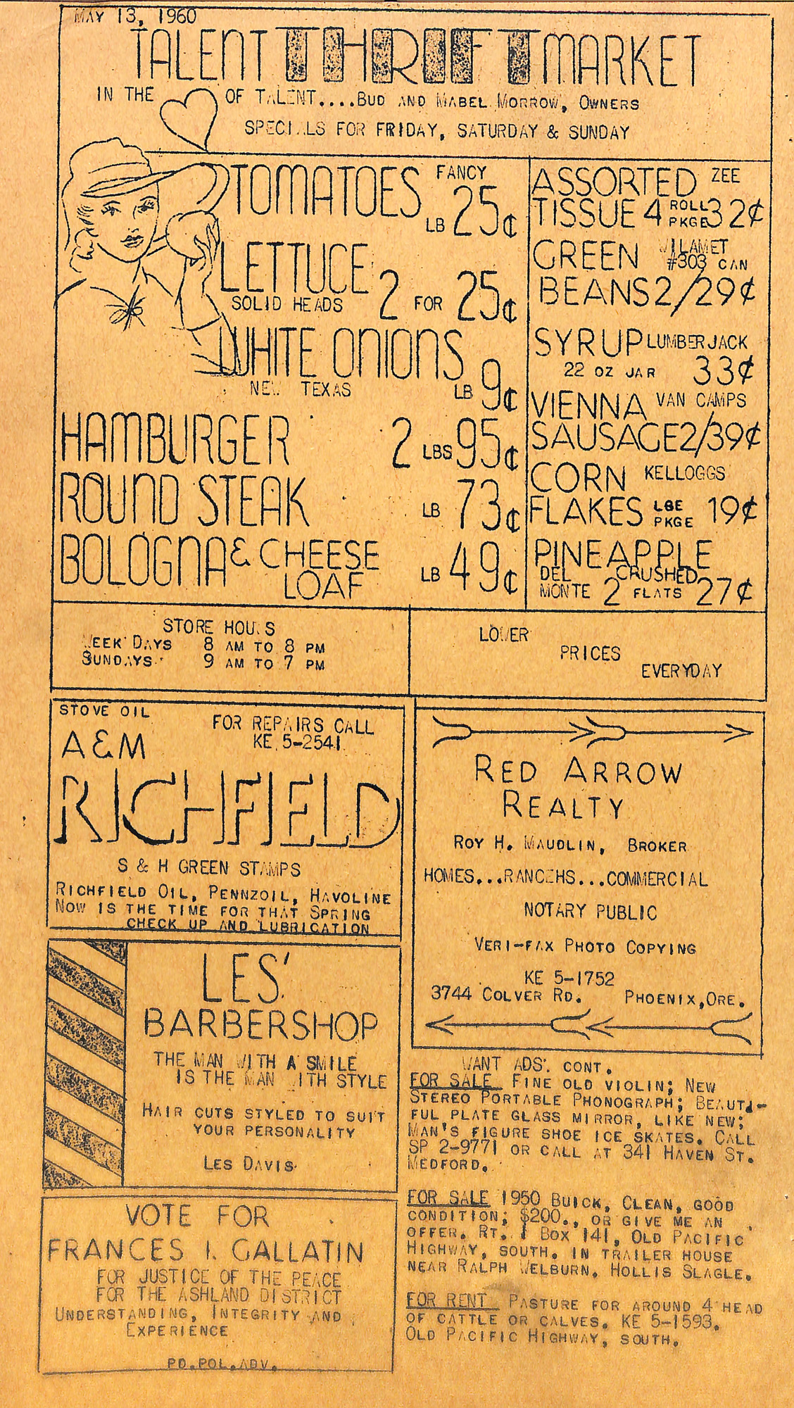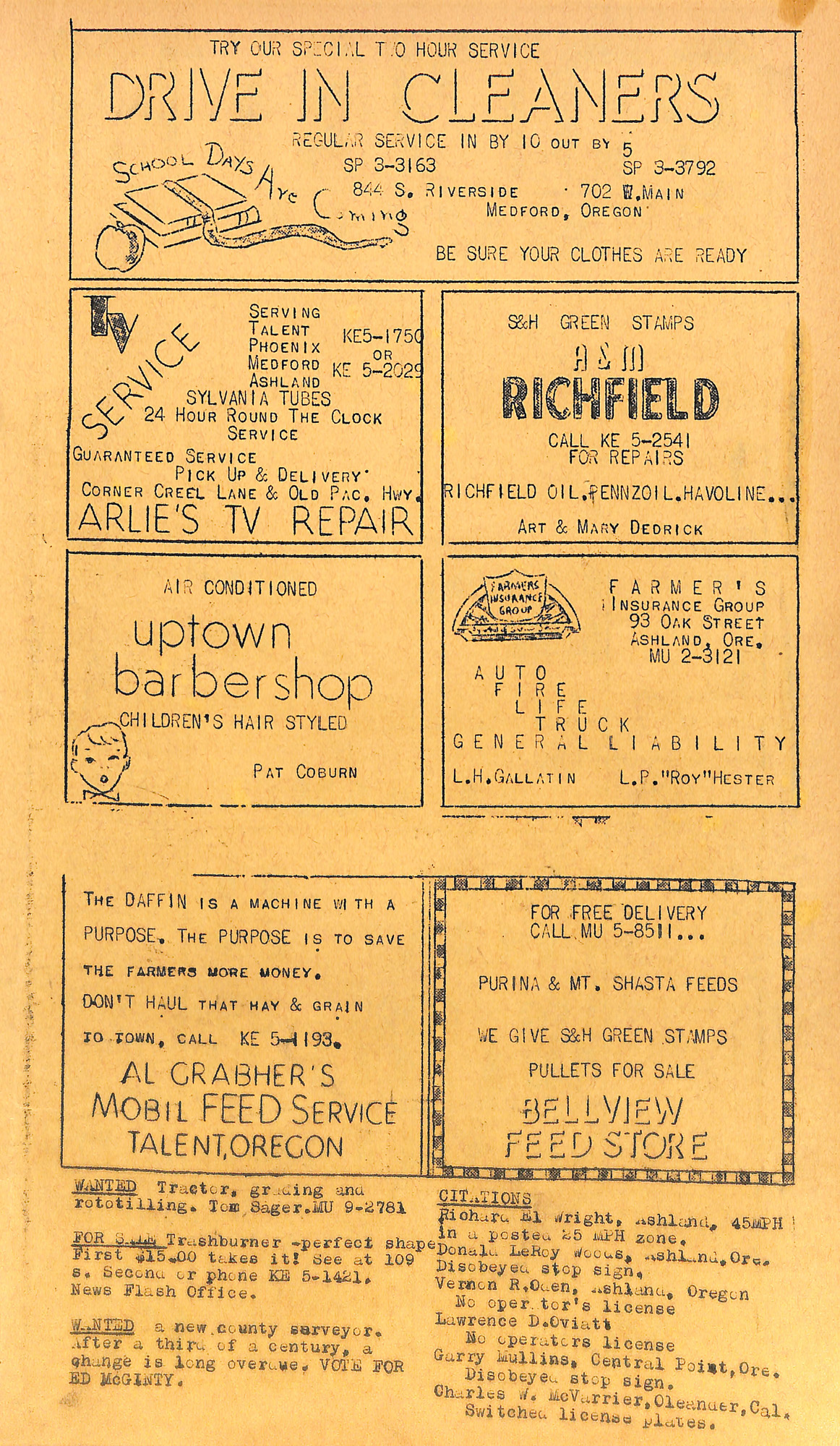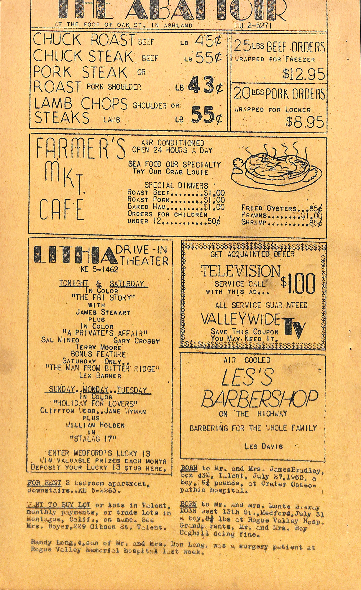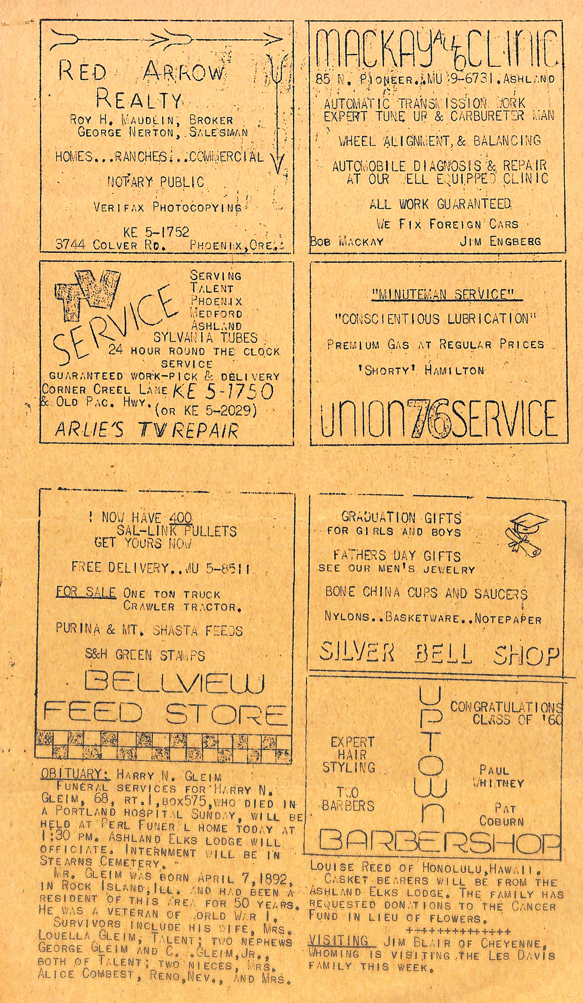 2541 Sandy Terrace, Medford, Oregon Page 4, ads for: KEEP APPLING SECRETARY OF STATE--Keep government costs down ELECT MARK BOYDEN for County Surveyor ELECT JERRY SCANNELL--District Attorney PHOENIX INTERCITY MARKET MACKAY AUTO CLINIC SILVER BELL S HOP CARRIAGE TRADE Born to Mr. and Mrs. Vern Moberly, 950 Neil Creek Rd., Ashland, a boy, 7 pounds, on Oct. 28, 1960, at Ashland General Hospital. Born to Mr. and Mrs. Carlos A. Goddard, 423 N. Main St., Ashland, Oct. 26, 1960, a boy, 7¼ lbs., at Sacred Heart Hospital. Grandparents of the new boy are Mr. and Mrs. Ormy Goddard of Wagner Creek Rd. WANT ADS cont. WANTED TO BUY--Best pickup that $150.00 will buy--phone SP 3-6020 after 5:00 pm. Perry Sneed. FOR SALE--small gas heater for trailer house. $7.50. KE 5-1421. FOR SALE--1 electric steam heater--$10.00. KE 5-1421. FOR RENT--2-bedroom apts. Furnished. Garbage, water & lights except 220 paid. KE 5-1276. Page 5, ads for: TALENT THRIFT MARKET JO'S CAFÉ LITHIA DRIVE-IN THEATER TALENT INSURANCE & REAL ESTATE We're supporting Chet Rapp in his race for the County Treasurer. Mr. Rapp is a local boy, well qualified for this position. He is a young man who we feel is competent. He is a graduate of Talent High School and Southern Oregon College. VOTE DAYLIGHT SAVINGS TIME NO