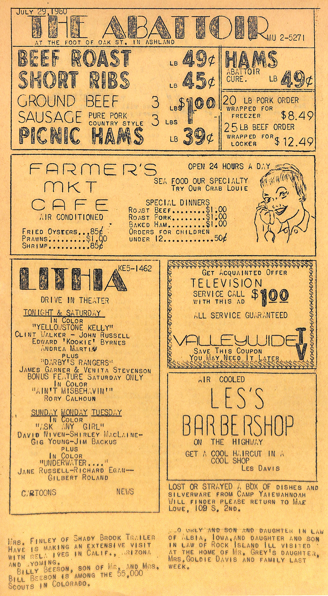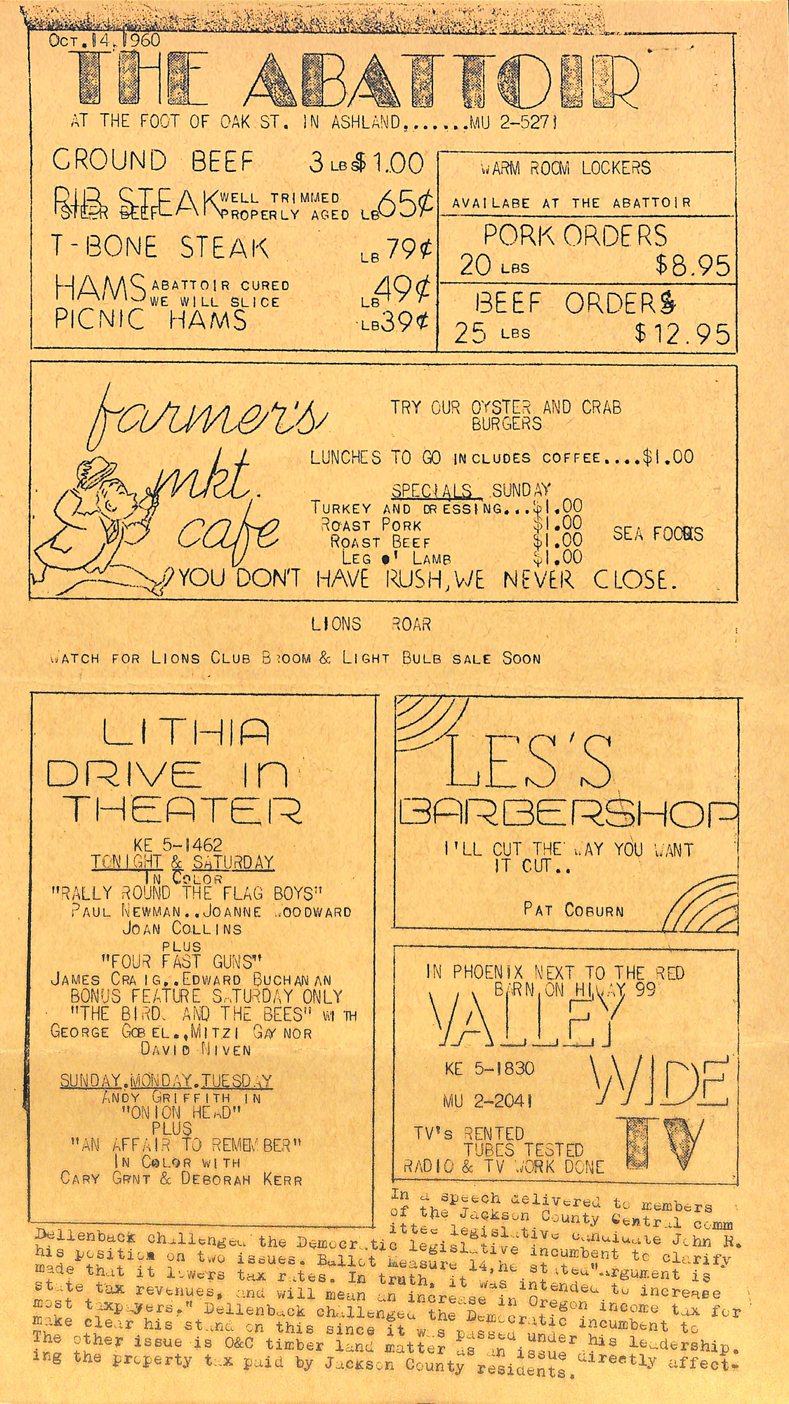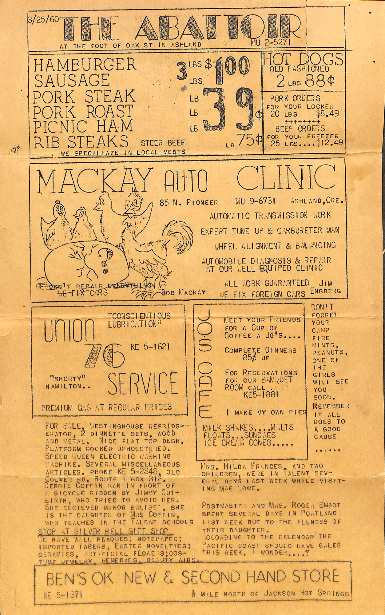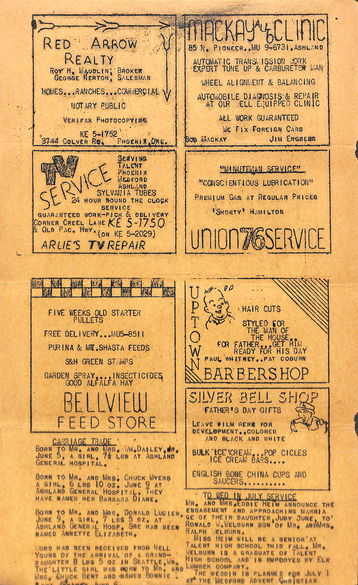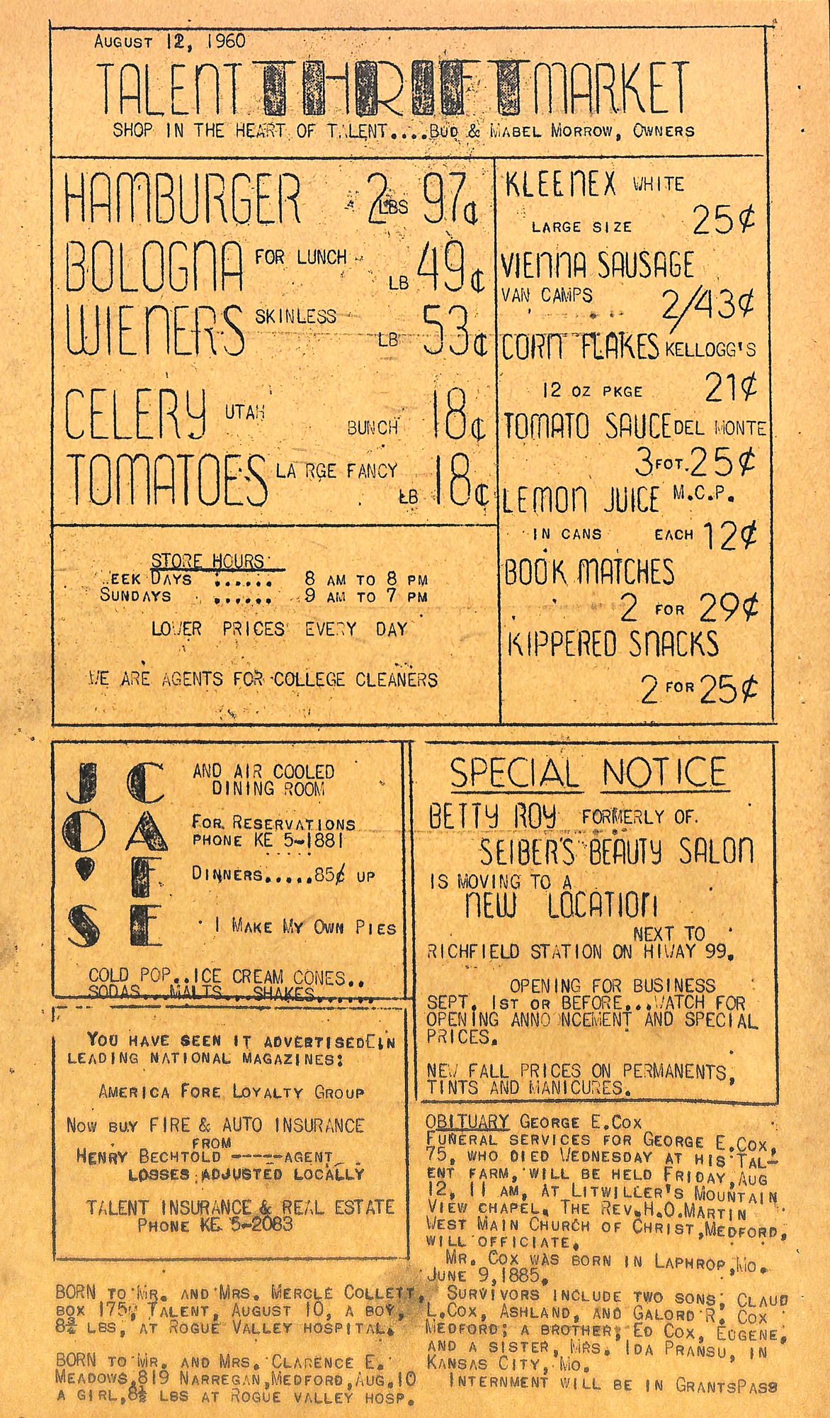 2541 Sandy Terrace, Medford, Oregon Page 4, ads for: KEEP APPLING SECRETARY OF STATE--Keep government costs down ELECT MARK BOYDEN for County Surveyor ELECT JERRY SCANNELL--District Attorney PHOENIX INTERCITY MARKET MACKAY AUTO CLINIC SILVER BELL S HOP CARRIAGE TRADE Born to Mr. and Mrs. Vern Moberly, 950 Neil Creek Rd., Ashland, a boy, 7 pounds, on Oct. 28, 1960, at Ashland General Hospital. Born to Mr. and Mrs. Carlos A. Goddard, 423 N. Main St., Ashland, Oct. 26, 1960, a boy, 7¼ lbs., at Sacred Heart Hospital. Grandparents of the new boy are Mr. and Mrs. Ormy Goddard of Wagner Creek Rd. WANT ADS cont. WANTED TO BUY--Best pickup that $150.00 will buy--phone SP 3-6020 after 5:00 pm. Perry Sneed. FOR SALE--small gas heater for trailer house. $7.50. KE 5-1421. FOR SALE--1 electric steam heater--$10.00. KE 5-1421. FOR RENT--2-bedroom apts. Furnished. Garbage, water & lights except 220 paid. KE 5-1276. Page 5, ads for: TALENT THRIFT MARKET JO'S CAFÉ LITHIA DRIVE-IN THEATER TALENT INSURANCE & REAL ESTATE We're supporting Chet Rapp in his race for the County Treasurer. Mr. Rapp is a local boy, well qualified for this position. He is a young man who we feel is competent. He is a graduate of Talent High School and Southern Oregon College. VOTE DAYLIGHT SAVINGS TIME NO