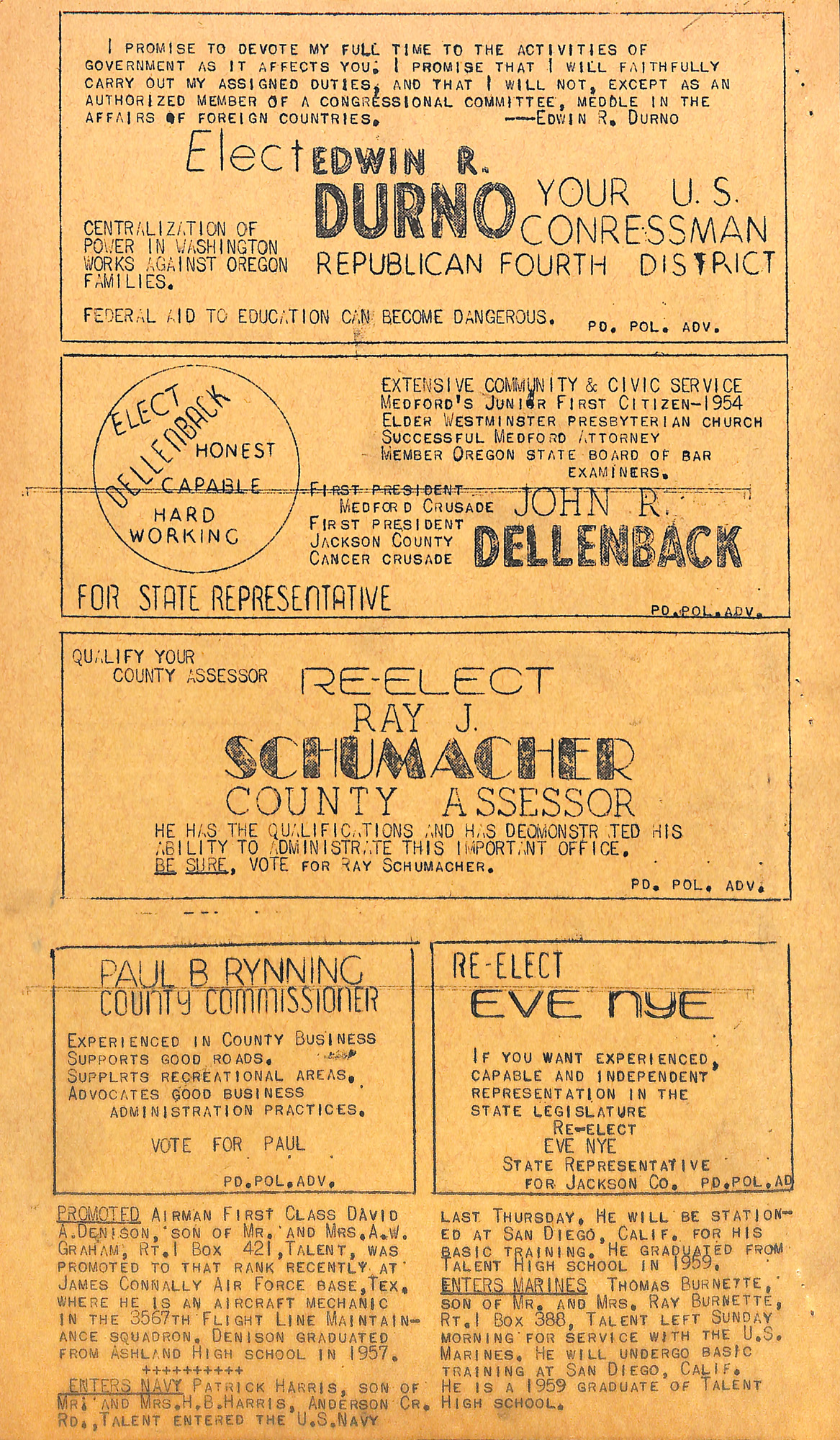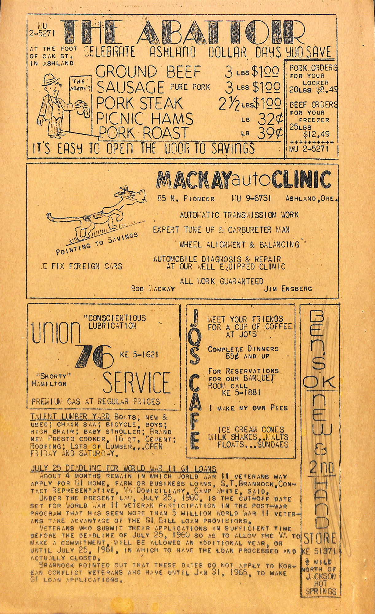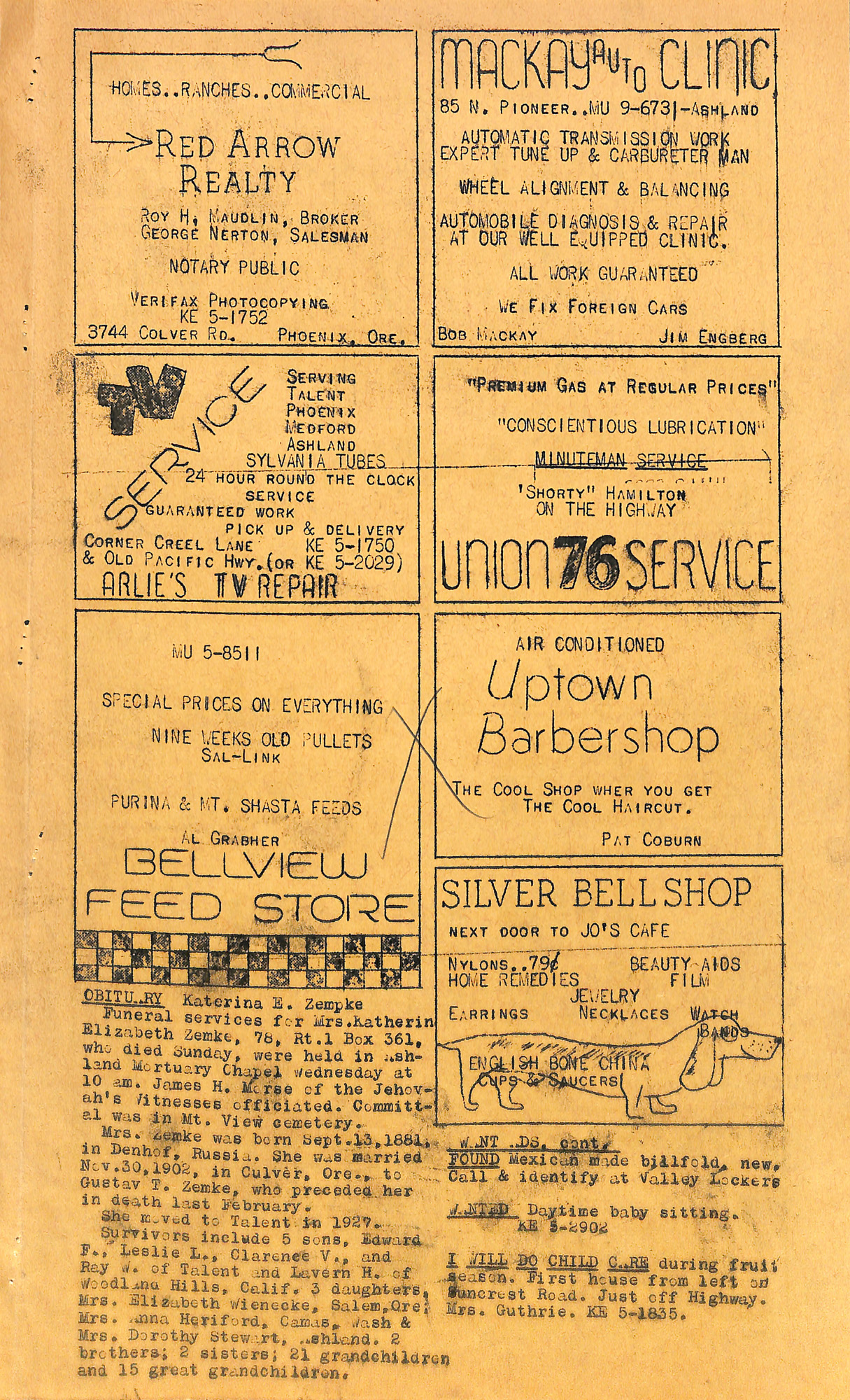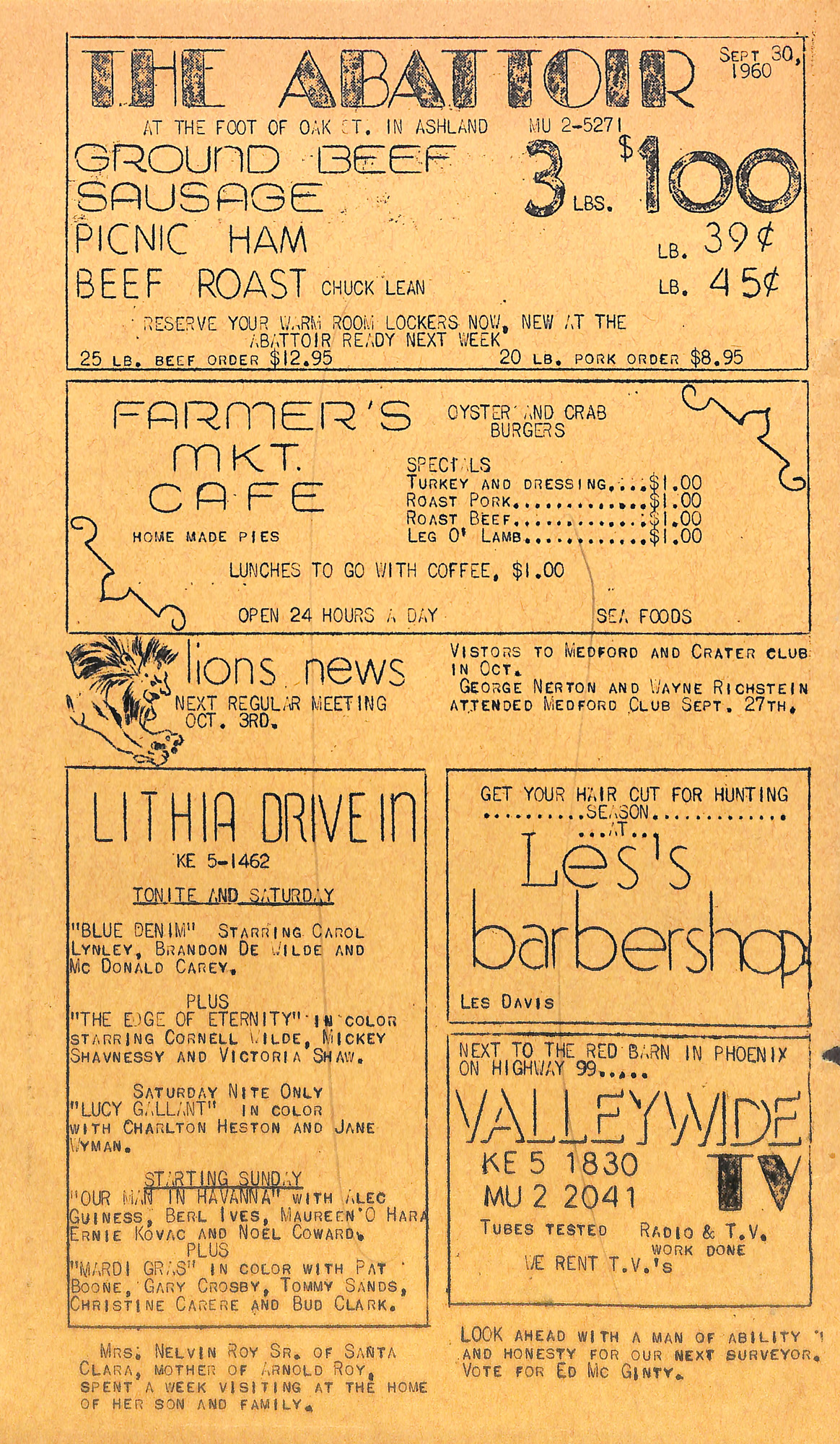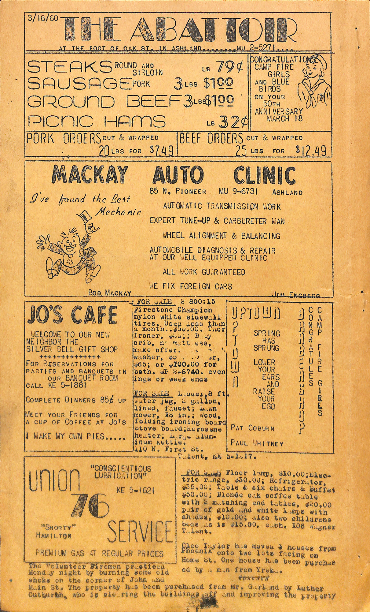 2541 Sandy Terrace, Medford, Oregon Page 4, ads for: KEEP APPLING SECRETARY OF STATE--Keep government costs down ELECT MARK BOYDEN for County Surveyor ELECT JERRY SCANNELL--District Attorney PHOENIX INTERCITY MARKET MACKAY AUTO CLINIC SILVER BELL S HOP CARRIAGE TRADE Born to Mr. and Mrs. Vern Moberly, 950 Neil Creek Rd., Ashland, a boy, 7 pounds, on Oct. 28, 1960, at Ashland General Hospital. Born to Mr. and Mrs. Carlos A. Goddard, 423 N. Main St., Ashland, Oct. 26, 1960, a boy, 7¼ lbs., at Sacred Heart Hospital. Grandparents of the new boy are Mr. and Mrs. Ormy Goddard of Wagner Creek Rd. WANT ADS cont. WANTED TO BUY--Best pickup that $150.00 will buy--phone SP 3-6020 after 5:00 pm. Perry Sneed. FOR SALE--small gas heater for trailer house. $7.50. KE 5-1421. FOR SALE--1 electric steam heater--$10.00. KE 5-1421. FOR RENT--2-bedroom apts. Furnished. Garbage, water & lights except 220 paid. KE 5-1276. Page 5, ads for: TALENT THRIFT MARKET JO'S CAFÉ LITHIA DRIVE-IN THEATER TALENT INSURANCE & REAL ESTATE We're supporting Chet Rapp in his race for the County Treasurer. Mr. Rapp is a local boy, well qualified for this position. He is a young man who we feel is competent. He is a graduate of Talent High School and Southern Oregon College. VOTE DAYLIGHT SAVINGS TIME NO