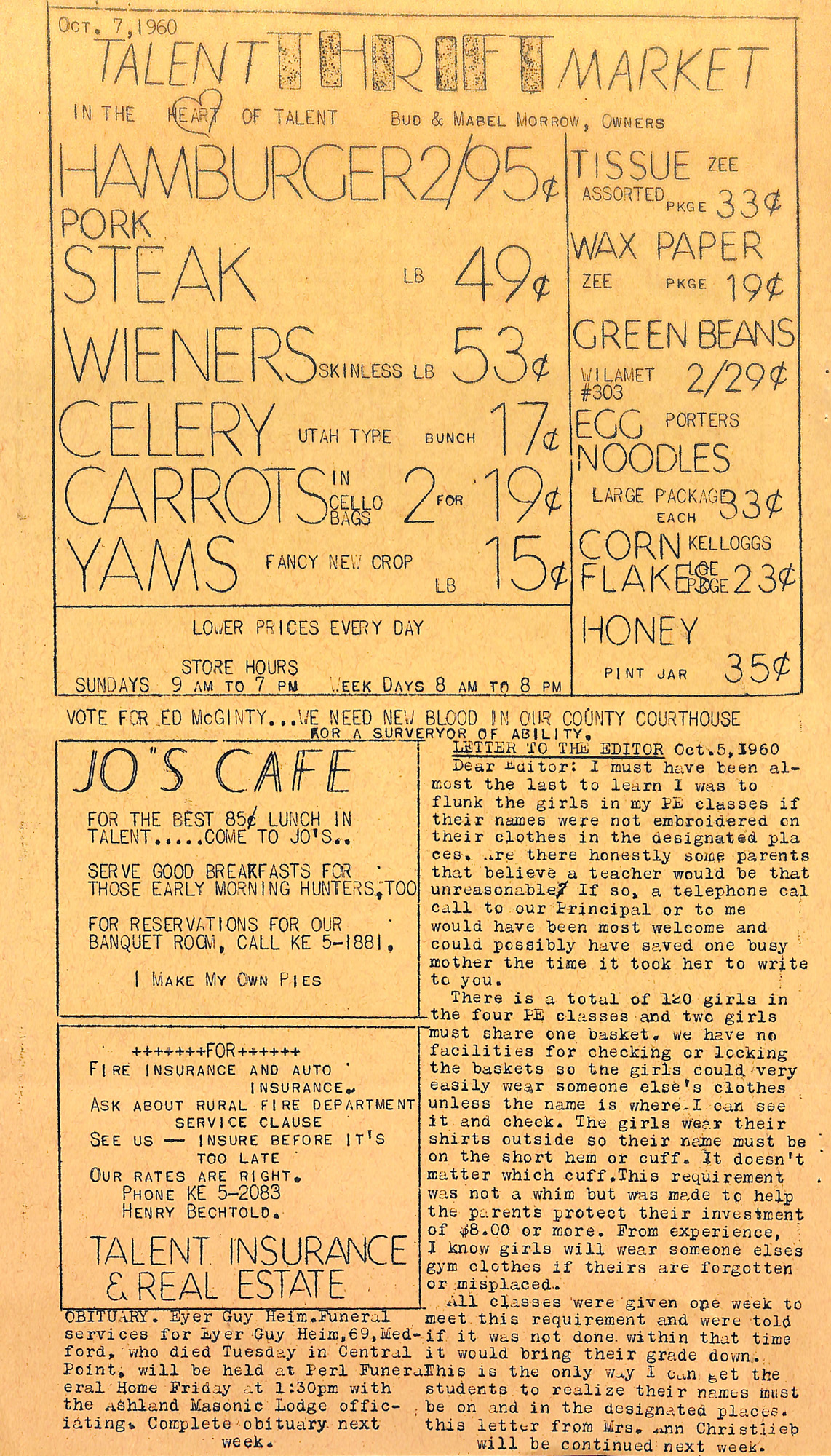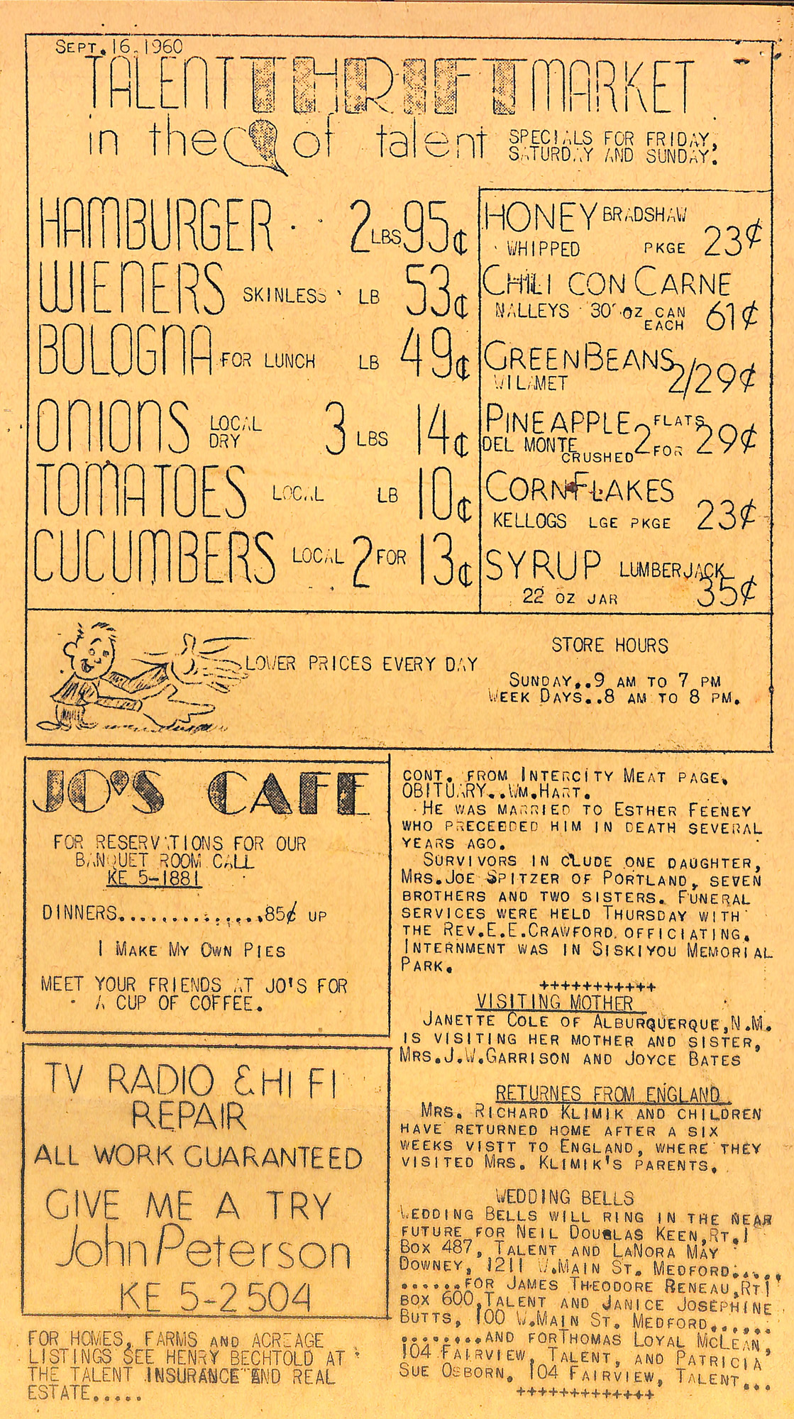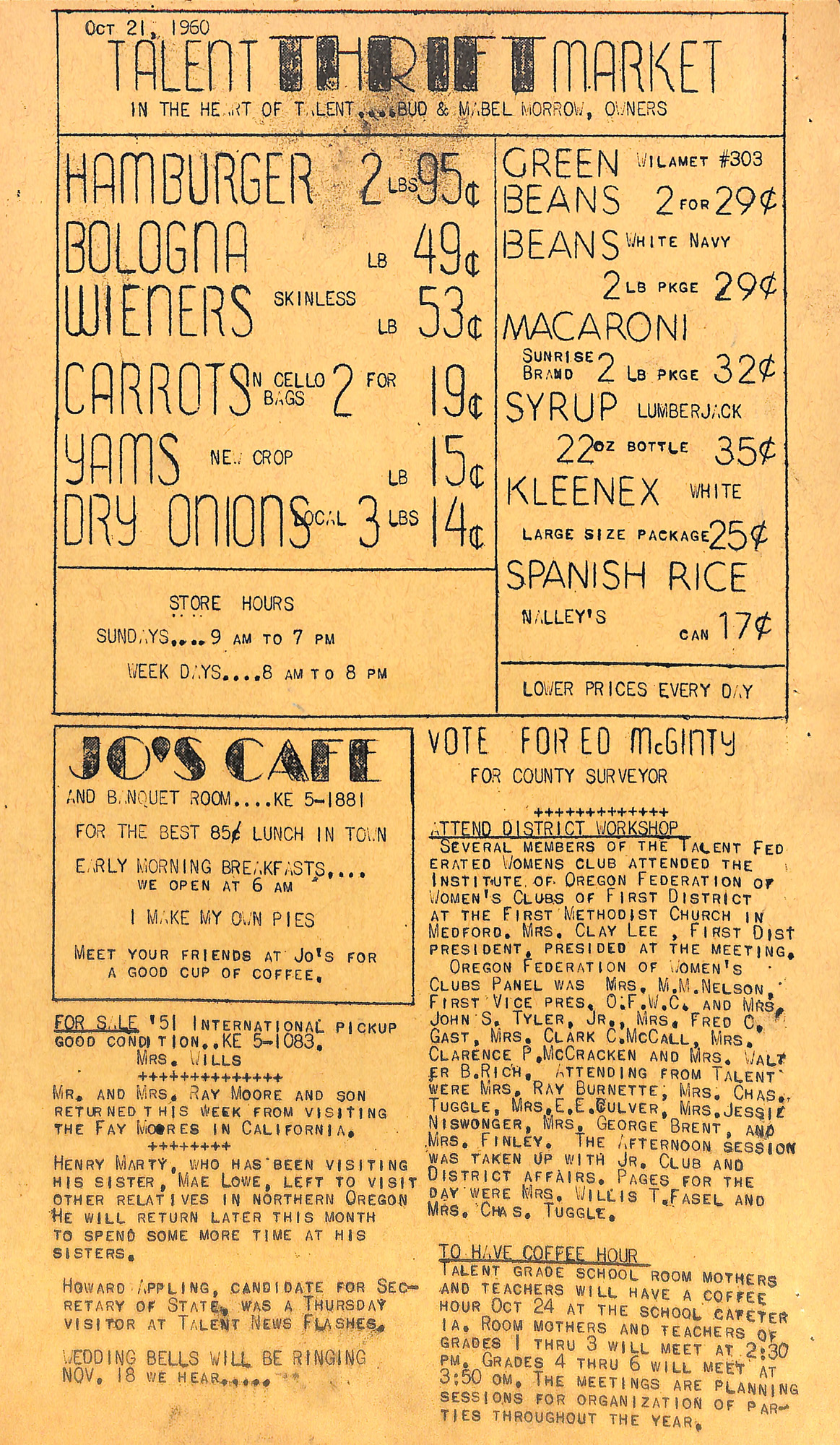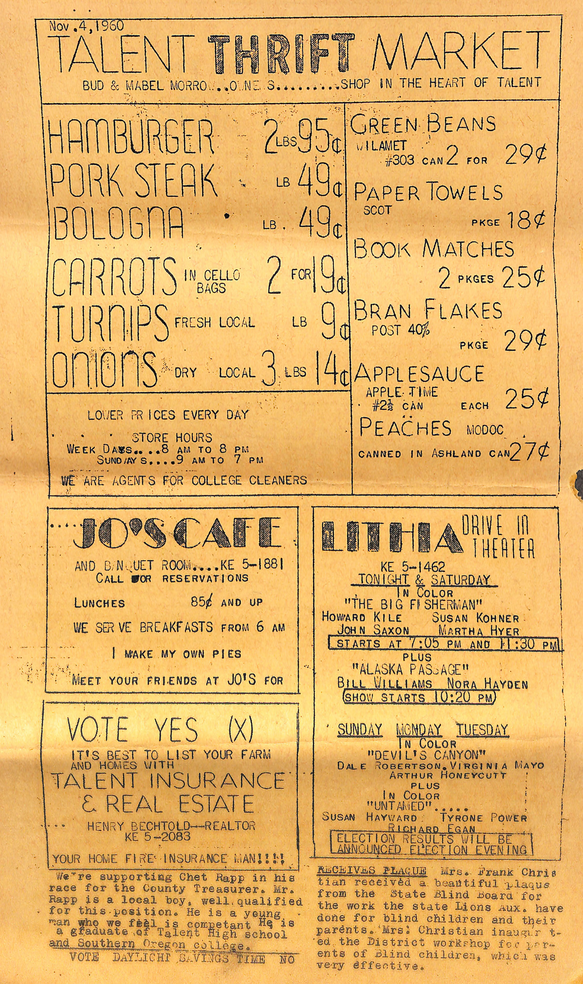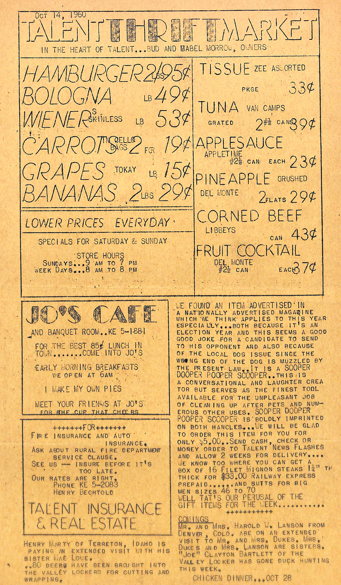 you qualify, phone KE 5-1742.CHICKEN DINNER…$1.00 The Talent Federated Women's Club are sponsoring a chicken dinner Friday, October 28, at the Talent City Hall. They will start serving at 6 pm. A good meal topped off with homemade pie….Chicken and biscuits and all the trimmings. Come out and help the ladies earn the money needed to purchase Camp Ya-ie-wah-noah and other public services. TO START COMMUNITY WELCOME Members of the Talent Federated Women's Club will put into effect a Community Welcome program starting Nov. 1st with the assistance of the merchants of the area. Businesses which are supporting the program will have a Business Sponsor card in their window. The ladies will call on new families in the town, Wagner Creek, Anderson Cr. and a two-mile radius. They will give the newcomers gift cards to be presented to the merchant donating the gift as well as a directory of the local service clubs and churches. If you have a new neighbor, help her get a gift by calling KE 5-1421. TEACHERS ATTEND INSTITUTE Six teachers attended a mathematics and science institute held at Oregon State College Oct. 11. Science teachers Donald Mitchell and John Cessnum of PHS, Marvin Williams of Talent Jr. High and Gladys Sloan of Phoenix grade school attended the science meetings. Mildred James, PHS, and George Zickefoose, Talent grade school, attended the mathematics meetings. The institute is sponsored by the School of Education of Oregon State College. Sixteen authorities on the teaching of science and mathematics conducted the meetings. Some 700 teachers attended the special one-day training institute. Page 2, ads for: THE ABATTOIR FARMER'S MARKET CAFÉ TALENT INSURANCE & REAL ESTATE LITHIA DRIVE-IN THEATER LIONS CLUB BROOM AND LIGHT BULB SALE COMING SOON FROM OUR FILES, Oct. 24, 1958 NEW TOWN CHARTER was at the Recorder's office…Dean Blackburn of Snappy Service underwent major surgery…SaDonna Tipton broke her arm…Ladies of the Friends Church held a kitchen shower and pot luck dinner….January thaw…3-act comedy was put on by the high school…We looked at Frank Christian's record…Brownies held an investiture…CFG elected officers…21 Lions Aux. members met…the question was asked if any Talent organizations was going to sponsor a party on Hallowe'en for the younger children…. OCT. 17, 1960 [sic]…PTA CARNIVAL HUGE SUCCESS…The streets were striped…Boxing Club met…The Junior Class Bonfire material was set fire to a little previously…Mrs. Chas. Holdridge fell Tuesday and broke her hip…Bluebirds visited the Jacksonville museum…Machinery and burner at Talent mill were removed…Mr. and Mrs. Keith Thoreson left for Portland. ATTEND THE CHICKEN