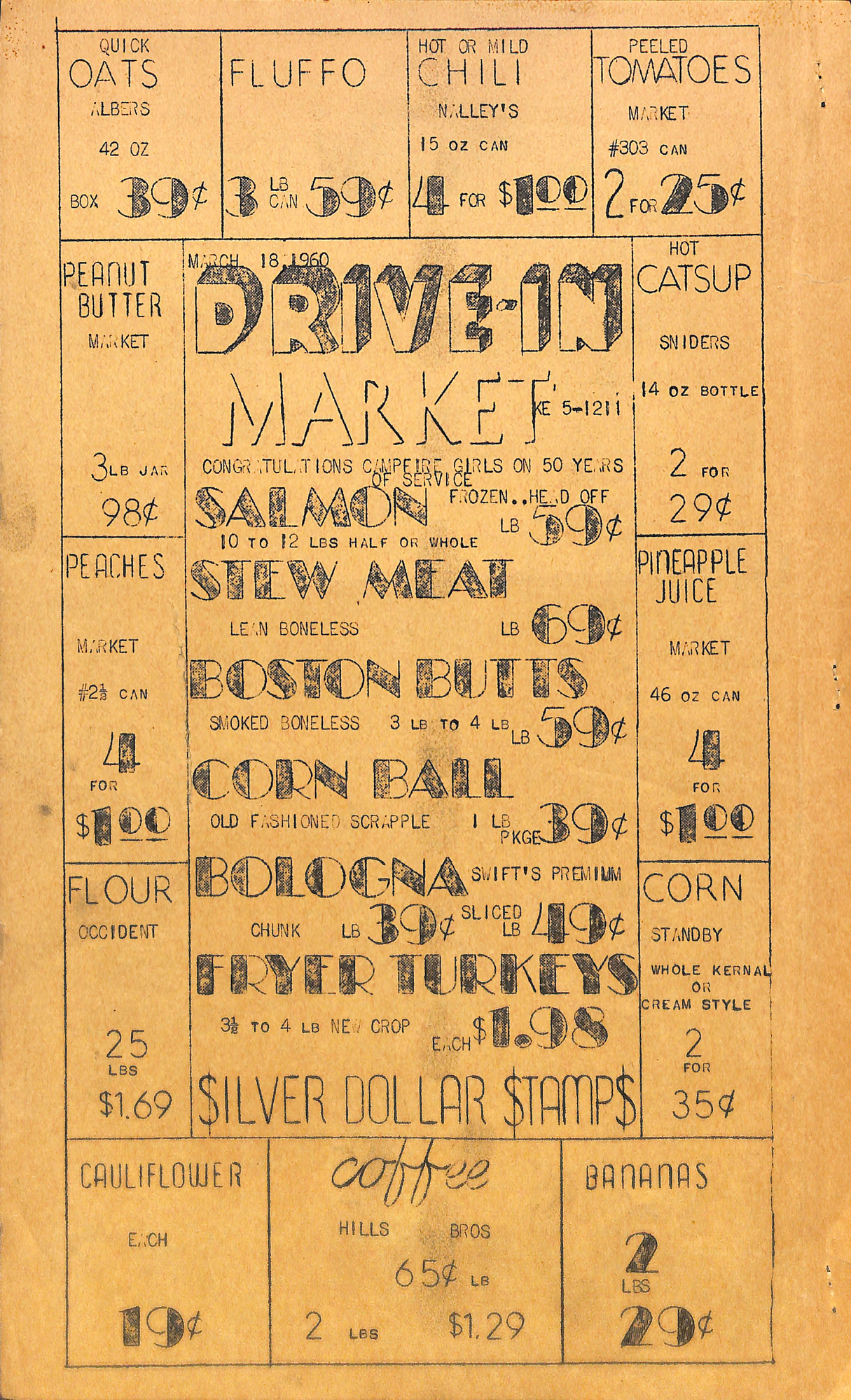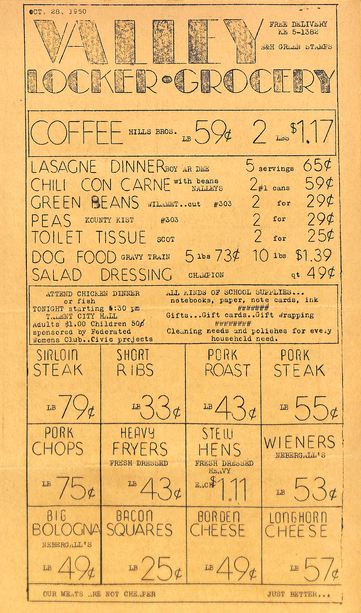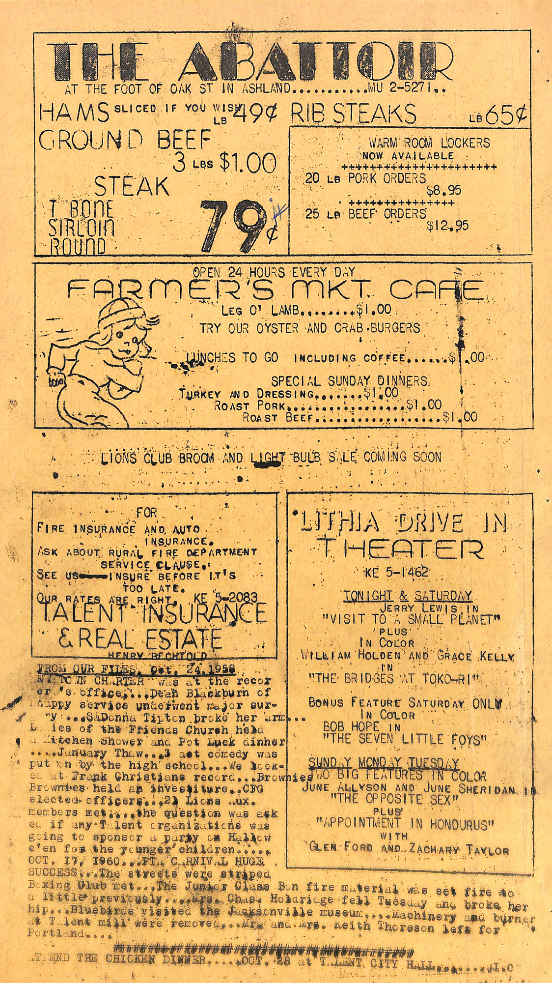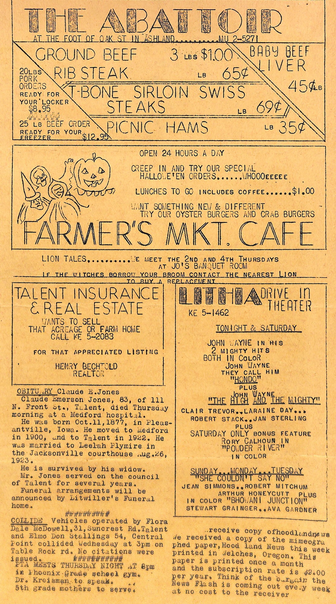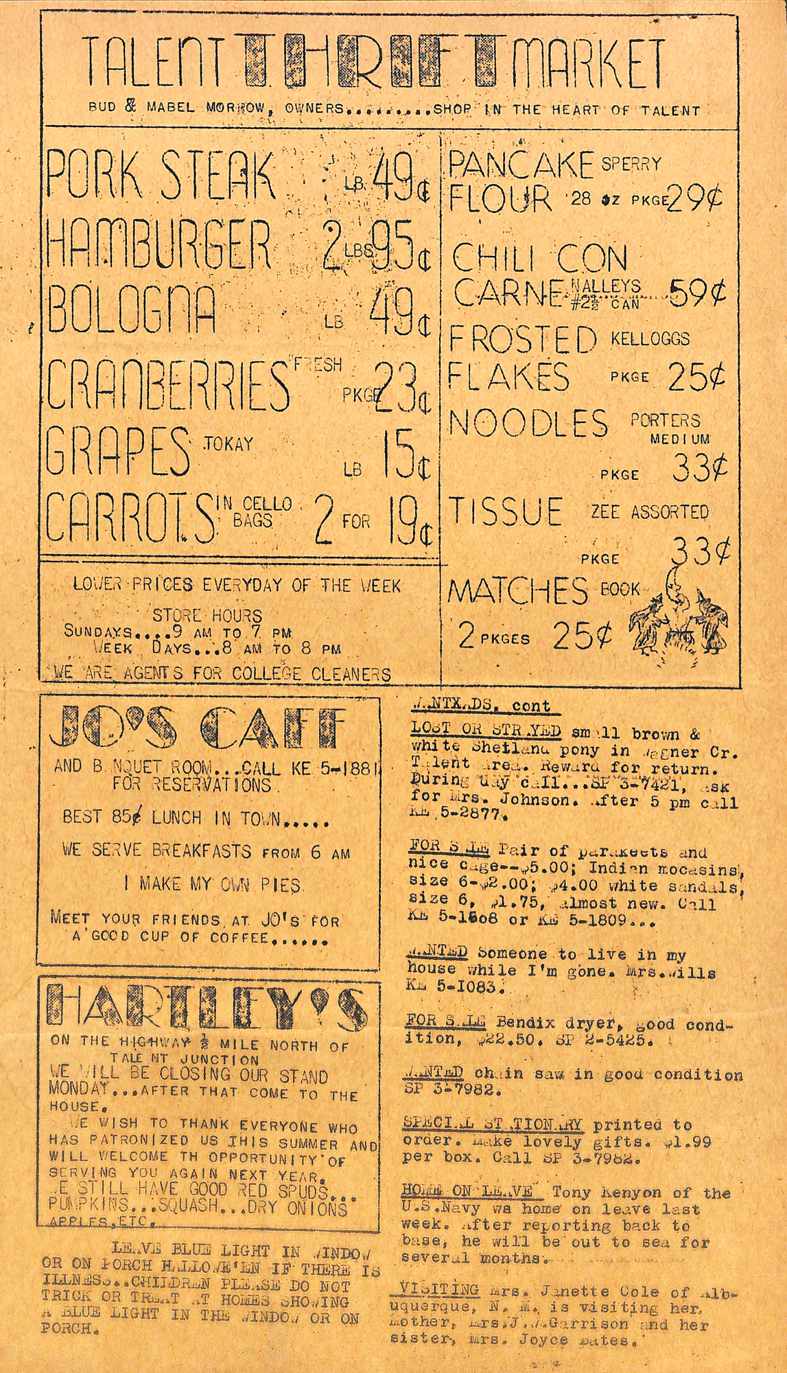 you qualify, phone KE 5-1742.CHICKEN DINNER…$1.00 The Talent Federated Women's Club are sponsoring a chicken dinner Friday, October 28, at the Talent City Hall. They will start serving at 6 pm. A good meal topped off with homemade pie….Chicken and biscuits and all the trimmings. Come out and help the ladies earn the money needed to purchase Camp Ya-ie-wah-noah and other public services. TO START COMMUNITY WELCOME Members of the Talent Federated Women's Club will put into effect a Community Welcome program starting Nov. 1st with the assistance of the merchants of the area. Businesses which are supporting the program will have a Business Sponsor card in their window. The ladies will call on new families in the town, Wagner Creek, Anderson Cr. and a two-mile radius. They will give the newcomers gift cards to be presented to the merchant donating the gift as well as a directory of the local service clubs and churches. If you have a new neighbor, help her get a gift by calling KE 5-1421. TEACHERS ATTEND INSTITUTE Six teachers attended a mathematics and science institute held at Oregon State College Oct. 11. Science teachers Donald Mitchell and John Cessnum of PHS, Marvin Williams of Talent Jr. High and Gladys Sloan of Phoenix grade school attended the science meetings. Mildred James, PHS, and George Zickefoose, Talent grade school, attended the mathematics meetings. The institute is sponsored by the School of Education of Oregon State College. Sixteen authorities on the teaching of science and mathematics conducted the meetings. Some 700 teachers attended the special one-day training institute. Page 2, ads for: THE ABATTOIR FARMER'S MARKET CAFÉ TALENT INSURANCE & REAL ESTATE LITHIA DRIVE-IN THEATER LIONS CLUB BROOM AND LIGHT BULB SALE COMING SOON FROM OUR FILES, Oct. 24, 1958 NEW TOWN CHARTER was at the Recorder's office…Dean Blackburn of Snappy Service underwent major surgery…SaDonna Tipton broke her arm…Ladies of the Friends Church held a kitchen shower and pot luck dinner….January thaw…3-act comedy was put on by the high school…We looked at Frank Christian's record…Brownies held an investiture…CFG elected officers…21 Lions Aux. members met…the question was asked if any Talent organizations was going to sponsor a party on Hallowe'en for the younger children…. OCT. 17, 1960 [sic]…PTA CARNIVAL HUGE SUCCESS…The streets were striped…Boxing Club met…The Junior Class Bonfire material was set fire to a little previously…Mrs. Chas. Holdridge fell Tuesday and broke her hip…Bluebirds visited the Jacksonville museum…Machinery and burner at Talent mill were removed…Mr. and Mrs. Keith Thoreson left for Portland. ATTEND THE CHICKEN