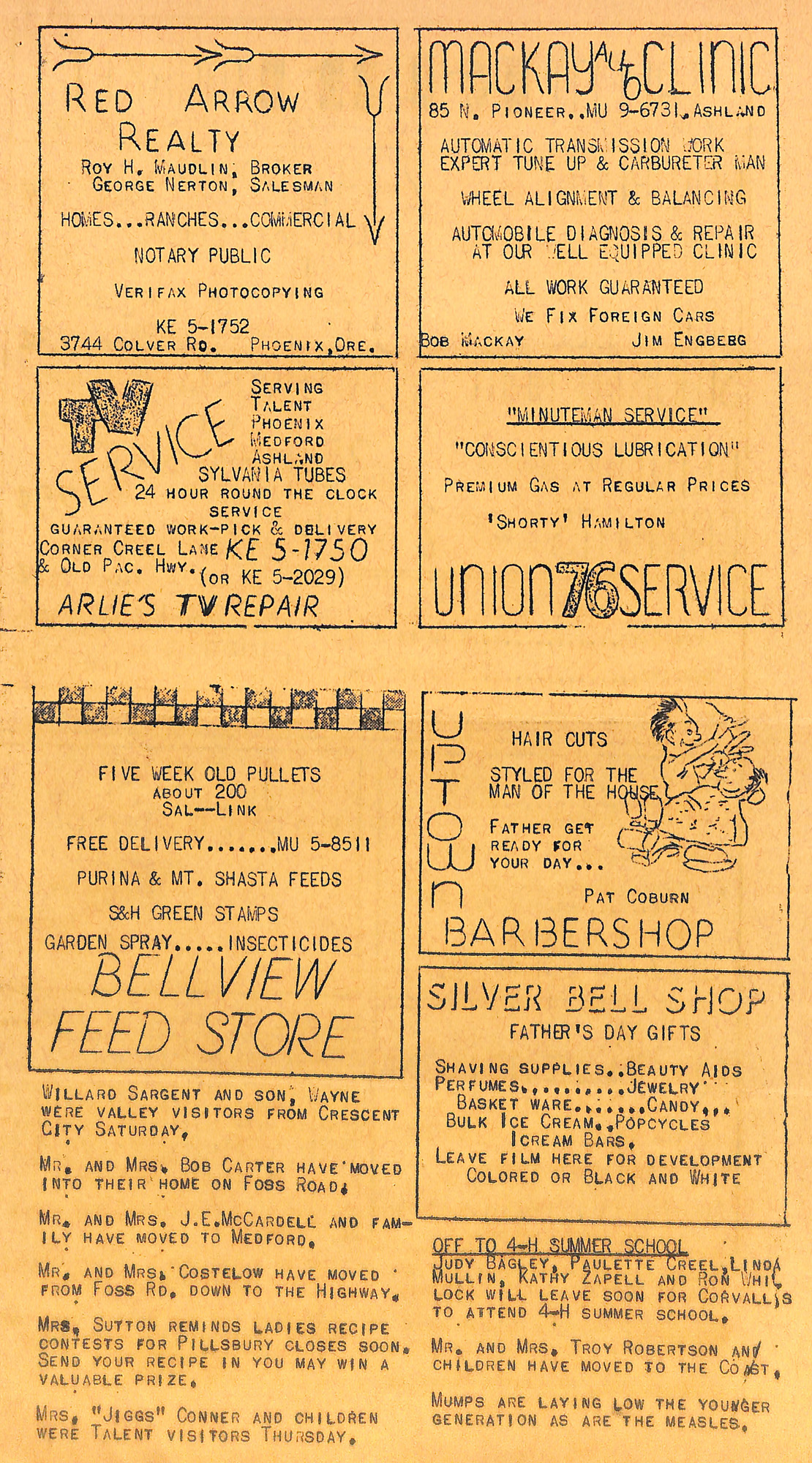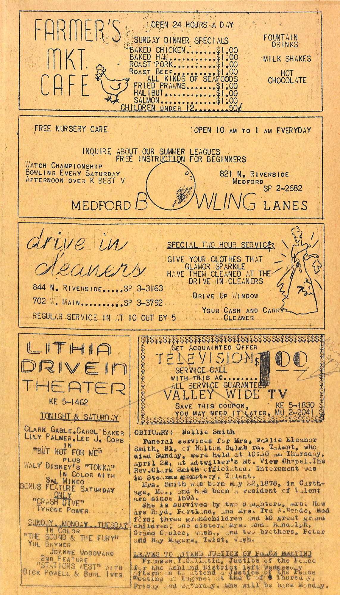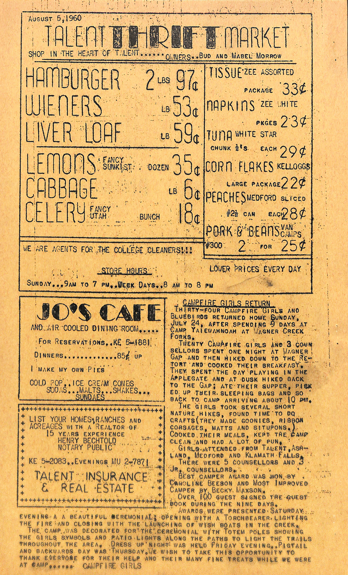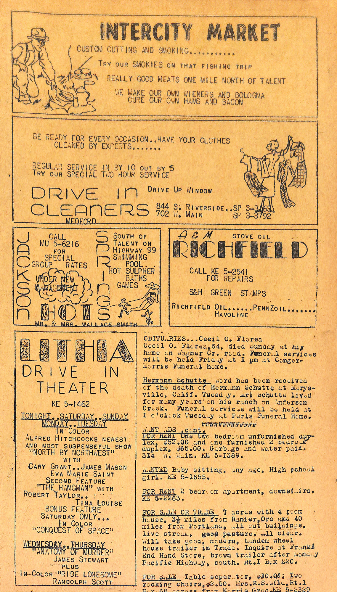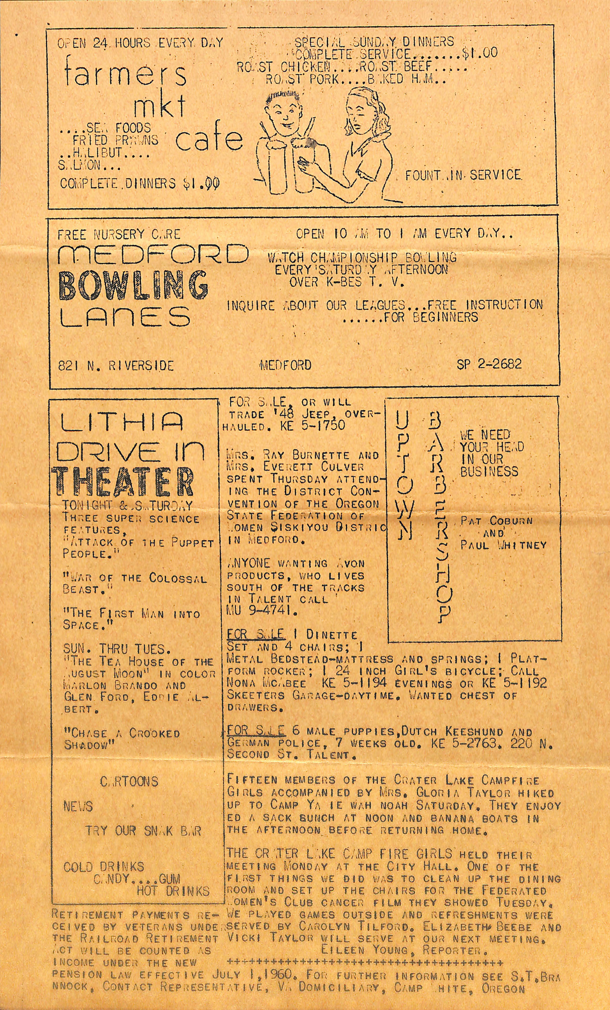 DON'T forget your Camp Fire mints, peanuts. One of the girls will see you soon. Remember, it all goes to a good cause. Mrs. Hilda Frances and two children were in Talent several days last week while visiting Mae Lowe. Postmaster and Mrs. Roger Smoot spent several days in Portland last week due to the illness of their daughter. According to the calendar the Pacific Coast should have gales this week. I wonder…? Page 3, ads for: FARMER'S MARKET CAFÉ MEDFORD BOWLING LANES LITHIA DRIVE-IN THEATER UPTOWN BARBERSHOP FOR SALE--or will trade '48 Jeep, overhauled. KE 501750. Mrs. Ray Burnette and Mrs. Everett Culver spent Thursday attending the District Convention of the Oregon State Federation of Women, Siskiyou District, in Medford. ANYONE wanting Avon products who lives south of the tracks in Talent, call MU 9-4741. FOR SALE--1 dinette set and 4 chairs; 1 Metal Bedstead--mattress and springs; 1 platform rocker; 1 24 inch girl's bicycle; Call Nona McAbee, KE 5-1194, evenings or KE 5-1192 Skeeters Garage--daytime. Wanted chest of drawers. FOR SALE--6 male puppies, Dutch Keeshond and German police, 7 weeks old. KE 5-2763. 220 N. Second St. Talent. Fifteen members of the Crater Lake Campfire Girls accompanied by Mrs. Gloria Taylor hiked up to Camp Ya Ie Wah Noah Saturday. They enjoyed a sack lunch at noon and banana boats in the afternoon before returning home. THE CRATER LAKE CAMP FIRE GIRLS held their meeting Monday at the City Hall. One of the first things we did was to clean up the dining room and set up the chairs for the Federated Women's Club cancer film they showed Tuesday. We played games outside and refreshments were served by Carolyn Tilford. Elizabeth Beebe and Vicki Taylor will serve at our next meeting. Eileen