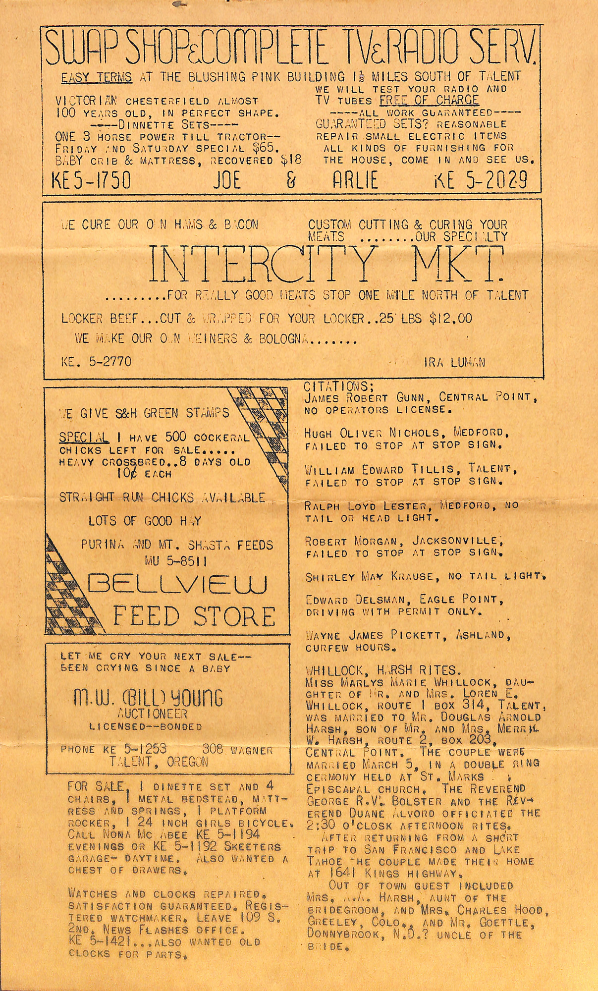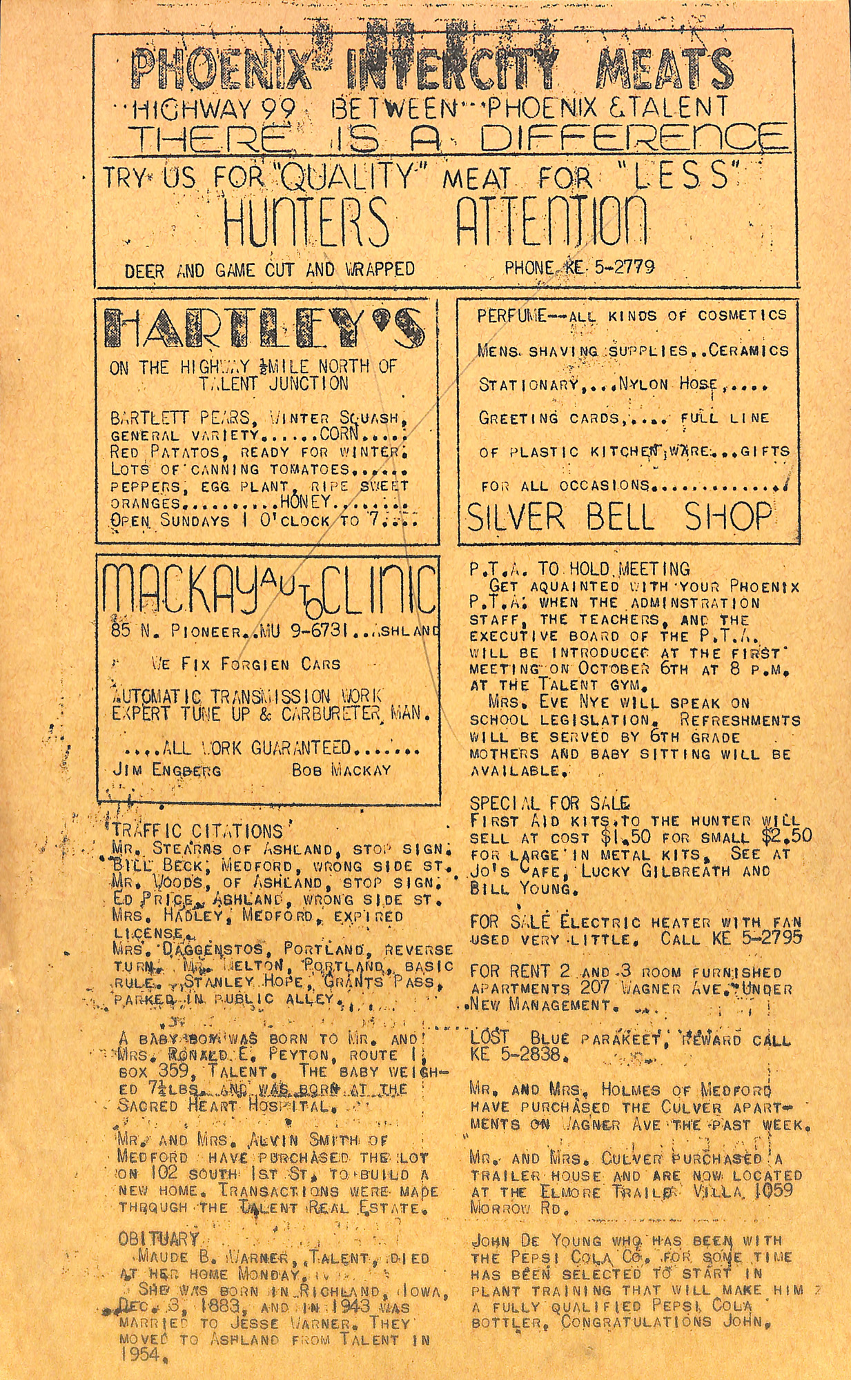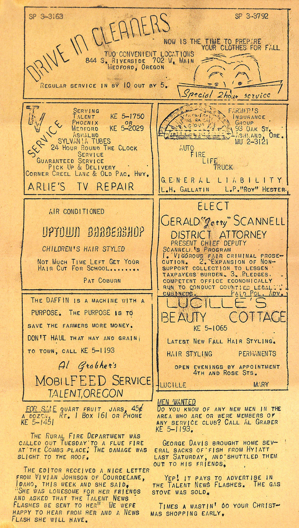 Page 5, ads for: ELECT EDWIN R. DURNO U.S. CONGRESSMAN, REPUBLICAN FOURTH DISTRICT Centralization of power in Washington works against Oregon families. ELECT JOHN R. DELLENBACK--for State Representative RE-ELECT RAY J. SCHUMACHER, County Assessor PAUL B. RYNNING--COUNTY COMMISSIONER McGINTY FOR COUNTY SURVEYOR VOTE FOR A MAN WITH ABILITY While collecting ads Wednesday afternoon, we were interested to hear one Talent businessman accuse another of stealing an apple from a local orchardists' car. The first man said if he'd thought of it, he'd have taken one for himself and the second man denied that he filched the apple in the first place, claiming to have brought it from home to munch in the middle of the afternoon. So we don't know whether CRIME WAS OUGHT OR NOT…Maybe crime just doesn't pay or maybe it was all a crazy mixed-up mistake….Anyway, no one offered us an apple…YE EDITOR has been attending all kinds of coffees, teas, etc. for Republicans and Democrats, hearing both sides of all kinds of questions. Attend the Bellview Grange Candidates' night Oct. 21st. You'll learn something, if it's only who is running. BICYCLE SAFETY This is M.W. Young of the Talent Police Dept. with a reminder for bicyclists. Someday you probably want to drive an automobile. And there's no better way to learn safe, legal driving than by practicing it as a bicyclist. Keep to the right, give proper hand signals so drivers know what you're going to do. Respect traffic lights and signs. To learn more about good bike riding, write for a copy of Fun on a Bike to the Oregon Department of Motor Vehicles, Salem, Oregon. Page 6, ads for: PHOENIX INTERCITY MARKET HARTLEY'S FRUIT STAND SILVER BELL SHOP MACKAY AUTO CLINIC RE-ELECT EVE NYE--State Representative DOG CONTROL MEASURE will again appear on the ballot. Worded exactly as it was this spring. So here it is: FOR DOGS RUNNING AT LARGE--YES FOR DOGS RUNNING AT LARGE--NO So if you want the dogs tied you vote no and if you want the dogs untied and with no muzzle you vote Yes, and the way this law is written up is ridiculous. FROM OUR FILES--Oct. 12, 1956. Weddings of Donna Lee Faler and James N. Williams and Miss Deanna Snelson and Jim Boyd Wallace were written up in this issue….Lois Gage thanked everyone who helped her be Queen of the PTA Carnival…Mrs. Nelson Harbin and children left to join her husband in Japan…Water restrictions were taken off….A pink and blue shower was held for Mrs. Richard Ellis…Miss Allison Cutburth was guest of honor at a bridal shower….42 boys turned out for jr. high football… OCT. 14, 1955…Hulda Sommer slipped and fell on her back porch…injured her ankle…Mr. and Mrs. Archie Estes visited in Roseburg this week…Mrs. Eva Wright returned from Encinitas, Calif….Harry Hamilton returned home from Portland Monday….Surprise birthday party was given for Beverley Lenz Sat…Born to Mr. and Mrs. Gene Reedy a boy, 10 lbs. 1 oz. at Sacred Heart Hospital….Life doesn't begin at 40 for those who went 60 when they were 20….Joe Rapp was hospitalized at Community Hosp. following a one-vehicle accident on the Jacksonville-Central Point highway….Mrs. Mary Dedrick suffered a broken toe….Music Boosters had potluck. OCT. 9, 1954. Talent Man Hunting Fatality. Reported the first fatality of Oregon's deer season this year was Warren Jackson of Talent. Jackson and his wife and Mr. and Mrs. John Baldwin were hunting south of Bly. Jackson left the camp early and his body was found around 9:30 by John Baldwin. Mr. Jackson was reported to be the victim of a heart attack…James Allen Young arrived at the home of his parents, Mr. and Mrs. Floyd Young, Jr. Sept. 29, 1954, weighing in at 8 lbs. 9 ounces…Mr. and Mrs. Lloyd Bunnell returned from a trip that included Canada and Alaska. They traveled over the Alcan Hiway…stopping at Montana and in Yellowstone Park….Mr. and Mrs. Gail Woodsite of Anchorage, Alaska were weekend guests of Mary and Marie Furrer and Dick Kruger. Page 7, ads for: ROSS TV & RADIO SERVICE DON'S FARMING SERVICE PERL FUNERAL HOME & AMBULANCE SERVICE BEN'S OK NEW & 2ND HAND STORE WANT AD SECTION Hundred of families will read your ad in the TALENT NEWS FLASHES. Up to 25 words for 35¢; 25 to 50 words 70¢. Phone KE 5-14421, or mail to P.O. Box 405, or bring to 109 South 2nd St., Talent, Ore. DEADLINE FOR WANT ADS
