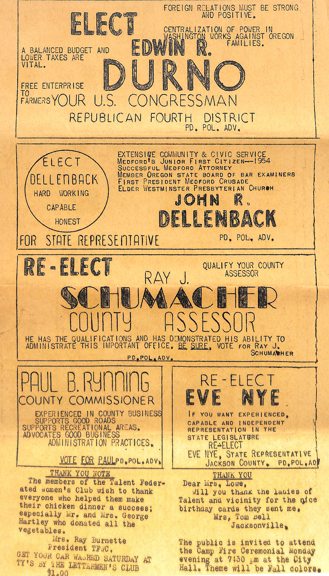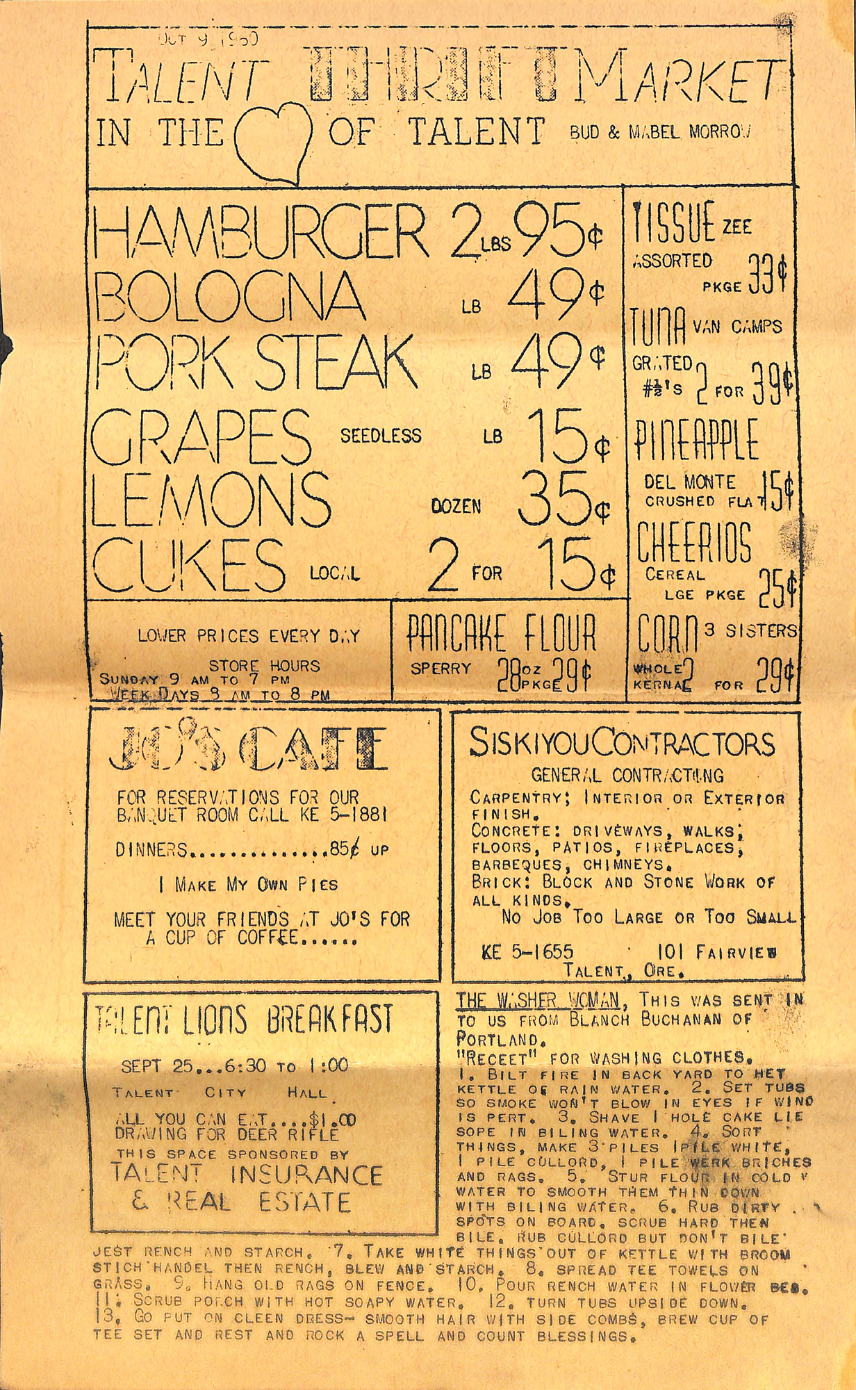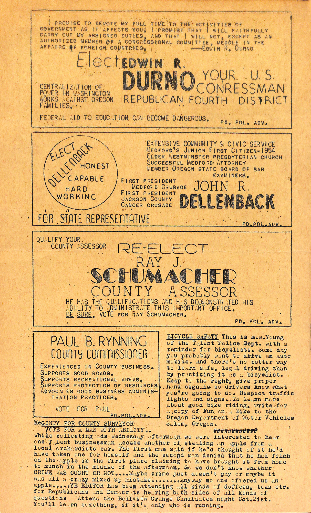 Page 5, ads for: ELECT EDWIN R. DURNO U.S. CONGRESSMAN, REPUBLICAN FOURTH DISTRICT Centralization of power in Washington works against Oregon families. ELECT JOHN R. DELLENBACK--for State Representative RE-ELECT RAY J. SCHUMACHER, County Assessor PAUL B. RYNNING--COUNTY COMMISSIONER McGINTY FOR COUNTY SURVEYOR VOTE FOR A MAN WITH ABILITY While collecting ads Wednesday afternoon, we were interested to hear one Talent businessman accuse another of stealing an apple from a local orchardists' car. The first man said if he'd thought of it, he'd have taken one for himself and the second man denied that he filched the apple in the first place, claiming to have brought it from home to munch in the middle of the afternoon. So we don't know whether CRIME WAS OUGHT OR NOT…Maybe crime just doesn't pay or maybe it was all a crazy mixed-up mistake….Anyway, no one offered us an apple…YE EDITOR has been attending all kinds of coffees, teas, etc. for Republicans and Democrats, hearing both sides of all kinds of questions. Attend the Bellview Grange Candidates' night Oct. 21st. You'll learn something, if it's only who is running. BICYCLE SAFETY This is M.W. Young of the Talent Police Dept. with a reminder for bicyclists. Someday you probably want to drive an automobile. And there's no better way to learn safe, legal driving than by practicing it as a bicyclist. Keep to the right, give proper hand signals so drivers know what you're going to do. Respect traffic lights and signs. To learn more about good bike riding, write for a copy of Fun on a Bike to the Oregon Department of Motor Vehicles, Salem, Oregon. Page 6, ads for: PHOENIX INTERCITY MARKET HARTLEY'S FRUIT STAND SILVER BELL SHOP MACKAY AUTO CLINIC RE-ELECT EVE NYE--State Representative DOG CONTROL MEASURE will again appear on the ballot. Worded exactly as it was this spring. So here it is: FOR DOGS RUNNING AT LARGE--YES FOR DOGS RUNNING AT LARGE--NO So if you want the dogs tied you vote no and if you want the dogs untied and with no muzzle you vote Yes, and the way this law is written up is ridiculous. FROM OUR FILES--Oct. 12, 1956. Weddings of Donna Lee Faler and James N. Williams and Miss Deanna Snelson and Jim Boyd Wallace were written up in this issue….Lois Gage thanked everyone who helped her be Queen of the PTA Carnival…Mrs. Nelson Harbin and children left to join her husband in Japan…Water restrictions were taken off….A pink and blue shower was held for Mrs. Richard Ellis…Miss Allison Cutburth was guest of honor at a bridal shower….42 boys turned out for jr. high football… OCT. 14, 1955…Hulda Sommer slipped and fell on her back porch…injured her ankle…Mr. and Mrs. Archie Estes visited in Roseburg this week…Mrs. Eva Wright returned from Encinitas, Calif….Harry Hamilton returned home from Portland Monday….Surprise birthday party was given for Beverley Lenz Sat…Born to Mr. and Mrs. Gene Reedy a boy, 10 lbs. 1 oz. at Sacred Heart Hospital….Life doesn't begin at 40 for those who went 60 when they were 20….Joe Rapp was hospitalized at Community Hosp. following a one-vehicle accident on the Jacksonville-Central Point highway….Mrs. Mary Dedrick suffered a broken toe….Music Boosters had potluck. OCT. 9, 1954. Talent Man Hunting Fatality. Reported the first fatality of Oregon's deer season this year was Warren Jackson of Talent. Jackson and his wife and Mr. and Mrs. John Baldwin were hunting south of Bly. Jackson left the camp early and his body was found around 9:30 by John Baldwin. Mr. Jackson was reported to be the victim of a heart attack…James Allen Young arrived at the home of his parents, Mr. and Mrs. Floyd Young, Jr. Sept. 29, 1954, weighing in at 8 lbs. 9 ounces…Mr. and Mrs. Lloyd Bunnell returned from a trip that included Canada and Alaska. They traveled over the Alcan Hiway…stopping at Montana and in Yellowstone Park….Mr. and Mrs. Gail Woodsite of Anchorage, Alaska were weekend guests of Mary and Marie Furrer and Dick Kruger. Page 7, ads for: ROSS TV & RADIO SERVICE DON'S FARMING SERVICE PERL FUNERAL HOME & AMBULANCE SERVICE BEN'S OK NEW & 2ND HAND STORE WANT AD SECTION Hundred of families will read your ad in the TALENT NEWS FLASHES. Up to 25 words for 35¢; 25 to 50 words 70¢. Phone KE 5-14421, or mail to P.O. Box 405, or bring to 109 South 2nd St., Talent, Ore. DEADLINE FOR WANT ADS