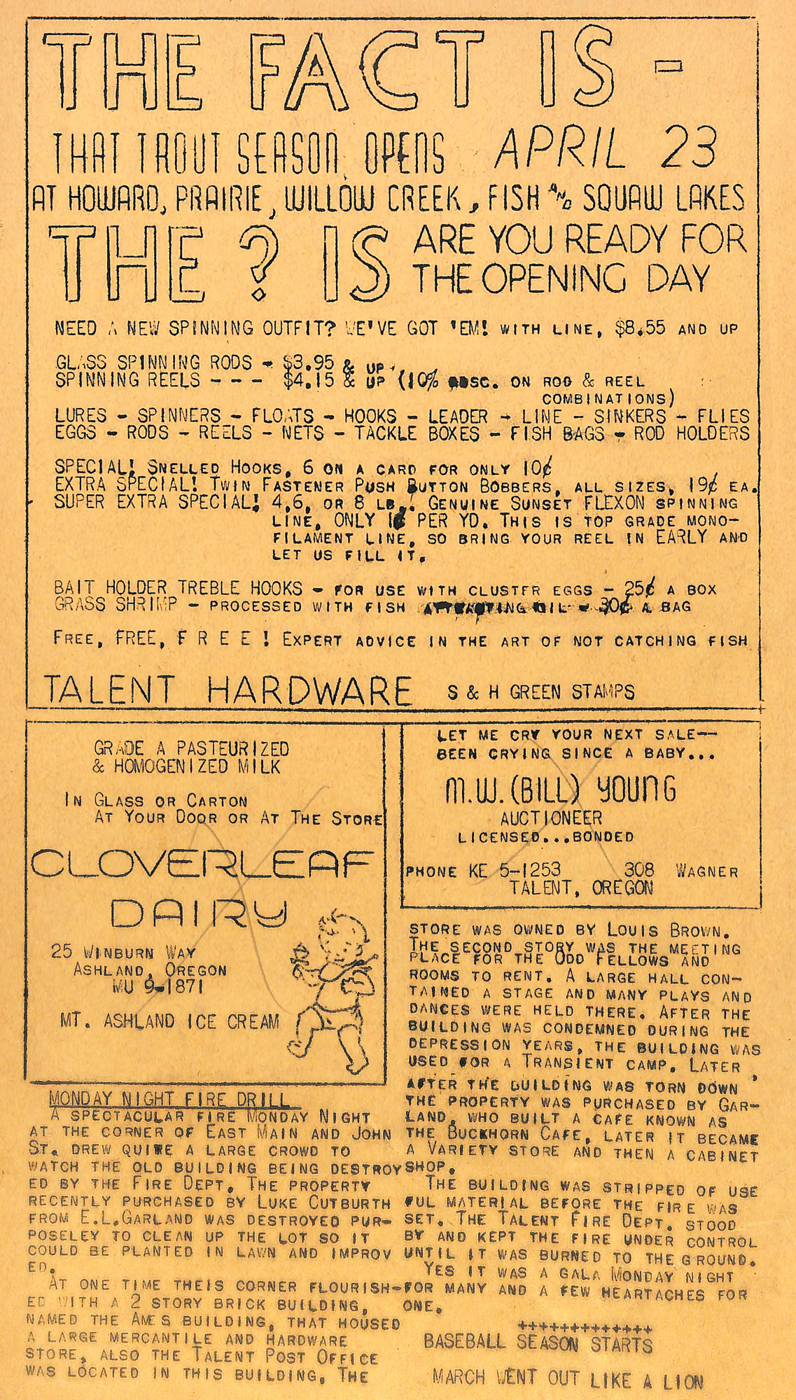 BOYER GREENHOUSE FOR RENT--3-room modern house on school bus, city bus and mail stop. Large yard. John Henry. One mile sou. on Old Pacific Highway. KE 5-1207. FOR RENT--House at 101 New St. Call at 229 Gibson St. in Talent. WANTED--Yard Work … Mowing, spading, raking, anything along the yard work line. Ted Welburn. 223 Gibson. FOR SALE--Piano & bench, good condition…1 plate glass mirror. Phone SP 2-9771. Page 6, ads for: THE ABATTOIR MACKAY AUTO CLINIC UNION 76 SERVICE JO'S CAFÉ BEN'S OK NEW & SECOND HAND STORE TALENT LUMBER YARD JULY 25 DEADLINE FOR WORLD WAR II GI LOANS About 4 months remain in which World War II veterans may apply for GI home, farm or business loans, S.T. Brannock, Contact Representative, VA Domiciliary, Camp White, said. Under the present law, July 25, 1960 is the cutoff date set for World War II veteran participation in the post-war program that has seen more than 5 million World War II veterans take advantage of the GI Bill loan provisions. Veterans who submit their applications in sufficient time before the deadline of July 25, 1960 so as to allow the VA to make a commitment, will be allowed an additional year, or until July 25, 1961, in which to have the loan processed and actually closed. Brannock pointed out that these dates do not apply to Korean conflict veterans who have until Jan. 31, 1965 to make GI loan applications. Page 7, ads for: TALENT HARDWARE Trout season opens April 23 at Howard Prairie, Willow Creek, Fish & Squaw Lakes CLOVERLEAF DAIRY M.W. (BILL) YOUNG, AUCTIONEER MONDAY NIGHT FIRE DRILL A spectacular fire Monday night at the corner of East Main and John St. drew quite a large crowd to watch the old building being destroyed by the Fire Dept. The property recently purchased by Luke Cutburth from E.L. Garland was destroyed purposely to clean up the lot so it could be planted in lawn and improved. At one time this corner flourished with a 2-story brick building named the Ames building that housed a large mercantile and hardware store. Also, the Talent Post Office was located in this building. The store was owned by Louis Brown. The second story was the meeting place for the Odd Fellows and rooms to rent. A large hall contained a stage, and many plays and dances were held there. After the building was condemned during the depression years, the building was used for a transient camp. Later, after the building was torn down, the property was purchased by Garland, who built a café known as the Buckhorn Café. Later it became a variety store and then a cabinet shop. The building was stripped of useful material before the fire was set. The Talent Fire Dept. stood by and kept the fire under control until it burned to the ground. Yes, it was a gala Monday night for many, and a few heartaches for one. BASEBALL