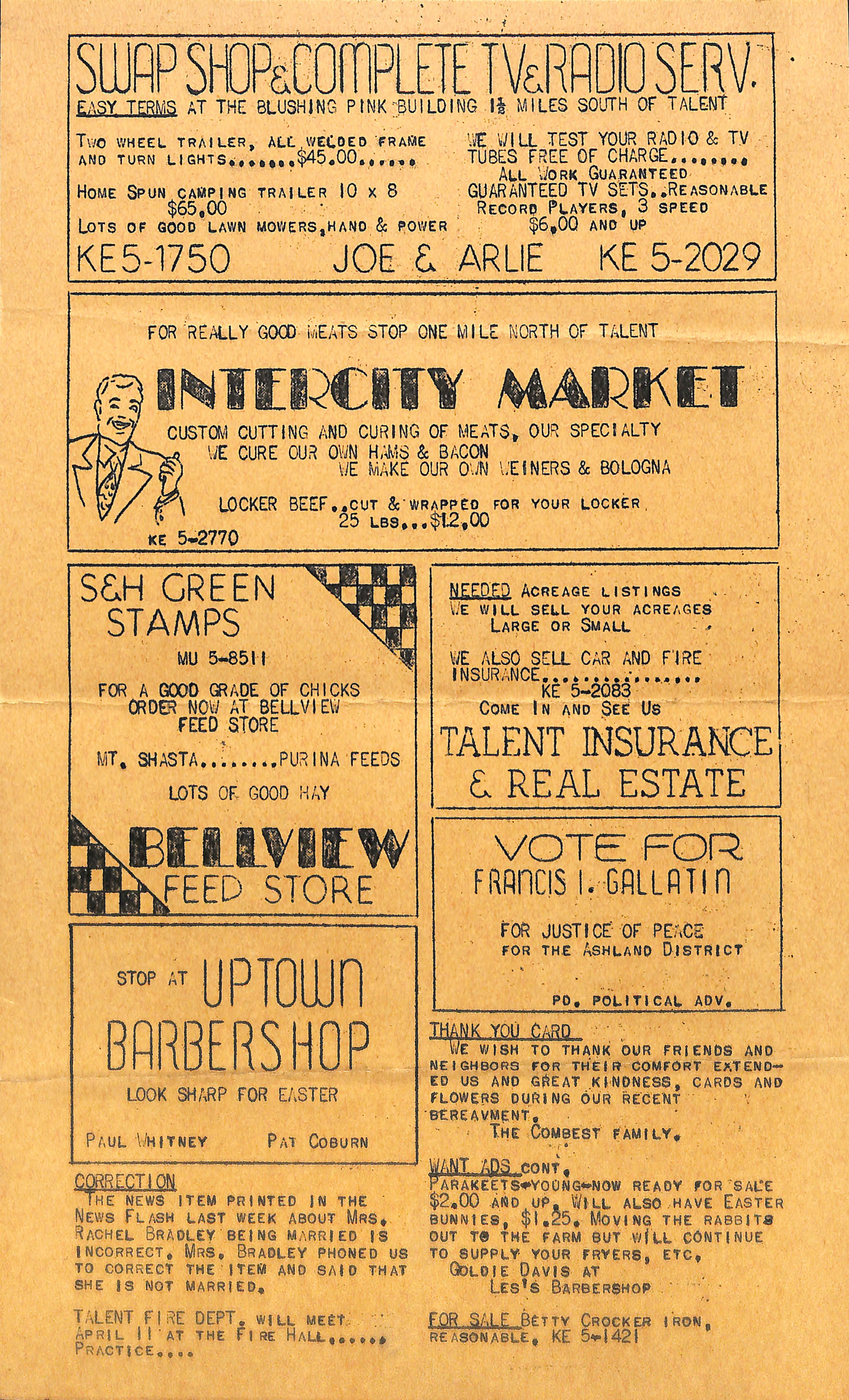 SHARPENING SERVICE EVERGREEN PRINTING COMPANY BOYER GREENHOUSE LES' BARBERSHOP--Rabbit Manure. FOR RENT--3-room modern house on school bus, city bus and mail stop. Large yard. John Henry. One mile south on Old Pacific Highway. KE 5-1207. FOR SALE--Piano and bench, good condition. One plate glass mirror. SP 2-9771. Page 4, ads for: SWAP SHOP & COMPLETE TV & RADIO SERVICE INTERCITY MARKET BELLVIEW FEED STORE TALENT INSURANCE & REAL ESTATE VOTE FOR FRANCIS I. GALLATIN for Justice of Peace, Ashland District UPTOWN BARBERSHOP CORRECTION The news item printed in the News Flash last week about Mrs. Rachel Bradley being married is incorrect. Mrs. Bradley phoned us to correct the item and said that she is not married. TALENT FIRE DEPT. will meet April 11 at the Fire Hall….Practice… THANK YOU CARD We wish to thank our friends and neighbors for their comfort extended us and great kindness, cards and flowers during our recent bereavement. The