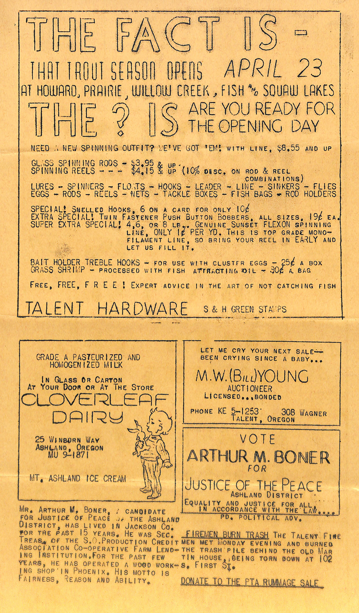 WANT ADS cont. Parakeets--young--now ready for sale $2.00 and up. Will also have Easter bunnies, $1.25. Moving the rabbits out to the farm but will continue to supply your fryers, etc. Goldie Davis at Les' Barbershop. FOR SALE--Betty Crocker iron, reasonable. KE 5-1421. Page 5, ads for: TALENT HARDWARE CLOVERLEAF DAIRY M.W. (Bill) YOUNG AUCTIONEER VOTE ARTHUR M. BONER for Justice of the Peace Ashland District Mr. Arthur M. Boner, a candidate for Justice of Peace of the Ashland District, has lived in Jackson Co. for the past 15 years. He was Sec. Treas. of the S.O. Production Credit Association Cooperative Farm Lending Institution. For the past few years, he has operated a wood working shop in Phoenix. His motto is Fairness, Reason and Ability. FIREMEN BURN TRASH--The Talent Firemen met Monday evening and burned the trash pile behind the old Martin house, being torn down at 102 S. First St. DONATE