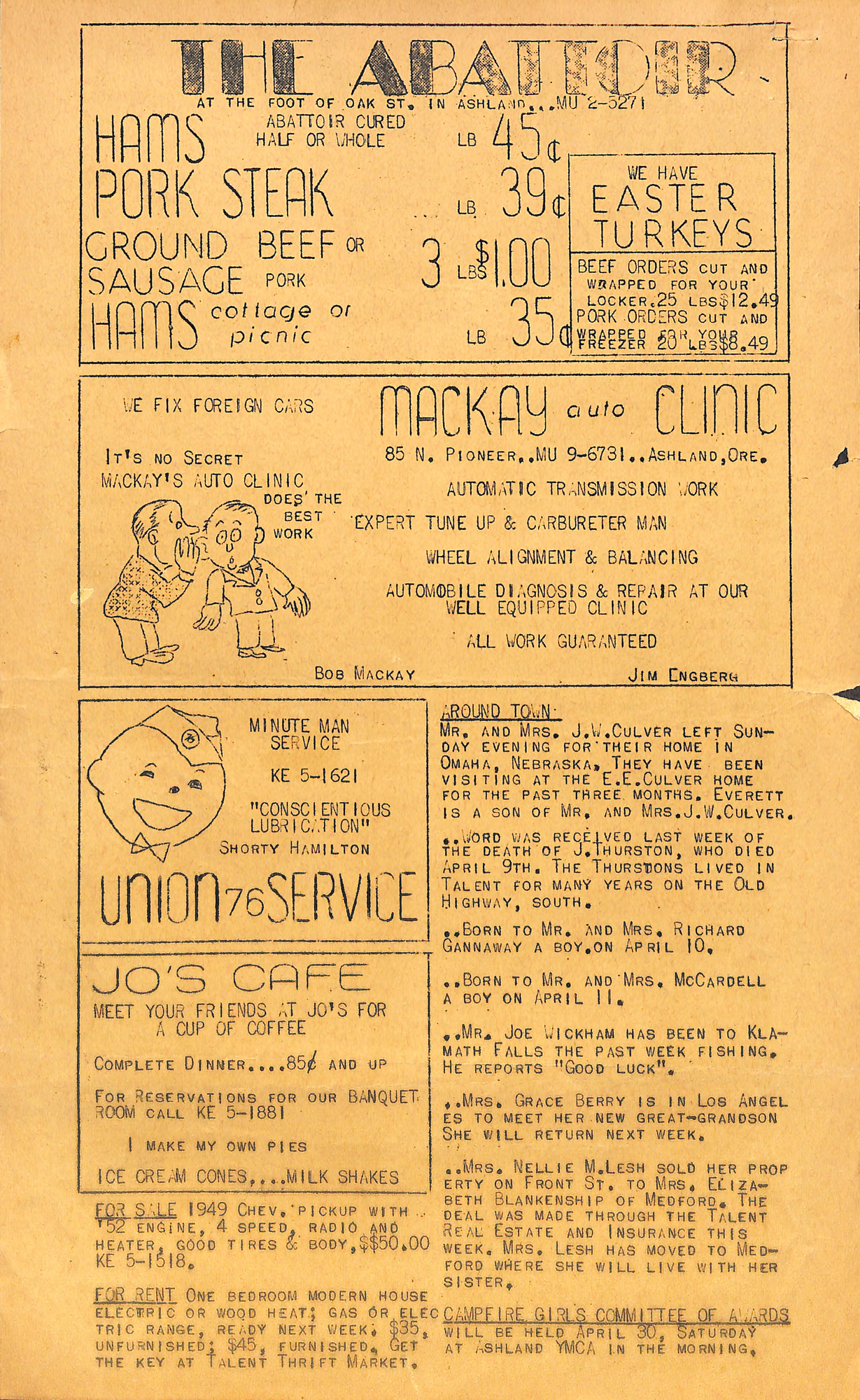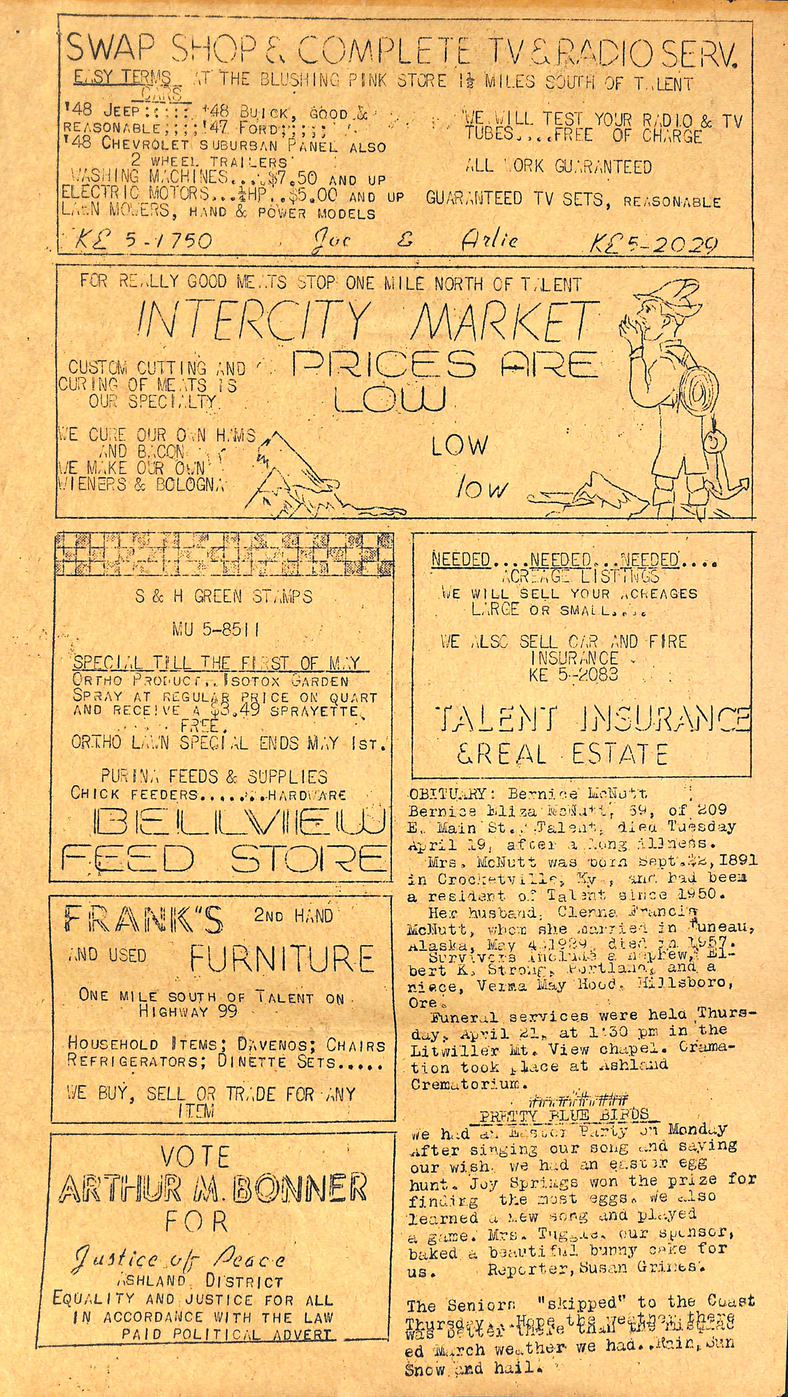 JEAN IRBY PIANO STUDIO WANTED ANTIQUE CLOCKS OR VERY OLD CLOCKS- SHARPENING SERVICE BOYER GREENHOUSE FOR SALE--PARAKEETS MARION KAY--JACKSON COUNTY LICENSED PRACTICAL NURSES ASSOCIATION IT PAYS TO ADVERTISE!! EARL LENZ GARDEN ROTOVATING ASHLAND SANITARY SERVICE IVA TUGGLE'S LEATHER WORK & AGATE JEWELRY HERB'S WATCH REPAIR EVERGREEN PRINTING COMPANY WORMS!! WORMS!! FURNITURE REPAIR Page 4, ads for: TALENT THRIFT MARKET A&M RICHFIELD LES' BARBERSHOP VOTE FOR FRANCES I. GALLATIN For Justice of the Peace, Ashland District CAMPFIRE GIRLS MOTHER DAUGHTER TEA… April 24, Sunday, at the Girls Community Club, 2:00 to 4:00 pm. There will be a Camp Fire style show at 2:15 and 3:15. Come to see the latest in official camp attire. Les Davis wants his For Rent colored or white rabbits returned at once, or the charge will be double. The Southern Oregon Peace Officers Association met at Omar's restaurant April 18 at 7 pm for election of officers for the coming year. New officers are: President, Paul Bettiol, chief criminal deputy of Jackson Co. Sheriff's office; Vice President, John Wetterau, Josephine juvenile officer; Treasurer: Milton Hanson, Medford police dept.; Secretary, Frank Elson, Medford police dept.; sgt. at arms, M.W. Young, Talent Police Chief. BY THE GRAPEVINE Has anyone here seen Kelly?? No, P.P.P. has taken his trailer and moved to warmer parts 'tis said. M.T. says there will be showers on Wagner Creek. We hope it isn't a storm. Talent has been censused… …Ila Conner was taken to the Ashland Gen. hosp. Monday. …Ira Culver is still in the hosp. The Culvers have moved back to Talent. Page 5, ads for: SWAP SHOP & COMPLETE TV & RADIO SERVICE INTERCITY MARKET BELLVIEW FEED STORE TALENT INSURANCE & REAL ESTATE FRANK'S FURNITURE VOTE ARTHUR M. BONNER for Justice of Peace, Ashland District OBITUARY: Bernice McNutt Bernice Eliza McNutt, 69, of 209 E. Main St., Talent, died Tuesday, April 19, after a long illness. Mrs. McNutt was born Sept. 22, 1891 in Crocketville, Ky., and had been a resident of Talent since 1950. Her husband, Clenna Francis McNutt, whom she married in Juneau, Alaska, May 4, 1929, died in 1957. Survivors include a nephew, Elbert K. Strong, Portland, and a niece, Verma May Hood, Hillsboro, Ore. Funeral services were held Thursday, April 21, at 1:30 pm in the Litwiller Mtn. View Chapel. Cremation took place at Ashland Crematorium. PRETTY BLUE BIRDS We had an Easter Party on Monday. After singing our song and saying our wish, we had an Easter egg hunt. Joy Springs won the prize for finding the most eggs. We also learned a new song and played a game. Mrs. Tuggle, our sponsor, baked a beautiful bunny cake for us. Reporter,