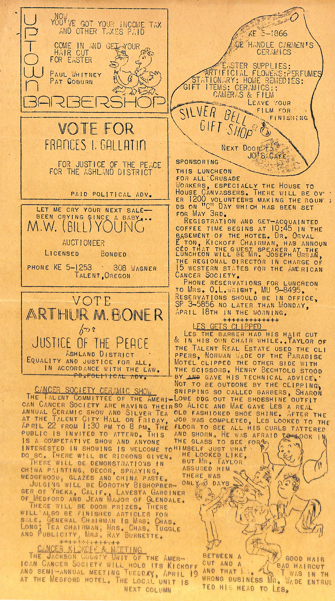 LIONS AUX. MEETING CHANGED The regular dinner meeting of the Talent Lions Auxiliary has been changed from Wednesday, April 27, to Wednesday, April 20th at Jo's Café. Our special guest will be our protégé from the State School for the Blind at Salem. GIVE YOUR USED CLOTHING and household articles to your Lions Aux. neighbor or leave at Jo's Café for the Talent Lions Auxiliary rummage sale May 7. FOR SALE--1949 Chev. pickup with '52 engine, 4 speed, radio and heater, good tires & body, $50.00. KE 5-1518. FOR RENT--One-bedroom modern house, electric or wood heat; gas or electric range, ready next week. $35, unfurnished; $45 furnished. Get the key at Talent Thrift Market. AROUND TOWN Mr. and Mrs. J.W. Culver left Sunday evening for their home in Omaha, Nebraska. They have been visiting at the E.E. Culver home for the past three months. Everett is a son of Mr. and Mrs. J.W. Culver. …Word was received last week of the death of J. Thurston, who died April 9th. The Thurstons lived in Talent for many years on the Old Highway, south. …Born to Mr. and Mrs. Richard Gannaway, a boy, on April 10. …Born to Mr. and Mrs. McCardell, a boy, on April 11. …Mr. Joe Wickham has been to Klamath Falls the past week fishing. He reports "good luck." …Mrs. Grace Berry is in Los Angeles to meet her new great-grandson. She will return next week. …Mrs. Nellie M. Lesh sold her property on Front St. to Mrs. Elizabeth Blankenship of Medford. The deal was made through the Talent Real Estate and Insurance this week. Mrs. Lesh has moved to Medford, where she will live with her sister. CAMPFIRE GIRLS COMMITTEE OF AWARDS will be held April 30, Saturday, at Ashland YMCA in the morning. Page 3, ads for: UPTOWN BARBERSHOP SILVER BELL GIFT SHOP VOTE FOR FRANCES I. GALLATIN For Justice of the Peace, Ashland District M.W. (BILL) YOUNG, AUCTIONEER VOTE ARTHUR M. BONER for Justice of the Peace, Ashland District CANCER SOCIETY CERAMIC SHOW The Talent Committee of the American Cancer Society are having their annual Ceramic Show and silver tea at the Talent City Hall on Friday, April 22, from 1:30 pm to 8 pm. The public is invited to attend. This is a competitive show and anyone interested in showing is welcome to do so. There will be ribbons given. There will be demonstrations in china painting, décor, spraying, wedgewood, glazes and china paste. Judging will be Dorothy Bishopberger of Yreka, Calif., Lavesta Gardiner of Medford, and Jean Major of Glendale. There will be door prizes. There will also be finished articles for sale. General Chairman is Mrs. Chas. Long; Tea chairman, Mrs. Chas. Tuggle and Publicity, Mrs. Ray Burnette. CANCER KICKOFF & MEETING The Jackson County Unit of the American Cancer Society will hold its kickoff and semi-annual meeting Tuesday, April 19, at the Medford Hotel. The local unit is sponsoring this luncheon for all Crusade Workers, especially the House to House Canvassers. There will be over 1200 volunteers making the rounds on "C" Day which has been set for May 3rd. Registration and get-acquainted coffee time begins at 10:45 in the basement of the hotel. Dr. Orval Eaton, Kickoff Chairman, has announced that the guest speaker at the luncheon will be Mr. Joseph Urban, the regional director in charge of 15 western states for the American Cancer Society. Phone reservations for luncheon to Mrs. O.L. Wright, MU 9-8495. Reservations should be in office, SP 3-5856, no later than Monday, April 18th in the morning. LES GETS CLIPPED Les the barber had his hair cut & in his own chair while…Taylor of the Talent Real Estate used the clippers, Norman Wade of the Paradise Motel clipped the other side with the scissors. Henry Bechtold stood by and gave his technical advice. Not to be outdone by the clipping, snipping so-called barbers, Sharon Lowe dug out the shoeshine outfit so Alice and Mae gave Les a real old-fashioned shoe shine. After the job was completed, Les looked to the floor to see all his curls tattered and shorn. He was afraid to look in the glass to see for himself just what he looked like, but Mr. Taylor assured him there was only 3 days between a good hair cut and a bad hair cut and that Mr. T. was in the wrong business. Mr. Wade entrusted his head to Les. Page 4, ads for: ROSS TV REPAIR DON'S FARMING SERVICE FARMER'S INSURANCE--L.H. GALLATIN PERL FUNERAL HOME & AMBULANCE SERVICE BEN'S OK NEW & 2ND HAND STORE HUNDREDS OF FAMILIES WILL READ YOUR want ad in the Talent News Flashes. Up to 25 words for 35¢; 25 to 50 words for 70¢. Phone KE 5-1421; mail to P.O. Box 405 or bring to 109 S. 2nd St. Published by Mae Lowe, 109 S. 2nd St. Talent, Oregon STEIGER'S GARAGE WORK