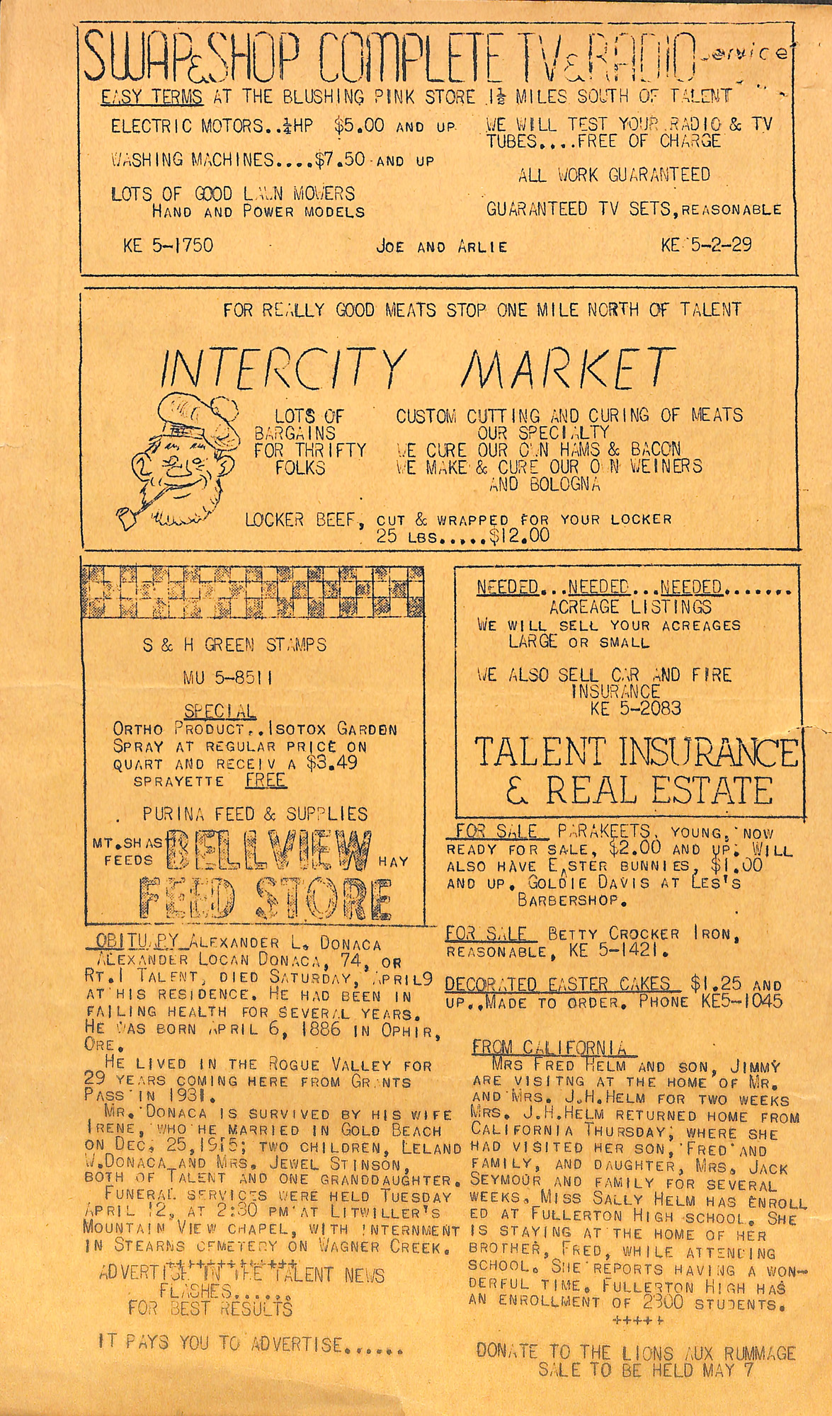 HERB'S WATCH REPAIR TED WELBURN YARD WORK IT PAYS TO ADVERTISE IN TALENT NEWS FLASHES EARL LENZ GARDEN ROTOVATING ASHLAND SANITARY SERVICE IVA TUGGLE'S LEATHER WORK & AGATE JEWELRY SHARPENING SERVICE EVERGREEN PRINTING COMPANY BOYER GREENHOUSE LES' BARBERSHOP--Rabbit Manure. FOR SALE--Piano and bench, good condition. One plate glass mirror. SP 2-9771. FURNITURE REPAIR--Stripping, refinishing, antiques restored and repaired. KE 5-1624, Rt. 1, Box 111, Old Pacific Hiway, Talent. FOR RENT--1 2-bedroom house & 2 duplexes. Inquire at 314 W. Main. Frank Christian. FOR SALE--Marion Kay pure vanilla, coconut, maple, lemon, almond, black walnut, angel food, pumpkin pie, and black pepper. Jackson County Licensed Practical Nurses Association. Phone KE 5-2770 or SP 3-3284. CANCER WILL STRIKE 2 out of 3 American families this year. Protect yourself, should you be one of these unfortunates. Call KE 5-2388 and ask about the new inexpensive CANCER INSURANCE POLICY. ATTENTION FISHERMEN WORMS…WORMS. All kinds, Red Gold; Red Wigglers; Egyptian Red; Earthworms; 25¢ doz. and up. First house north of Orchard Inn Café. Highway 99. Page 6, ads for: SWAP & SHOP COMPLETE TV & RADIO SERVICE INTERCITY MARKET BELLVIEW FEED STORE TALENT INSURANCE & REAL ESTATE OBITUARY--Alexander L. Donaca Alexander Logan Donaca, 74, of Rt. 1, Talent, died Saturday, April 9, at his residence. He had been in failing health for several years. He was born April 6, 1886, in Ophir, Ore. He lived in the Rogue Valley for 29 years, coming here from Grants Pass in 1931. Mr. Donaca is survived by his wife Irene, who he married in Gold Beach on Dec. 25, 1915; two children, Leland W. Donaca and Mrs. Jewel Stinson, both of Talent, and one granddaughter. Funeral services were held Tuesday, April 12, at 2:30 pm at Litwiller's Mountain View Chapel, with interment in Stearns Cemetery on Wagner Creek. ADVERTISE IN THE TALENT NEWS