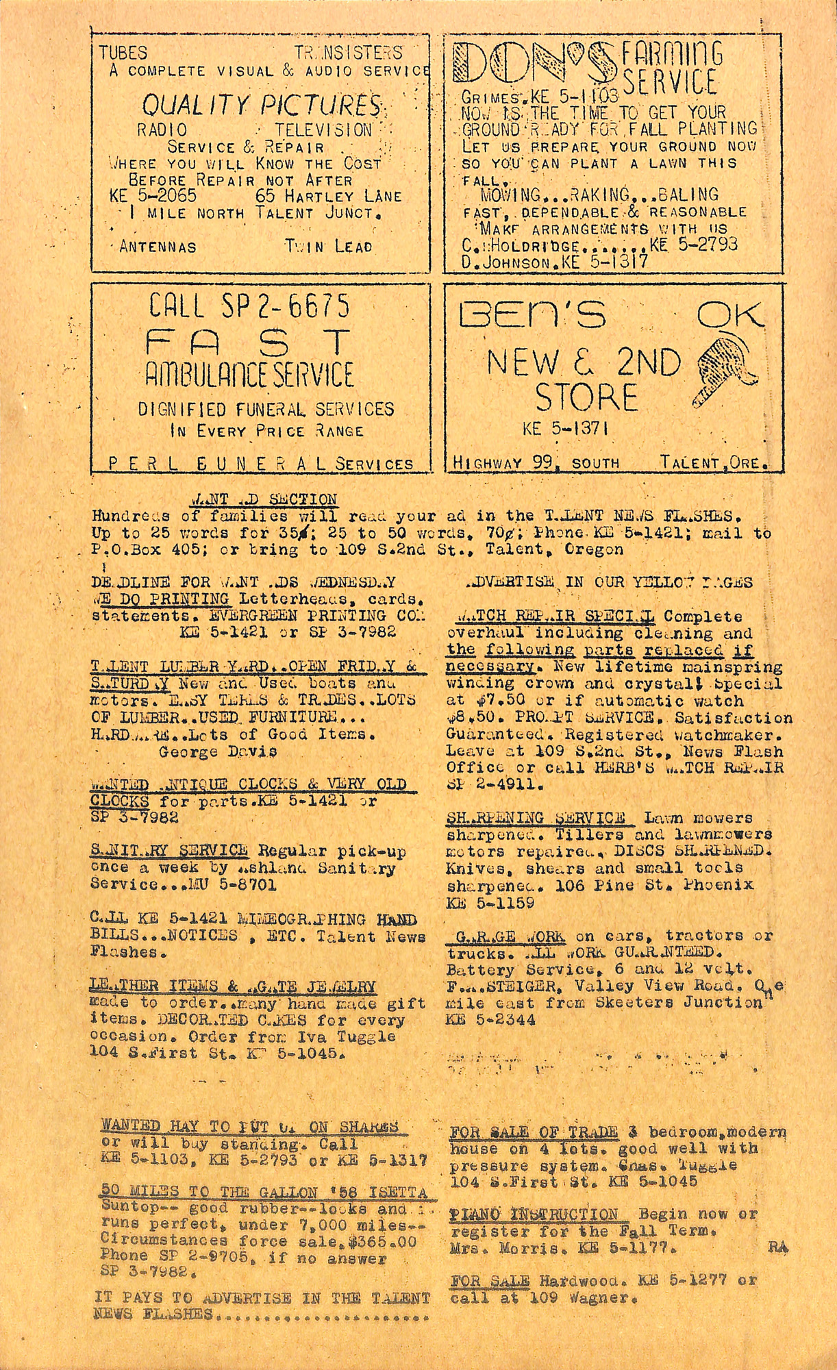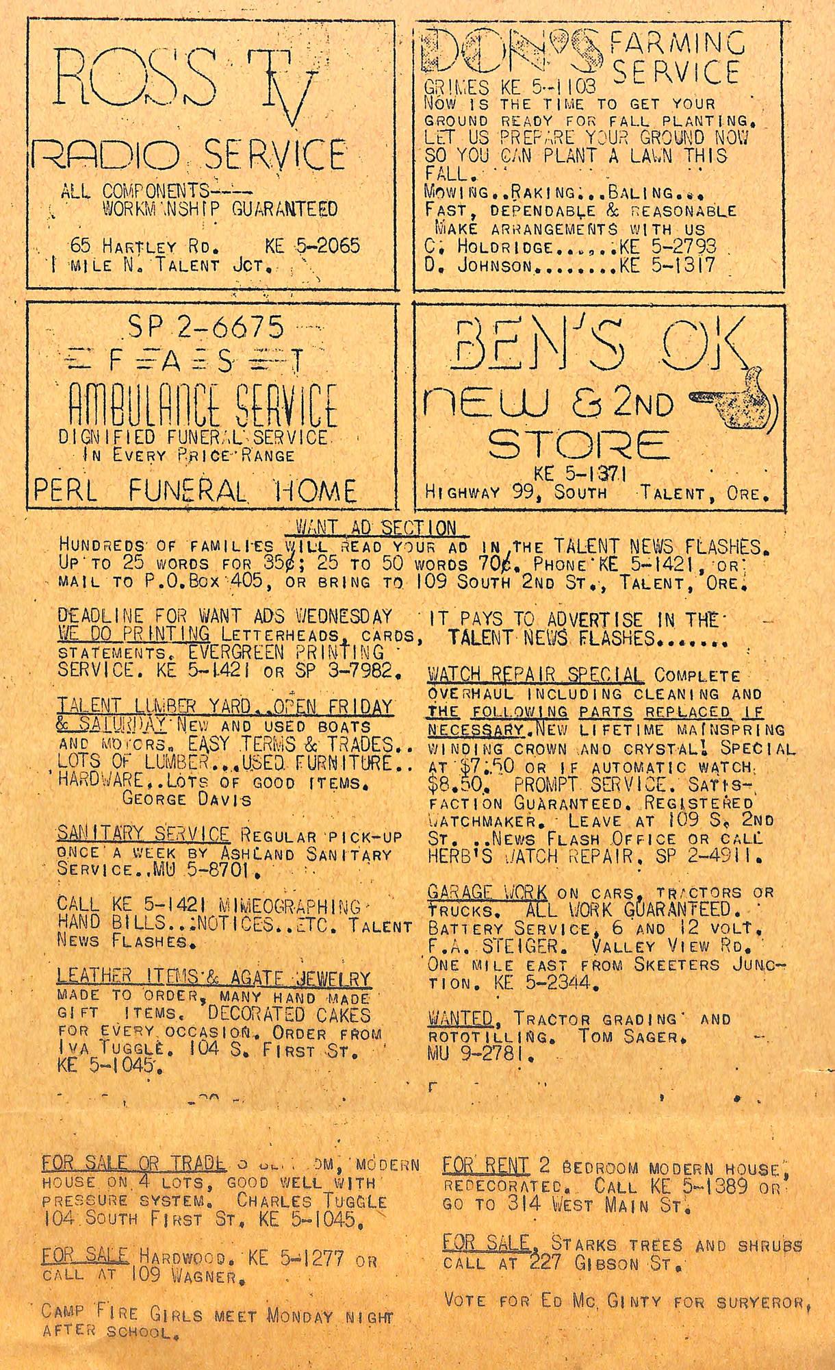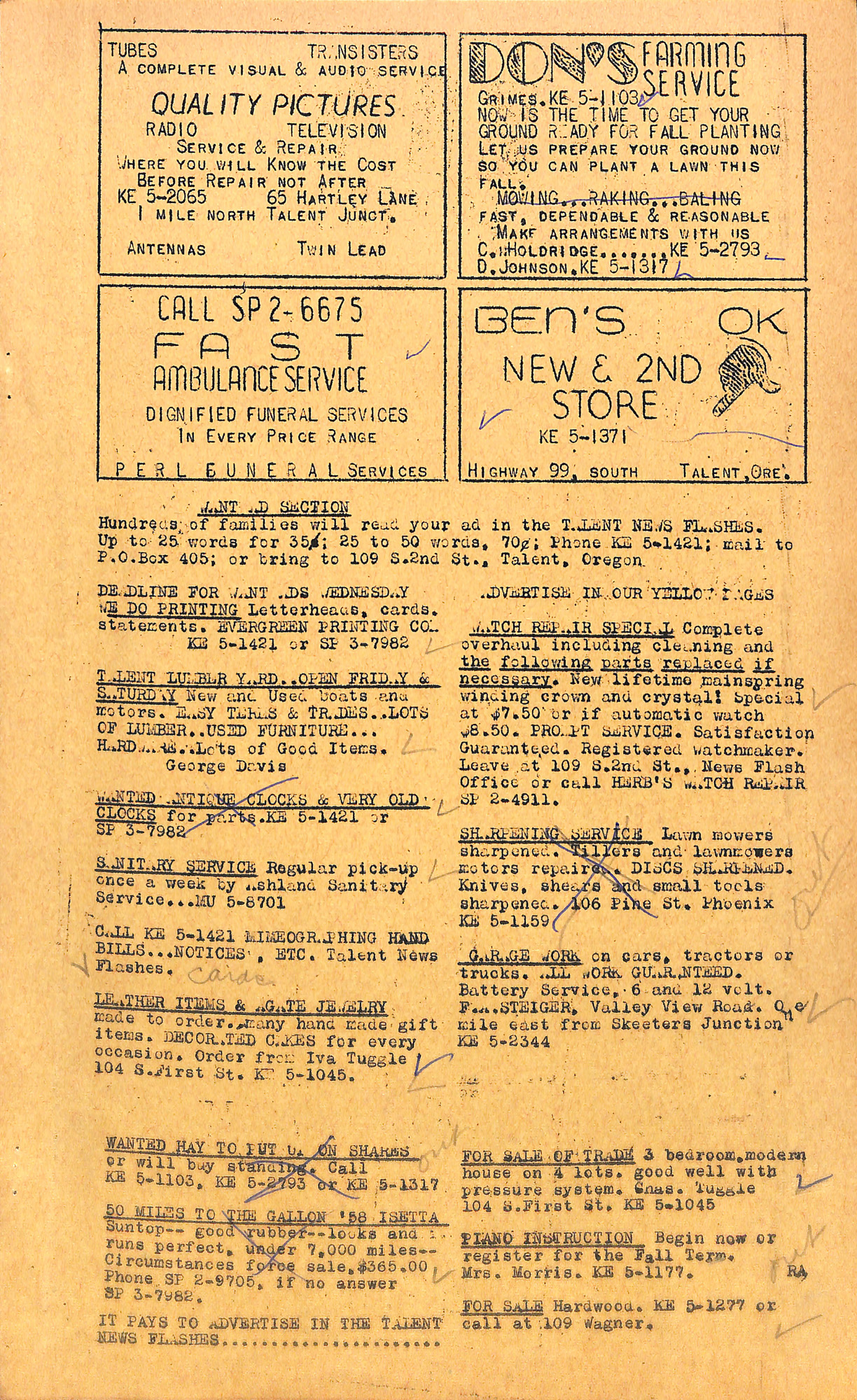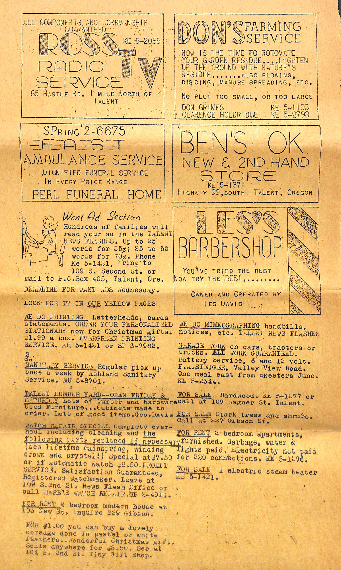 Page 5, ads for: ROSS TV & RADIO SERVICE DON'S FARMING SERVICE PERL FUNERAL HOME & AMBULANCE SERVICE BEN'S OK NEW & 2ND HAND STORE LES' BARBERSHOP WANT AD SECTION Hundreds of families will read your ad in the TALENT NEWS FLASHES. Up to 25 words for 35¢; 25 to 50 words for 70¢. Phone KE 5-1421, bring to 109 S. Second St. or mail to P.O. Box 405, Talent, Ore. DEADLINE FOR WANT ADS WEDNESDAY