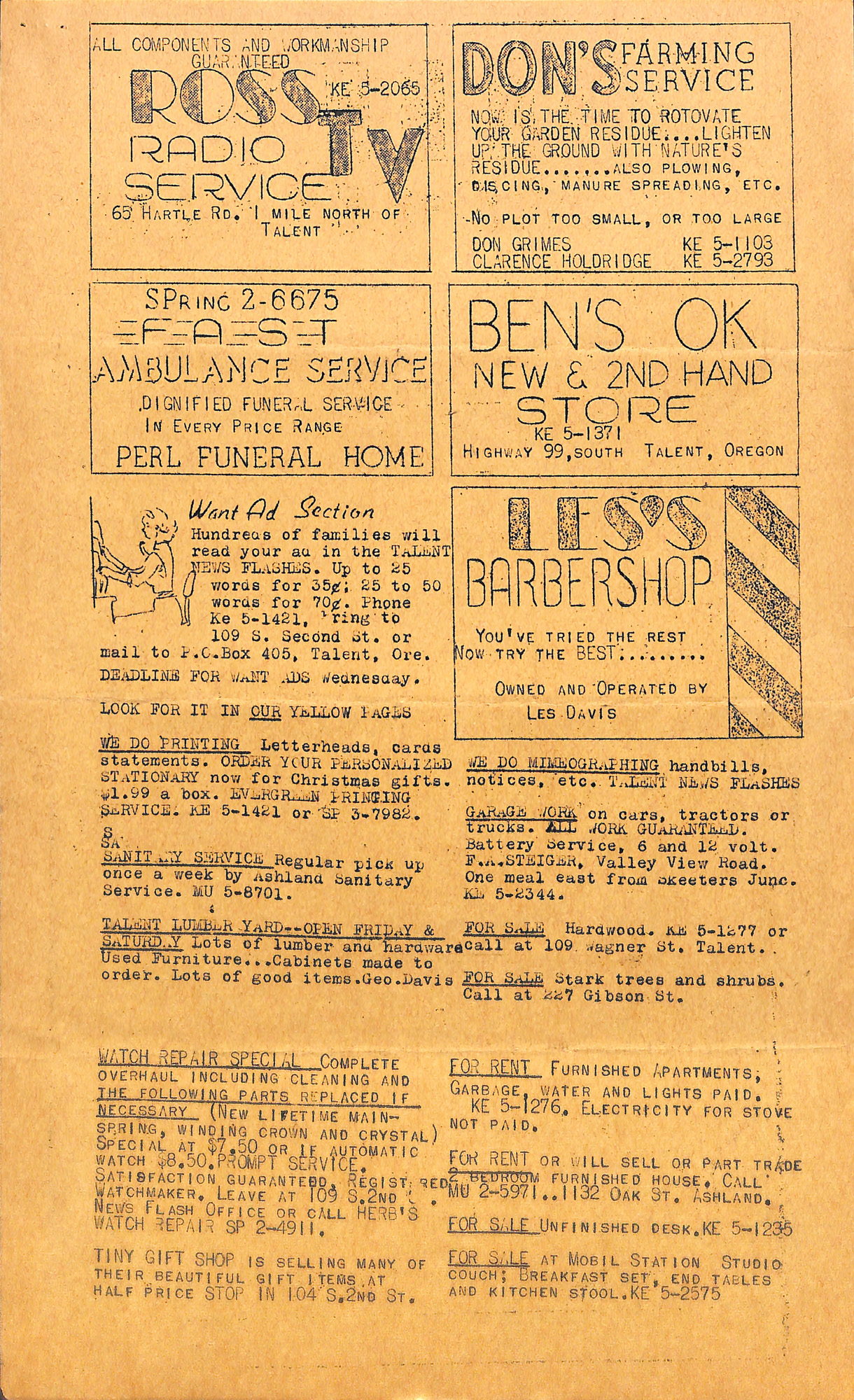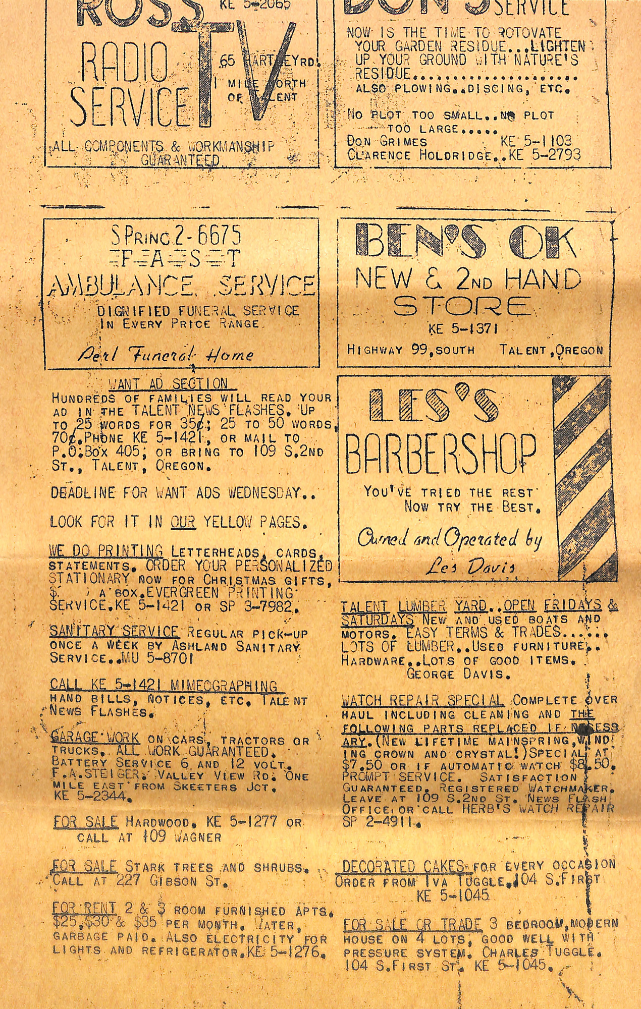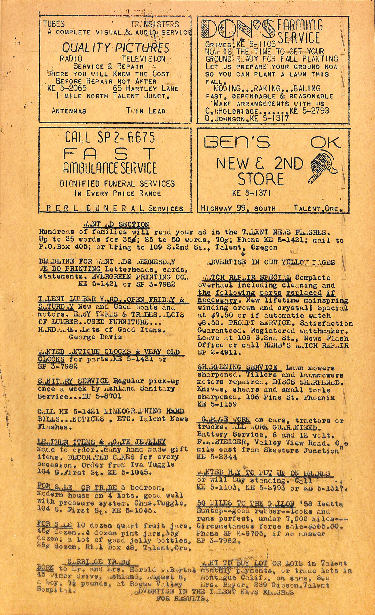 Page 5, ads for: ROSS TV & RADIO SERVICE DON'S FARMING SERVICE PERL FUNERAL HOME & AMBULANCE SERVICE BEN'S OK NEW & 2ND HAND STORE LES' BARBERSHOP WANT AD SECTION Hundreds of families will read your ad in the TALENT NEWS FLASHES. Up to 25 words for 35¢; 25 to 50 words for 70¢. Phone KE 5-1421, bring to 109 S. Second St. or mail to P.O. Box 405, Talent, Ore. DEADLINE FOR WANT ADS WEDNESDAY
